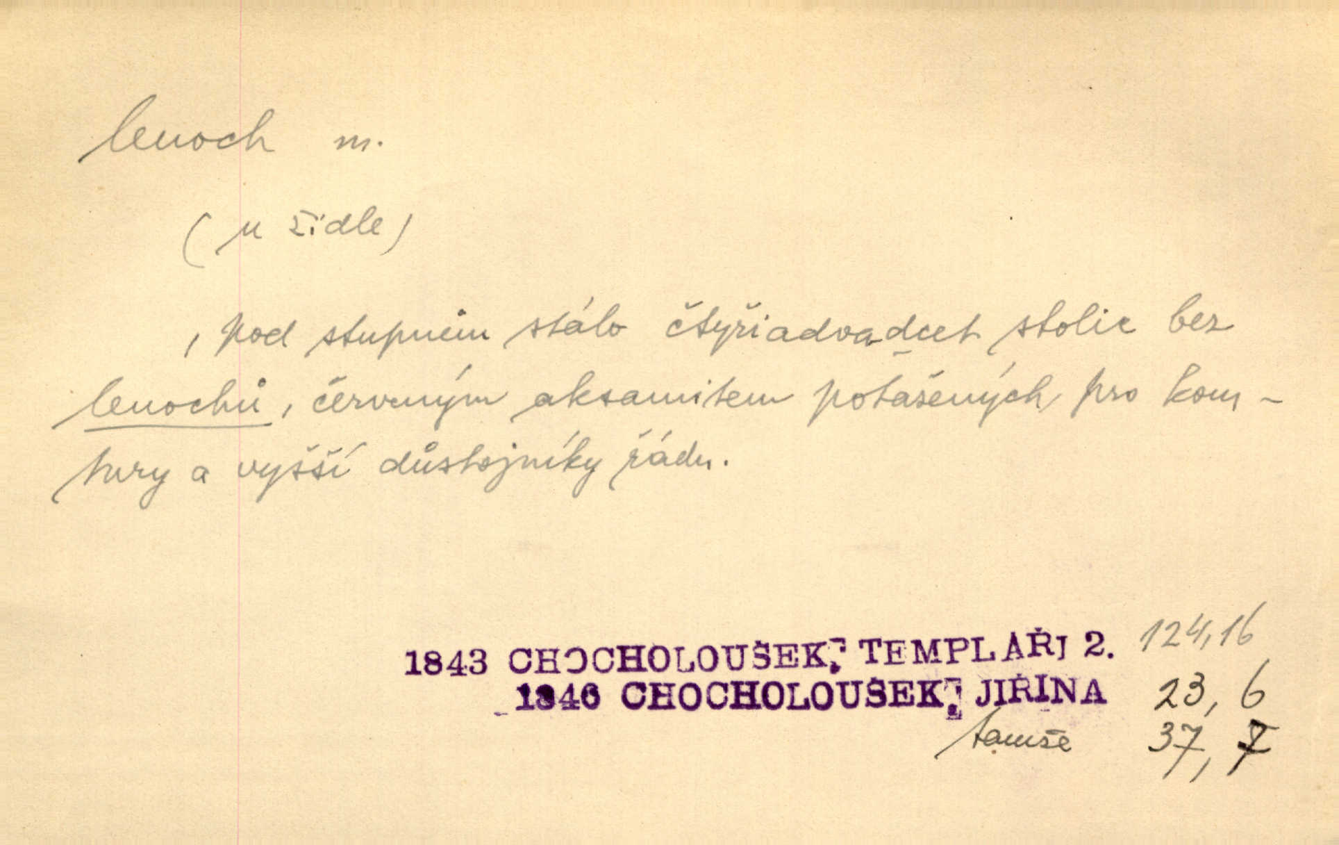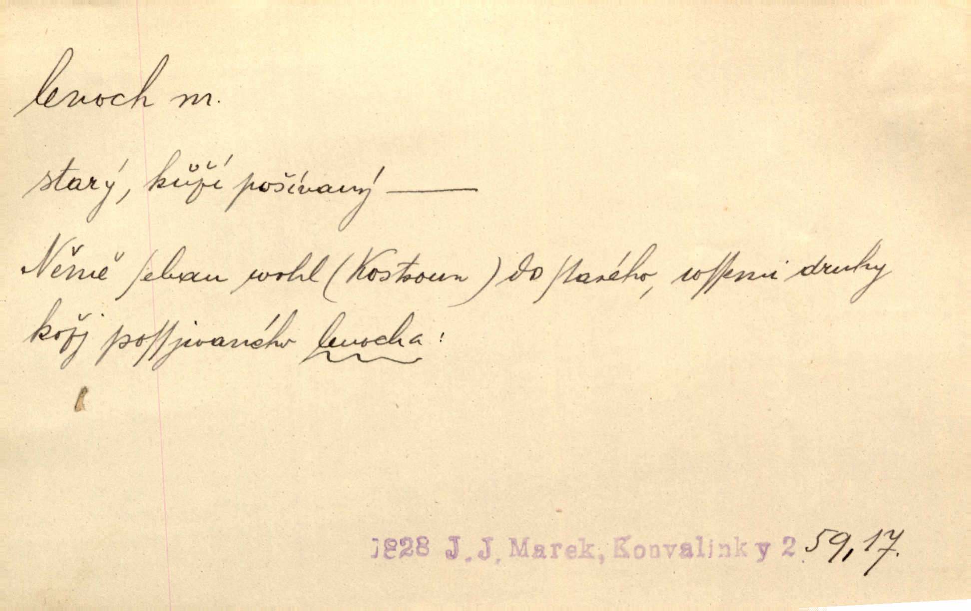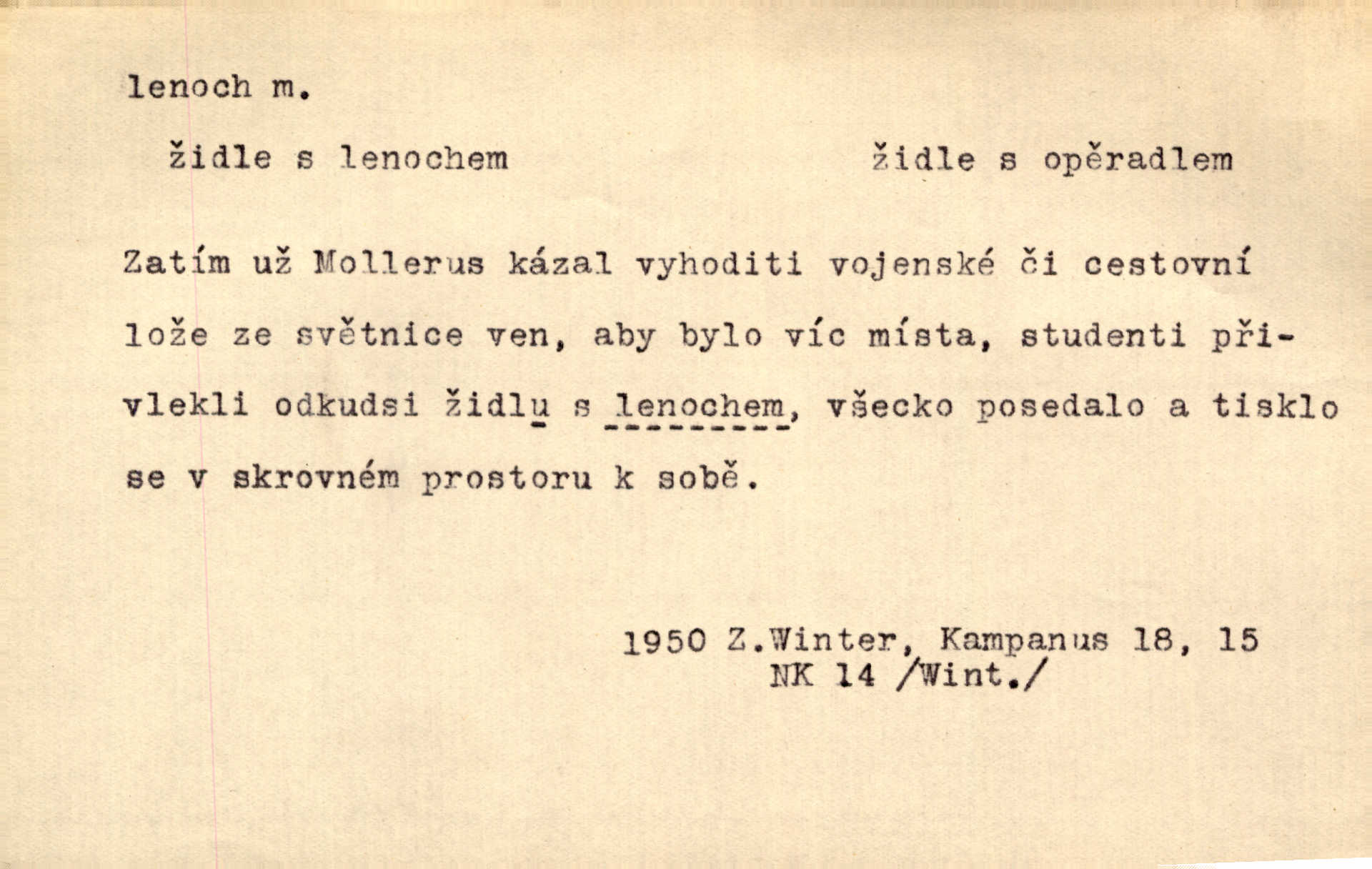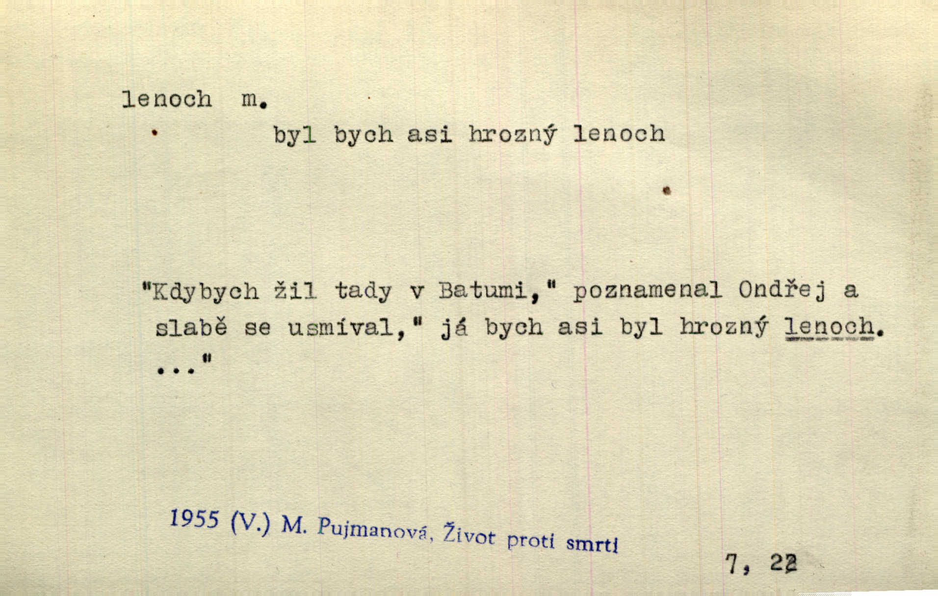 - lenoch, -u m. opěradlo sedadla. Farář bubnoval prsty do lenochu židle. Vach. D linkovaná papírová podložka. Průsvitnou koží byla mu znát žebra jako lenoch papírem. Čap. Ch.