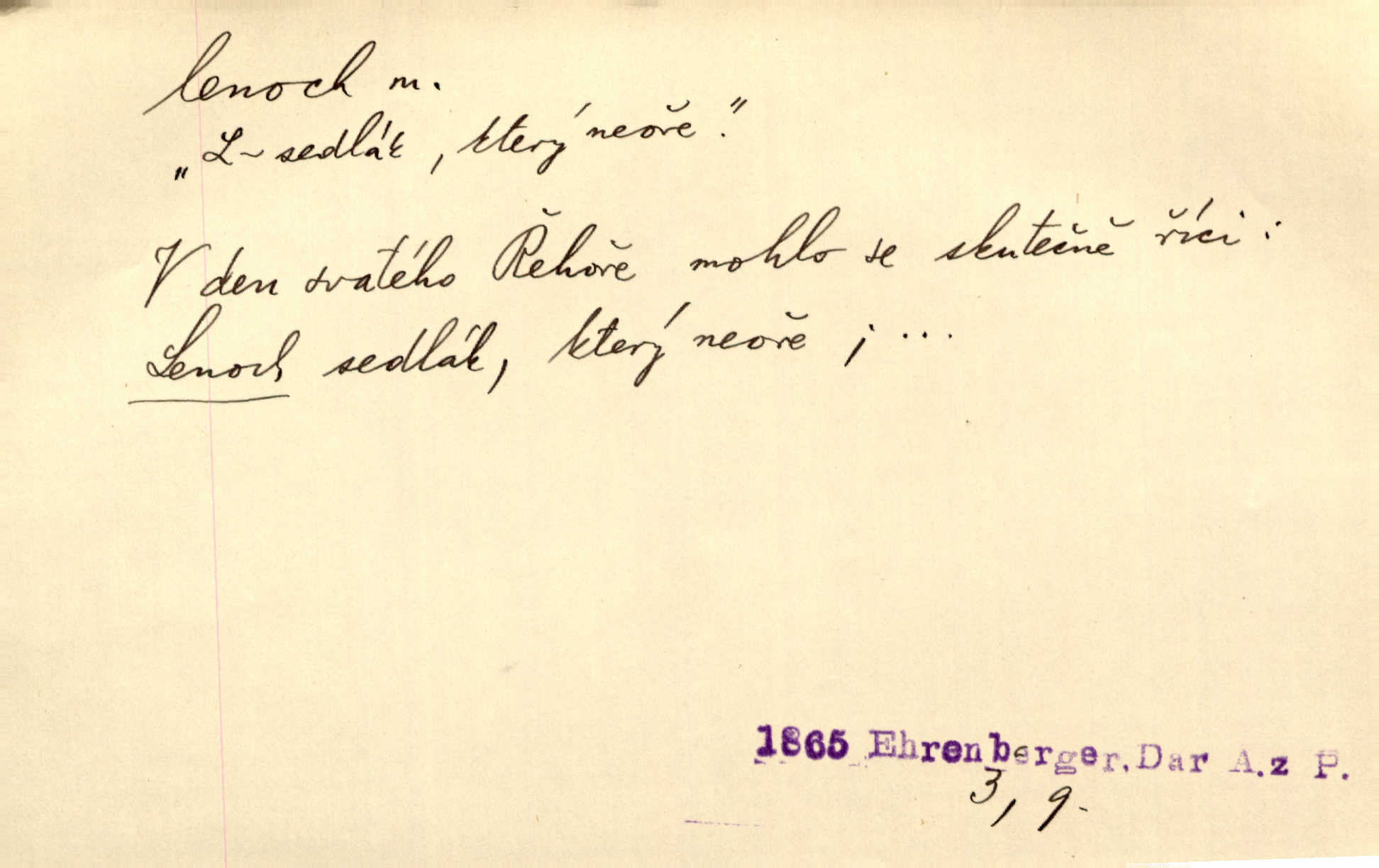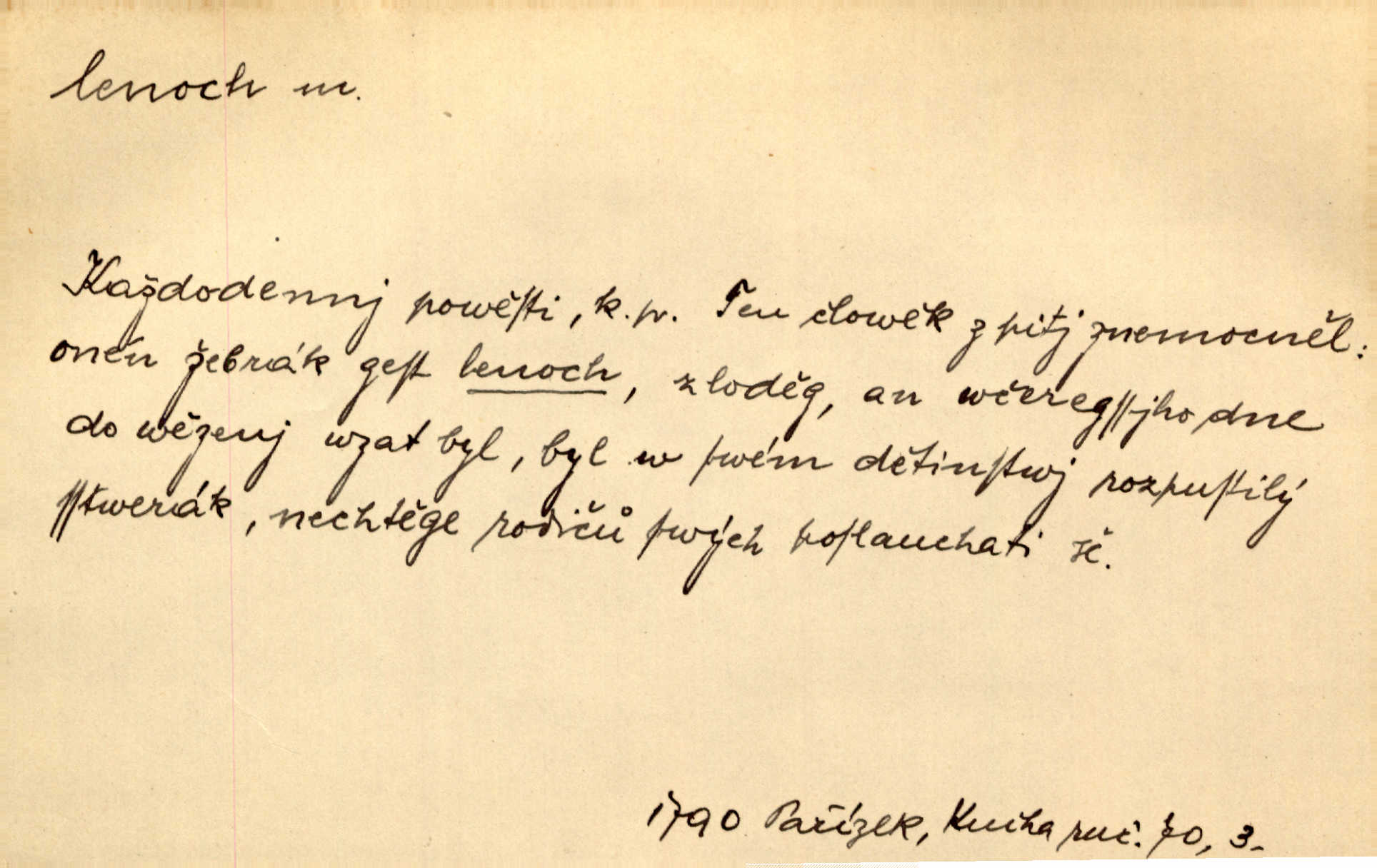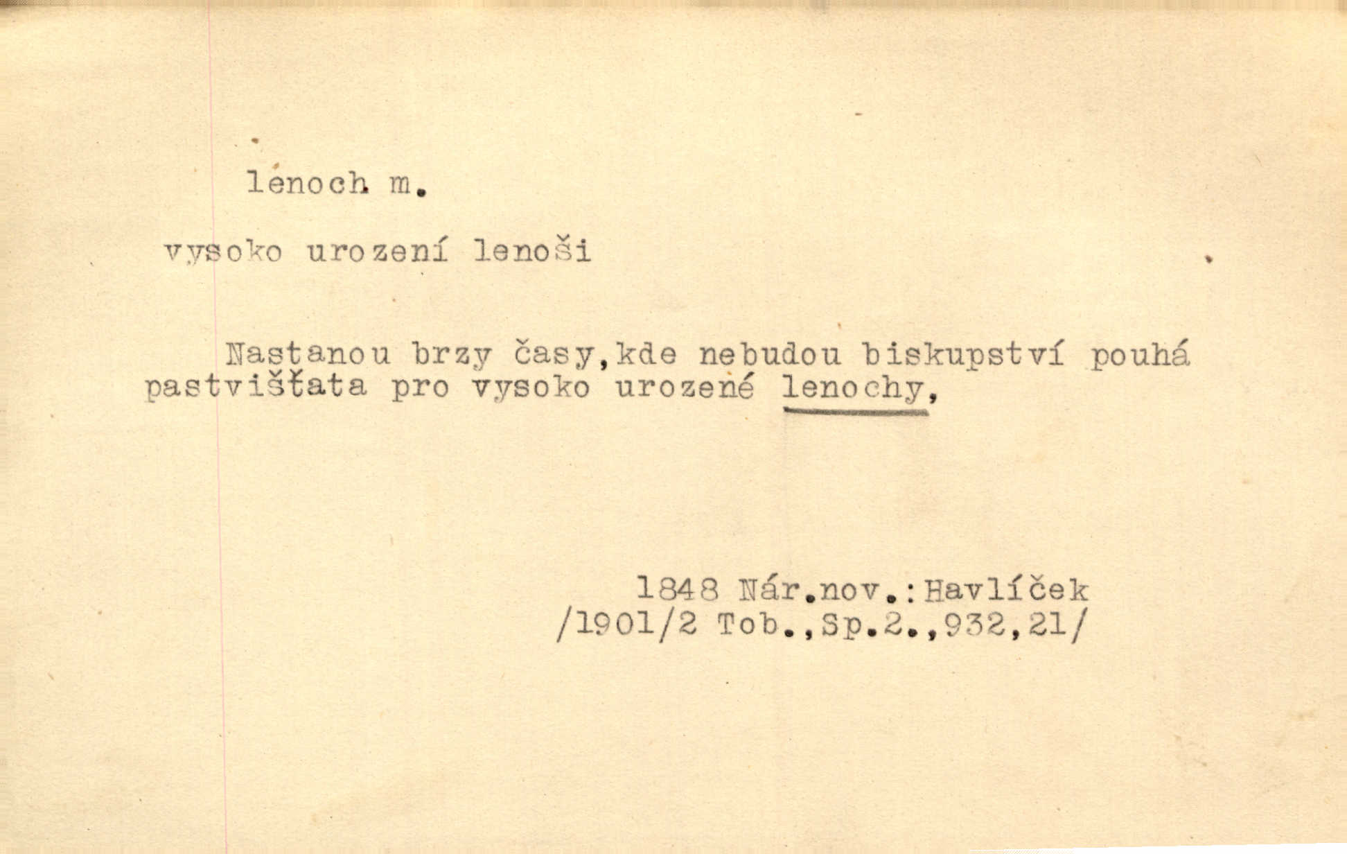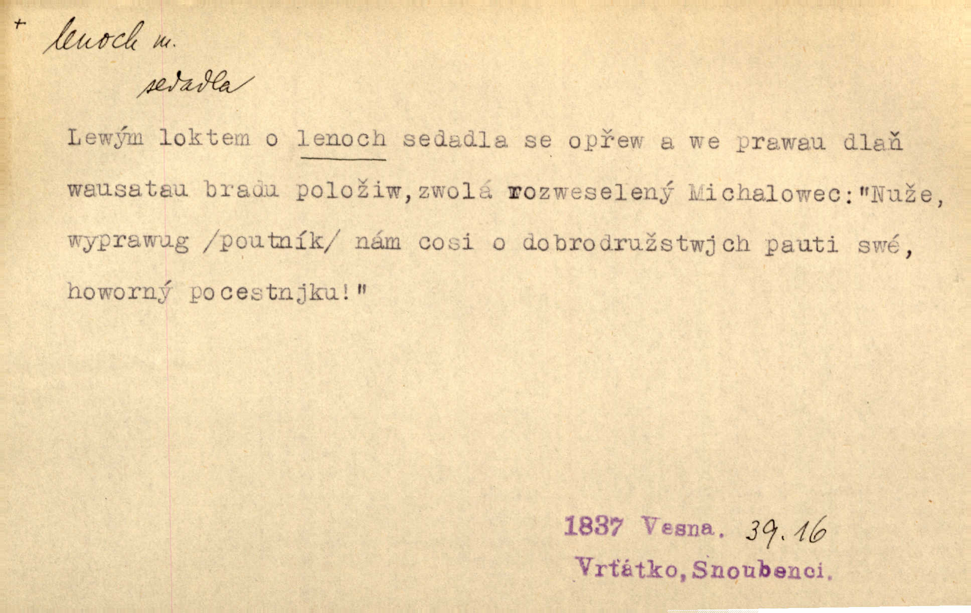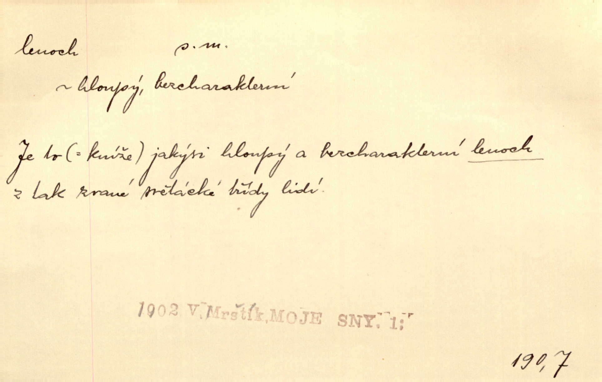 - lenoch, -u m. opěradlo sedadla. Farář bubnoval prsty do lenochu židle. Vach. D linkovaná papírová podložka. Průsvitnou koží byla mu znát žebra jako lenoch papírem. Čap. Ch.