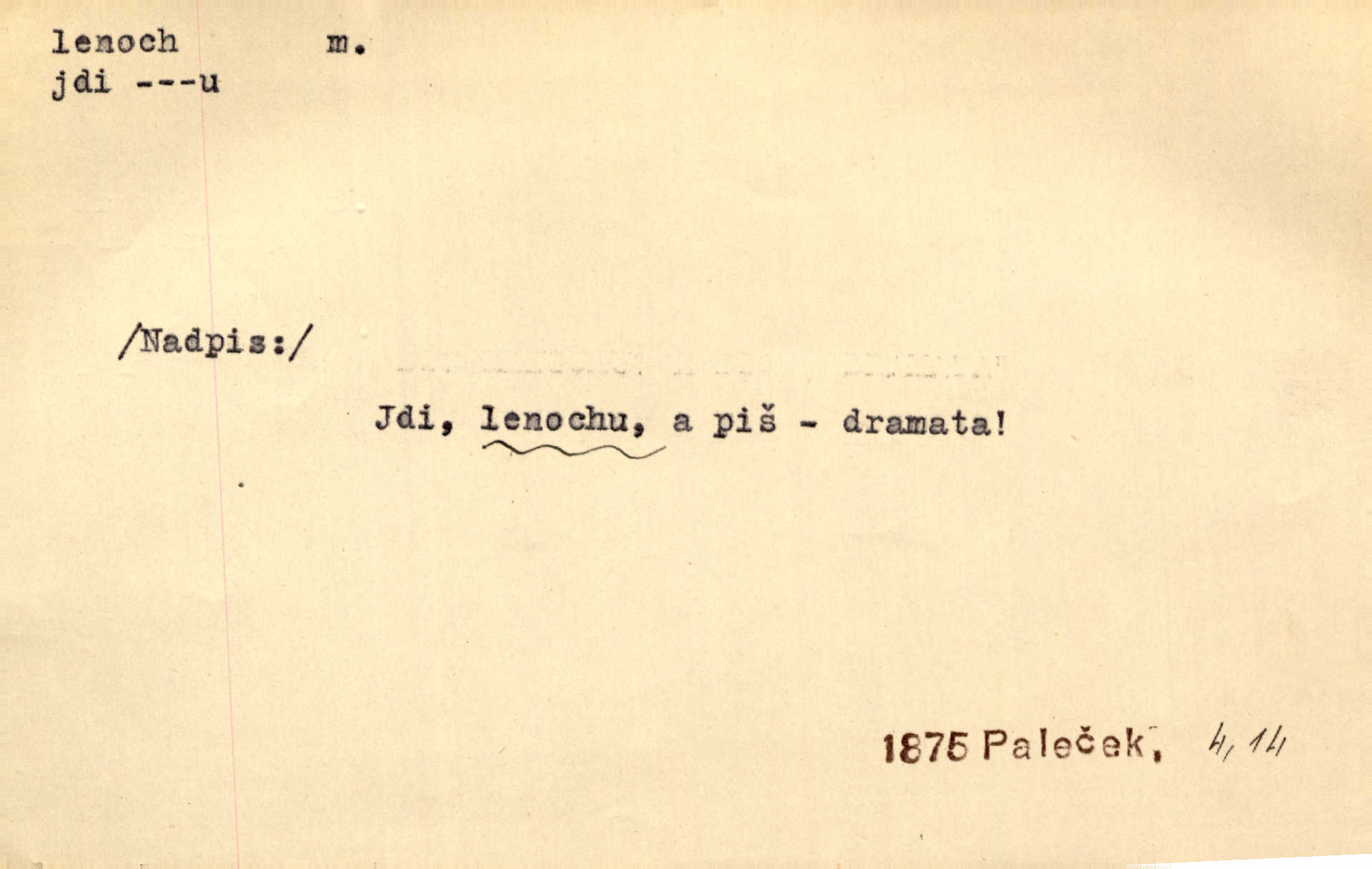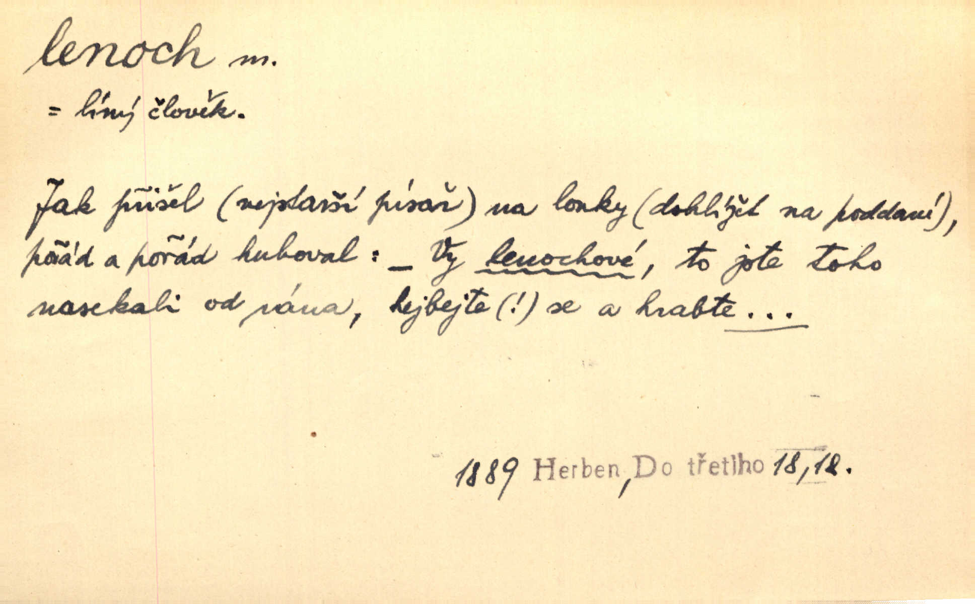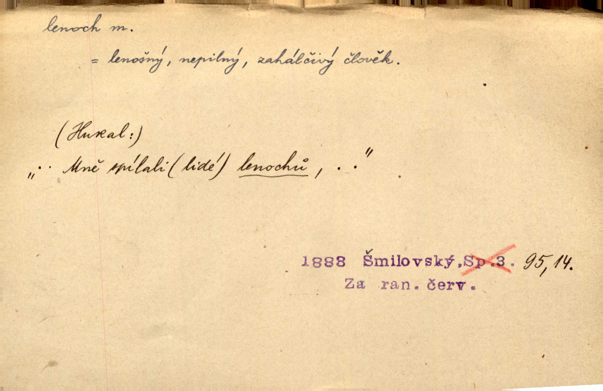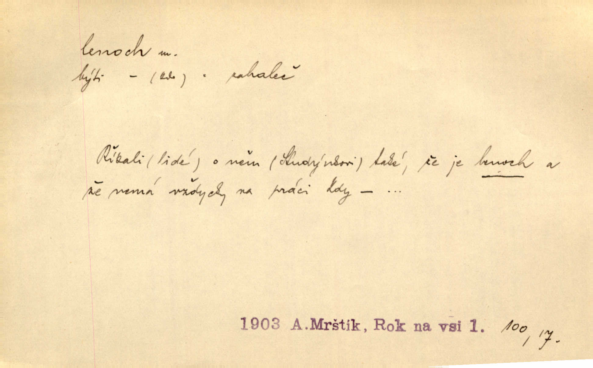- lenoch, -a m. líný člověk, lenivec, zahaleč. Říkali o něm, že je lenoch a že nemá vždycky na práci kdy. A. Mrš.