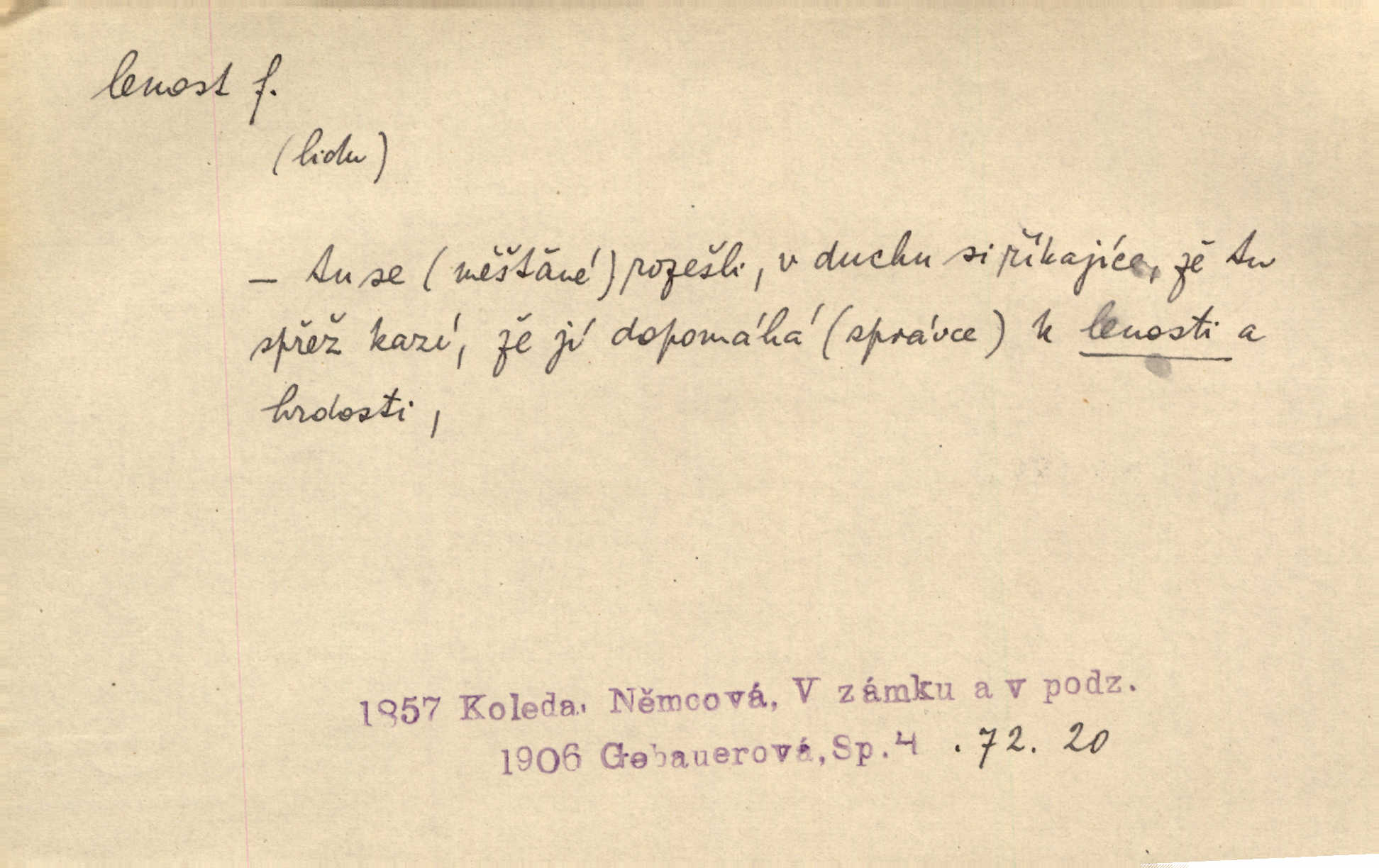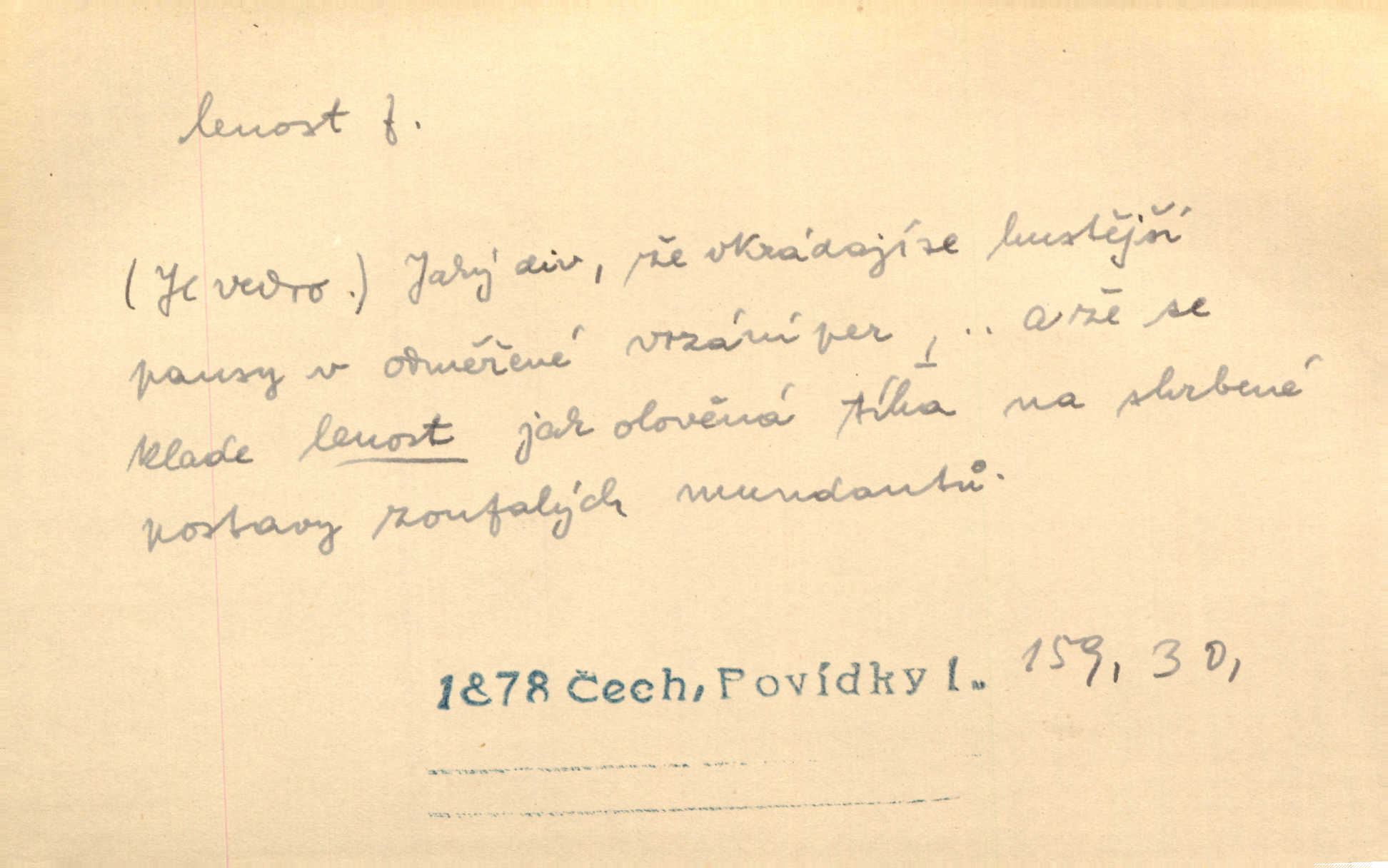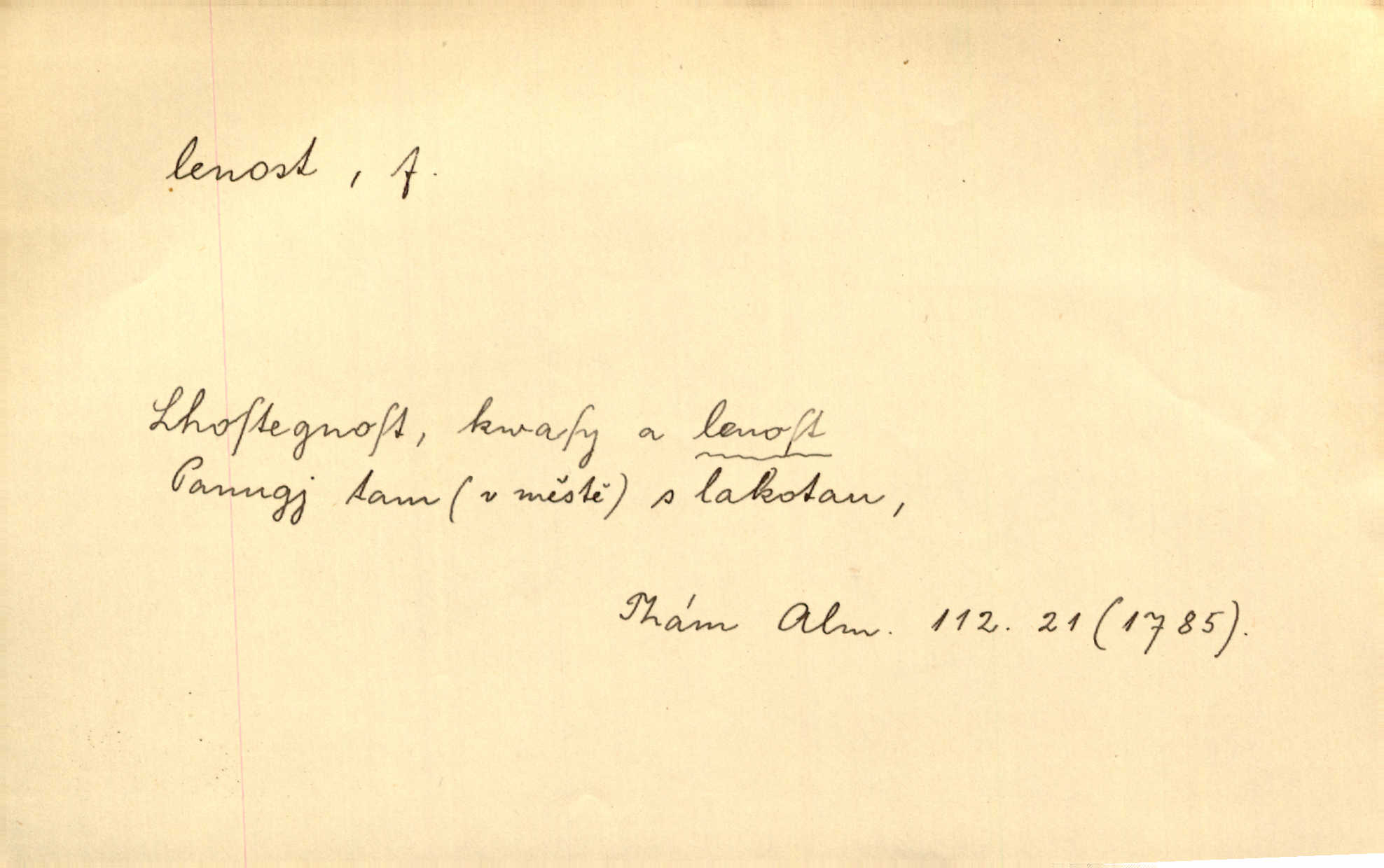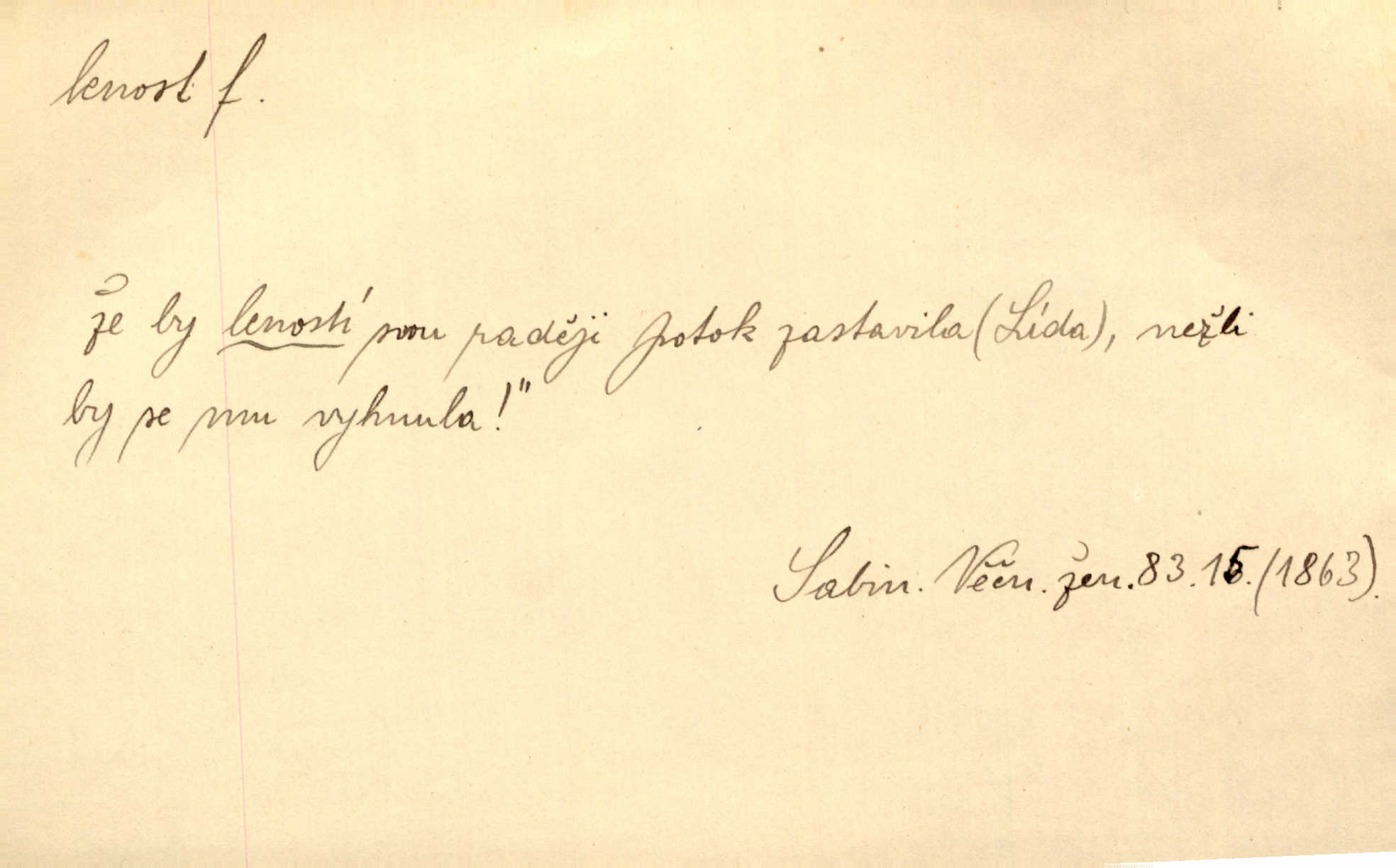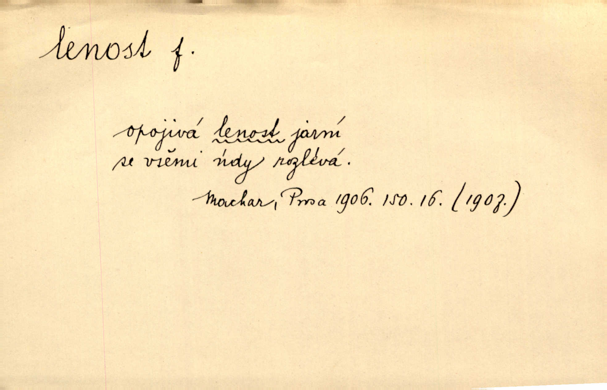 - lenost, -i f. nechut k práci, záliba v nečinnosti, lenivost, zahálčivost. Toulaví cikáni jsou pro lenost, nečistotu a ošemetnost v opovržení. Něm. Prál mu [president praktikantovi]‚ aby pilně pracoval, že prý beztoho leností až smrdí. Ner. Co mu na tom záleželo, poslouchala-li jeho budoucí snacha z lenosti duševní neb z jiné příčiny: jen když vůbec poslouchala a mlčela! Svět.