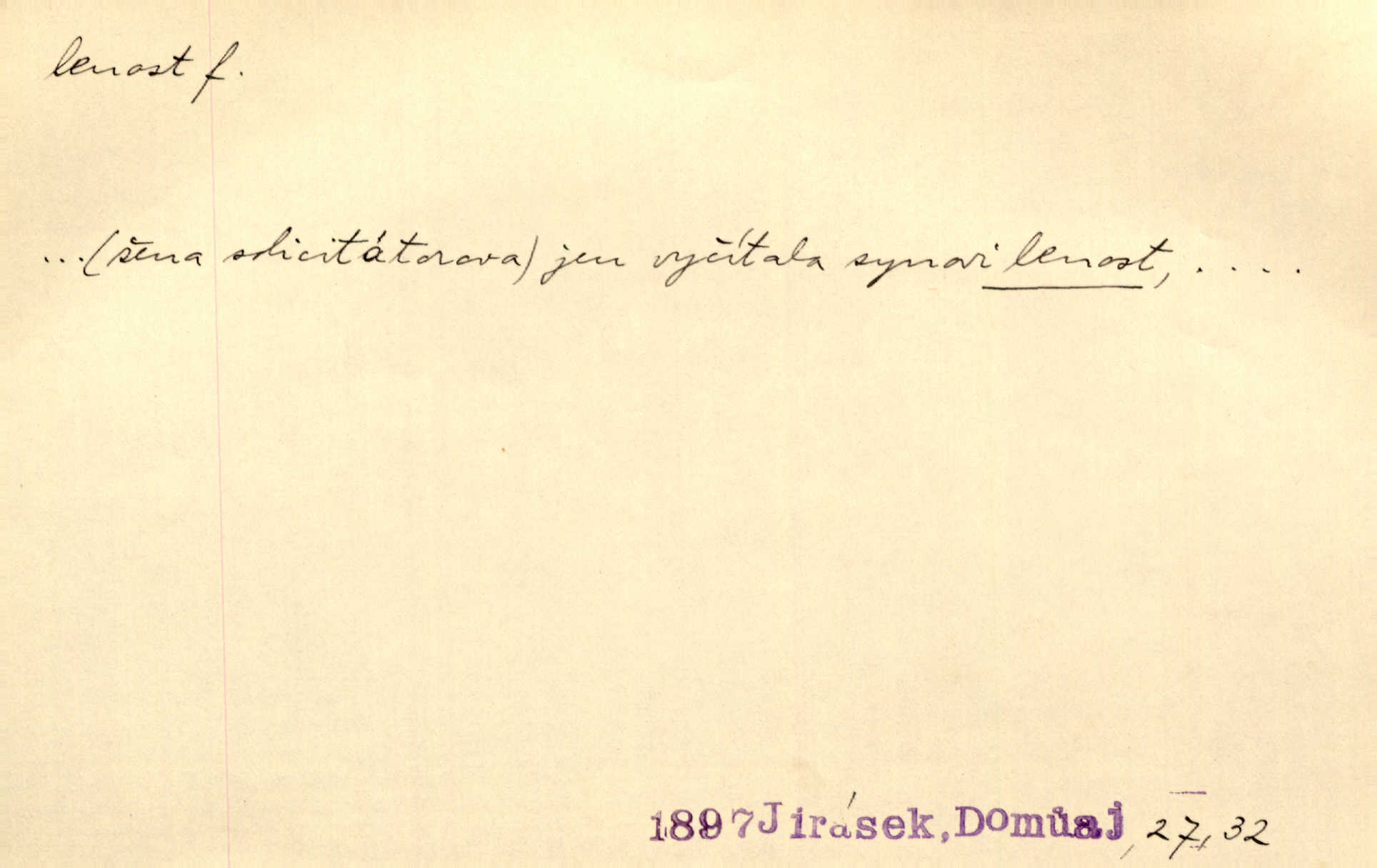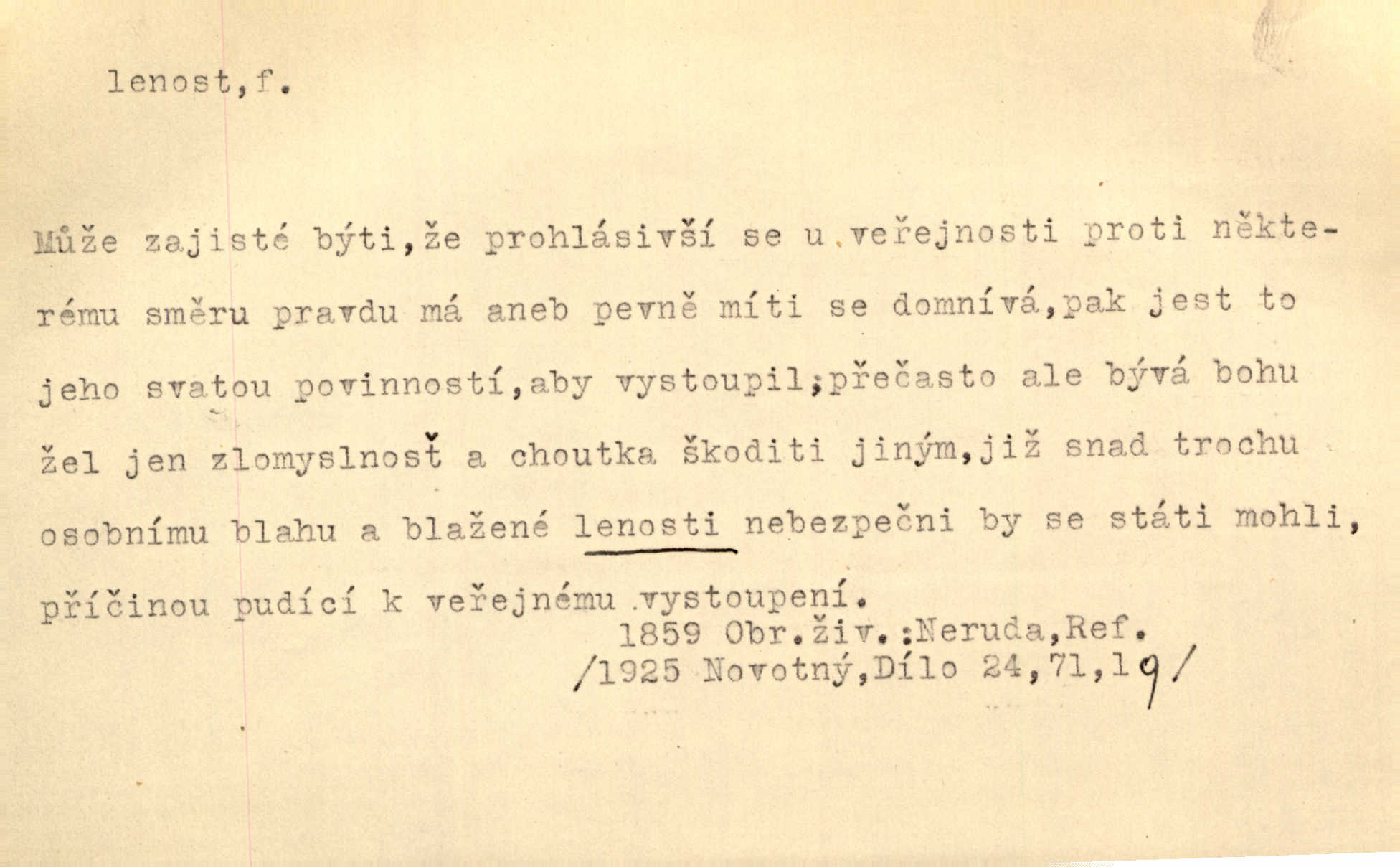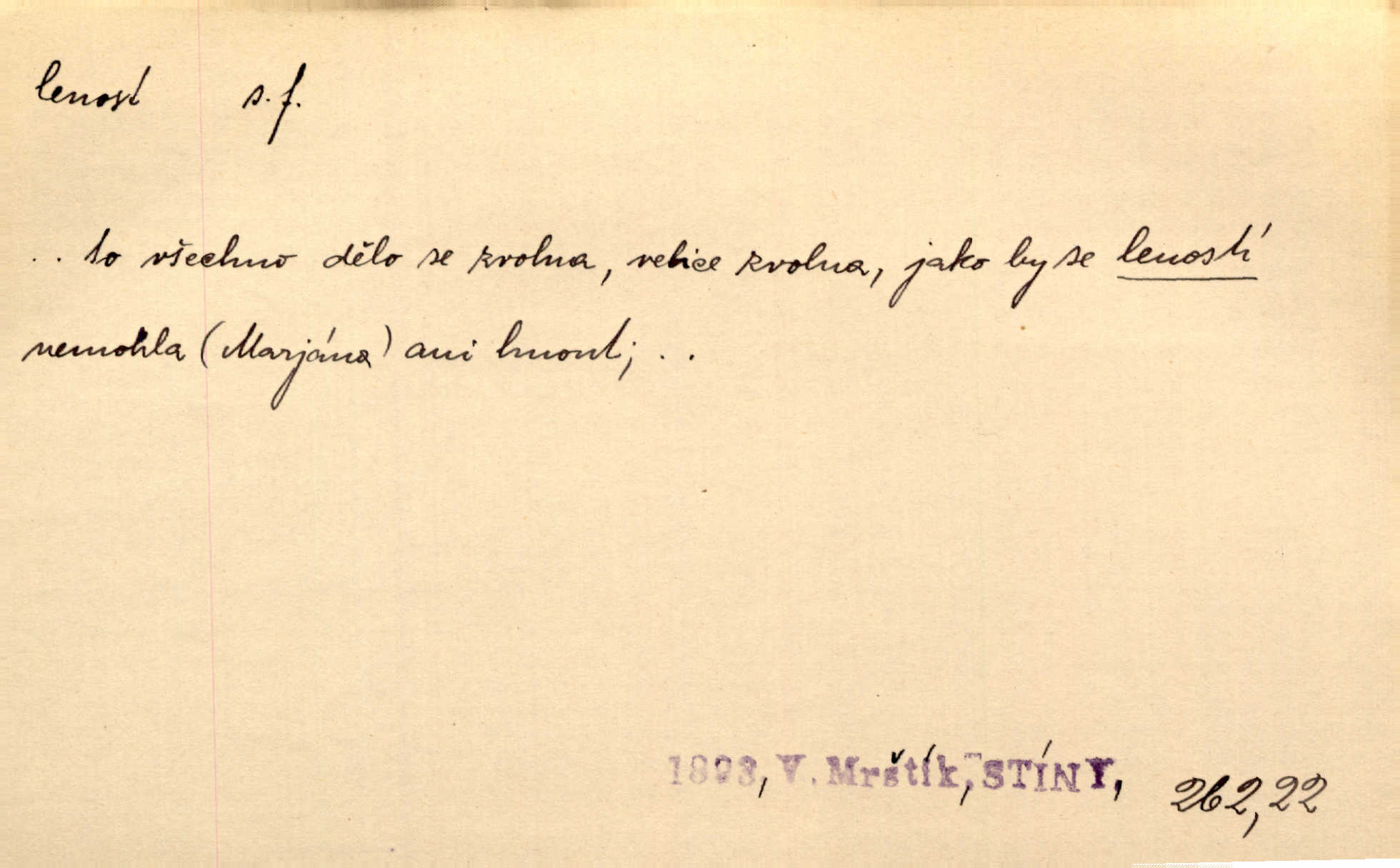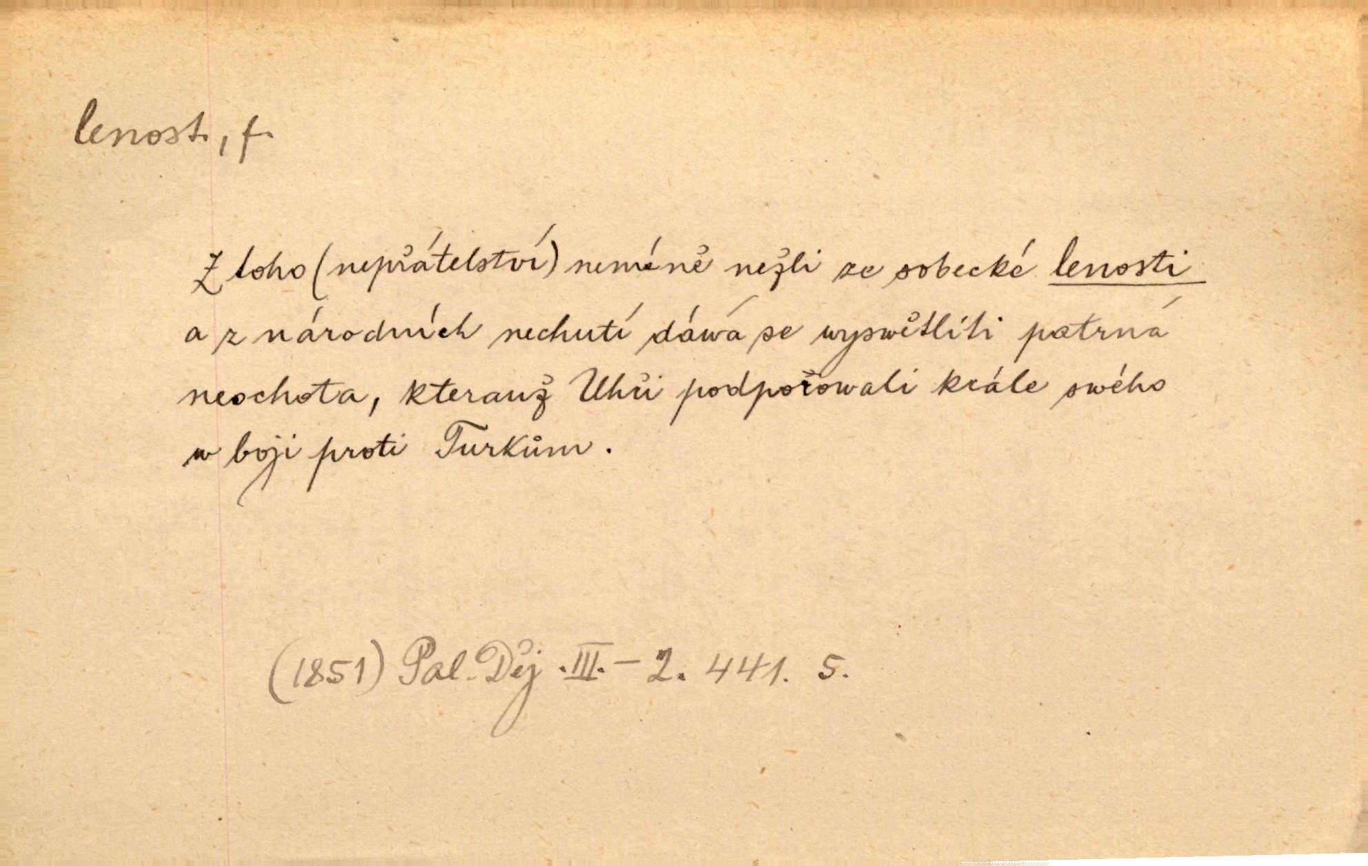 - lenost, -i f. nechut k práci, záliba v nečinnosti, lenivost, zahálčivost. Toulaví cikáni jsou pro lenost, nečistotu a ošemetnost v opovržení. Něm. Prál mu [president praktikantovi]‚ aby pilně pracoval, že prý beztoho leností až smrdí. Ner. Co mu na tom záleželo, poslouchala-li jeho budoucí snacha z lenosti duševní neb z jiné příčiny: jen když vůbec poslouchala a mlčela! Svět.