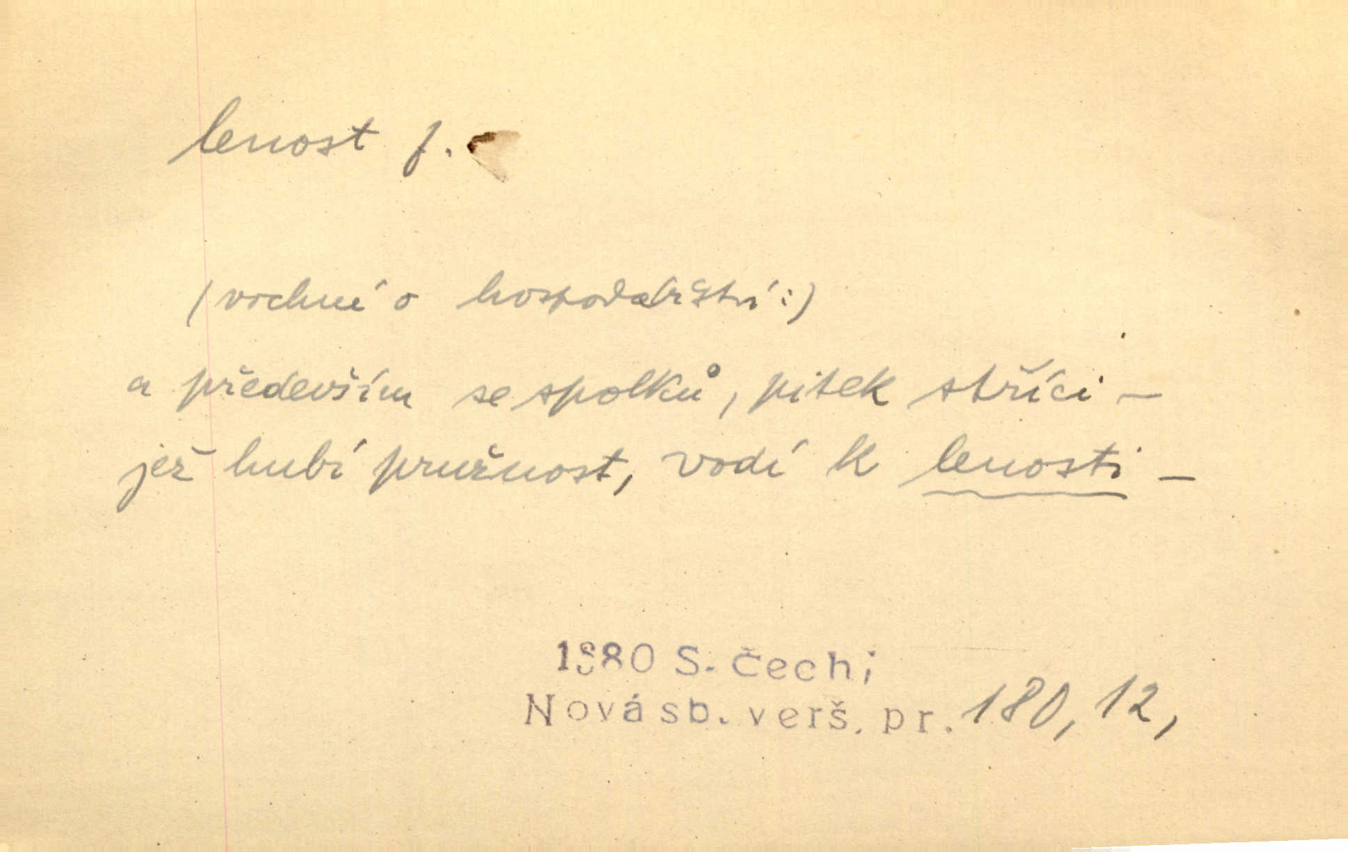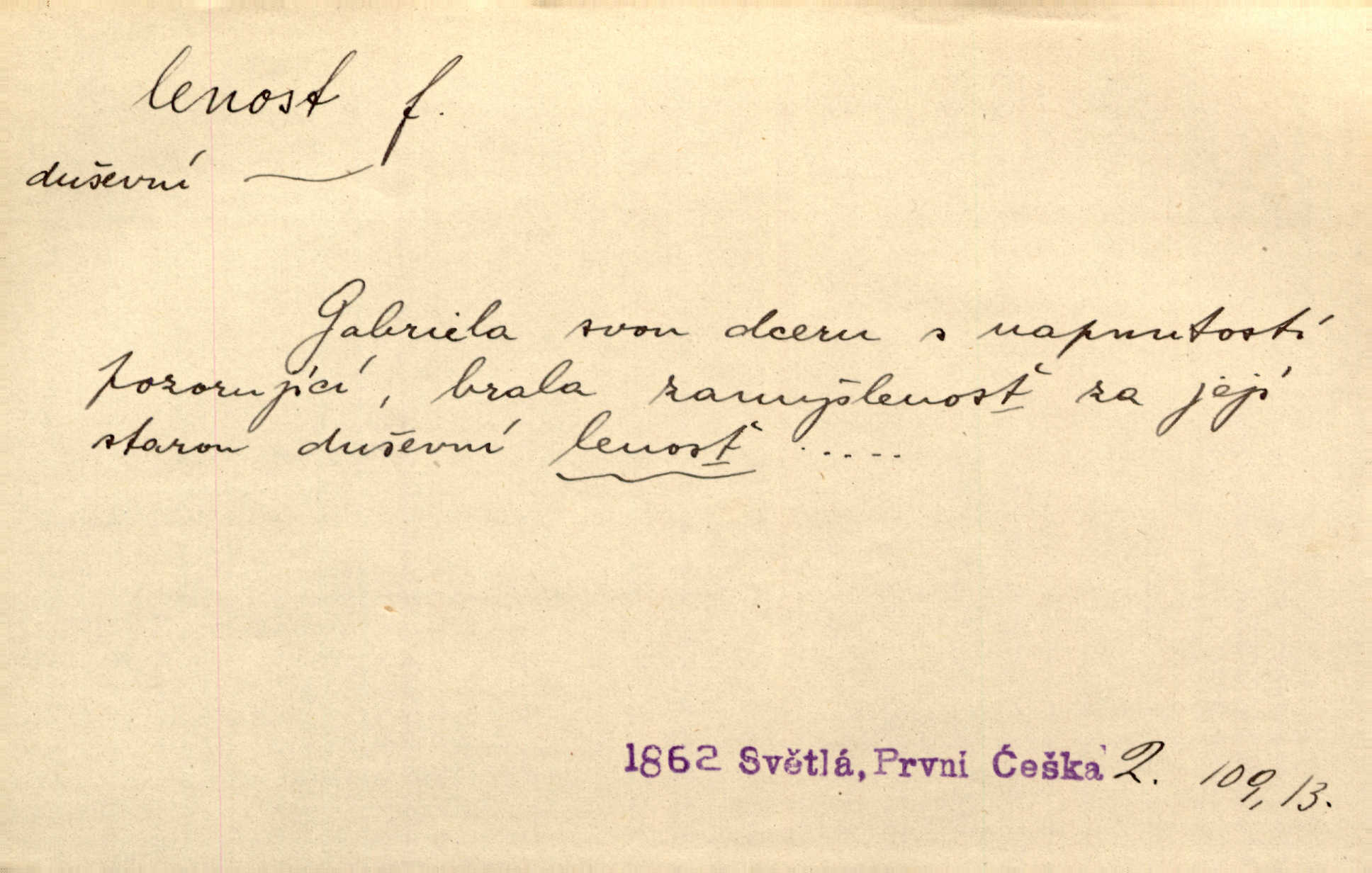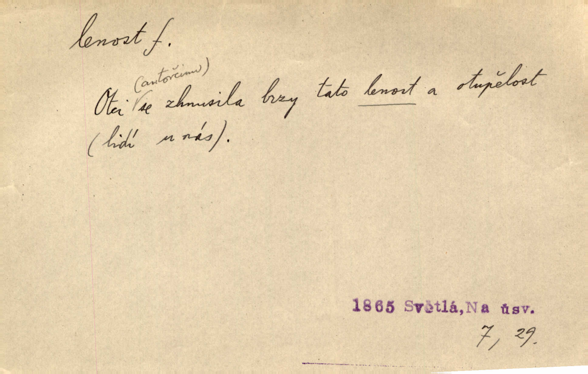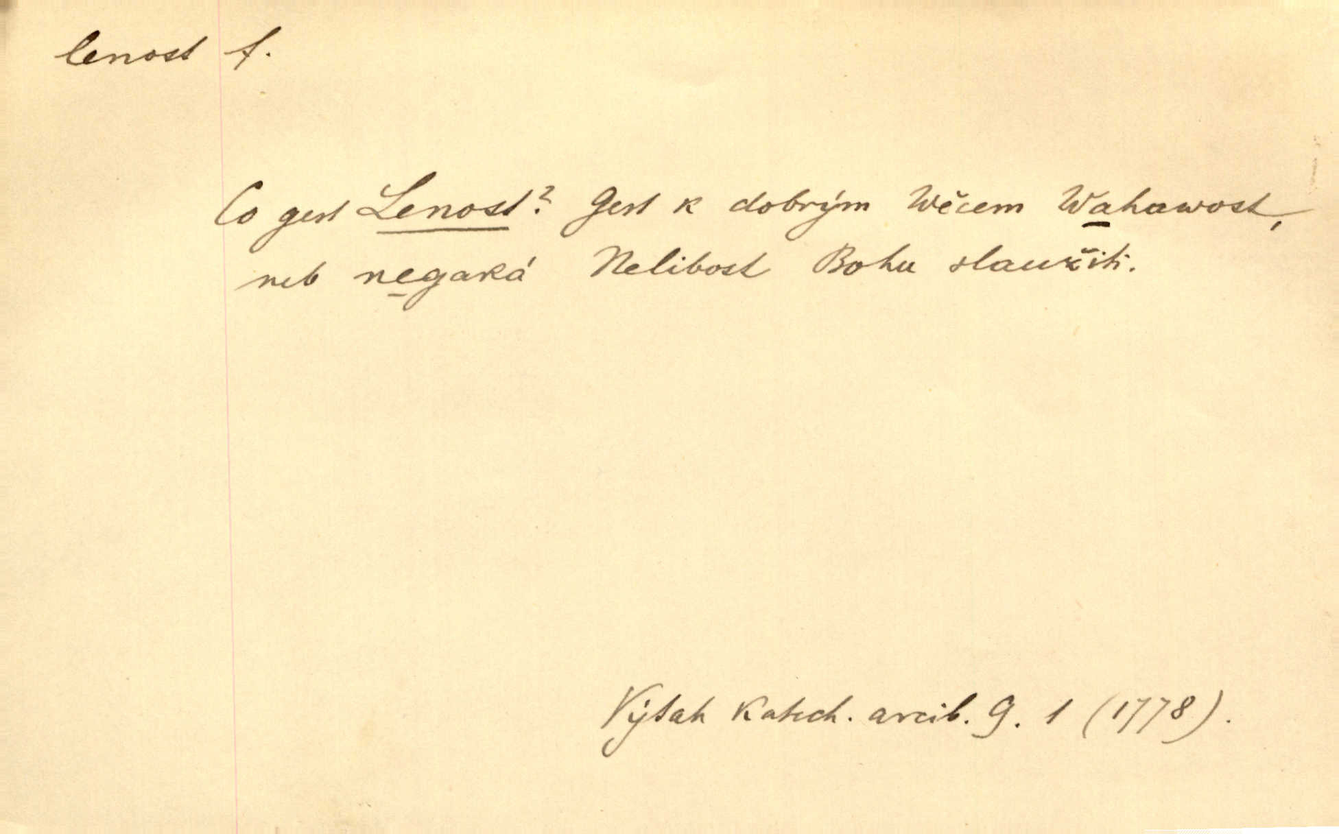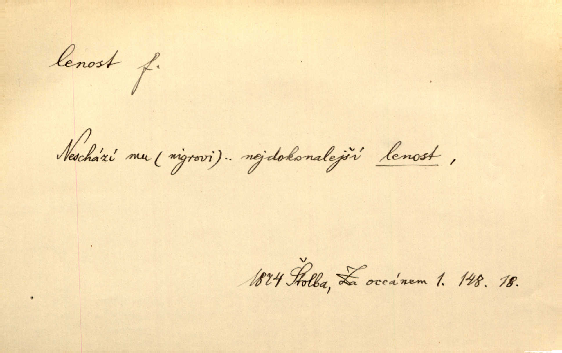 - lenost, -i f. nechut k práci, záliba v nečinnosti, lenivost, zahálčivost. Toulaví cikáni jsou pro lenost, nečistotu a ošemetnost v opovržení. Něm. Prál mu [president praktikantovi]‚ aby pilně pracoval, že prý beztoho leností až smrdí. Ner. Co mu na tom záleželo, poslouchala-li jeho budoucí snacha z lenosti duševní neb z jiné příčiny: jen když vůbec poslouchala a mlčela! Svět.