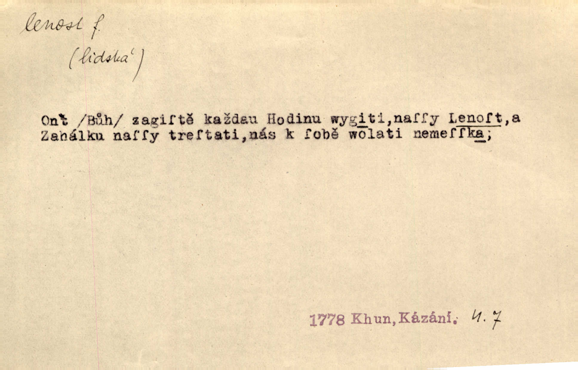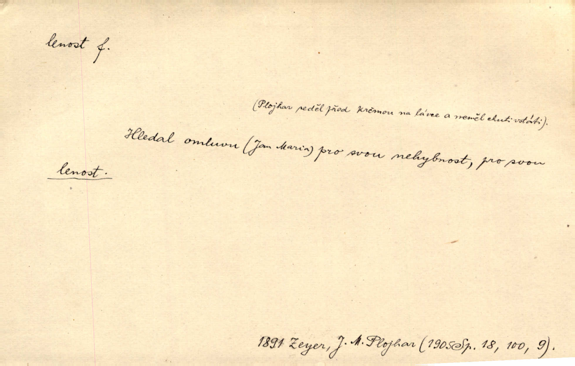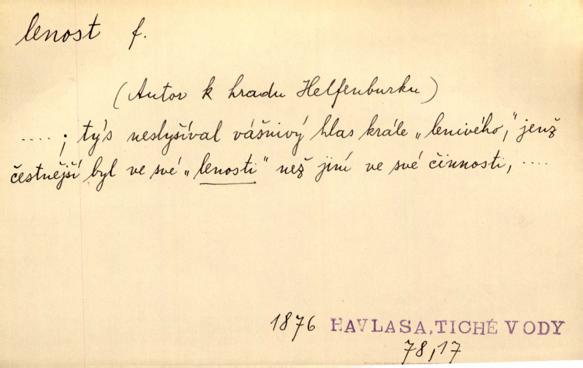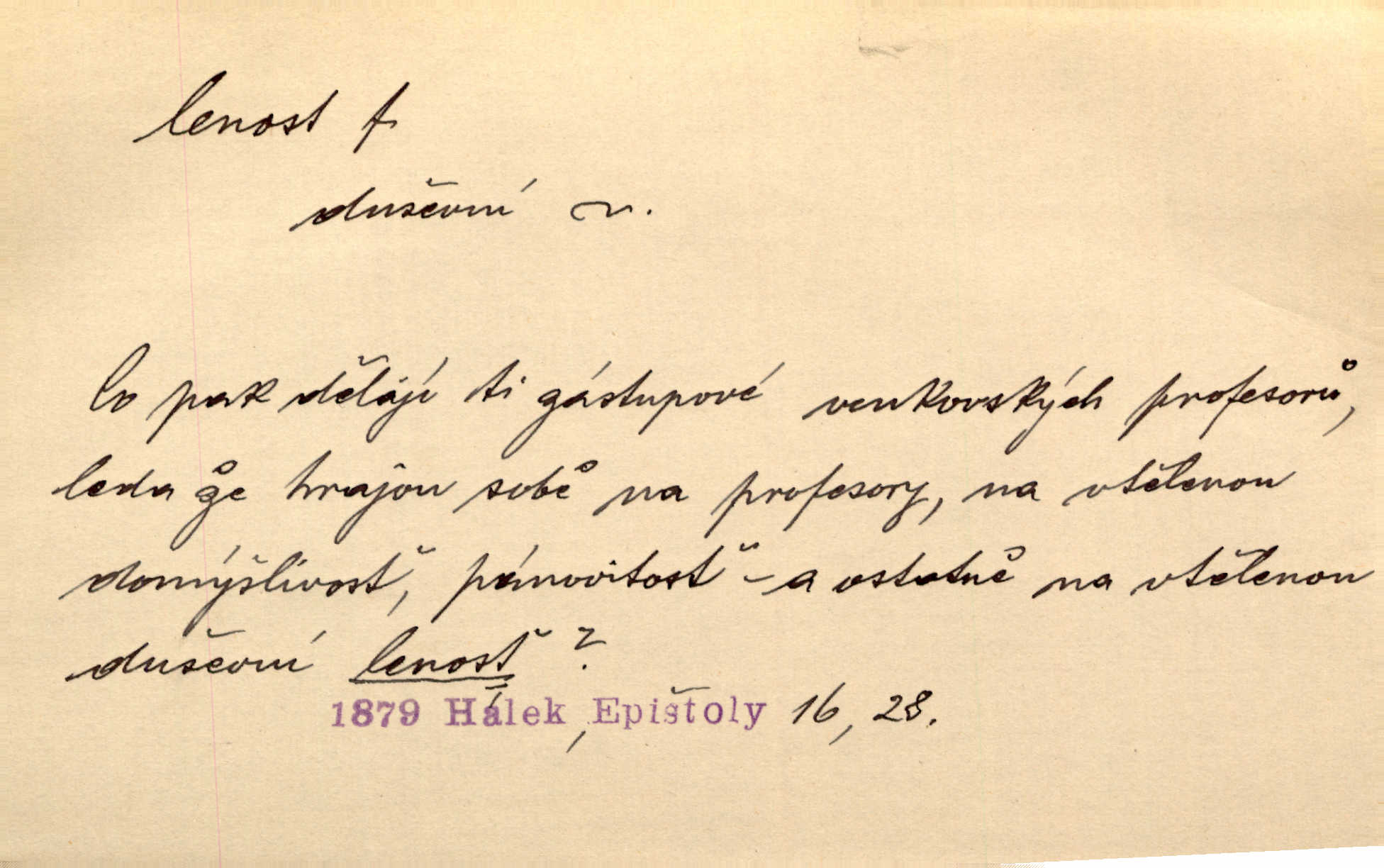 - lenost, -i f. nechut k práci, záliba v nečinnosti, lenivost, zahálčivost. Toulaví cikáni jsou pro lenost, nečistotu a ošemetnost v opovržení. Něm. Prál mu [president praktikantovi]‚ aby pilně pracoval, že prý beztoho leností až smrdí. Ner. Co mu na tom záleželo, poslouchala-li jeho budoucí snacha z lenosti duševní neb z jiné příčiny: jen když vůbec poslouchala a mlčela! Svět.