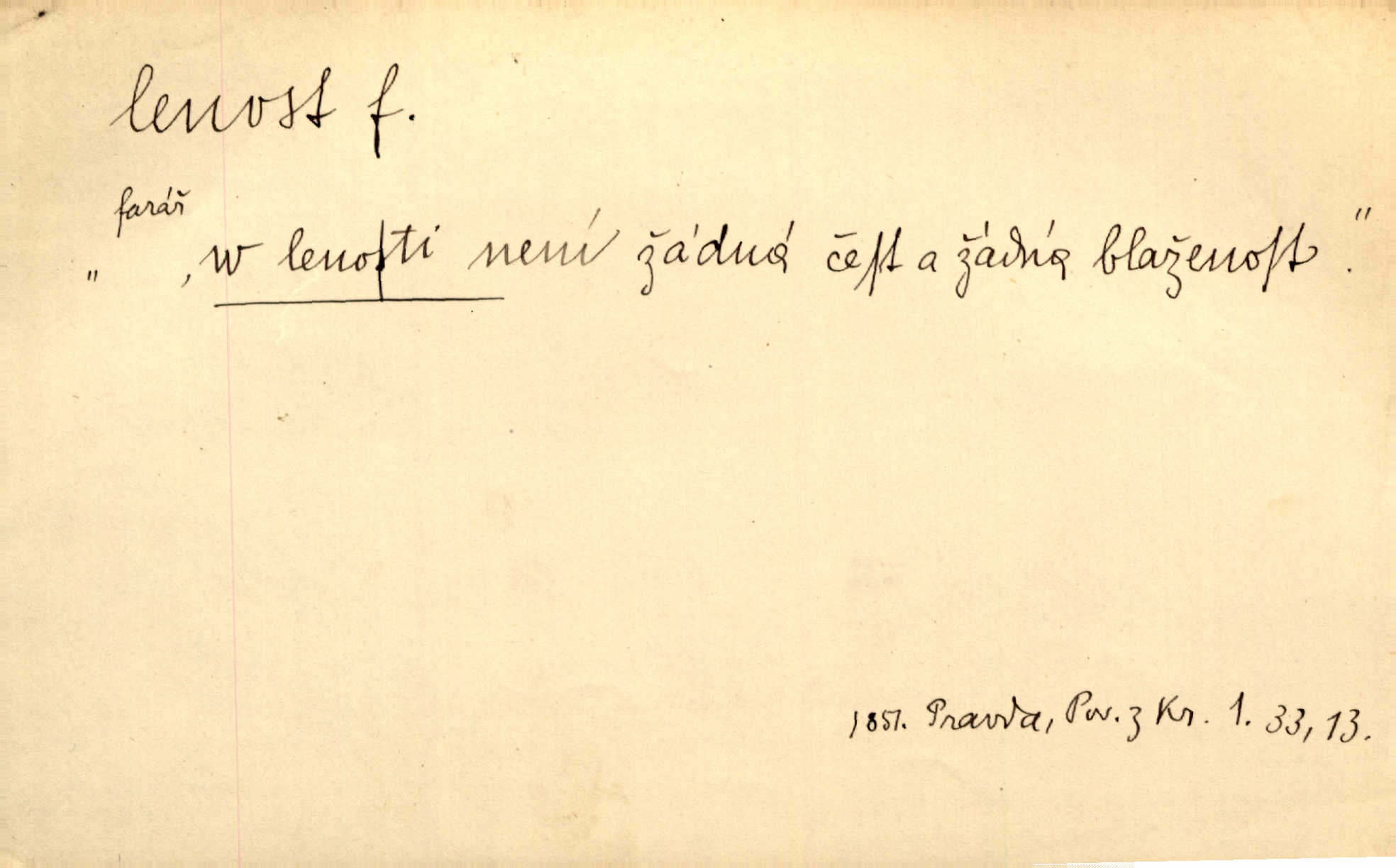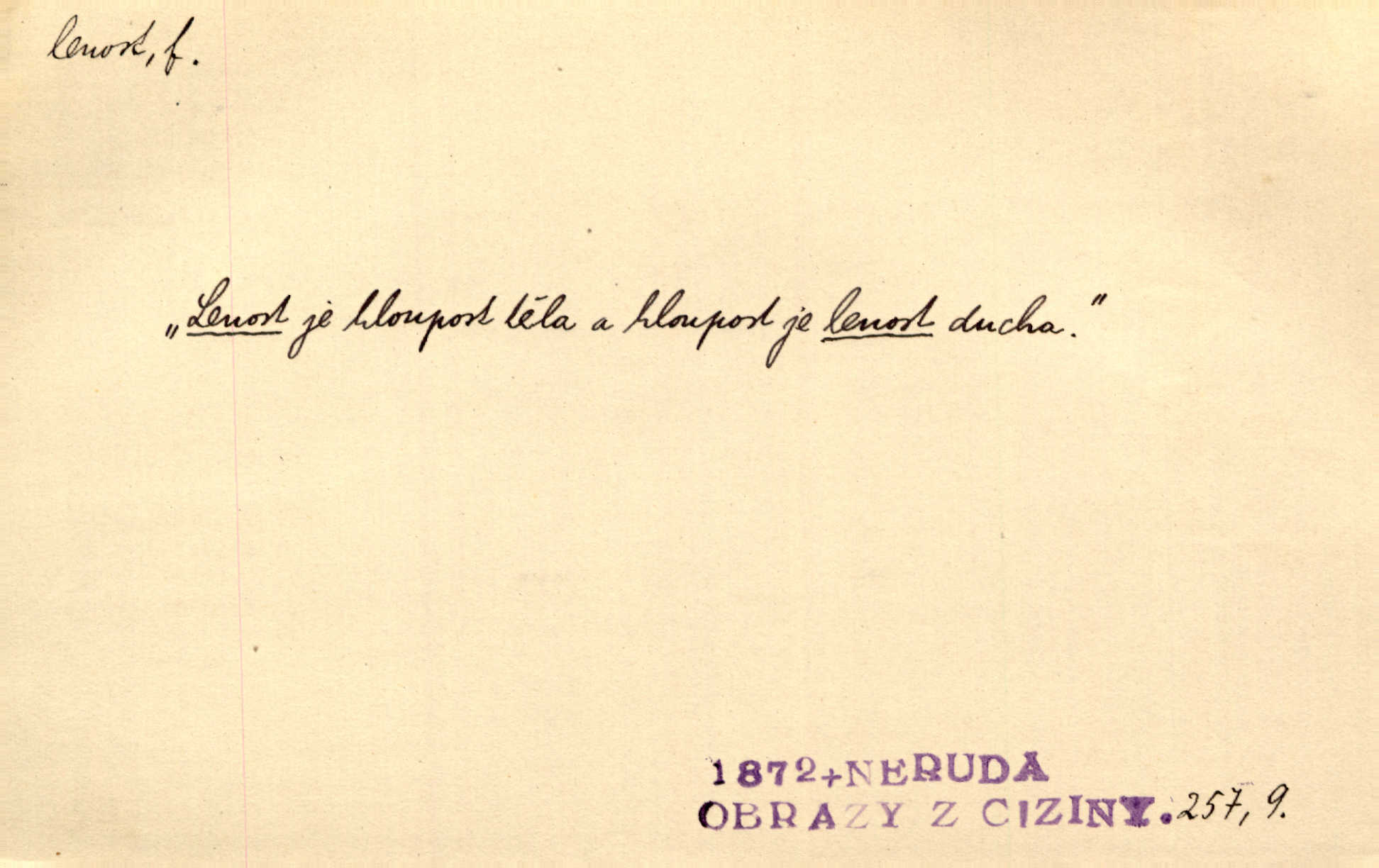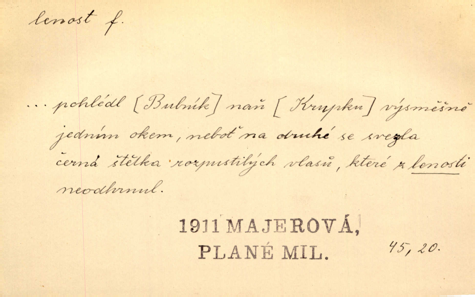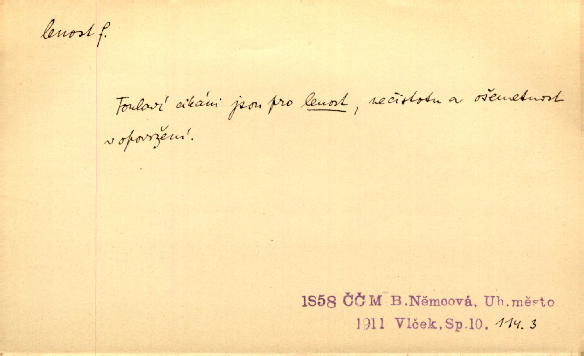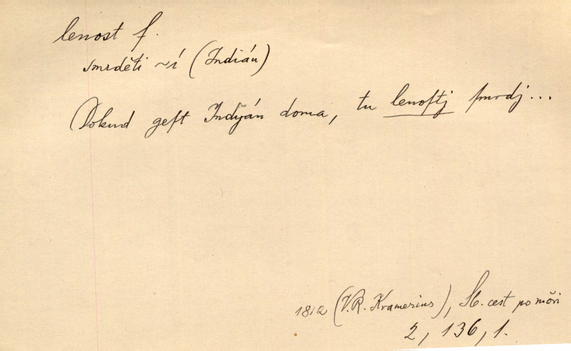 - lenost, -i f. nechut k práci, záliba v nečinnosti, lenivost, zahálčivost. Toulaví cikáni jsou pro lenost, nečistotu a ošemetnost v opovržení. Něm. Prál mu [president praktikantovi]‚ aby pilně pracoval, že prý beztoho leností až smrdí. Ner. Co mu na tom záleželo, poslouchala-li jeho budoucí snacha z lenosti duševní neb z jiné příčiny: jen když vůbec poslouchala a mlčela! Svět.