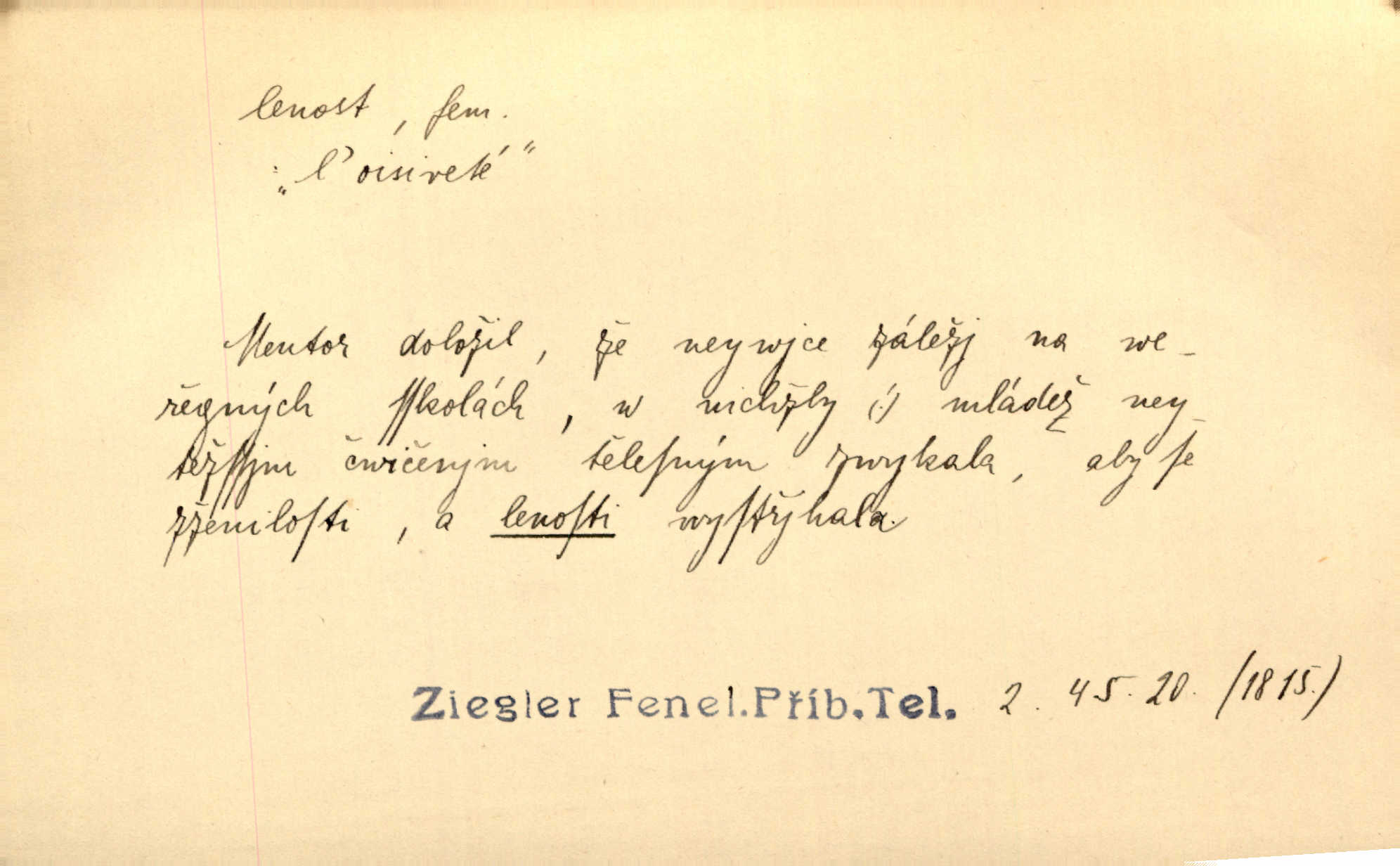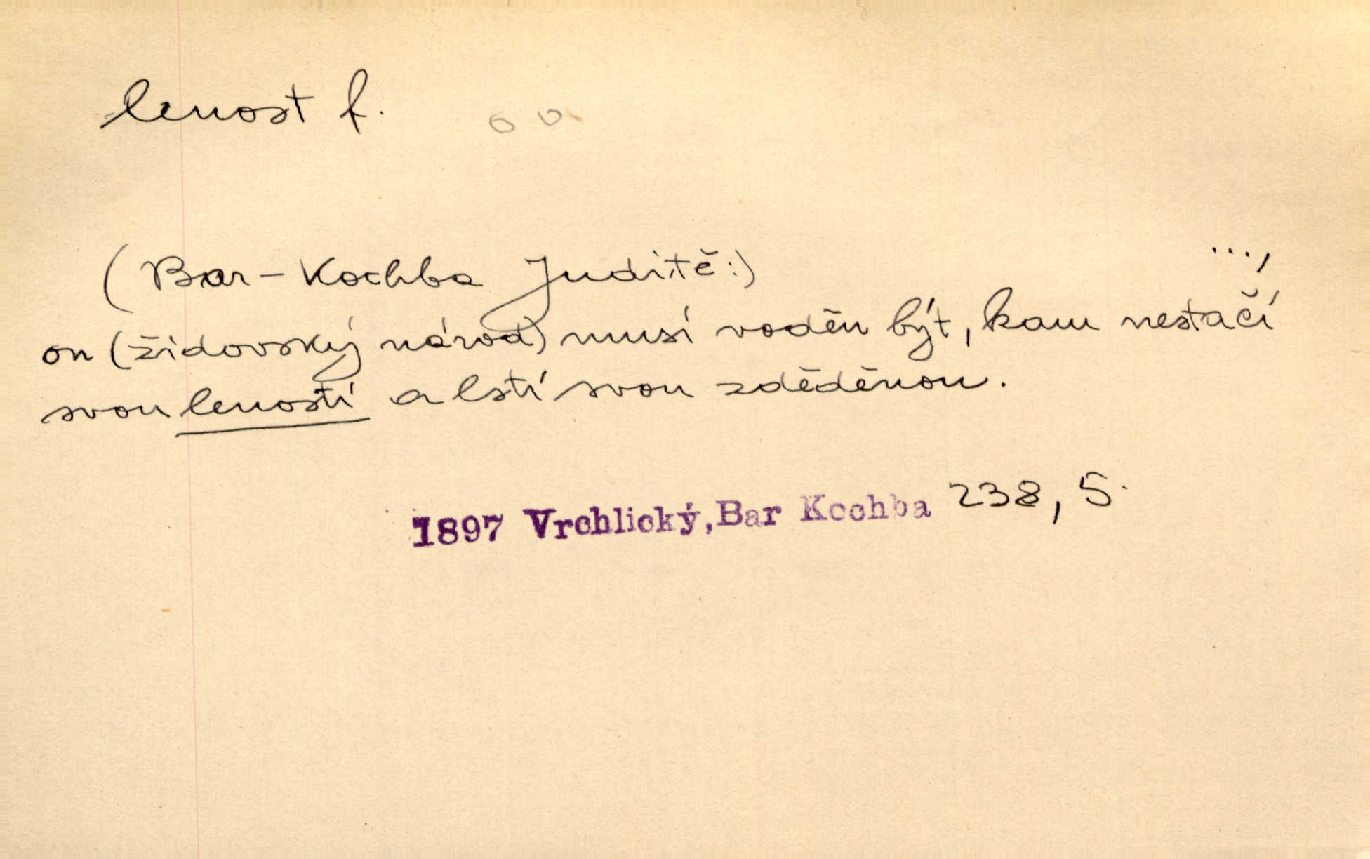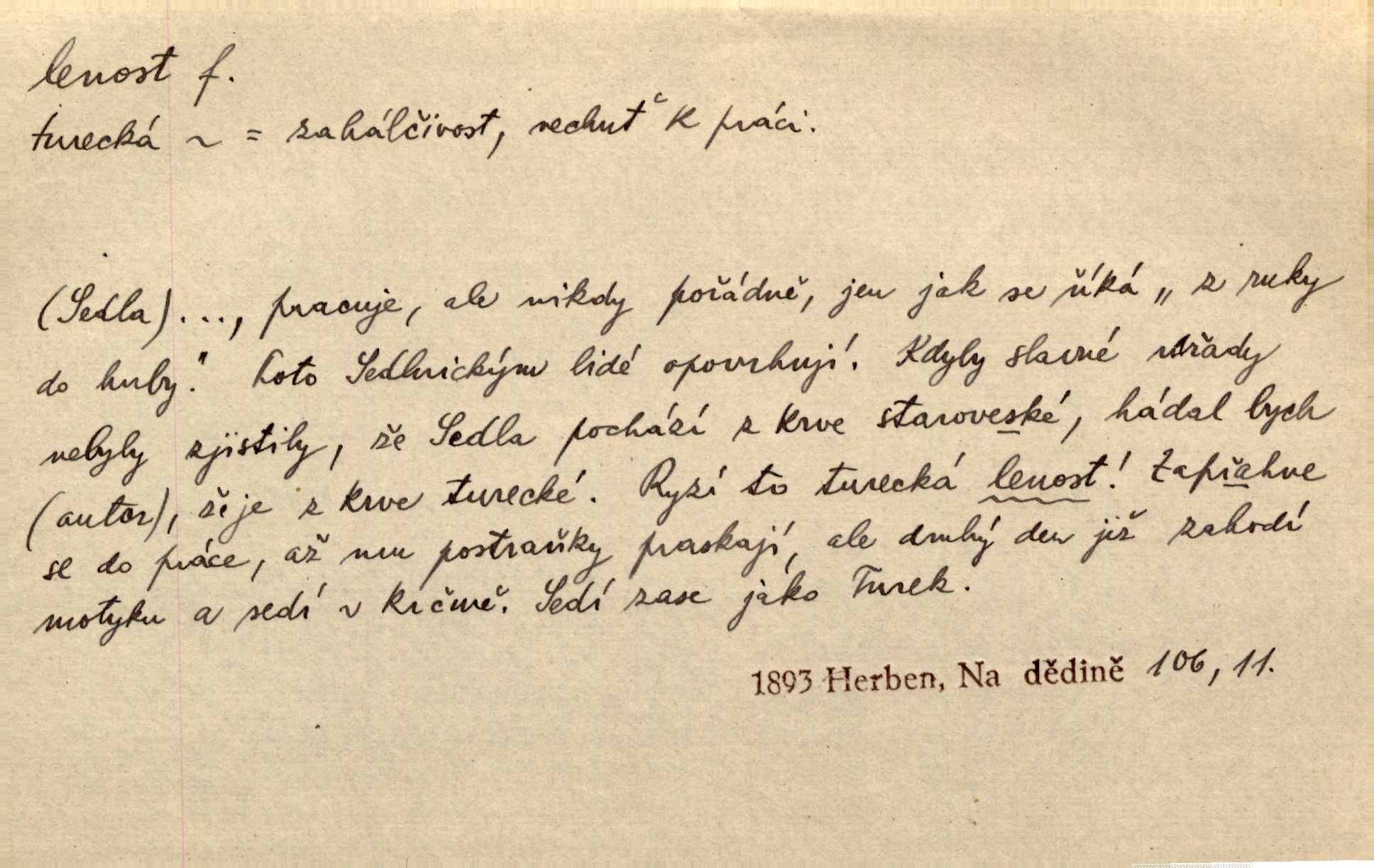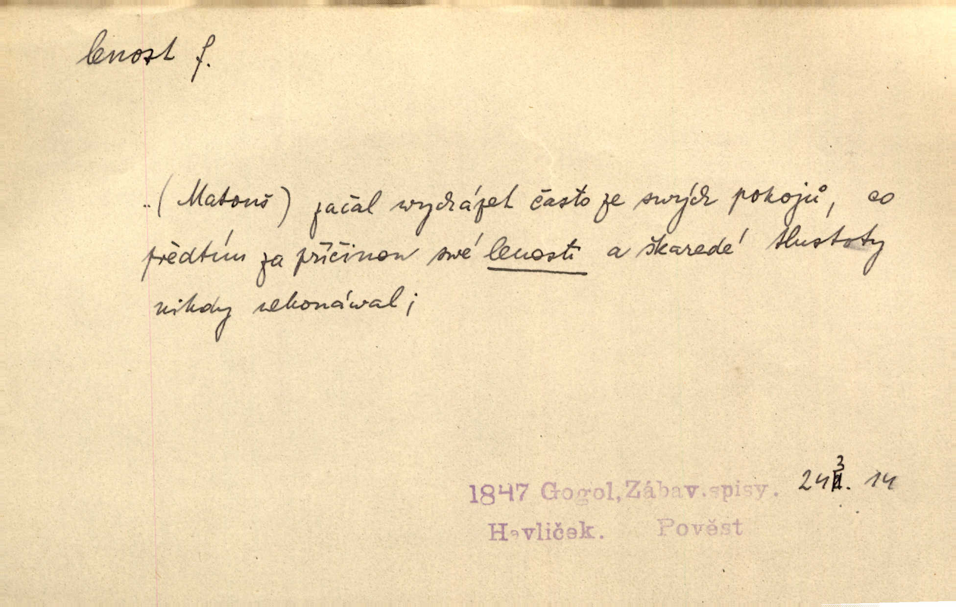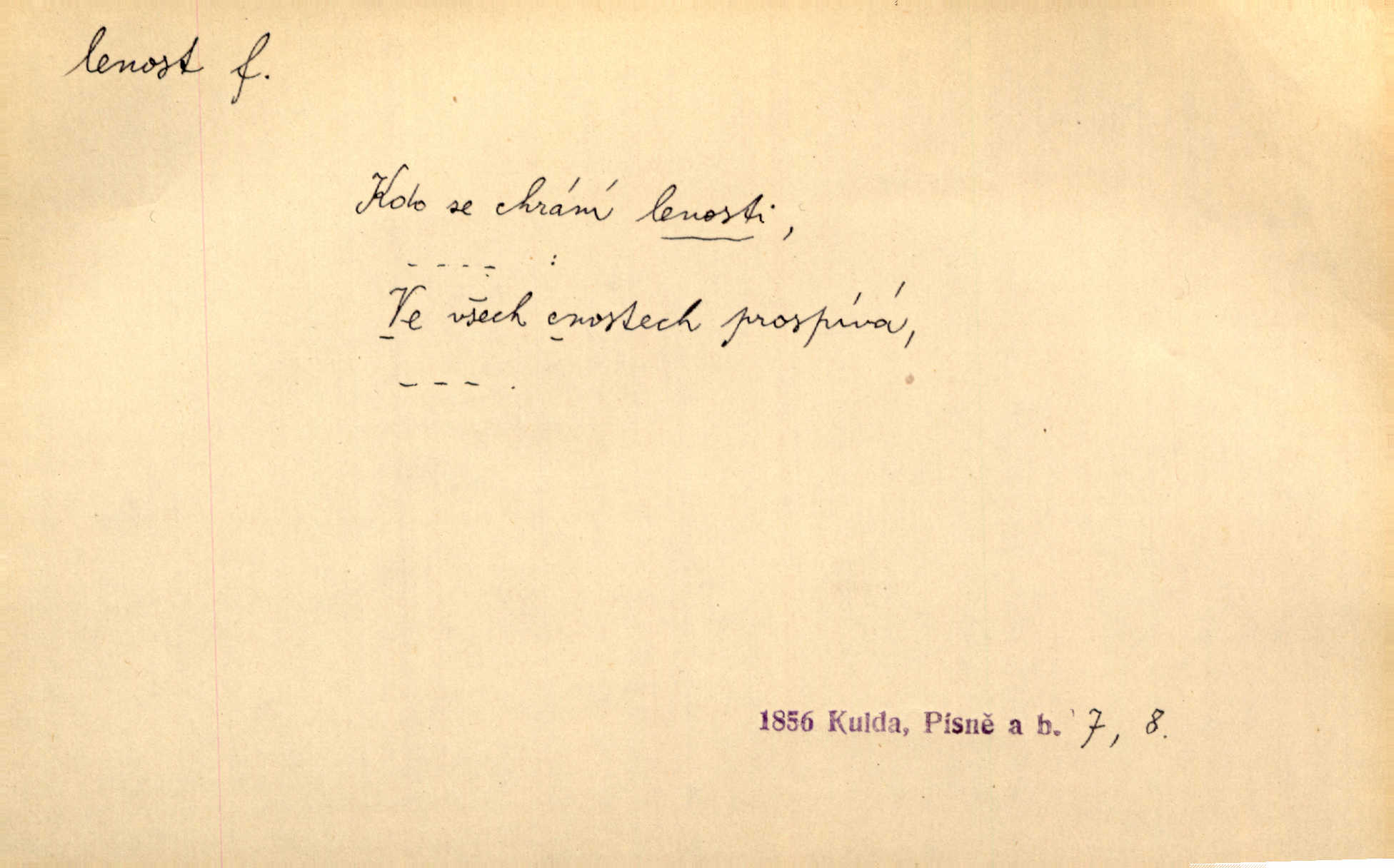 - lenost, -i f. nechut k práci, záliba v nečinnosti, lenivost, zahálčivost. Toulaví cikáni jsou pro lenost, nečistotu a ošemetnost v opovržení. Něm. Prál mu [president praktikantovi]‚ aby pilně pracoval, že prý beztoho leností až smrdí. Ner. Co mu na tom záleželo, poslouchala-li jeho budoucí snacha z lenosti duševní neb z jiné příčiny: jen když vůbec poslouchala a mlčela! Svět.