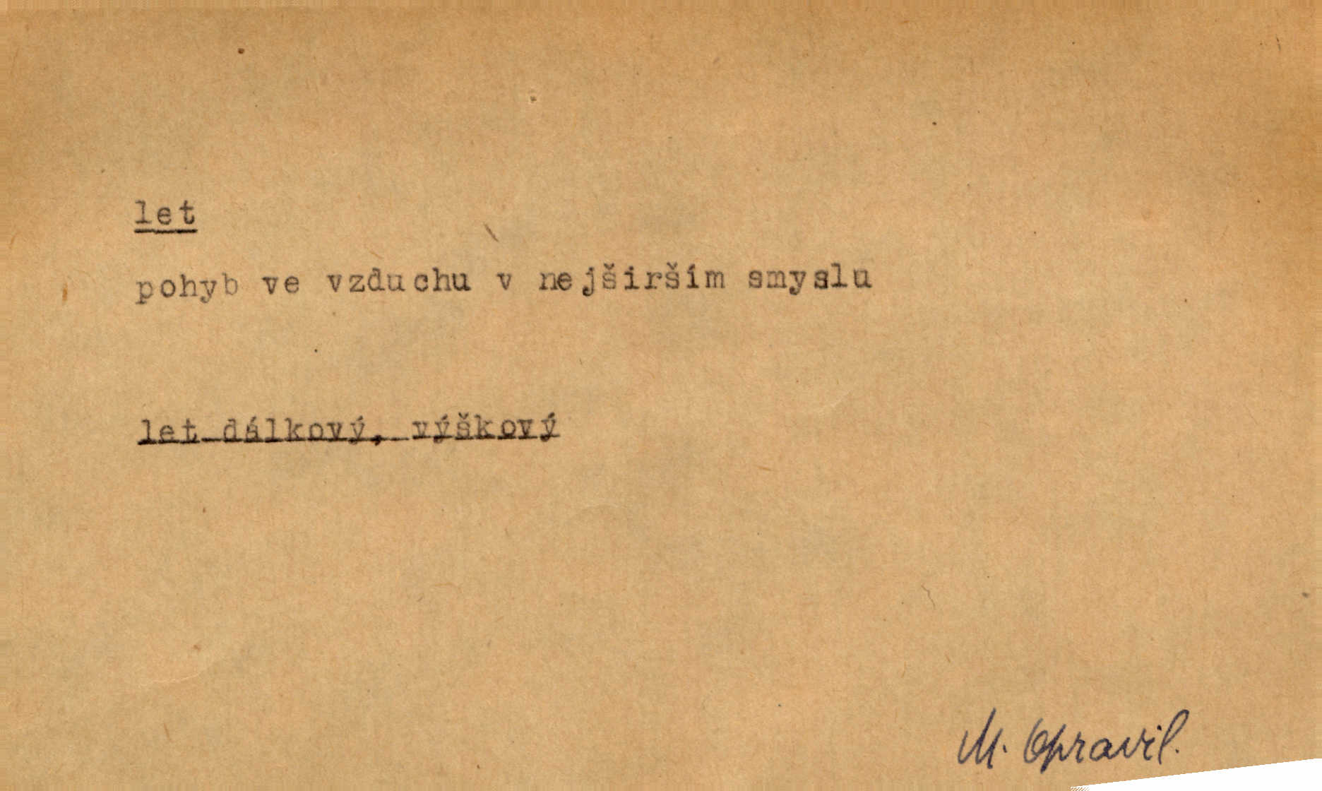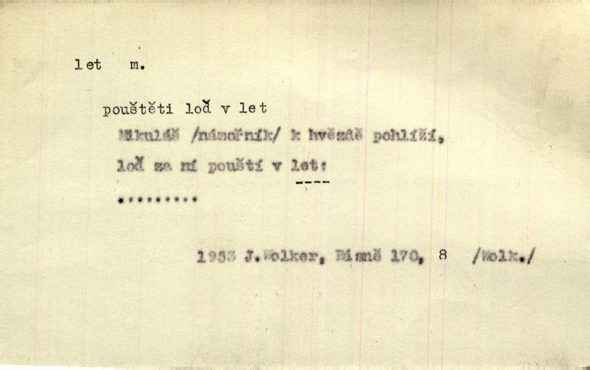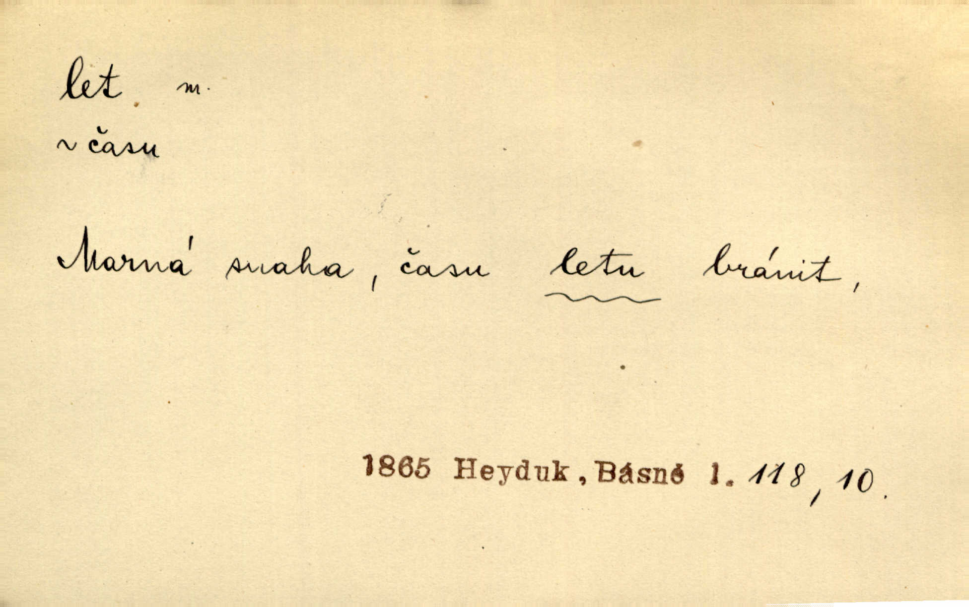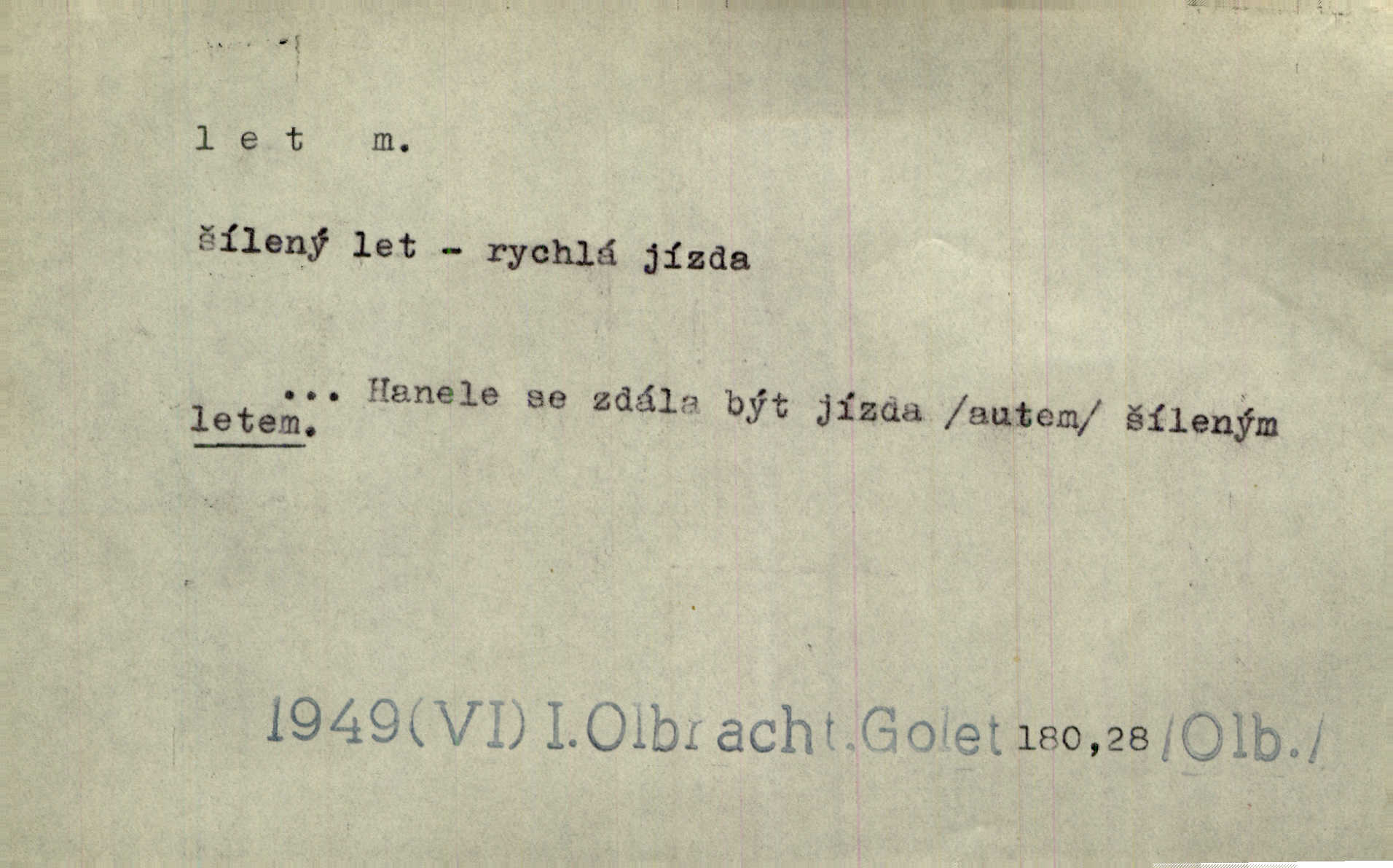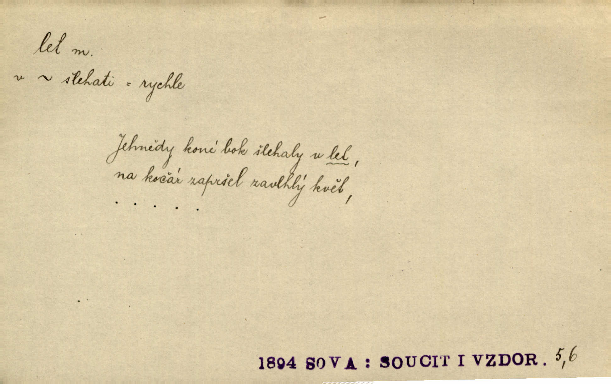 - let, -u m. pohyb ve vzduchu vlastní silou, na př. křídly. Těžkým letem ulétala vrána. Jir. Večerním šerem nad jezerem neslyšným letem sova přeletla. Vrba. Svatojanské mušky křidélka svá rozpínaly k letu. Vrch. Modří motýlci honí se trhavým letem od květu ke květu. Mach. Let. let vzestupný, sestupný, vodorovný; let na zádech při němž letec směřuje hlavou dolů; let hadovitý při němž letoun zachovávaje stejnou výšku mění ustavičně směr; let v kličkách při kterém letoun mění neustále výšku i směr; let klouzavý při kterém letec vypne motor a snáší se setrvačností, jen drakovitým působením křídel pomalu k zemi; let střemhlav při kterém letec letí prudce k zemi ve směru téměř svislém; let dálkový, let výškový. D jiný pohyb ve vzduchu. Tak prudce vyhodil [pometlo]‚ že v letu až zafičelo. Něm. Cimbura vyhodil ji [tanečnici] do výše — [a] v letu jako ptáčka zachytil naškrobenou dívenku. Baar. V letu přikrčil nohy, i klesl do řeky až po prsa. Herrm. Voj. dráha letu střely pohybu od okamžiku výstřelu až k okamžiku nárazu. D rychlý pohyb vůbec. Rychlíku horečný ustal náhle let. Sova. Vzpomínám si na let vody smělý. Klášt. Let změnil se ve volný tanec. Rais. D spěch, chvat. Dívka pracovala, jako když ji honí; sotvaže s jedním byla hotova, už ptala se po novém. Bylo patrno, že v tom letu chce zapomenouti na myšlenky, jež ji tížily. Rais. List jeho byl v jediném letu napsán, šuměl radostí. Svob. Marná snaha, času letu bránit. Heyd. Těchto květů tísně se netknul času let ni špíny rmut. Vrch. Lid. Teď budete v cuku letu spát, protože je noc ihned. Pujmanová. D rychlé šíření, rozšiřování se, rozmáhání se. Od míst, kde zlatí slunce hvozdy tmavy, se požár vírem v divoký dal let. Vrch. Ukázalo se za nějaký čas, že pověst letem vzrostla. Jir. Tak prudký a vítězný let milované ideje, že se lidé vzpamatovali teprv, když lodě stahovaly svoje plachty v přístavu. V. Mrš. D Bás. o vzletu, kypění, silném rozvinutí duševní schopnosti. Můj duch se rozpial plným letem. Hál. Jich [apoštolů] čelo plno vznešených je dum, let myšlének je vznáší k nebesům. X. Dvoř. Její [chůvina] pohádková fantasie předčila letem svým chod událostí. Podl. [Sládkova sbírka] obsahující vedle svěžích písní lehkého letu a vedle vybroušených sonettů také mnoho meditační lyriky intimní. Arne N.