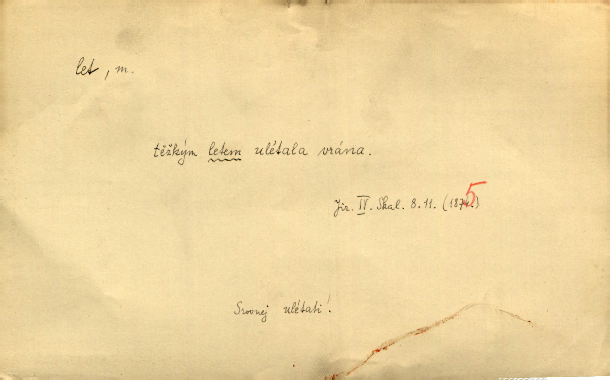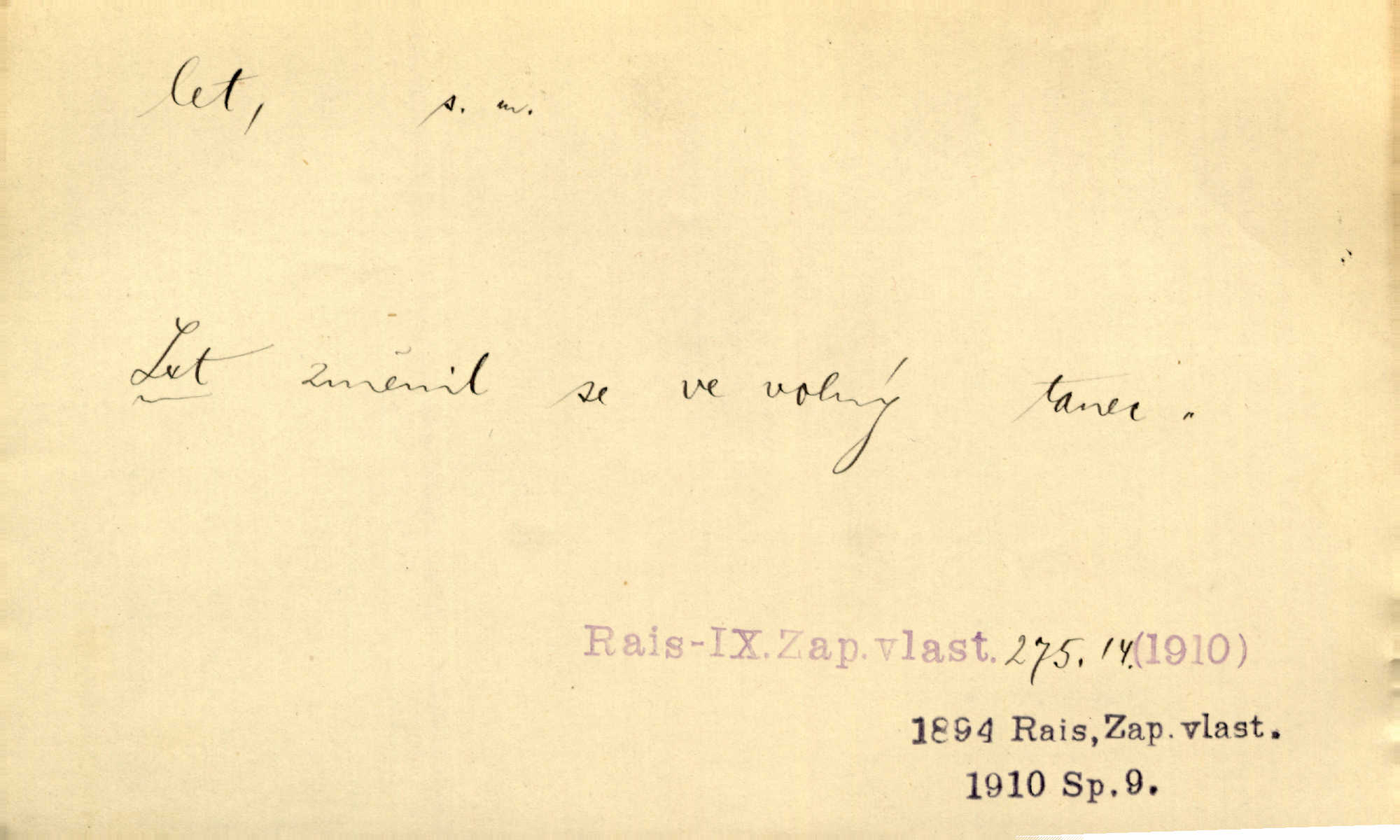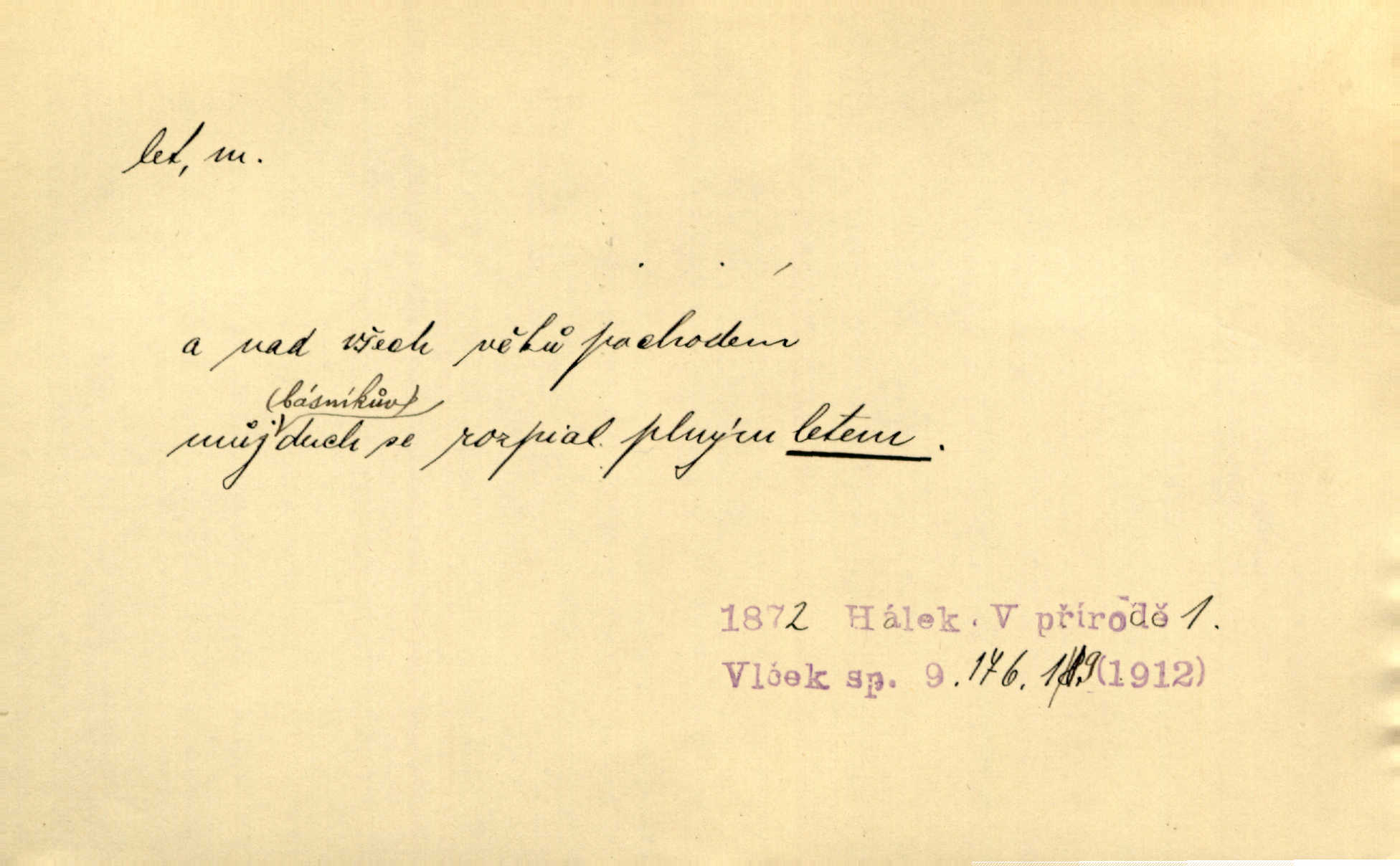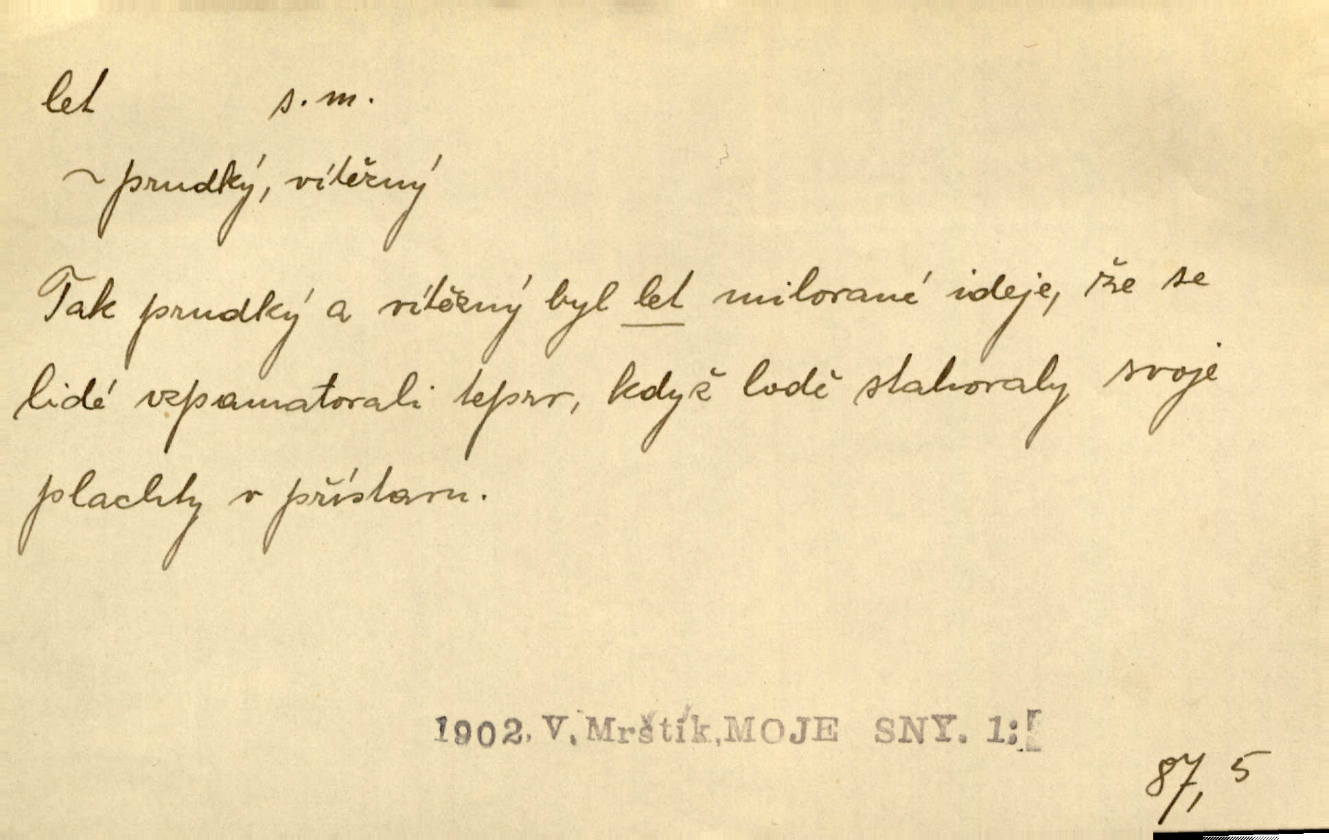 - let, -u m. pohyb ve vzduchu vlastní silou, na př. křídly. Těžkým letem ulétala vrána. Jir. Večerním šerem nad jezerem neslyšným letem sova přeletla. Vrba. Svatojanské mušky křidélka svá rozpínaly k letu. Vrch. Modří motýlci honí se trhavým letem od květu ke květu. Mach. Let. let vzestupný, sestupný, vodorovný; let na zádech při němž letec směřuje hlavou dolů; let hadovitý při němž letoun zachovávaje stejnou výšku mění ustavičně směr; let v kličkách při kterém letoun mění neustále výšku i směr; let klouzavý při kterém letec vypne motor a snáší se setrvačností, jen drakovitým působením křídel pomalu k zemi; let střemhlav při kterém letec letí prudce k zemi ve směru téměř svislém; let dálkový, let výškový. D jiný pohyb ve vzduchu. Tak prudce vyhodil [pometlo]‚ že v letu až zafičelo. Něm. Cimbura vyhodil ji [tanečnici] do výše — [a] v letu jako ptáčka zachytil naškrobenou dívenku. Baar. V letu přikrčil nohy, i klesl do řeky až po prsa. Herrm. Voj. dráha letu střely pohybu od okamžiku výstřelu až k okamžiku nárazu. D rychlý pohyb vůbec. Rychlíku horečný ustal náhle let. Sova. Vzpomínám si na let vody smělý. Klášt. Let změnil se ve volný tanec. Rais. D spěch, chvat. Dívka pracovala, jako když ji honí; sotvaže s jedním byla hotova, už ptala se po novém. Bylo patrno, že v tom letu chce zapomenouti na myšlenky, jež ji tížily. Rais. List jeho byl v jediném letu napsán, šuměl radostí. Svob. Marná snaha, času letu bránit. Heyd. Těchto květů tísně se netknul času let ni špíny rmut. Vrch. Lid. Teď budete v cuku letu spát, protože je noc ihned. Pujmanová. D rychlé šíření, rozšiřování se, rozmáhání se. Od míst, kde zlatí slunce hvozdy tmavy, se požár vírem v divoký dal let. Vrch. Ukázalo se za nějaký čas, že pověst letem vzrostla. Jir. Tak prudký a vítězný let milované ideje, že se lidé vzpamatovali teprv, když lodě stahovaly svoje plachty v přístavu. V. Mrš. D Bás. o vzletu, kypění, silném rozvinutí duševní schopnosti. Můj duch se rozpial plným letem. Hál. Jich [apoštolů] čelo plno vznešených je dum, let myšlének je vznáší k nebesům. X. Dvoř. Její [chůvina] pohádková fantasie předčila letem svým chod událostí. Podl. [Sládkova sbírka] obsahující vedle svěžích písní lehkého letu a vedle vybroušených sonettů také mnoho meditační lyriky intimní. Arne N.