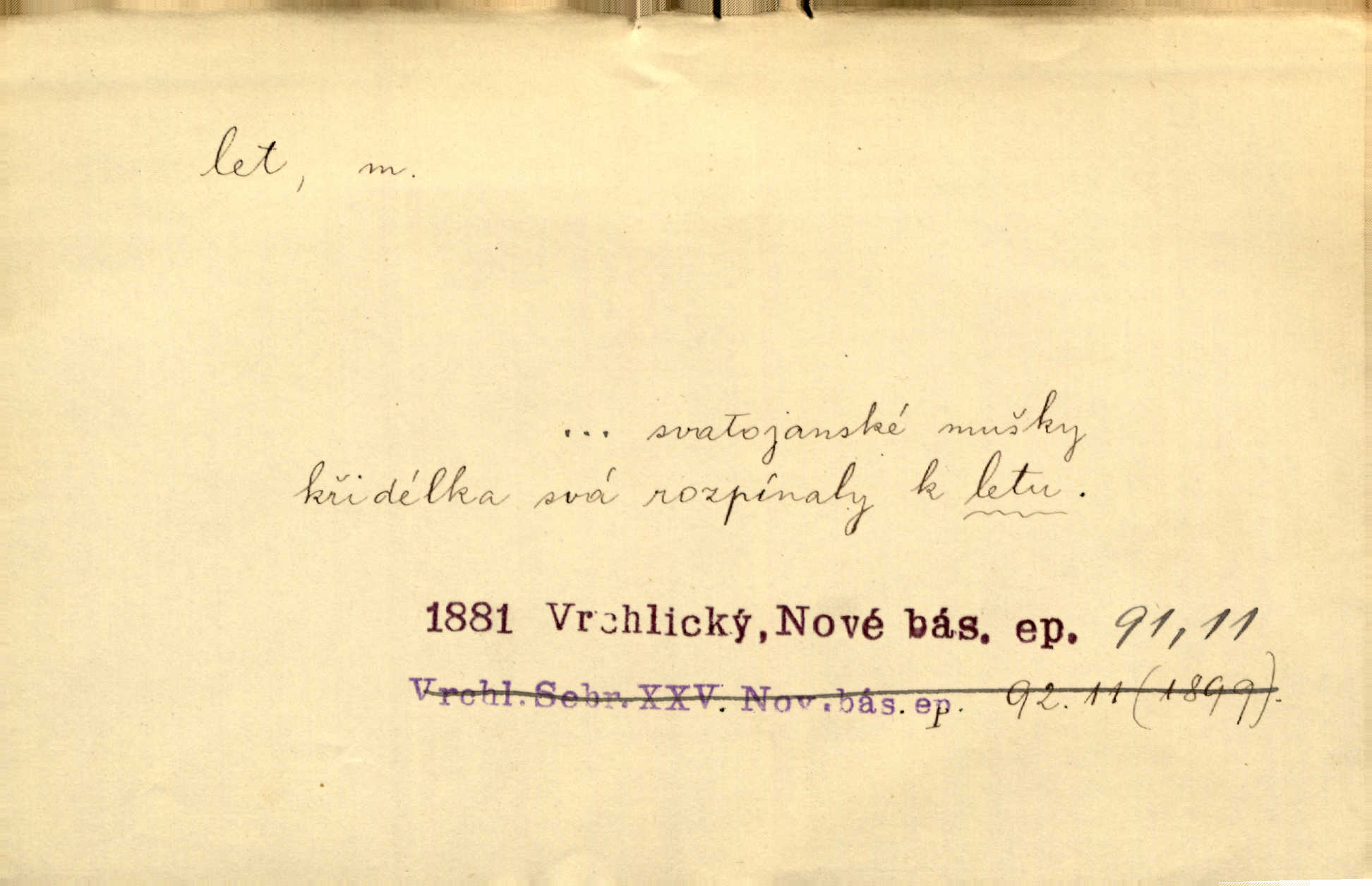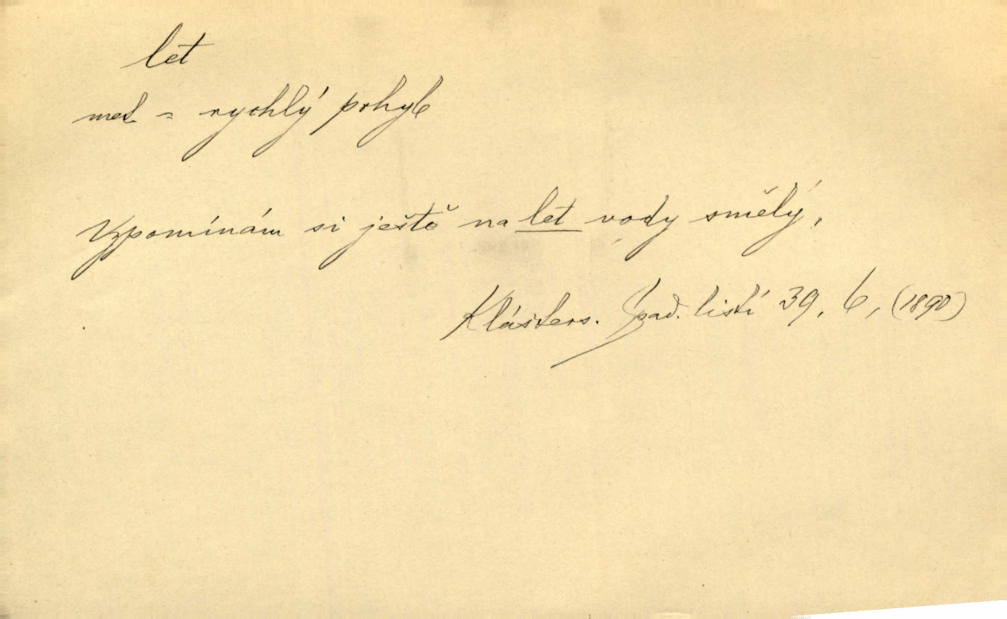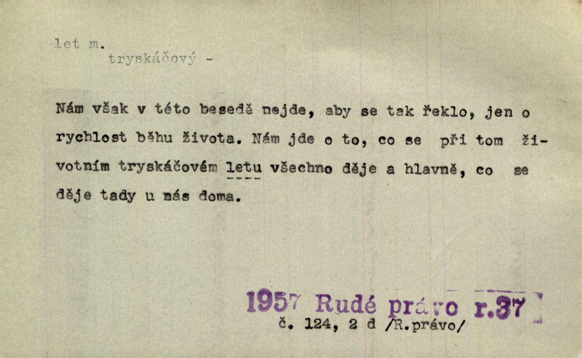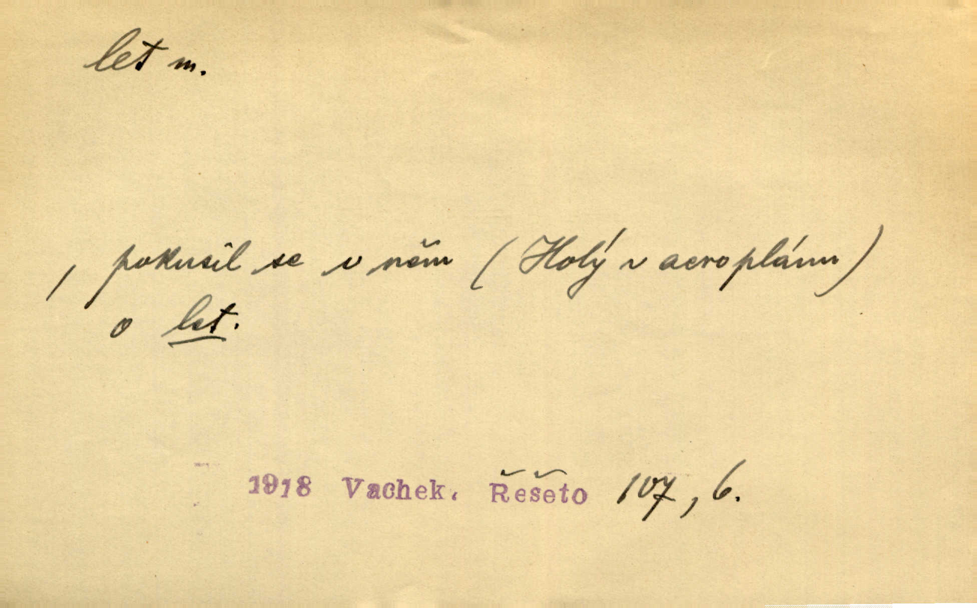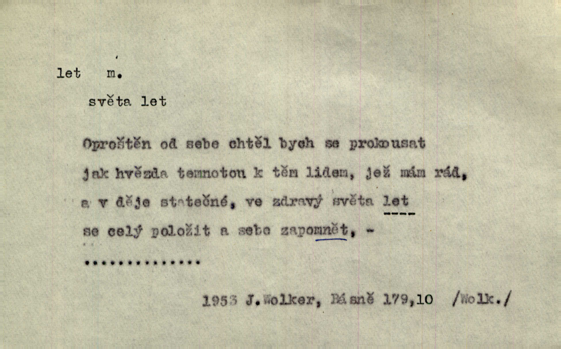 - let, -u m. pohyb ve vzduchu vlastní silou, na př. křídly. Těžkým letem ulétala vrána. Jir. Večerním šerem nad jezerem neslyšným letem sova přeletla. Vrba. Svatojanské mušky křidélka svá rozpínaly k letu. Vrch. Modří motýlci honí se trhavým letem od květu ke květu. Mach. Let. let vzestupný, sestupný, vodorovný; let na zádech při němž letec směřuje hlavou dolů; let hadovitý při němž letoun zachovávaje stejnou výšku mění ustavičně směr; let v kličkách při kterém letoun mění neustále výšku i směr; let klouzavý při kterém letec vypne motor a snáší se setrvačností, jen drakovitým působením křídel pomalu k zemi; let střemhlav při kterém letec letí prudce k zemi ve směru téměř svislém; let dálkový, let výškový. D jiný pohyb ve vzduchu. Tak prudce vyhodil [pometlo]‚ že v letu až zafičelo. Něm. Cimbura vyhodil ji [tanečnici] do výše — [a] v letu jako ptáčka zachytil naškrobenou dívenku. Baar. V letu přikrčil nohy, i klesl do řeky až po prsa. Herrm. Voj. dráha letu střely pohybu od okamžiku výstřelu až k okamžiku nárazu. D rychlý pohyb vůbec. Rychlíku horečný ustal náhle let. Sova. Vzpomínám si na let vody smělý. Klášt. Let změnil se ve volný tanec. Rais. D spěch, chvat. Dívka pracovala, jako když ji honí; sotvaže s jedním byla hotova, už ptala se po novém. Bylo patrno, že v tom letu chce zapomenouti na myšlenky, jež ji tížily. Rais. List jeho byl v jediném letu napsán, šuměl radostí. Svob. Marná snaha, času letu bránit. Heyd. Těchto květů tísně se netknul času let ni špíny rmut. Vrch. Lid. Teď budete v cuku letu spát, protože je noc ihned. Pujmanová. D rychlé šíření, rozšiřování se, rozmáhání se. Od míst, kde zlatí slunce hvozdy tmavy, se požár vírem v divoký dal let. Vrch. Ukázalo se za nějaký čas, že pověst letem vzrostla. Jir. Tak prudký a vítězný let milované ideje, že se lidé vzpamatovali teprv, když lodě stahovaly svoje plachty v přístavu. V. Mrš. D Bás. o vzletu, kypění, silném rozvinutí duševní schopnosti. Můj duch se rozpial plným letem. Hál. Jich [apoštolů] čelo plno vznešených je dum, let myšlének je vznáší k nebesům. X. Dvoř. Její [chůvina] pohádková fantasie předčila letem svým chod událostí. Podl. [Sládkova sbírka] obsahující vedle svěžích písní lehkého letu a vedle vybroušených sonettů také mnoho meditační lyriky intimní. Arne N.