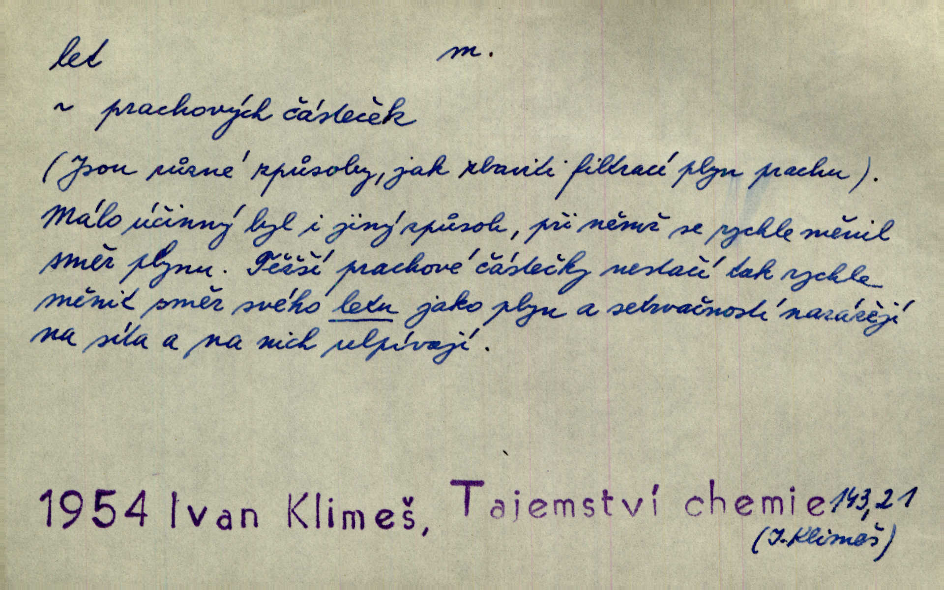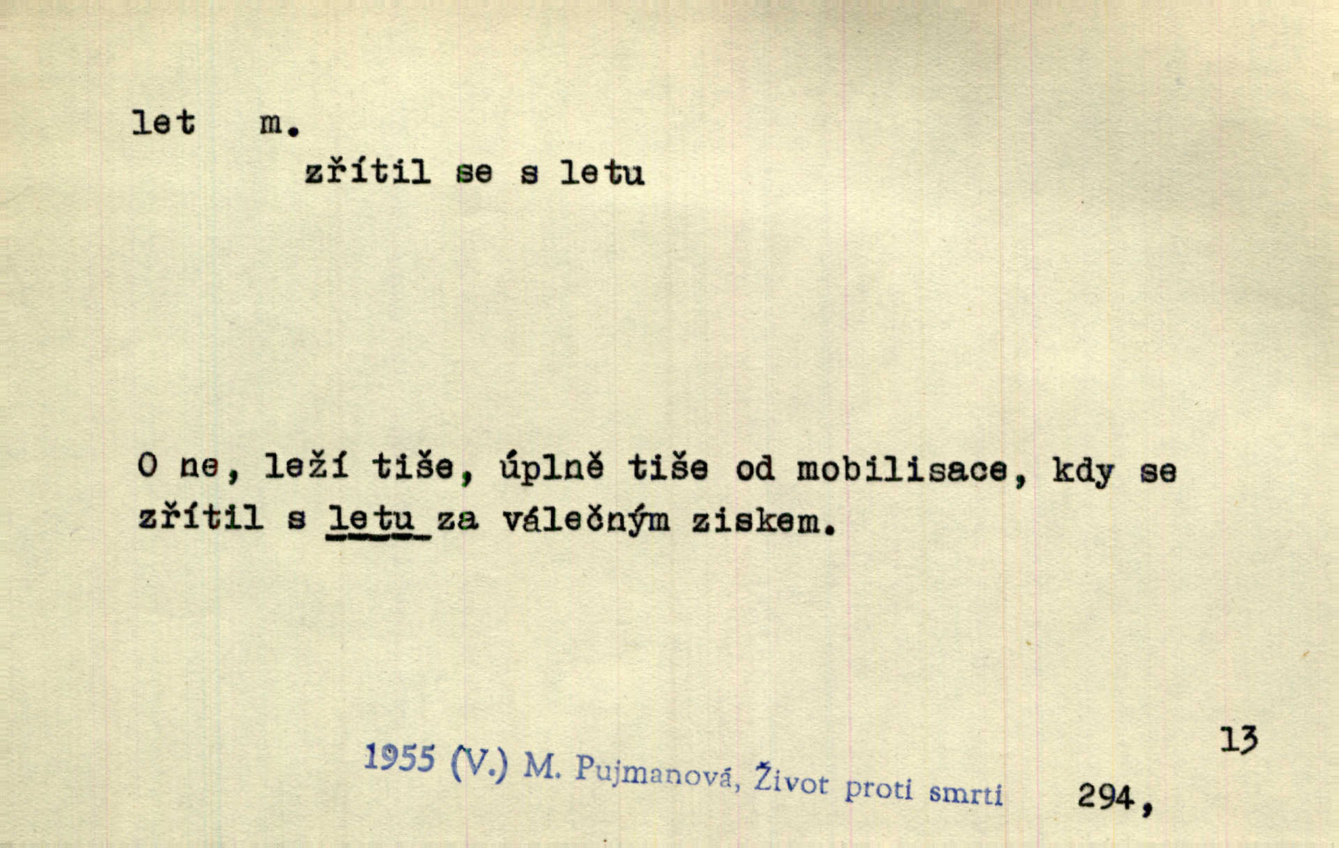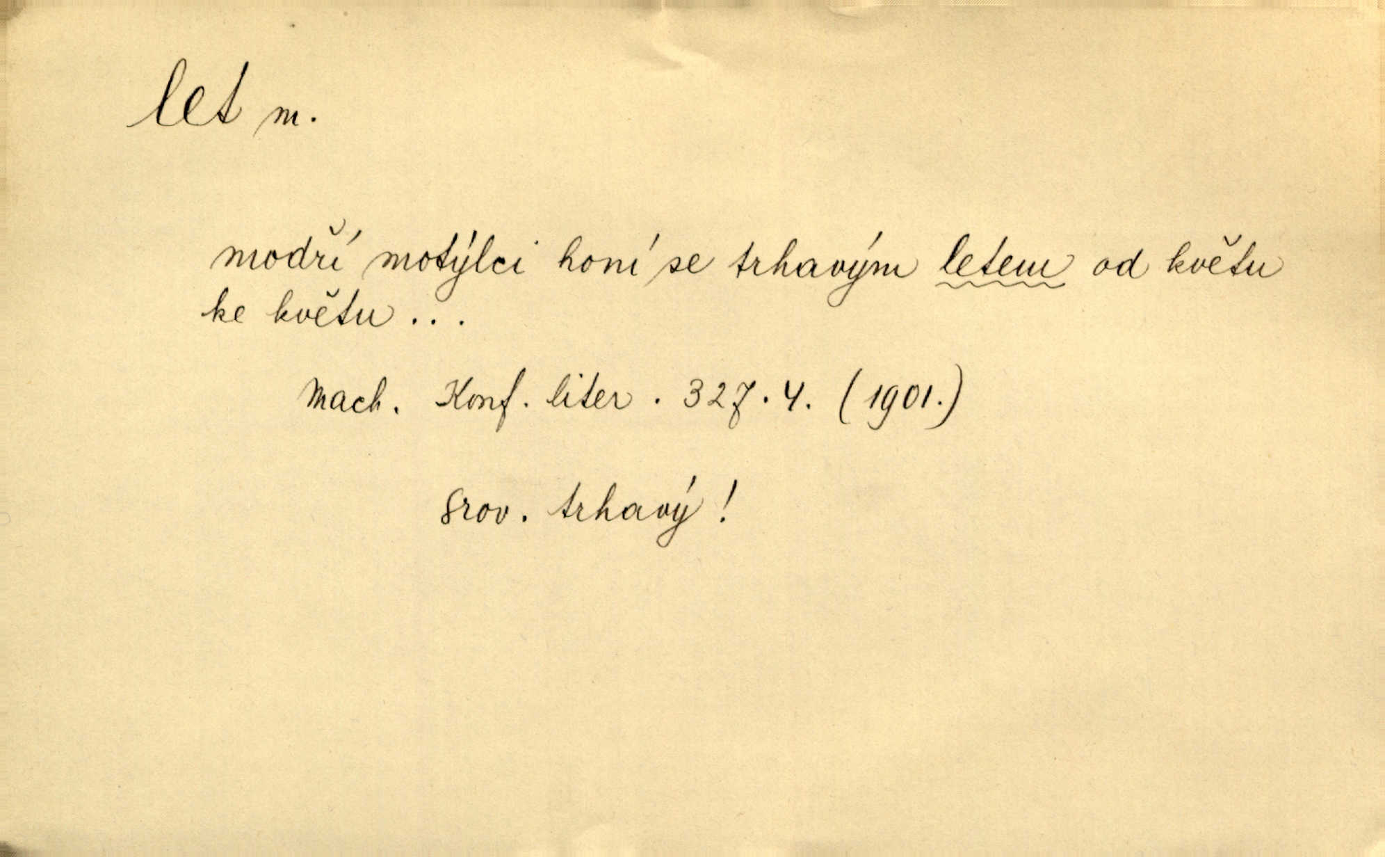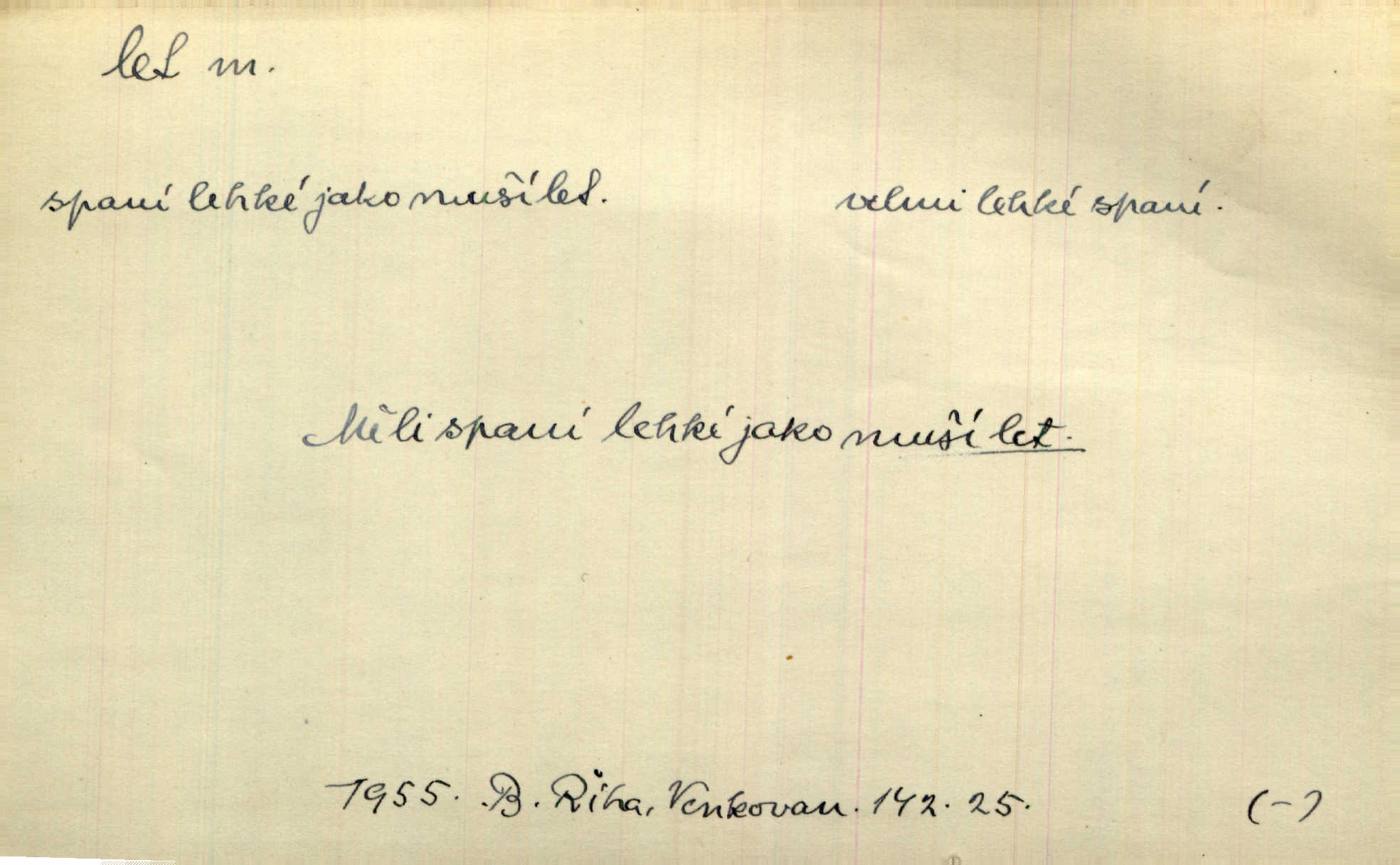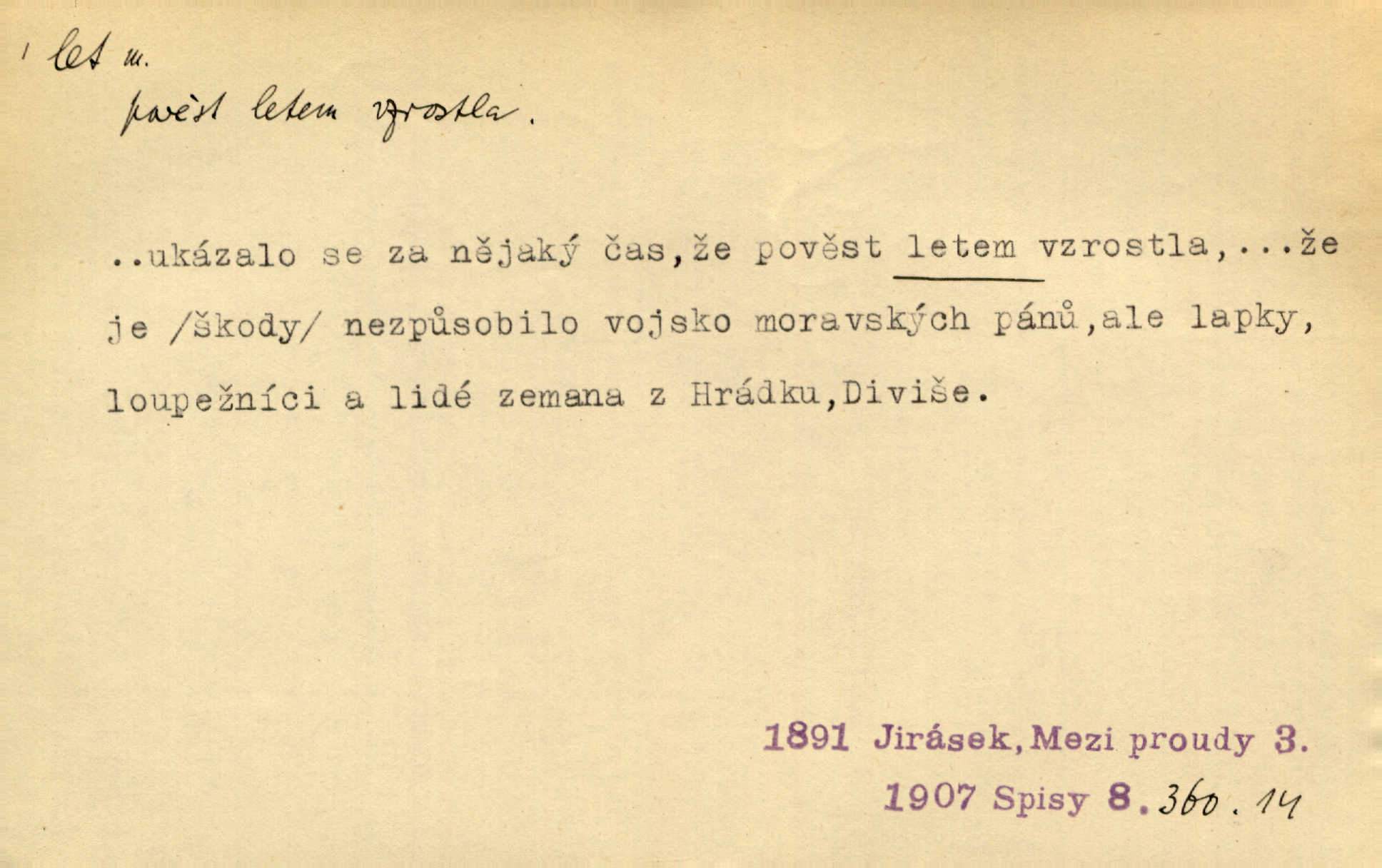 - let, -u m. pohyb ve vzduchu vlastní silou, na př. křídly. Těžkým letem ulétala vrána. Jir. Večerním šerem nad jezerem neslyšným letem sova přeletla. Vrba. Svatojanské mušky křidélka svá rozpínaly k letu. Vrch. Modří motýlci honí se trhavým letem od květu ke květu. Mach. Let. let vzestupný, sestupný, vodorovný; let na zádech při němž letec směřuje hlavou dolů; let hadovitý při němž letoun zachovávaje stejnou výšku mění ustavičně směr; let v kličkách při kterém letoun mění neustále výšku i směr; let klouzavý při kterém letec vypne motor a snáší se setrvačností, jen drakovitým působením křídel pomalu k zemi; let střemhlav při kterém letec letí prudce k zemi ve směru téměř svislém; let dálkový, let výškový. D jiný pohyb ve vzduchu. Tak prudce vyhodil [pometlo]‚ že v letu až zafičelo. Něm. Cimbura vyhodil ji [tanečnici] do výše — [a] v letu jako ptáčka zachytil naškrobenou dívenku. Baar. V letu přikrčil nohy, i klesl do řeky až po prsa. Herrm. Voj. dráha letu střely pohybu od okamžiku výstřelu až k okamžiku nárazu. D rychlý pohyb vůbec. Rychlíku horečný ustal náhle let. Sova. Vzpomínám si na let vody smělý. Klášt. Let změnil se ve volný tanec. Rais. D spěch, chvat. Dívka pracovala, jako když ji honí; sotvaže s jedním byla hotova, už ptala se po novém. Bylo patrno, že v tom letu chce zapomenouti na myšlenky, jež ji tížily. Rais. List jeho byl v jediném letu napsán, šuměl radostí. Svob. Marná snaha, času letu bránit. Heyd. Těchto květů tísně se netknul času let ni špíny rmut. Vrch. Lid. Teď budete v cuku letu spát, protože je noc ihned. Pujmanová. D rychlé šíření, rozšiřování se, rozmáhání se. Od míst, kde zlatí slunce hvozdy tmavy, se požár vírem v divoký dal let. Vrch. Ukázalo se za nějaký čas, že pověst letem vzrostla. Jir. Tak prudký a vítězný let milované ideje, že se lidé vzpamatovali teprv, když lodě stahovaly svoje plachty v přístavu. V. Mrš. D Bás. o vzletu, kypění, silném rozvinutí duševní schopnosti. Můj duch se rozpial plným letem. Hál. Jich [apoštolů] čelo plno vznešených je dum, let myšlének je vznáší k nebesům. X. Dvoř. Její [chůvina] pohádková fantasie předčila letem svým chod událostí. Podl. [Sládkova sbírka] obsahující vedle svěžích písní lehkého letu a vedle vybroušených sonettů také mnoho meditační lyriky intimní. Arne N.