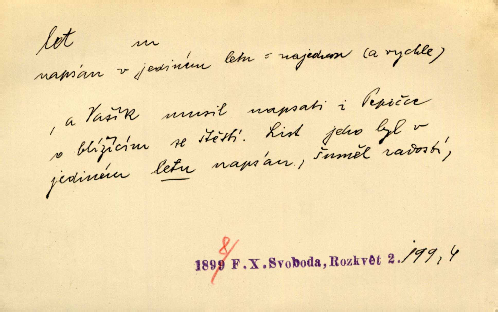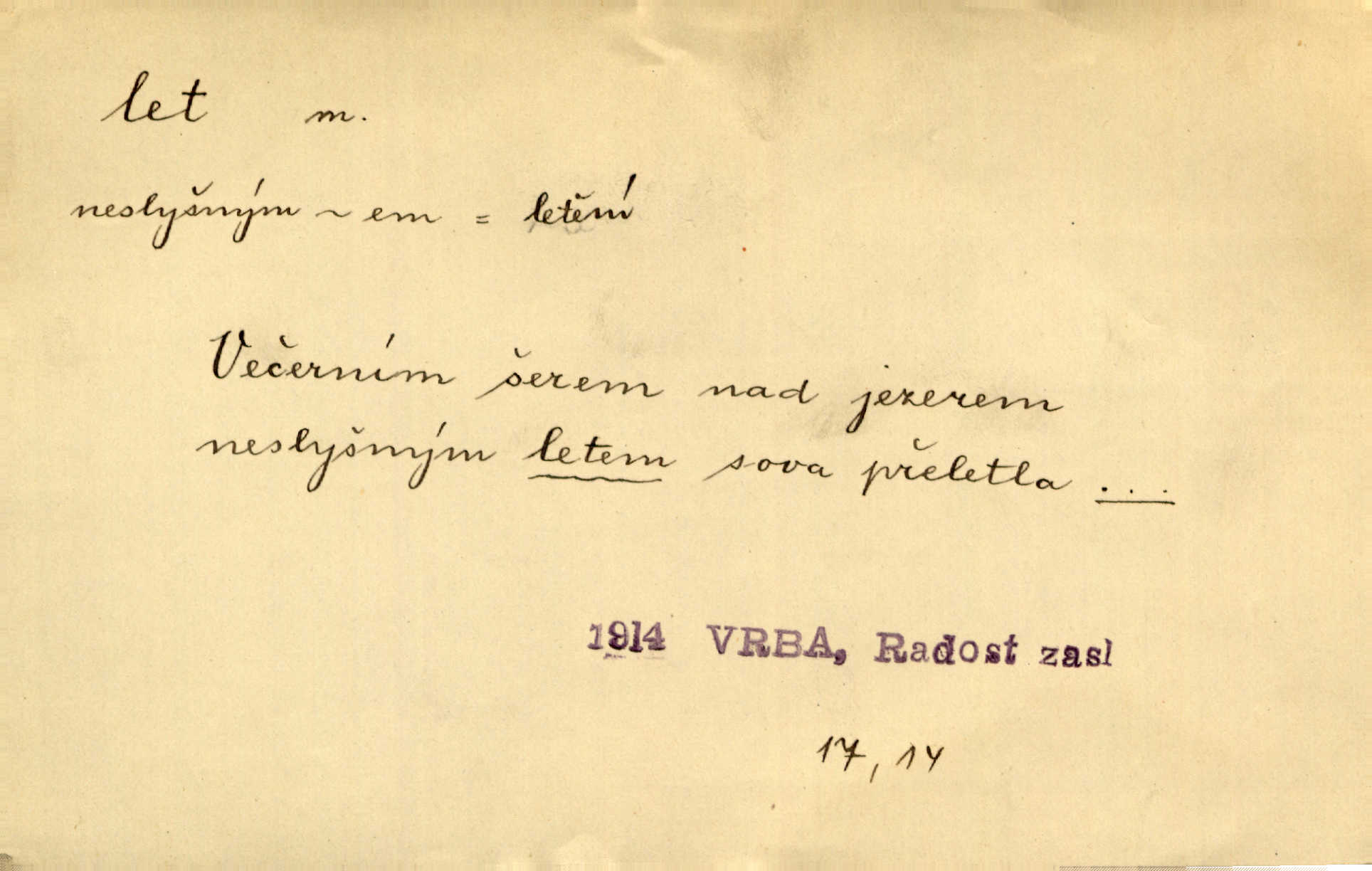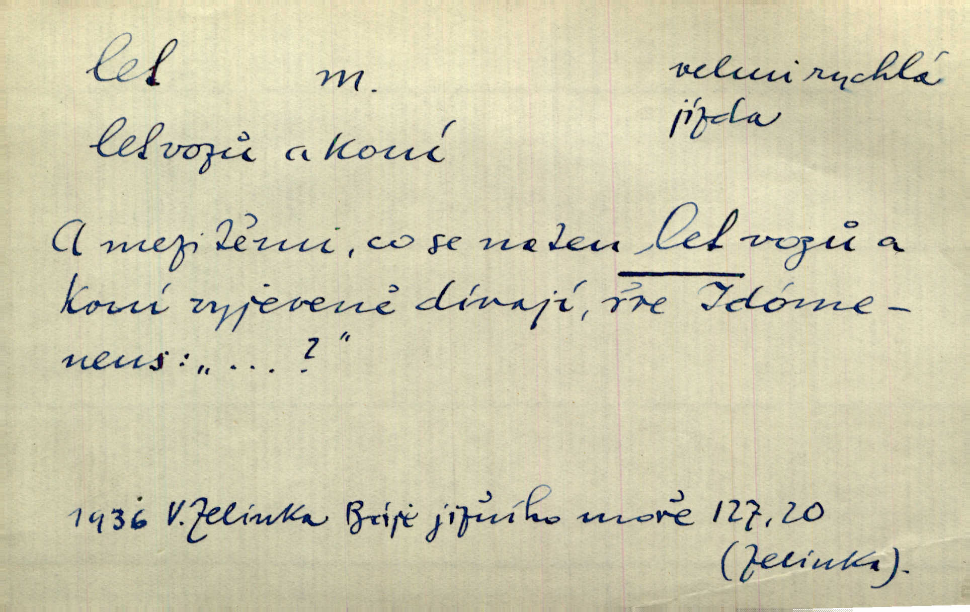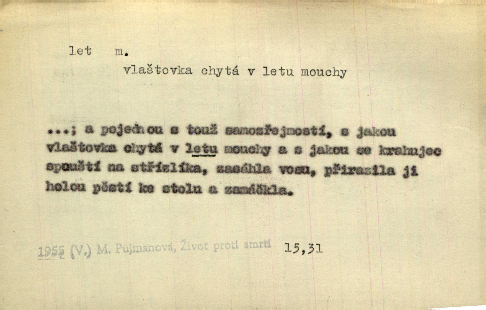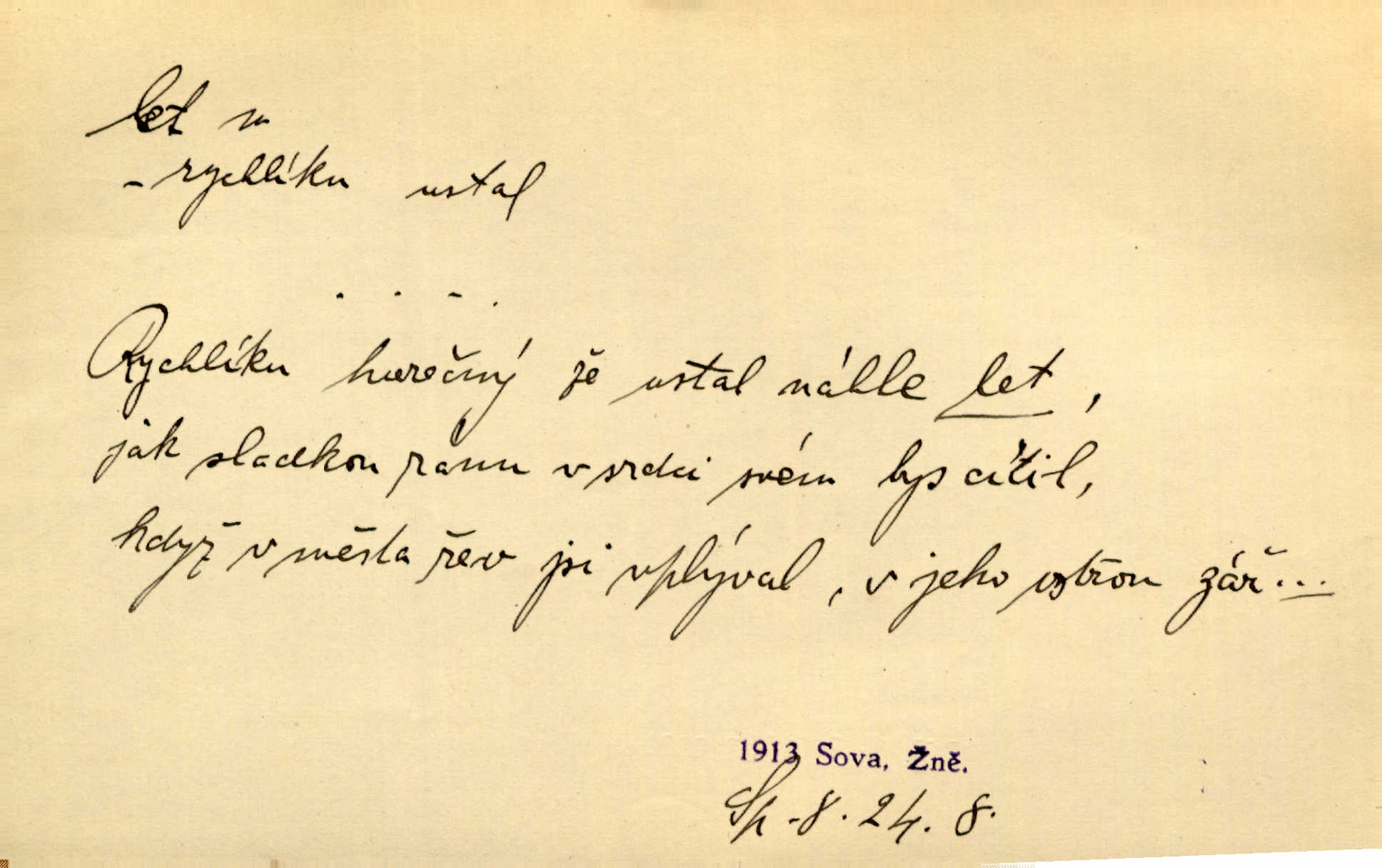 - let, -u m. pohyb ve vzduchu vlastní silou, na př. křídly. Těžkým letem ulétala vrána. Jir. Večerním šerem nad jezerem neslyšným letem sova přeletla. Vrba. Svatojanské mušky křidélka svá rozpínaly k letu. Vrch. Modří motýlci honí se trhavým letem od květu ke květu. Mach. Let. let vzestupný, sestupný, vodorovný; let na zádech při němž letec směřuje hlavou dolů; let hadovitý při němž letoun zachovávaje stejnou výšku mění ustavičně směr; let v kličkách při kterém letoun mění neustále výšku i směr; let klouzavý při kterém letec vypne motor a snáší se setrvačností, jen drakovitým působením křídel pomalu k zemi; let střemhlav při kterém letec letí prudce k zemi ve směru téměř svislém; let dálkový, let výškový. D jiný pohyb ve vzduchu. Tak prudce vyhodil [pometlo]‚ že v letu až zafičelo. Něm. Cimbura vyhodil ji [tanečnici] do výše — [a] v letu jako ptáčka zachytil naškrobenou dívenku. Baar. V letu přikrčil nohy, i klesl do řeky až po prsa. Herrm. Voj. dráha letu střely pohybu od okamžiku výstřelu až k okamžiku nárazu. D rychlý pohyb vůbec. Rychlíku horečný ustal náhle let. Sova. Vzpomínám si na let vody smělý. Klášt. Let změnil se ve volný tanec. Rais. D spěch, chvat. Dívka pracovala, jako když ji honí; sotvaže s jedním byla hotova, už ptala se po novém. Bylo patrno, že v tom letu chce zapomenouti na myšlenky, jež ji tížily. Rais. List jeho byl v jediném letu napsán, šuměl radostí. Svob. Marná snaha, času letu bránit. Heyd. Těchto květů tísně se netknul času let ni špíny rmut. Vrch. Lid. Teď budete v cuku letu spát, protože je noc ihned. Pujmanová. D rychlé šíření, rozšiřování se, rozmáhání se. Od míst, kde zlatí slunce hvozdy tmavy, se požár vírem v divoký dal let. Vrch. Ukázalo se za nějaký čas, že pověst letem vzrostla. Jir. Tak prudký a vítězný let milované ideje, že se lidé vzpamatovali teprv, když lodě stahovaly svoje plachty v přístavu. V. Mrš. D Bás. o vzletu, kypění, silném rozvinutí duševní schopnosti. Můj duch se rozpial plným letem. Hál. Jich [apoštolů] čelo plno vznešených je dum, let myšlének je vznáší k nebesům. X. Dvoř. Její [chůvina] pohádková fantasie předčila letem svým chod událostí. Podl. [Sládkova sbírka] obsahující vedle svěžích písní lehkého letu a vedle vybroušených sonettů také mnoho meditační lyriky intimní. Arne N.