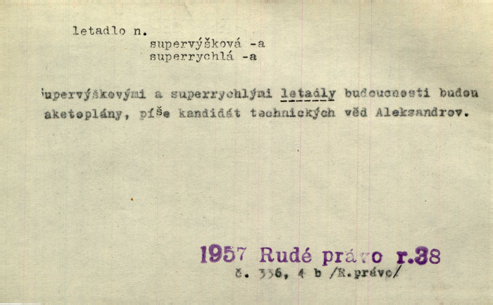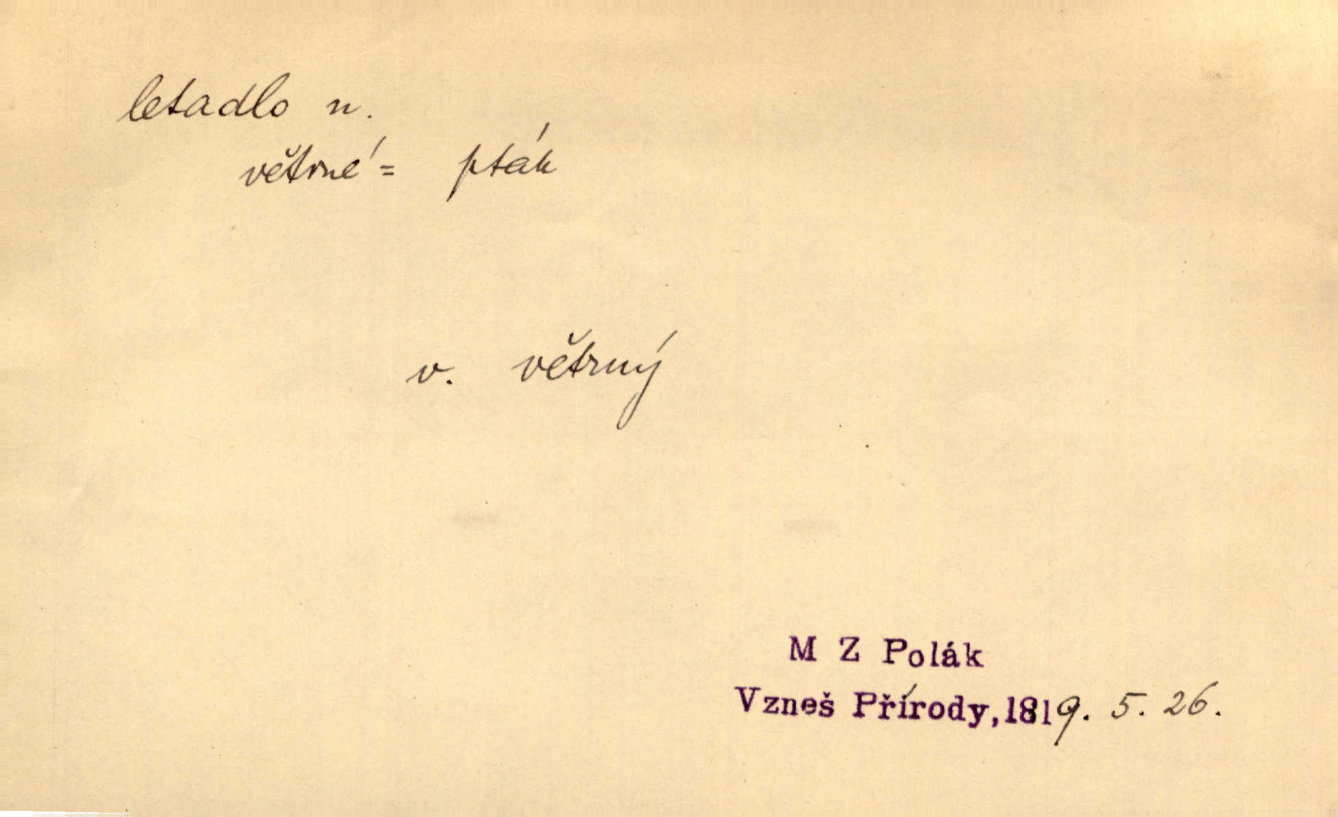 - letadlo, -a n. let. zařízení k dopravě osob a věcí, které se může pohybovati n. udržovati ve vzduchu a dá se alespoň částečně říditi; neodb. aeroplán. Nad parkem rozléhal se ohlušující téměř drkot motoru kolosálního létadla. Čap. Ch. Pan Védrines získával voliče létaje na letadle. Dyk. D Arch. pták. Létadla nebeská k nim [namalovaným hroznům] se snášela, aby je zobala. Hol. D křídlo, peruť. Ichthyosauři by se chtěli vznésti na svých potvorných létadlech do výšin. Dur. [Randa] by předstihl i nejrychlejší let ptáků nejpružnějších a nejvytrvalejších letadel. Arb.