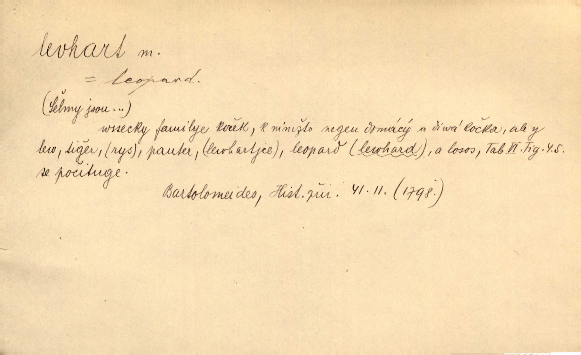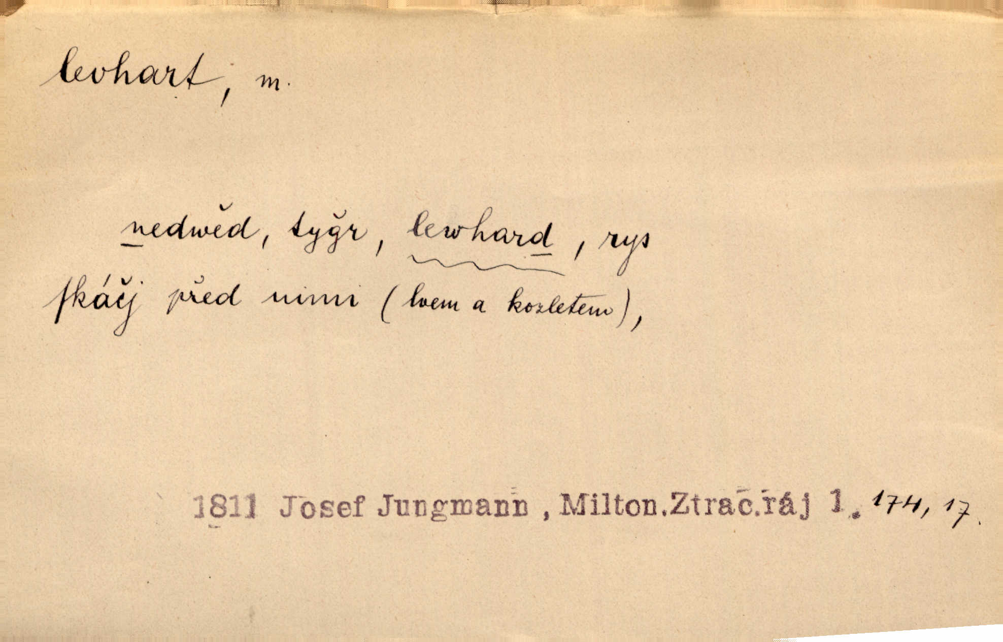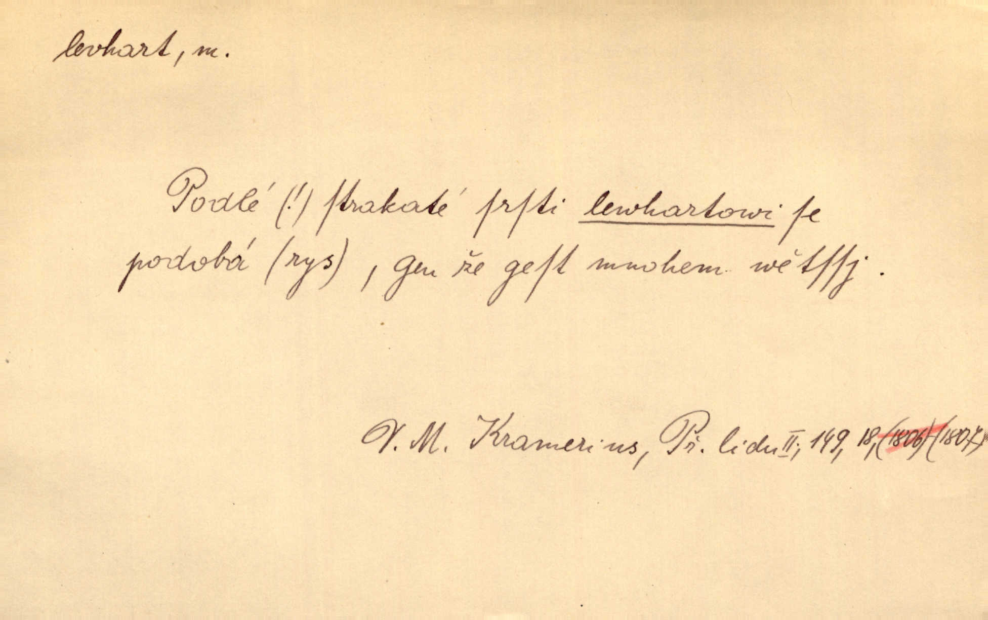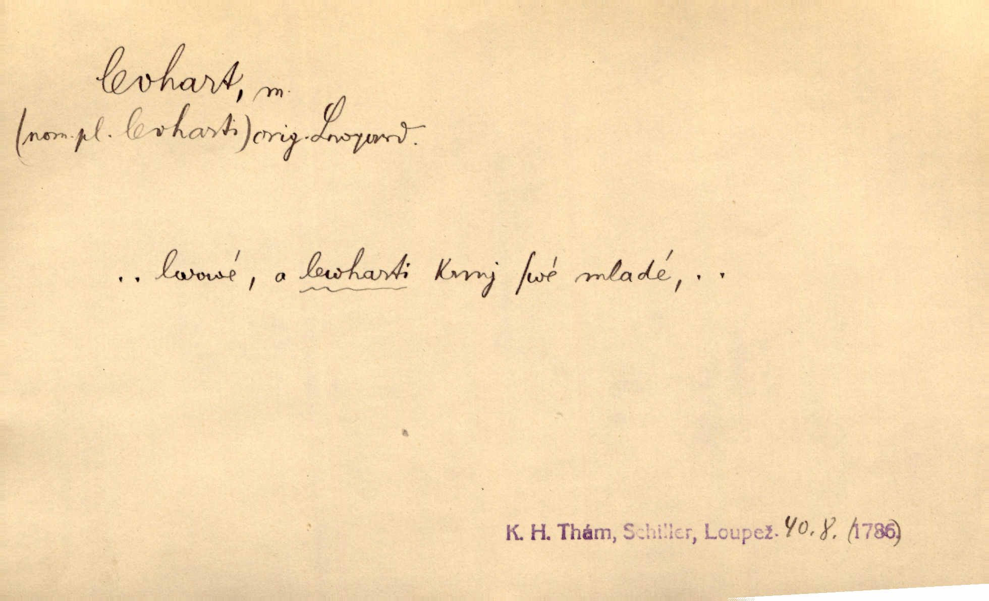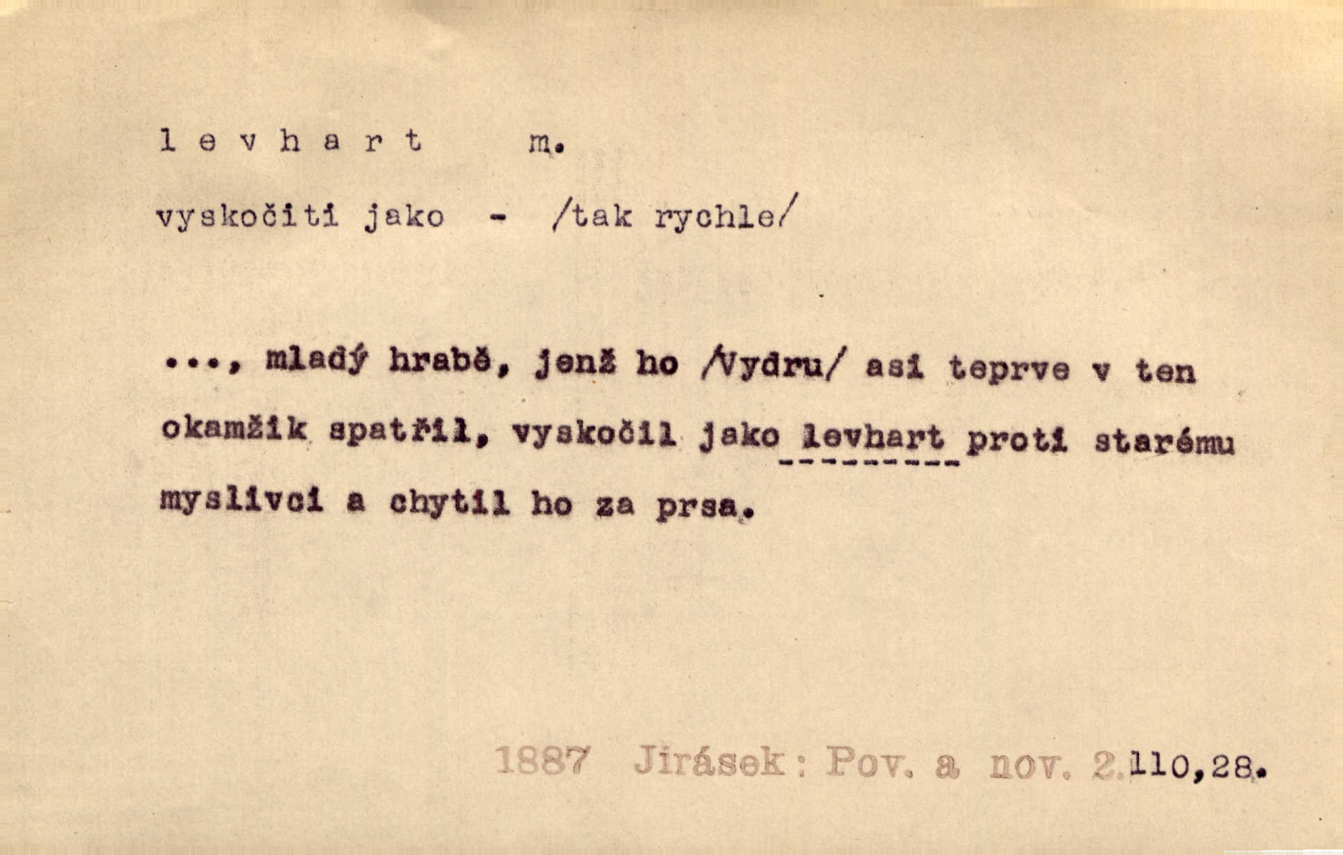 - levhart, -a m. dravá šelma Felis pardus, pardál. Hrabě vyskočil jako levhart proti starému myslivci a chytil ho za prsa. Jir. Kdo mi bude chtít v tom bránit, toho rozdrtím jako levhart hádě. Svět.