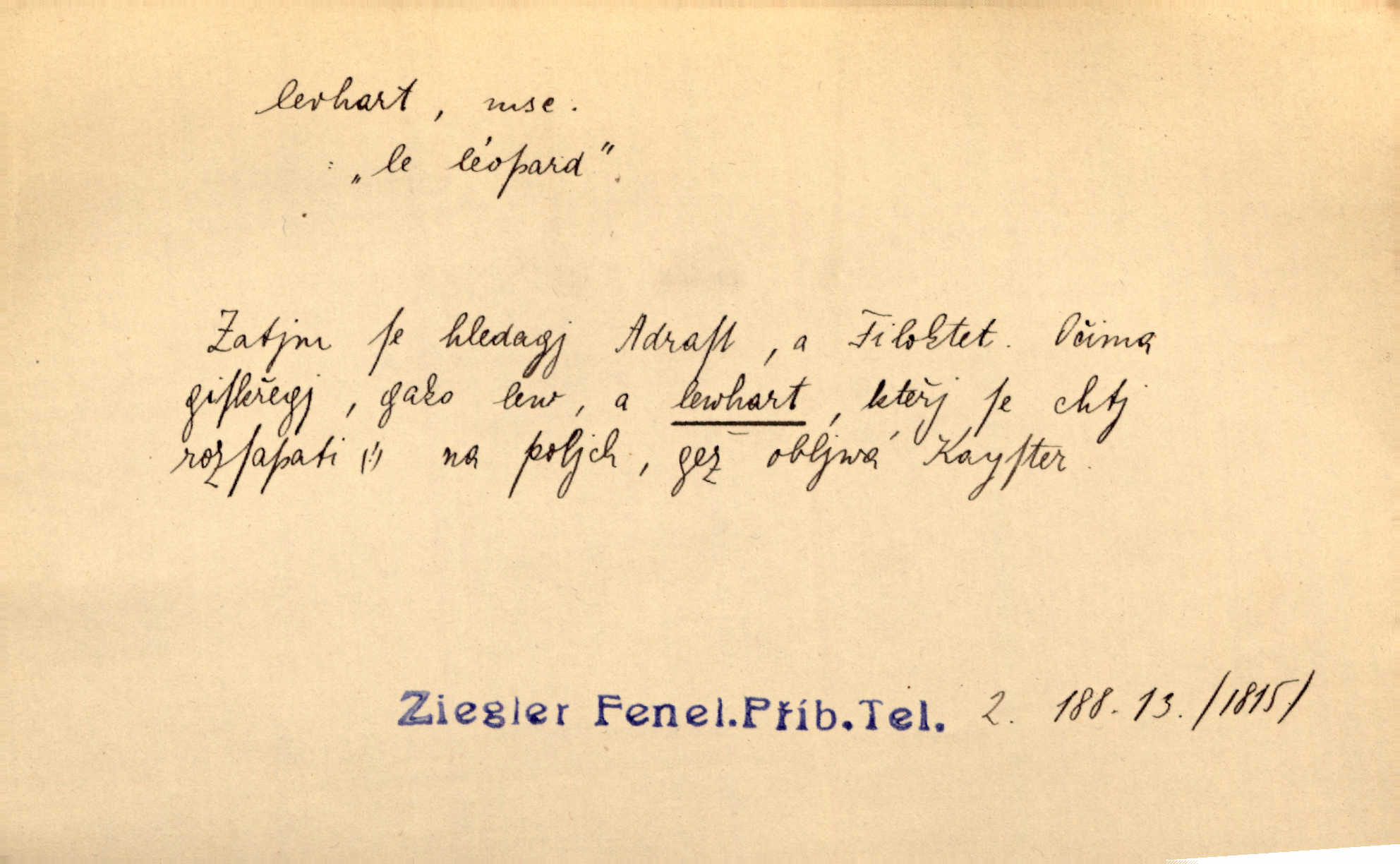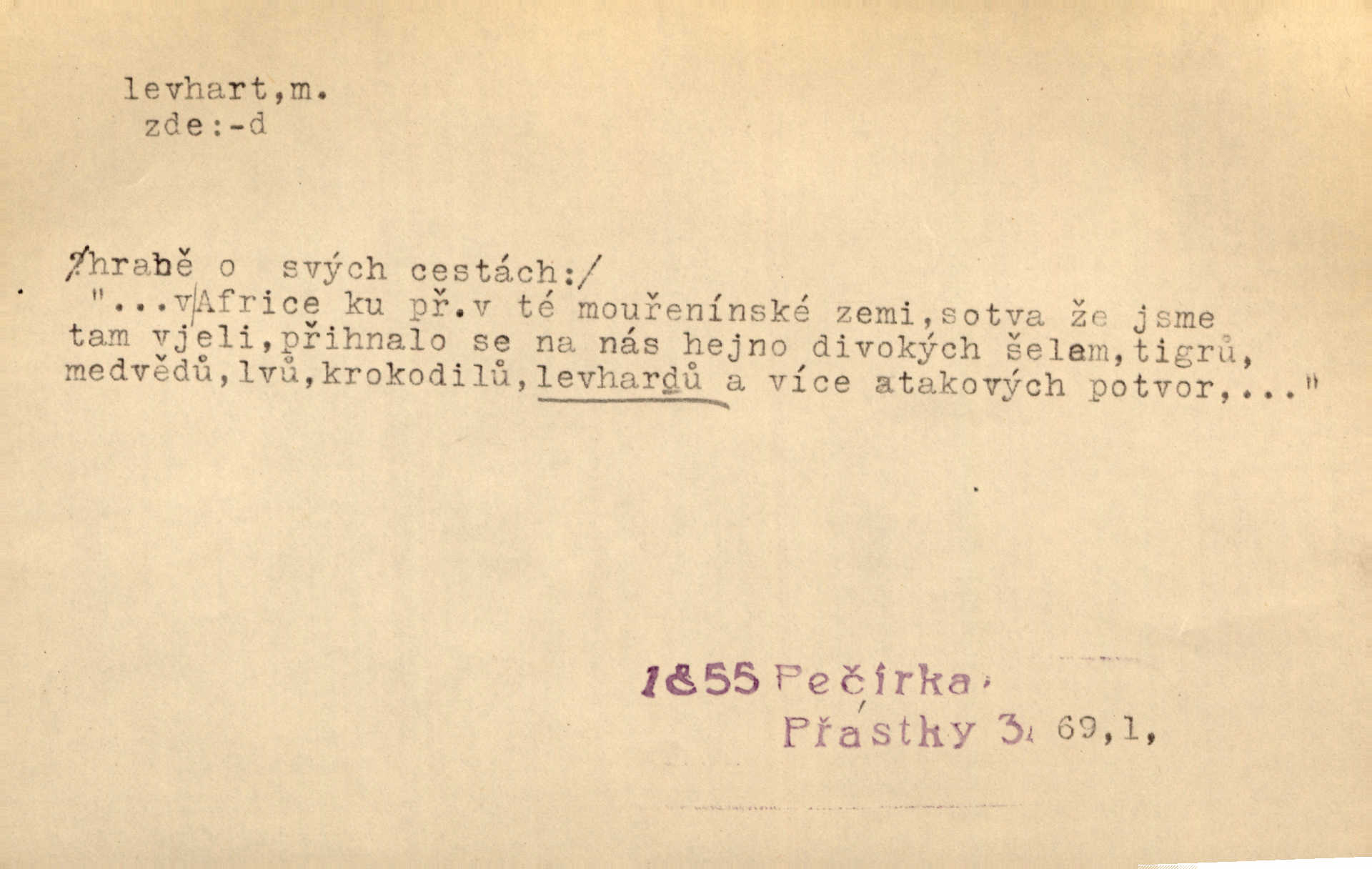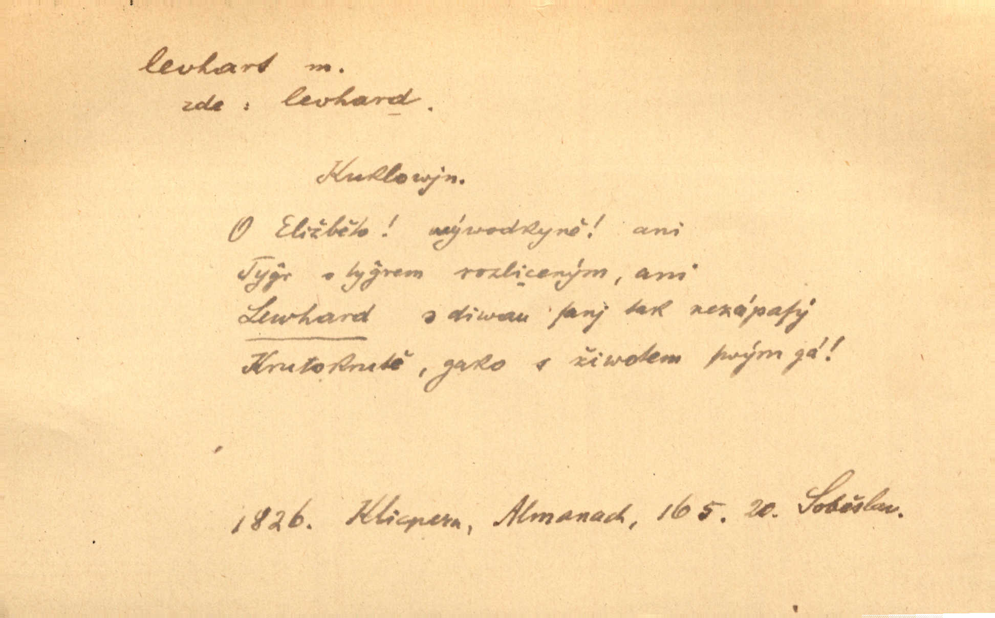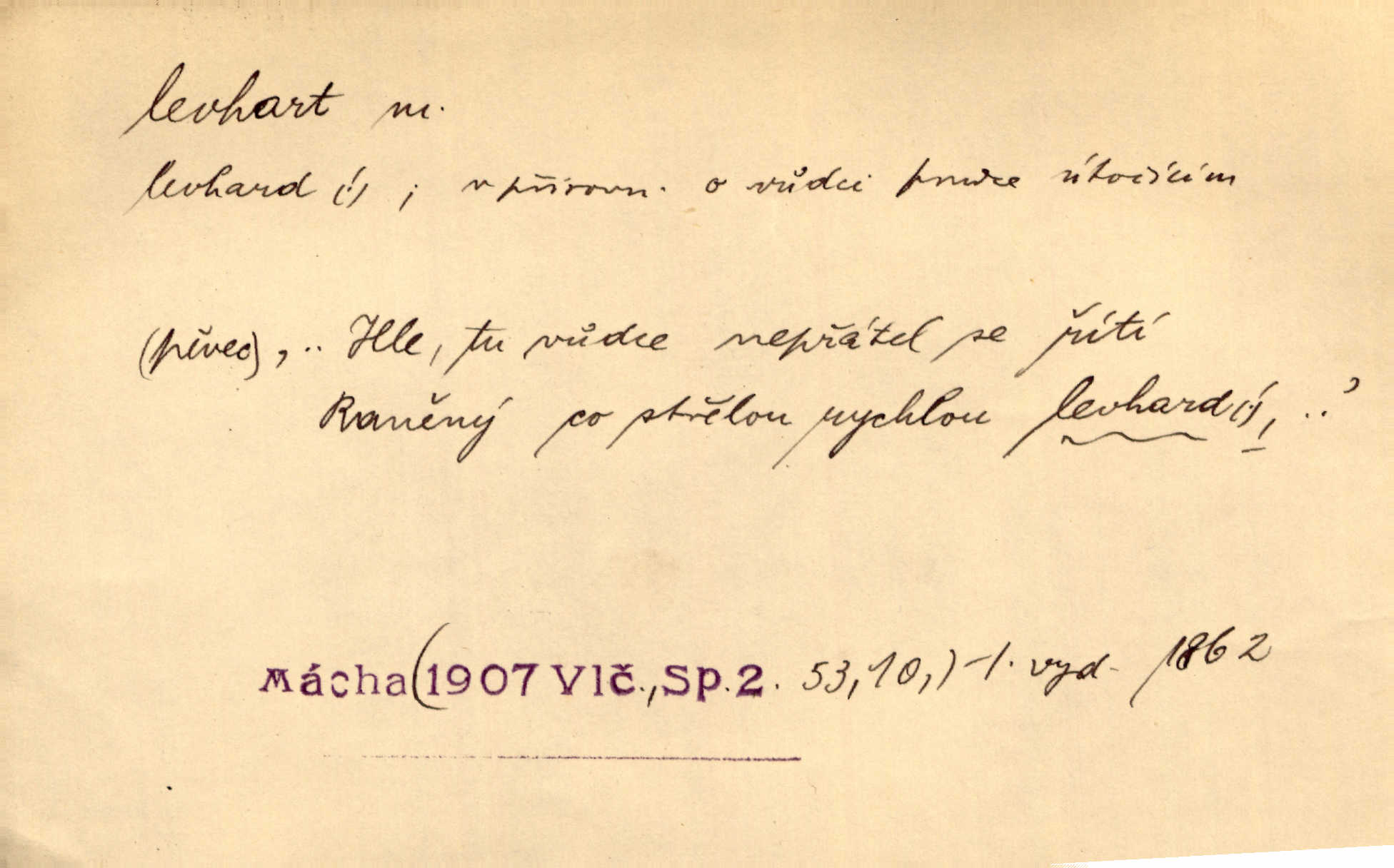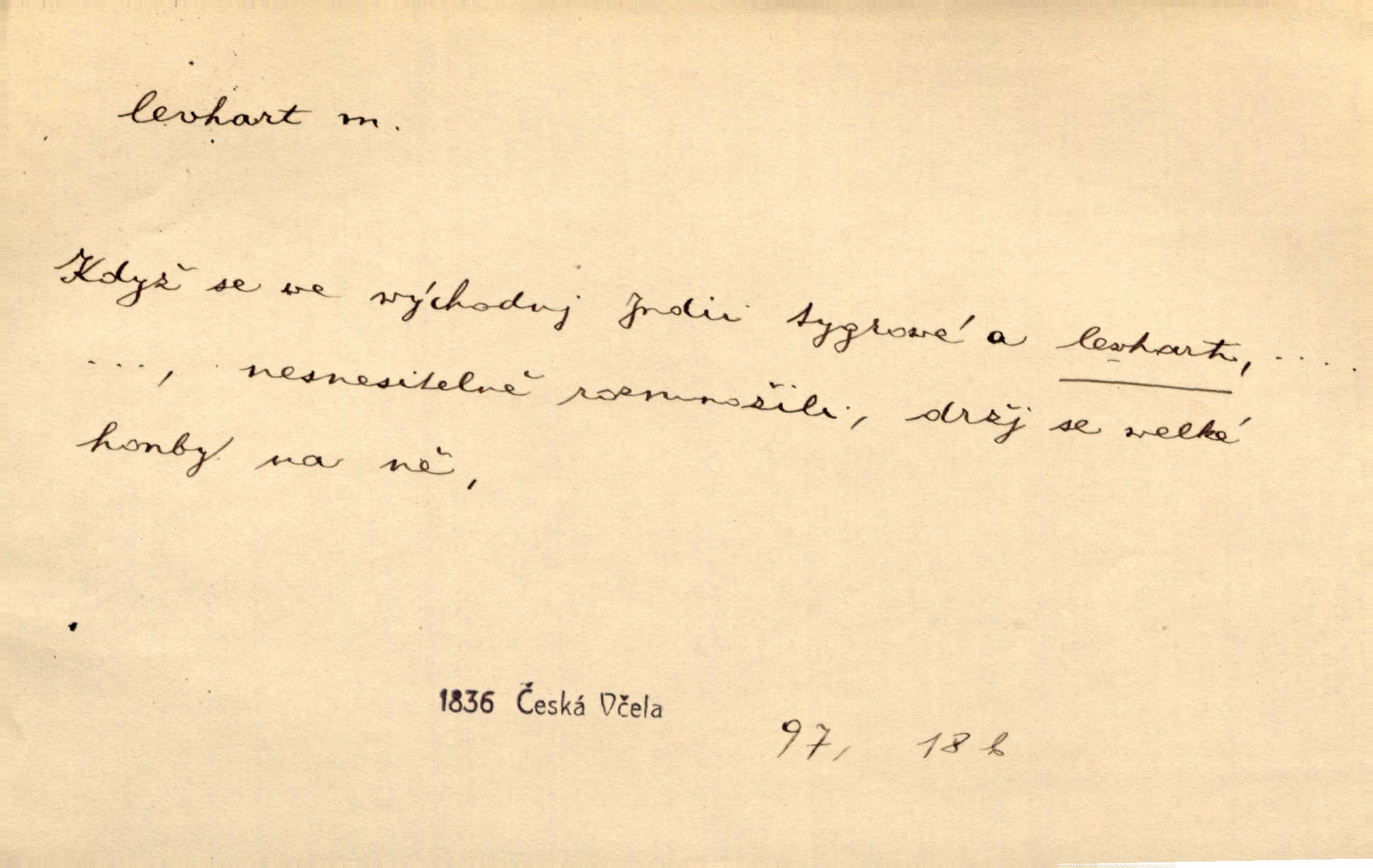 - levhart, -a m. dravá šelma Felis pardus, pardál. Hrabě vyskočil jako levhart proti starému myslivci a chytil ho za prsa. Jir. Kdo mi bude chtít v tom bránit, toho rozdrtím jako levhart hádě. Svět.