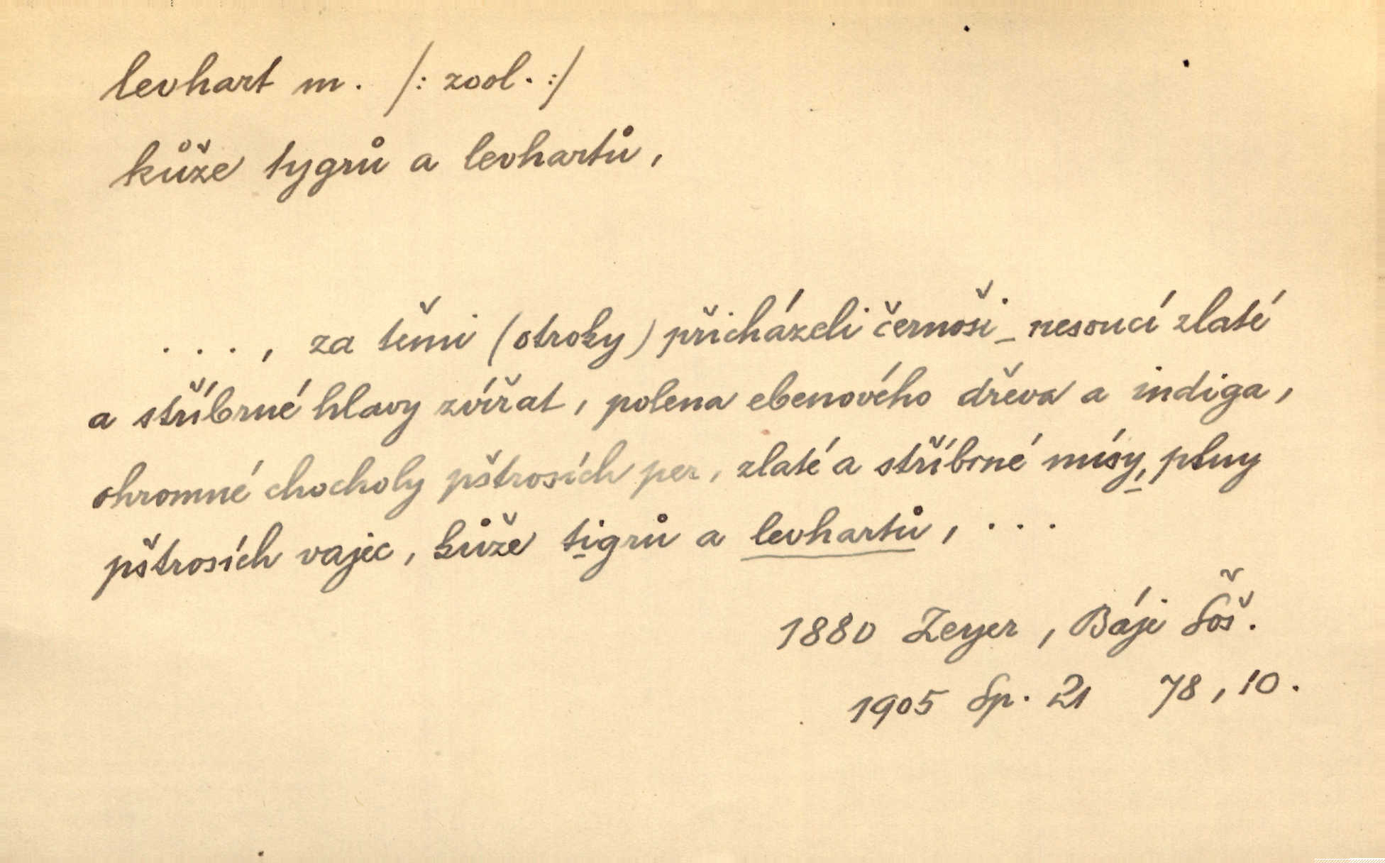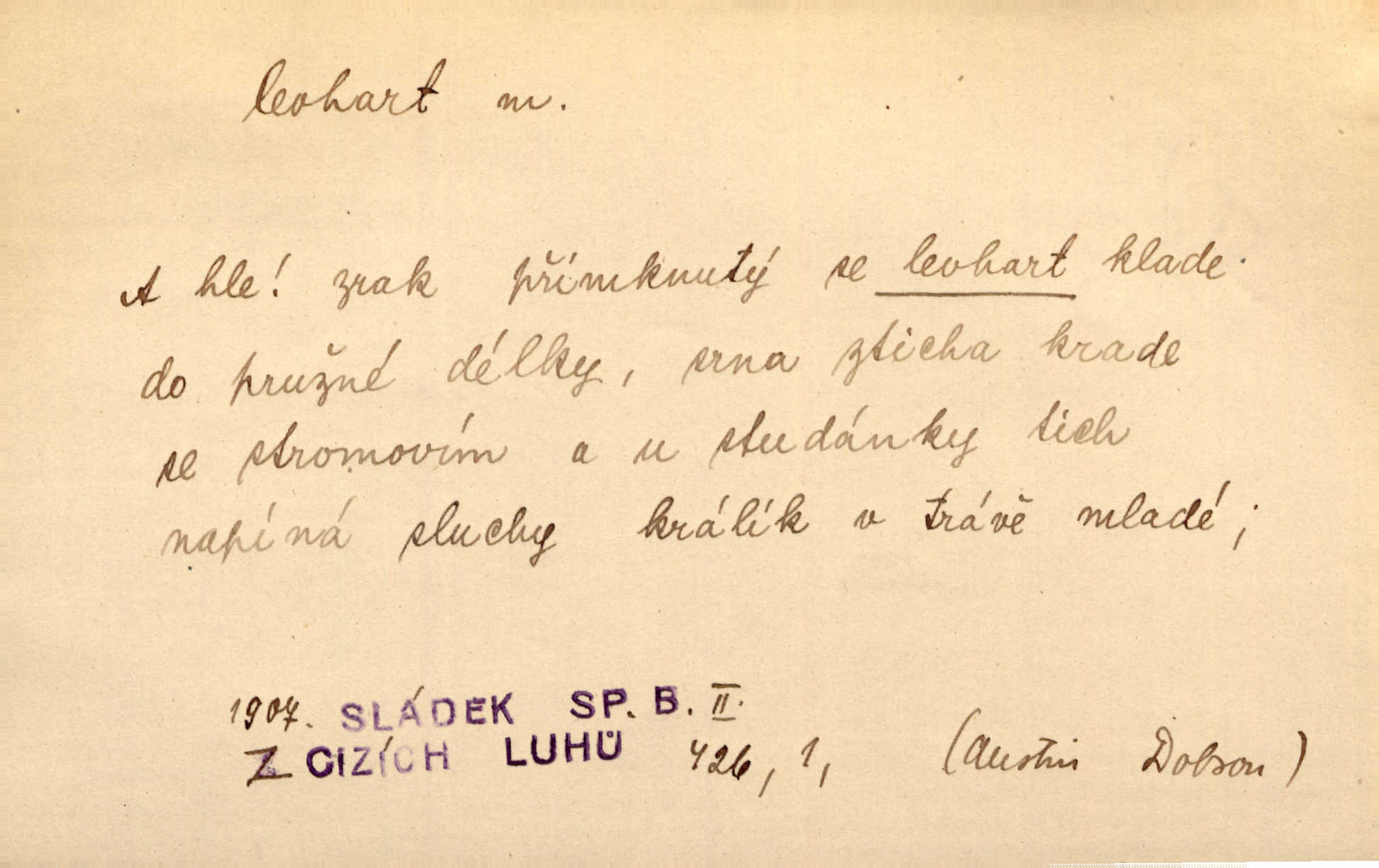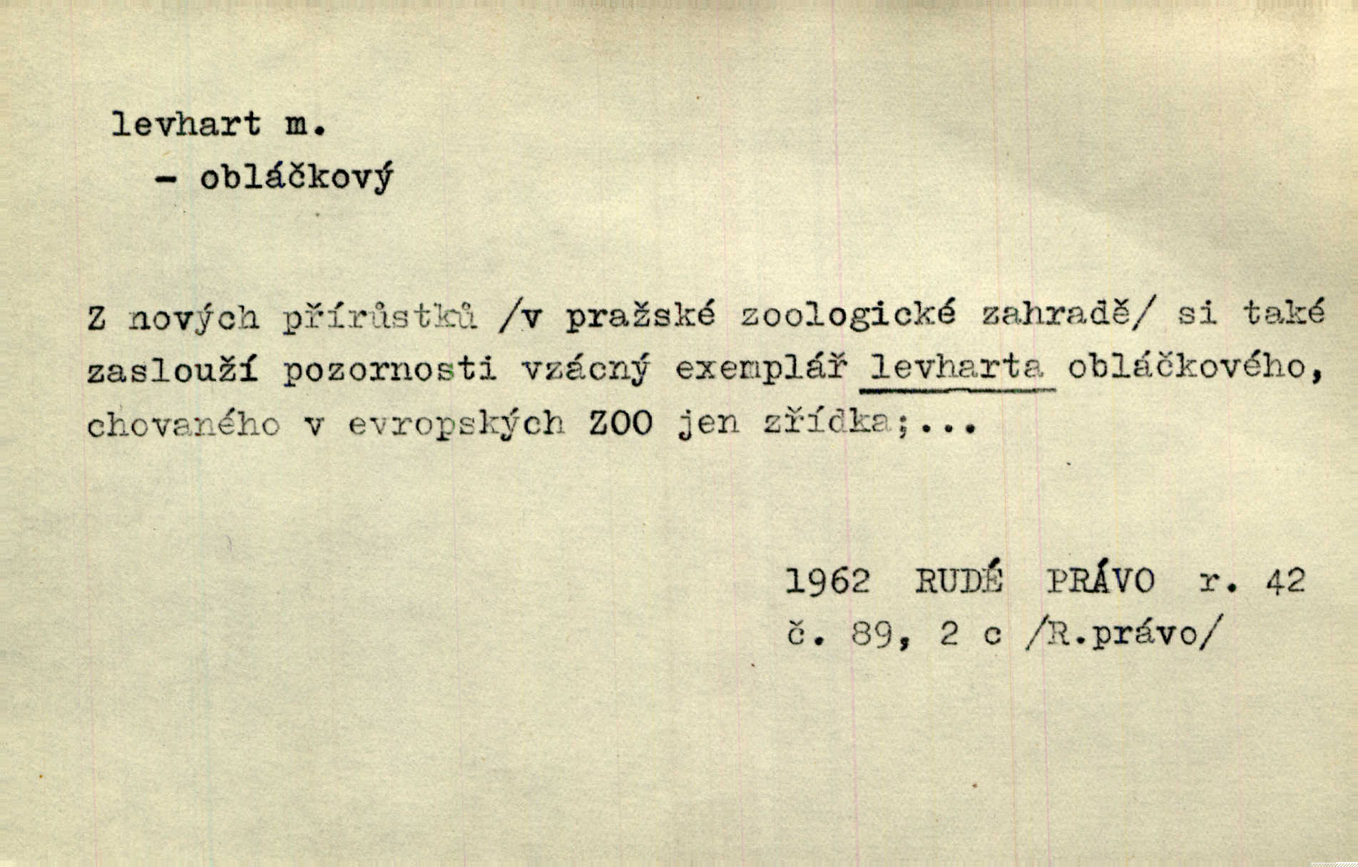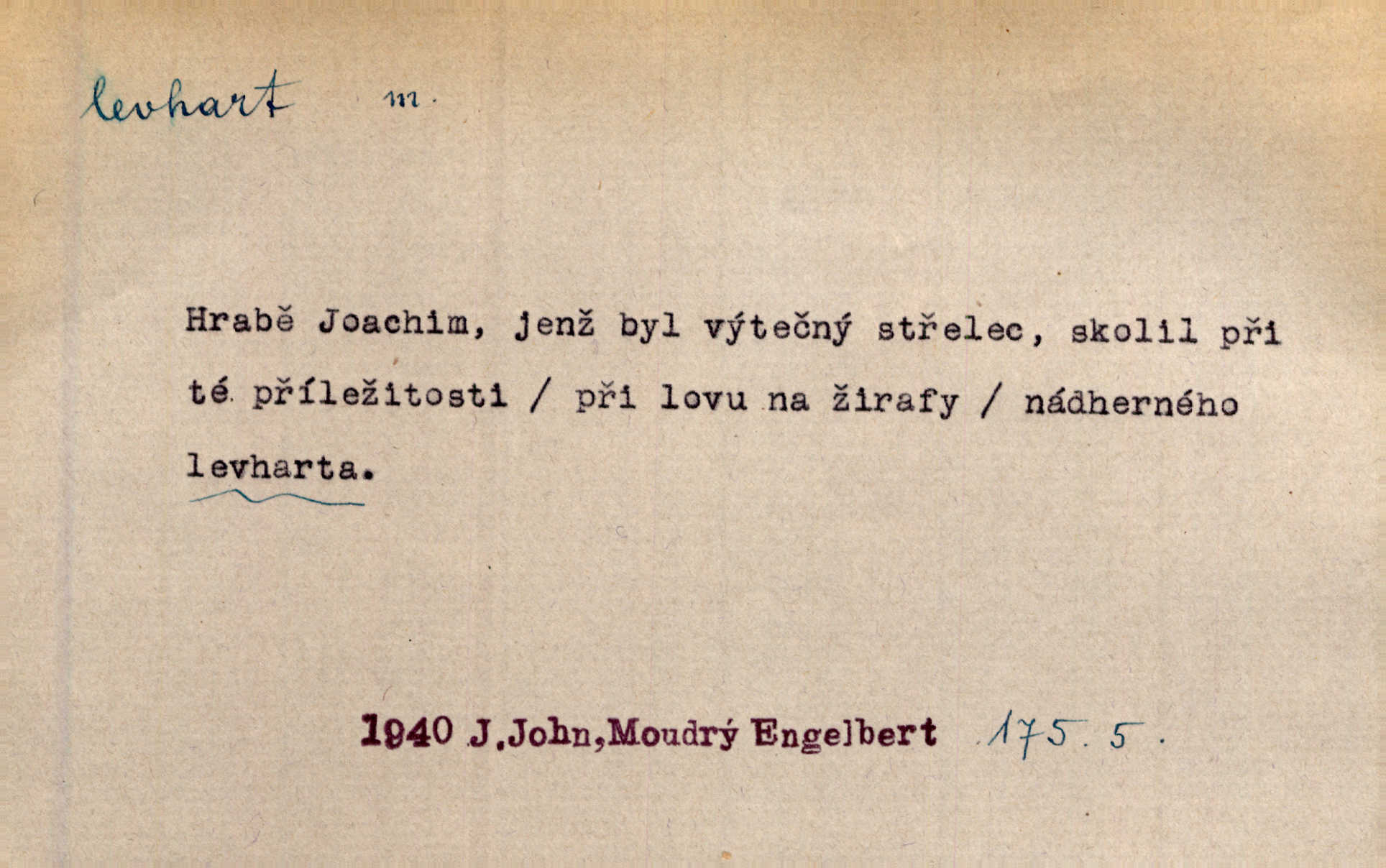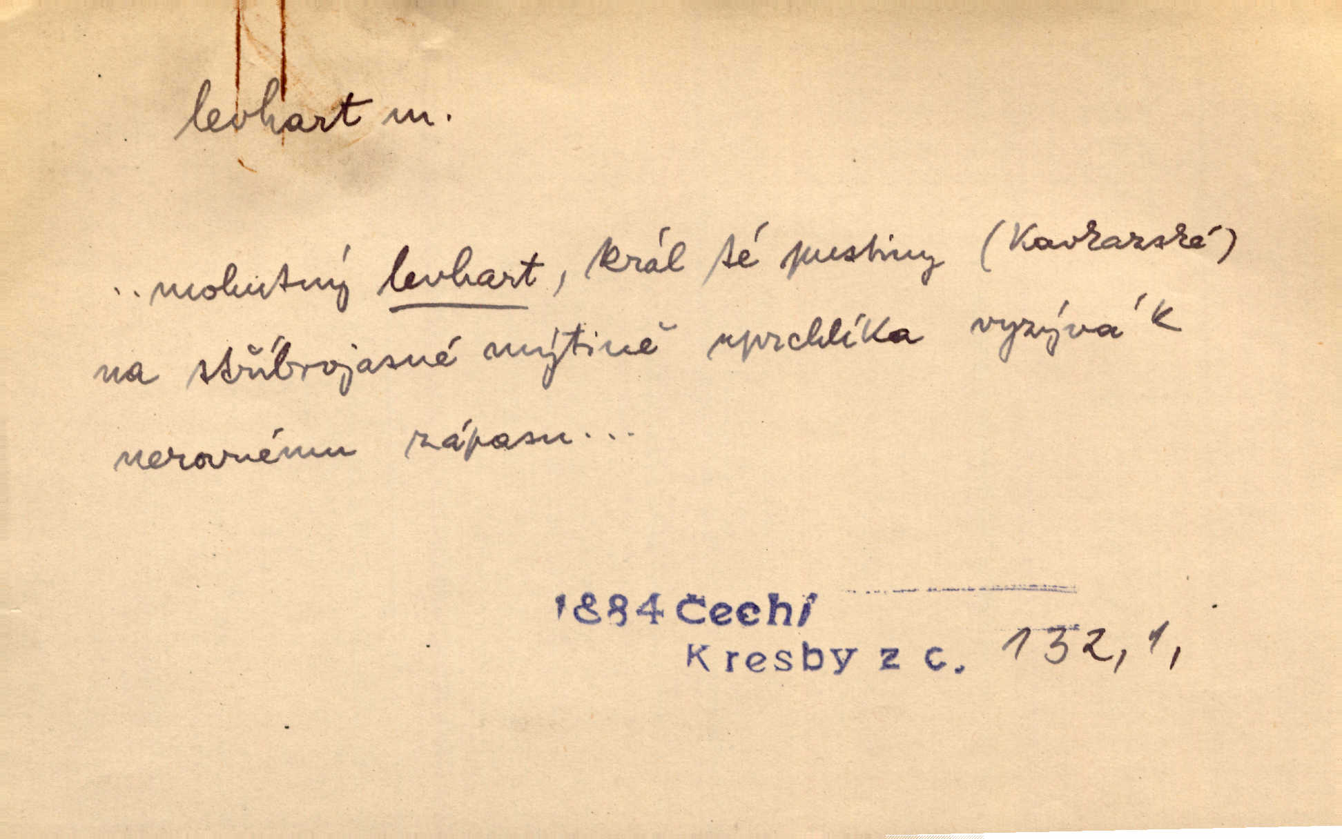 - levhart, -a m. dravá šelma Felis pardus, pardál. Hrabě vyskočil jako levhart proti starému myslivci a chytil ho za prsa. Jir. Kdo mi bude chtít v tom bránit, toho rozdrtím jako levhart hádě. Svět.