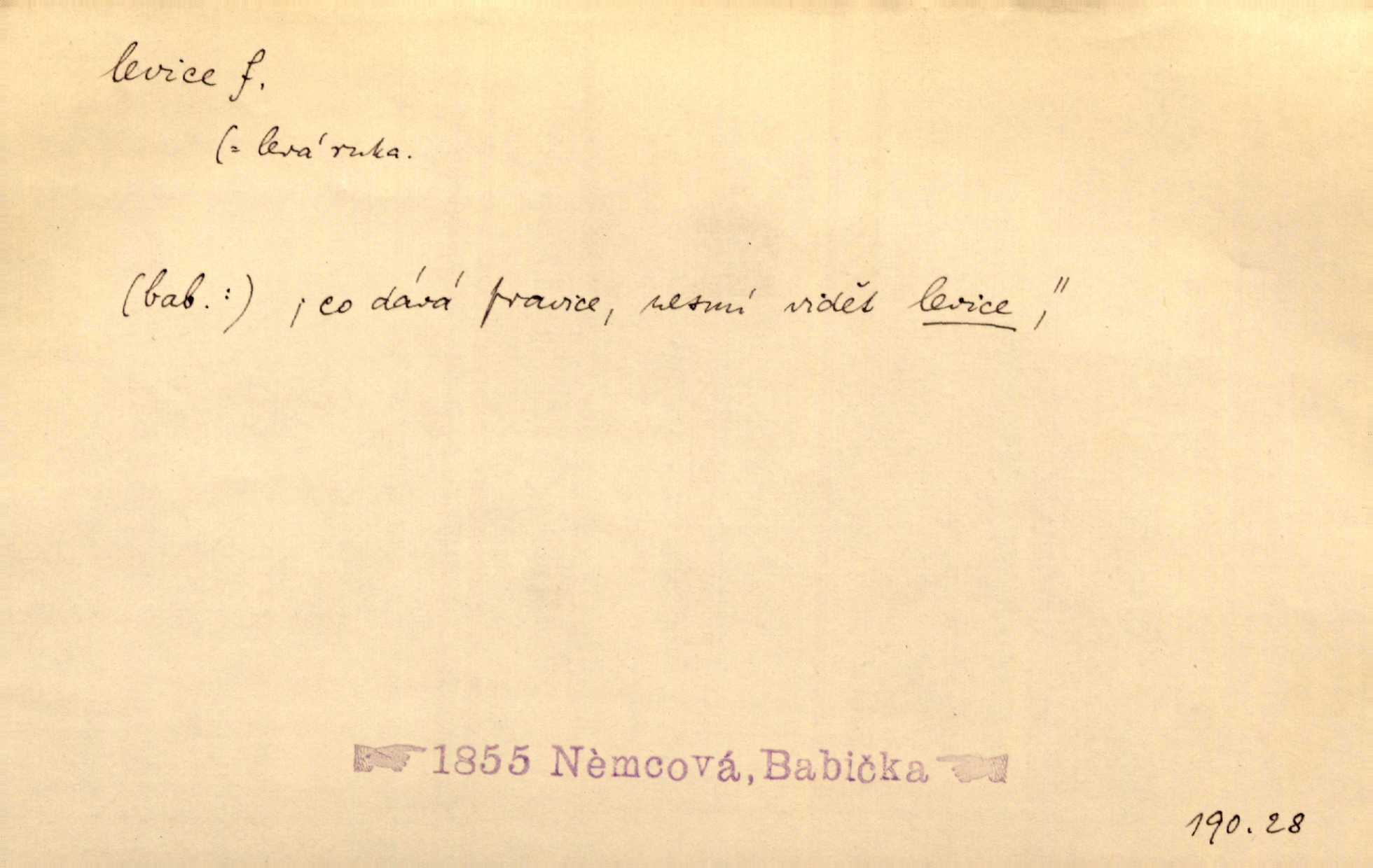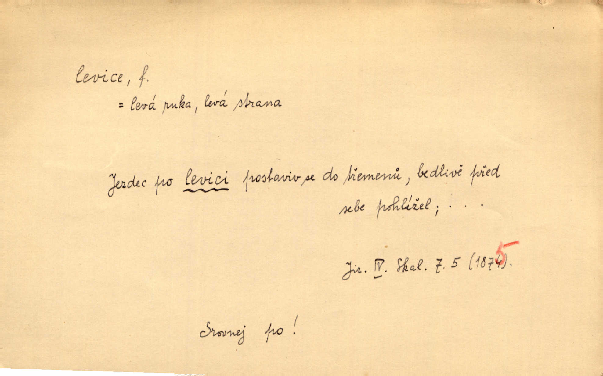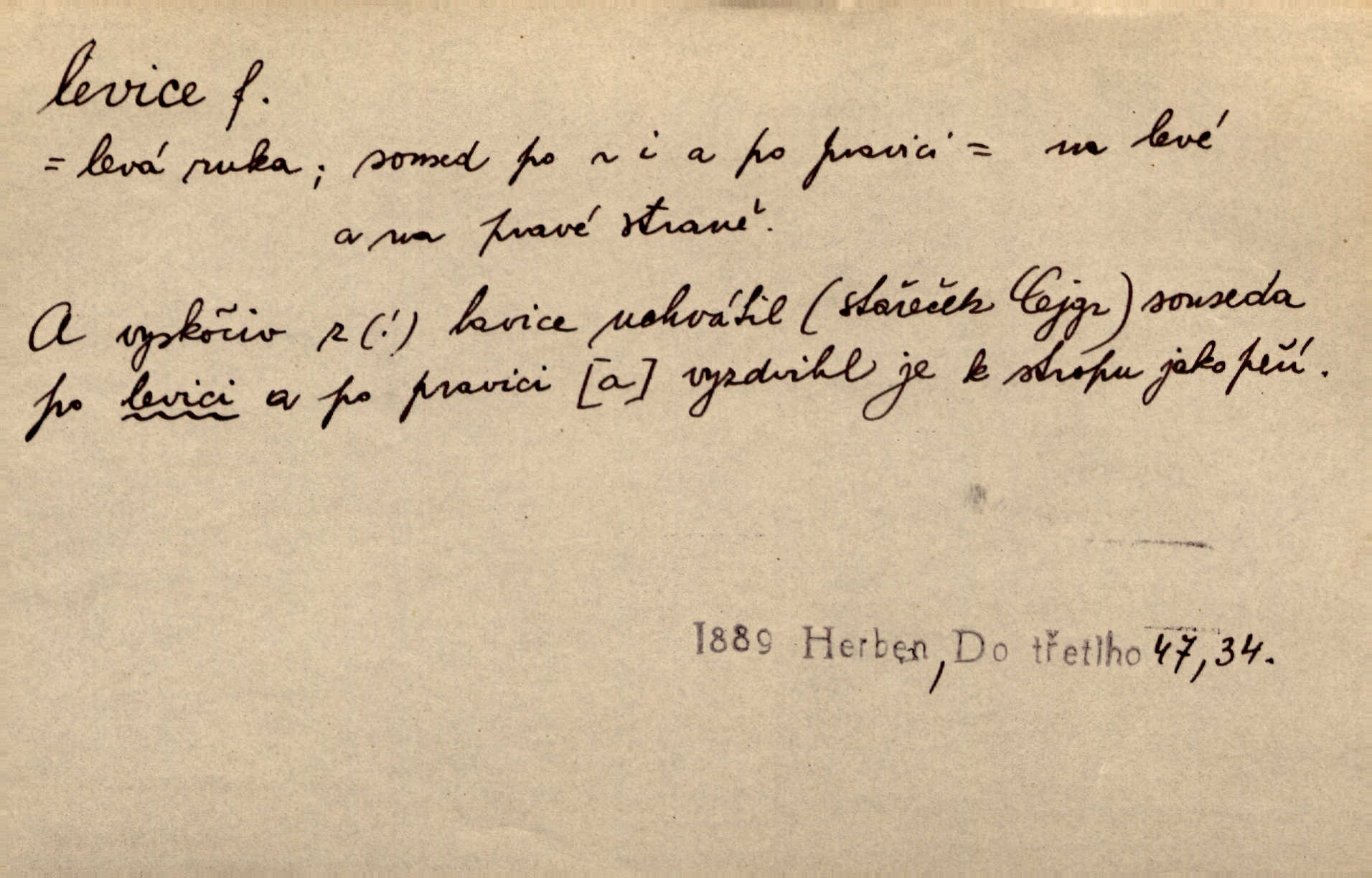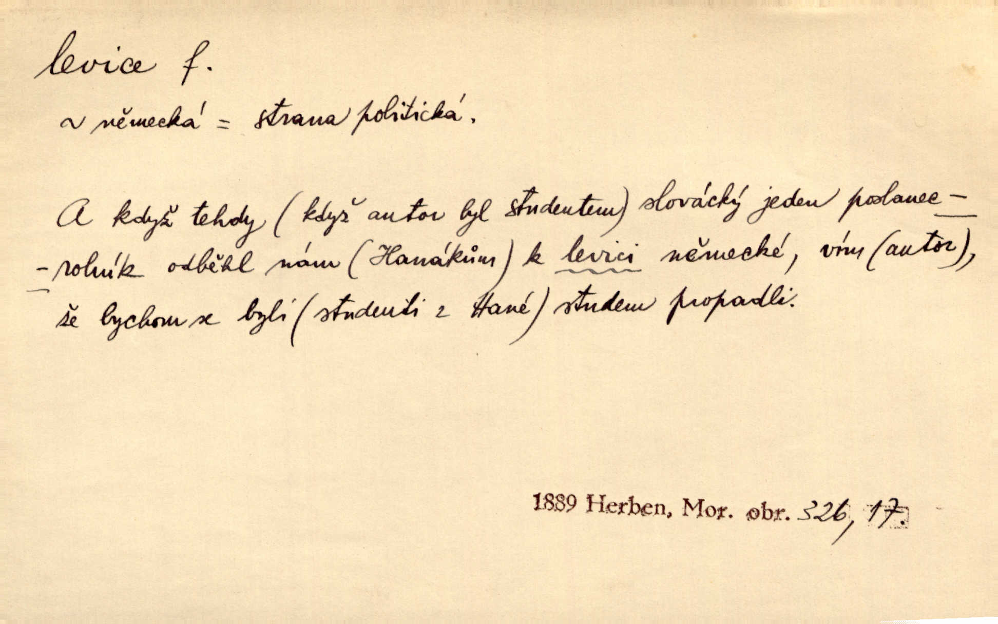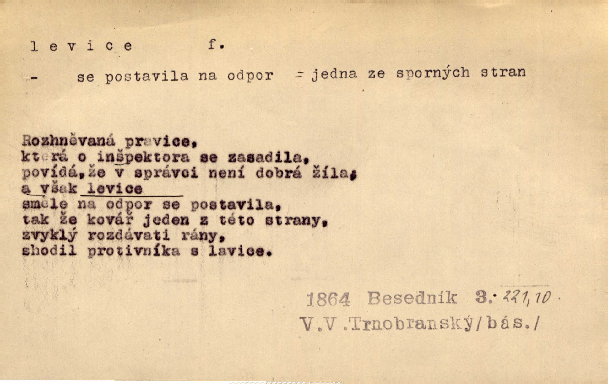 - levice, -e f. levá ruka. Levicí třímal kytičku fialek. Herrm. Má levice je v lokti chroma. Heyd. Na levici, po levici po levé ruce, na levé straně. Po levici staré paní je místo pana profesora. Šim. Po levici vroubila bílou planinu Letná. Čech. Viděl jsem Jezu Krista; papež a biskupové na pravici stáli. A na levici stáli také kněží, páni a lidé rozliční. Jir. D původně politická strana liberální, která ve sněmovně zasedala nalevo od předsednictva; nyní strany socialistické n. jim blízké. Ostatni levice [ve sněmovně vídeňské] velmi jest pomíchaná. Havl. Uzavřeli jste do voleb kompromis s krajní levicí. Mah. Levice ve studentstvu dávno ještě neprohrála. Přít. D pokrokový, radikální n. krajní směr ve vědě, umění a p. Heglova škola má svou oposiční, radikální levici. Durd. Bohumil Kubišta, malíř z levice české moderny umělecké. Šal.