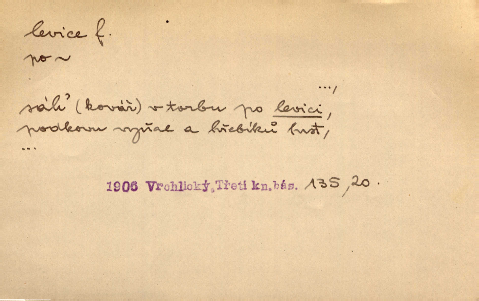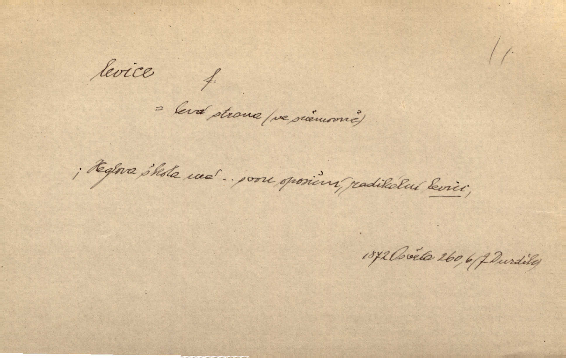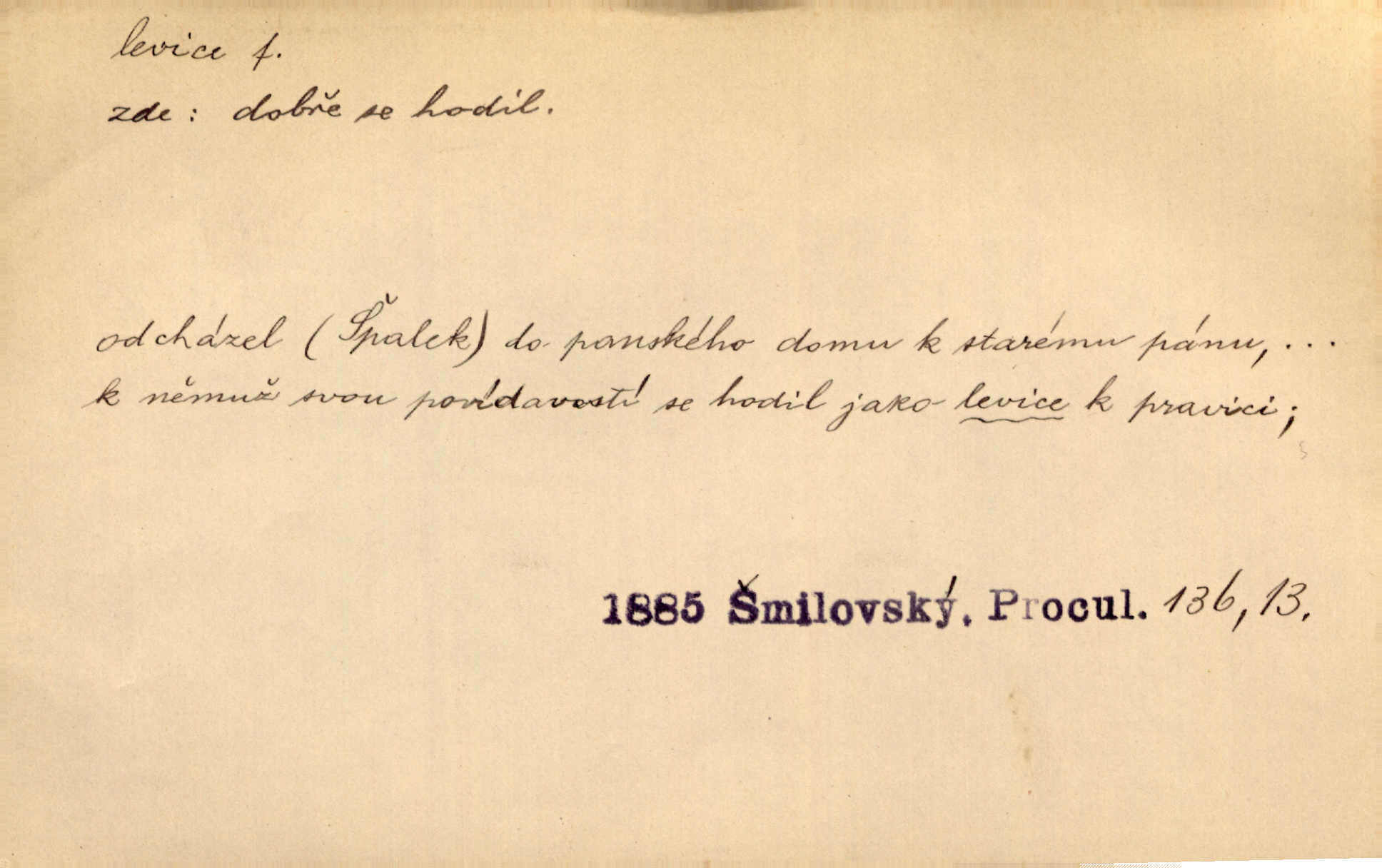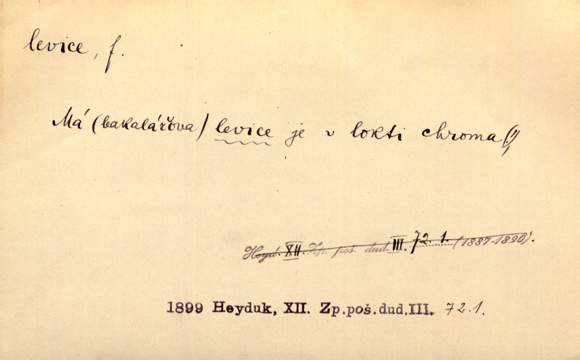 - levice, -e f. levá ruka. Levicí třímal kytičku fialek. Herrm. Má levice je v lokti chroma. Heyd. Na levici, po levici po levé ruce, na levé straně. Po levici staré paní je místo pana profesora. Šim. Po levici vroubila bílou planinu Letná. Čech. Viděl jsem Jezu Krista; papež a biskupové na pravici stáli. A na levici stáli také kněží, páni a lidé rozliční. Jir. D původně politická strana liberální, která ve sněmovně zasedala nalevo od předsednictva; nyní strany socialistické n. jim blízké. Ostatni levice [ve sněmovně vídeňské] velmi jest pomíchaná. Havl. Uzavřeli jste do voleb kompromis s krajní levicí. Mah. Levice ve studentstvu dávno ještě neprohrála. Přít. D pokrokový, radikální n. krajní směr ve vědě, umění a p. Heglova škola má svou oposiční, radikální levici. Durd. Bohumil Kubišta, malíř z levice české moderny umělecké. Šal.