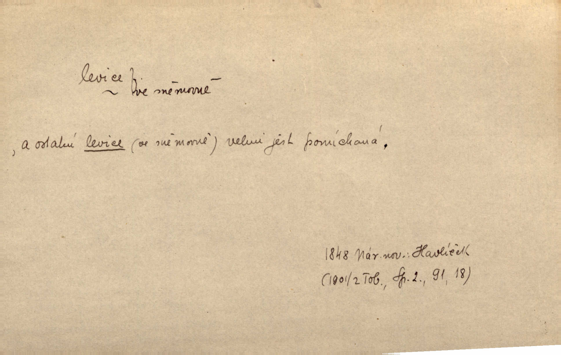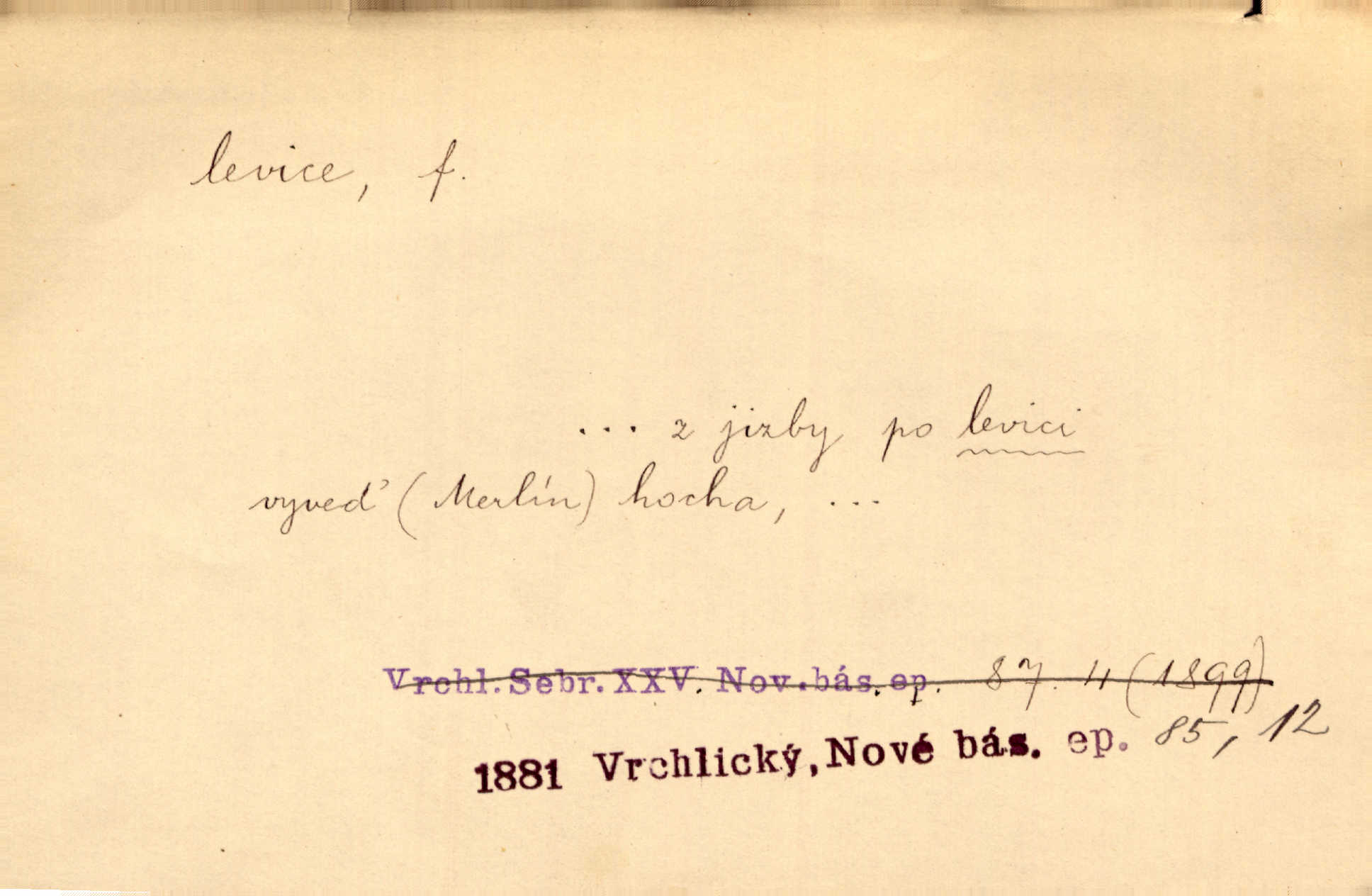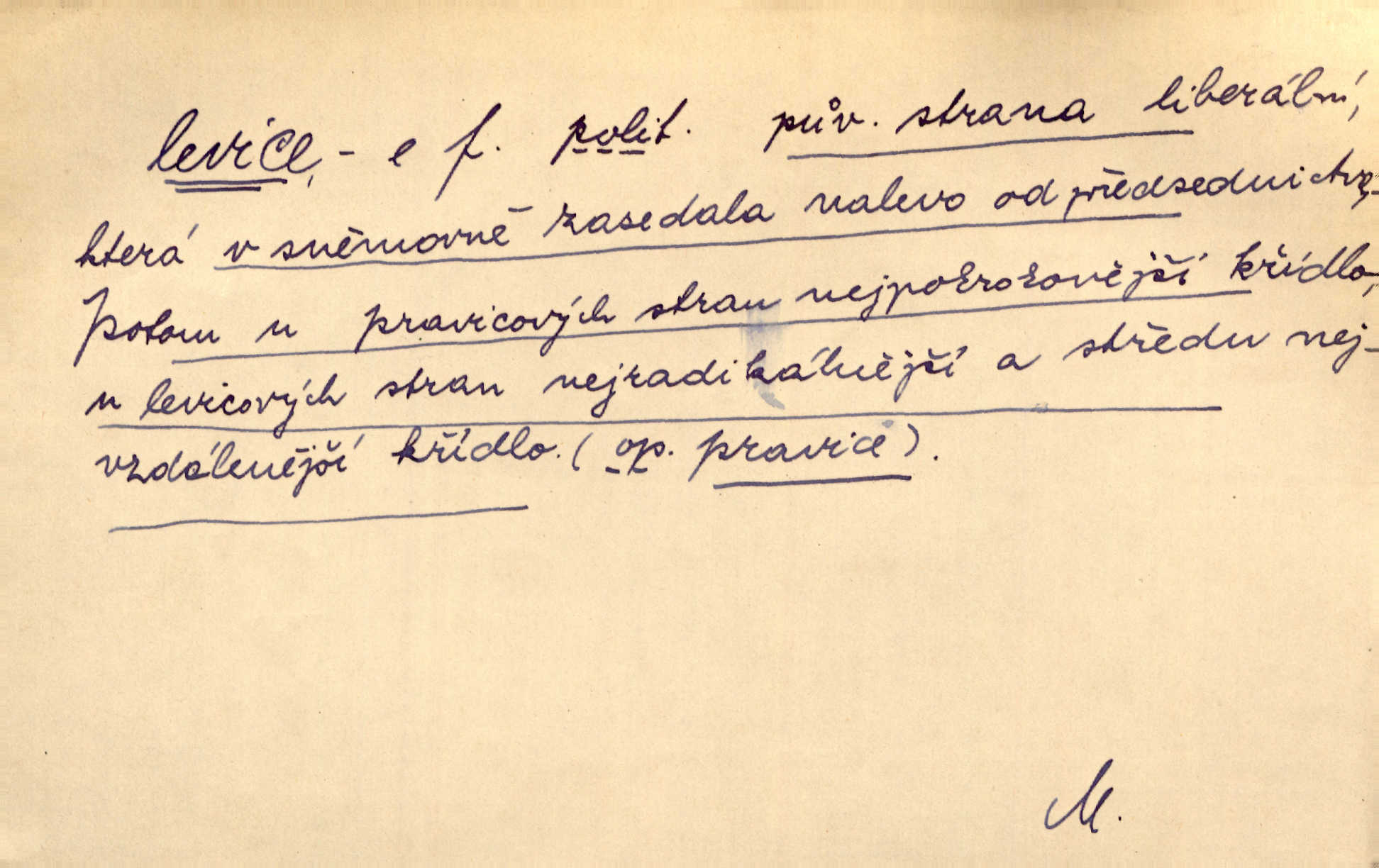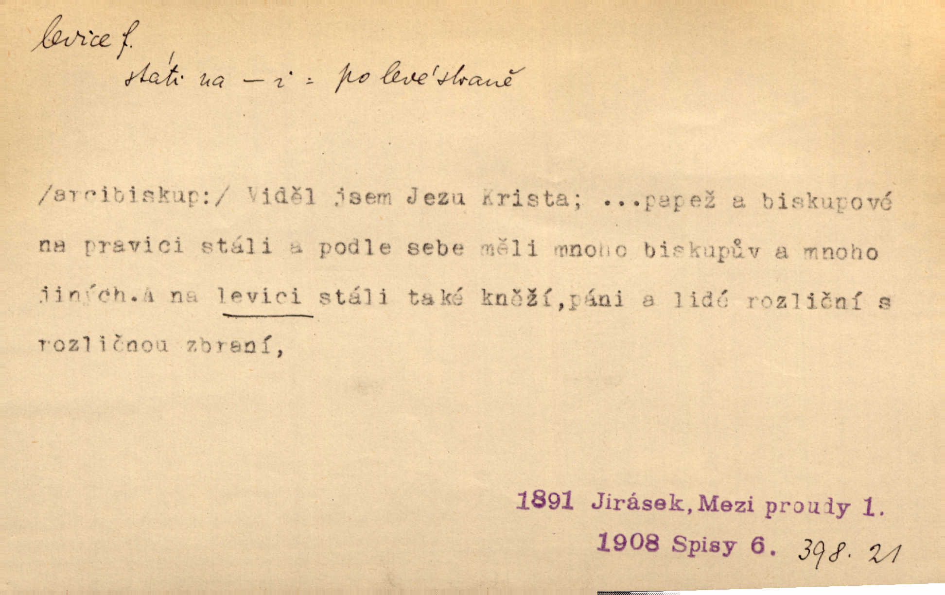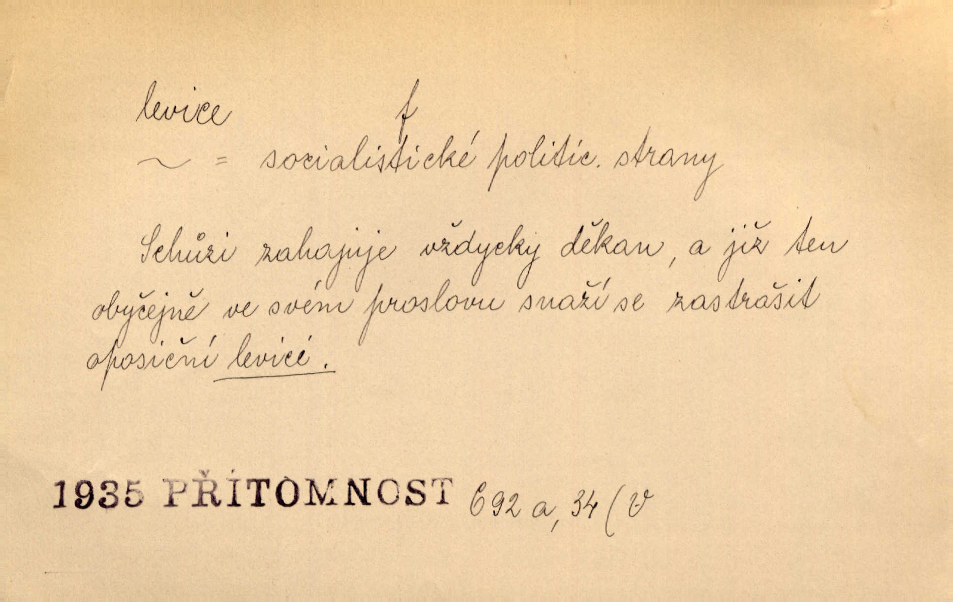 - levice, -e f. levá ruka. Levicí třímal kytičku fialek. Herrm. Má levice je v lokti chroma. Heyd. Na levici, po levici po levé ruce, na levé straně. Po levici staré paní je místo pana profesora. Šim. Po levici vroubila bílou planinu Letná. Čech. Viděl jsem Jezu Krista; papež a biskupové na pravici stáli. A na levici stáli také kněží, páni a lidé rozliční. Jir. D původně politická strana liberální, která ve sněmovně zasedala nalevo od předsednictva; nyní strany socialistické n. jim blízké. Ostatni levice [ve sněmovně vídeňské] velmi jest pomíchaná. Havl. Uzavřeli jste do voleb kompromis s krajní levicí. Mah. Levice ve studentstvu dávno ještě neprohrála. Přít. D pokrokový, radikální n. krajní směr ve vědě, umění a p. Heglova škola má svou oposiční, radikální levici. Durd. Bohumil Kubišta, malíř z levice české moderny umělecké. Šal.