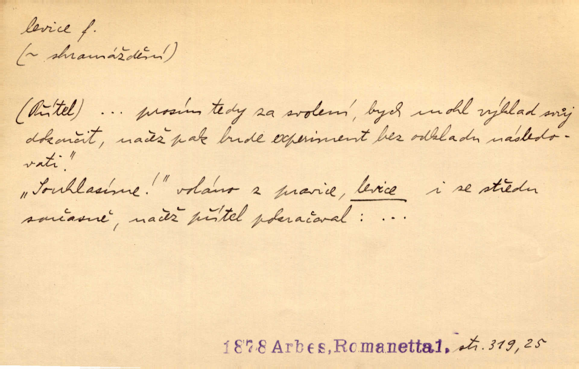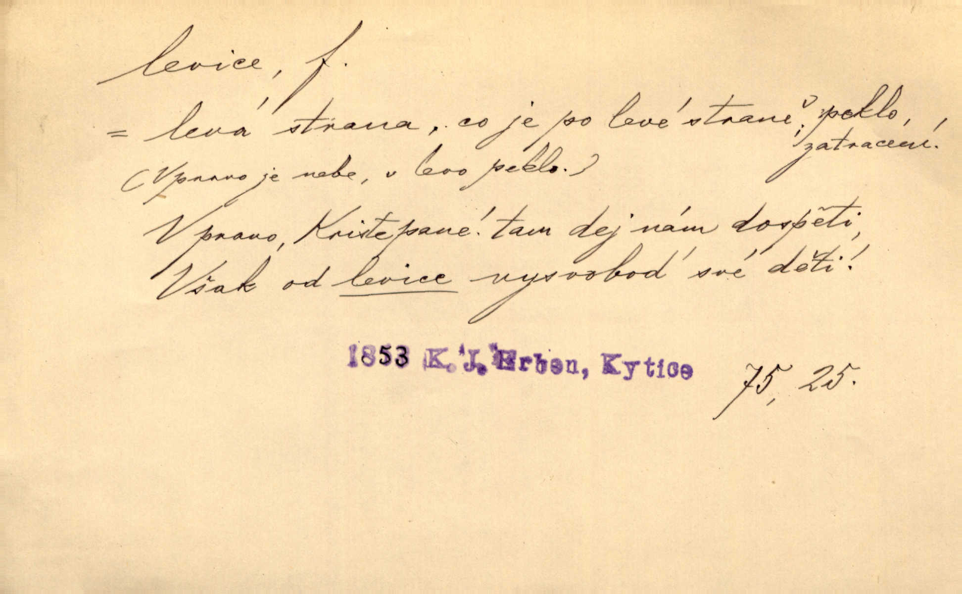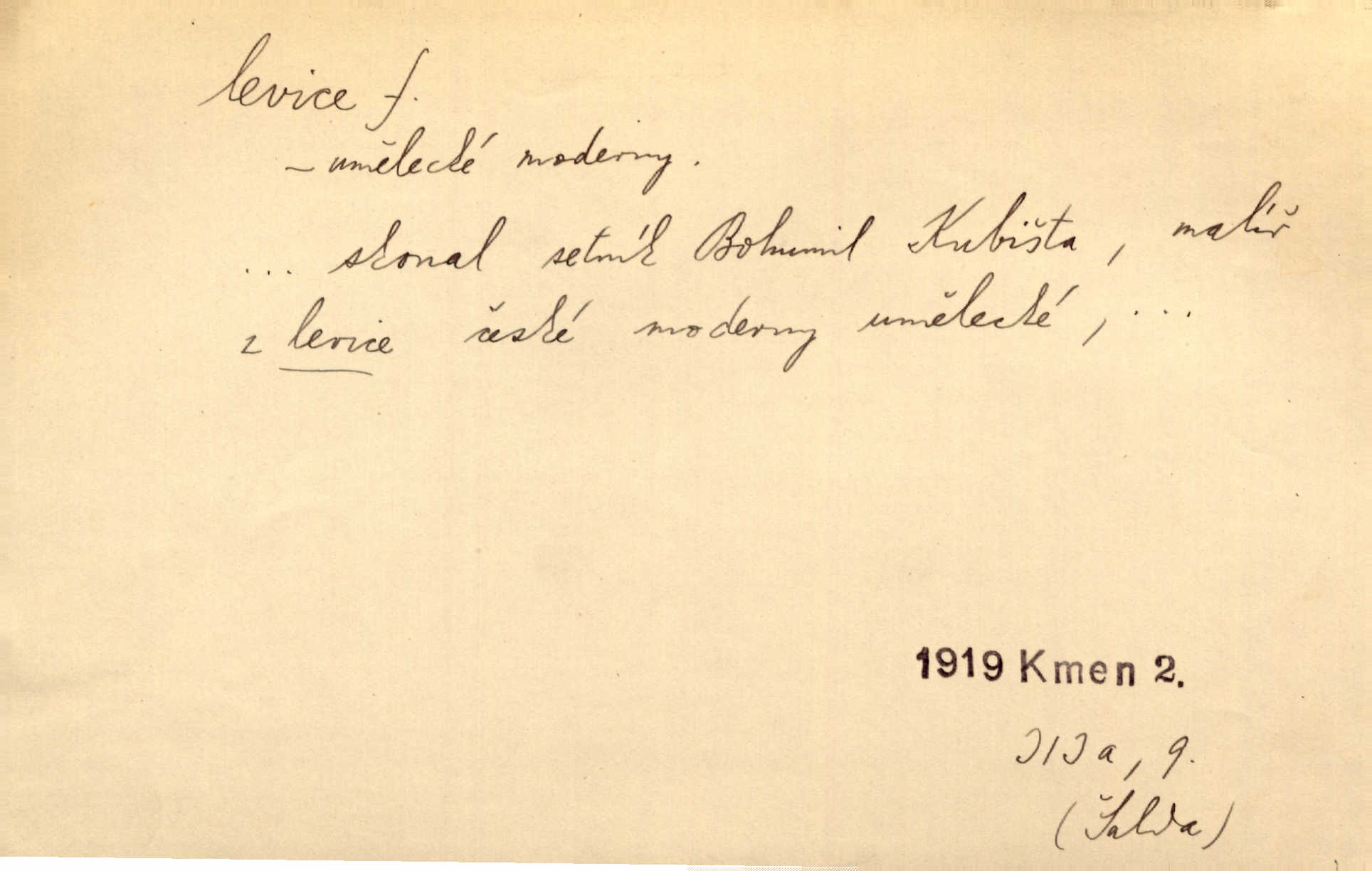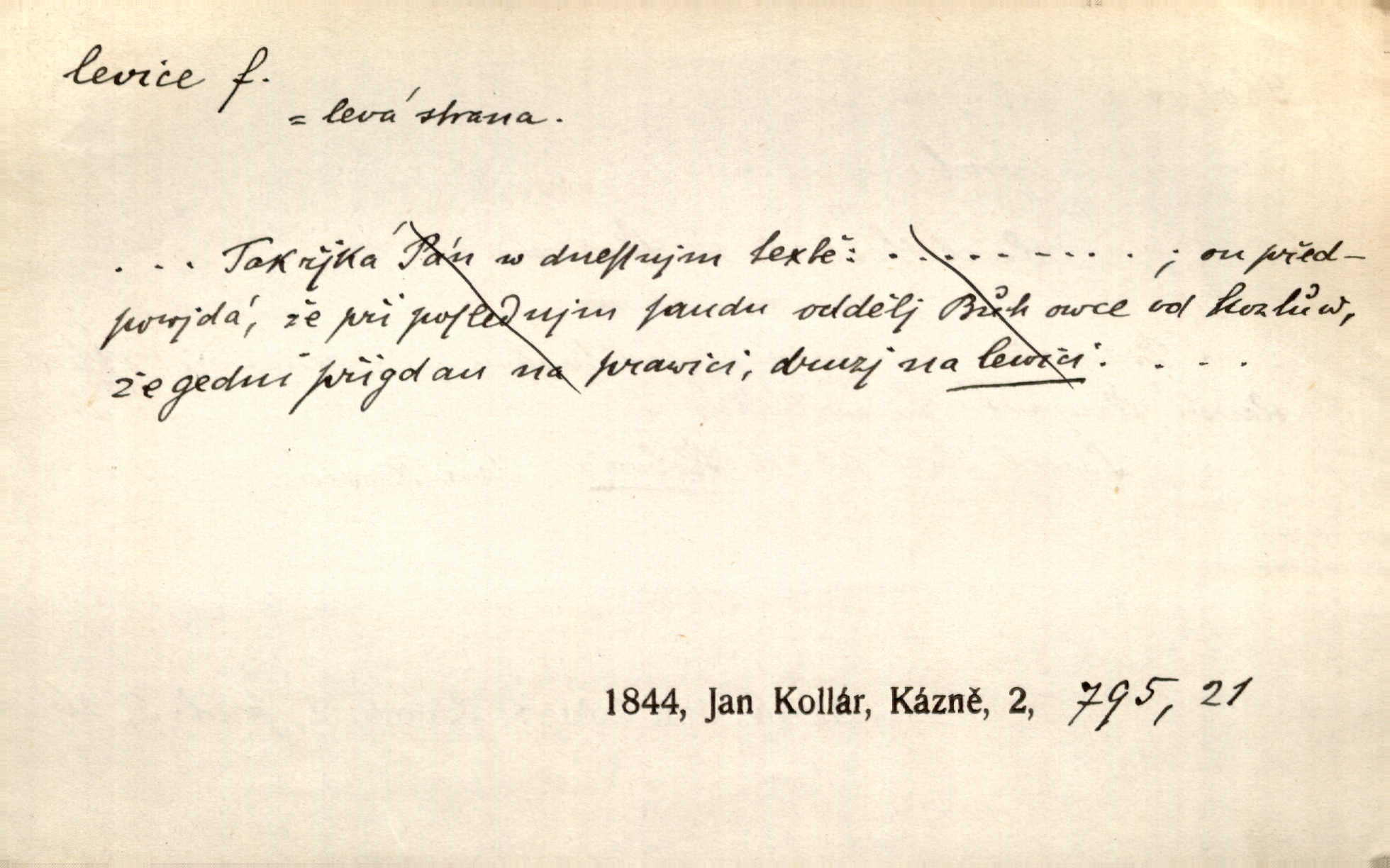 - levice, -e f. levá ruka. Levicí třímal kytičku fialek. Herrm. Má levice je v lokti chroma. Heyd. Na levici, po levici po levé ruce, na levé straně. Po levici staré paní je místo pana profesora. Šim. Po levici vroubila bílou planinu Letná. Čech. Viděl jsem Jezu Krista; papež a biskupové na pravici stáli. A na levici stáli také kněží, páni a lidé rozliční. Jir. D původně politická strana liberální, která ve sněmovně zasedala nalevo od předsednictva; nyní strany socialistické n. jim blízké. Ostatni levice [ve sněmovně vídeňské] velmi jest pomíchaná. Havl. Uzavřeli jste do voleb kompromis s krajní levicí. Mah. Levice ve studentstvu dávno ještě neprohrála. Přít. D pokrokový, radikální n. krajní směr ve vědě, umění a p. Heglova škola má svou oposiční, radikální levici. Durd. Bohumil Kubišta, malíř z levice české moderny umělecké. Šal.
