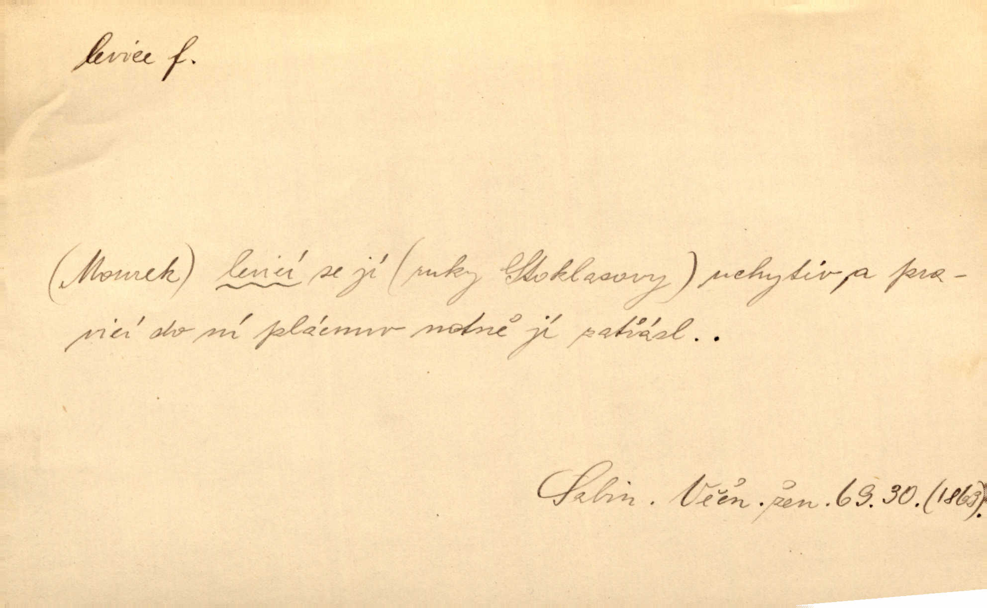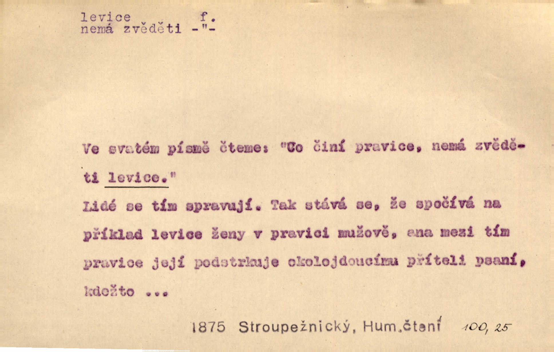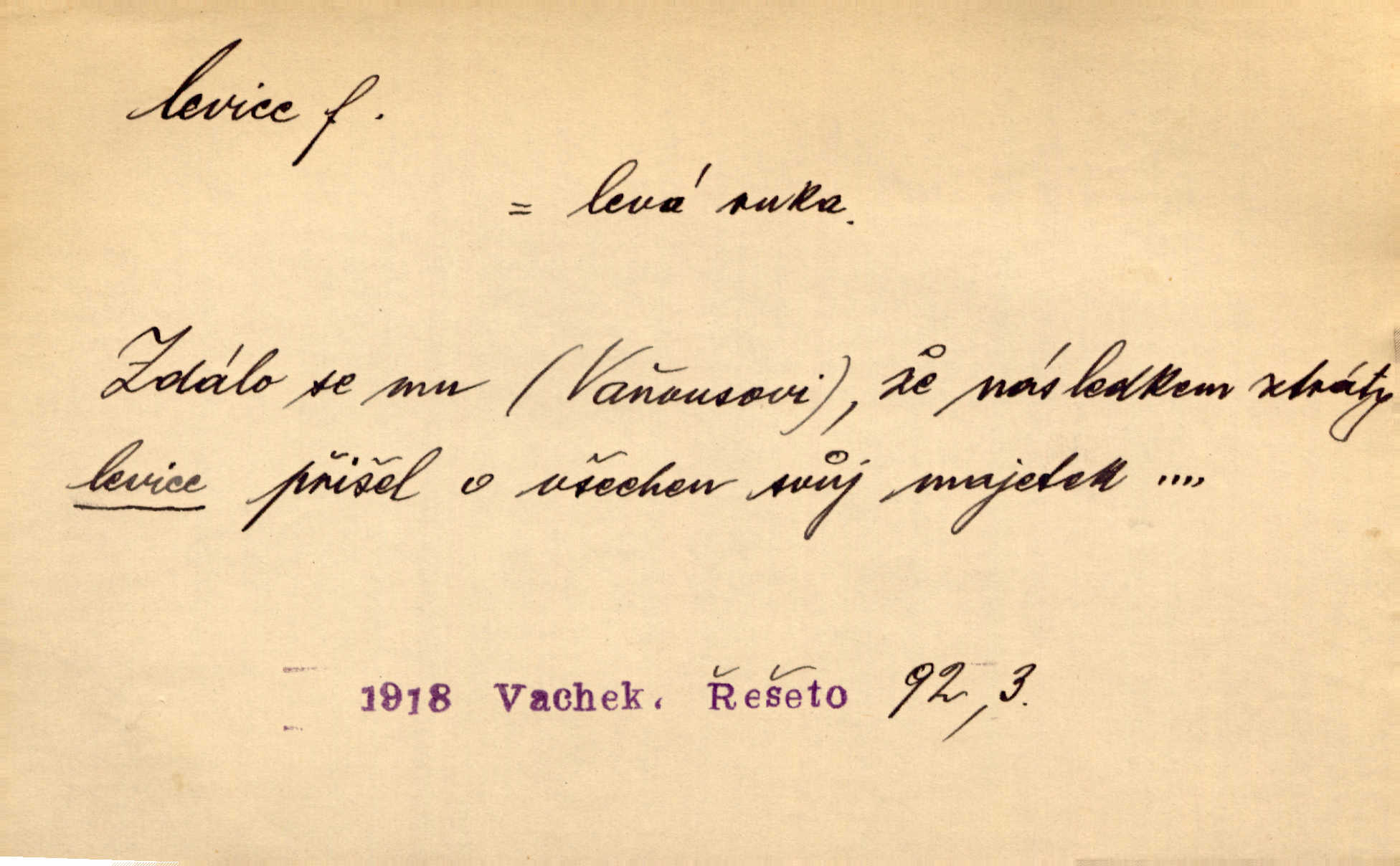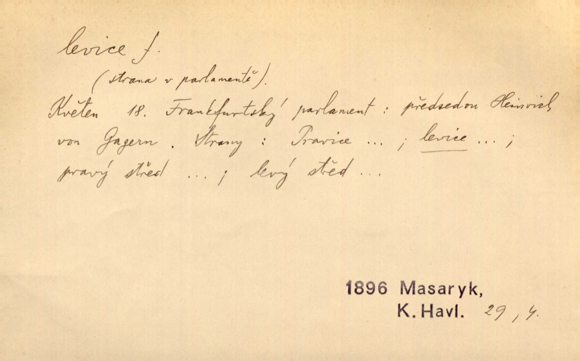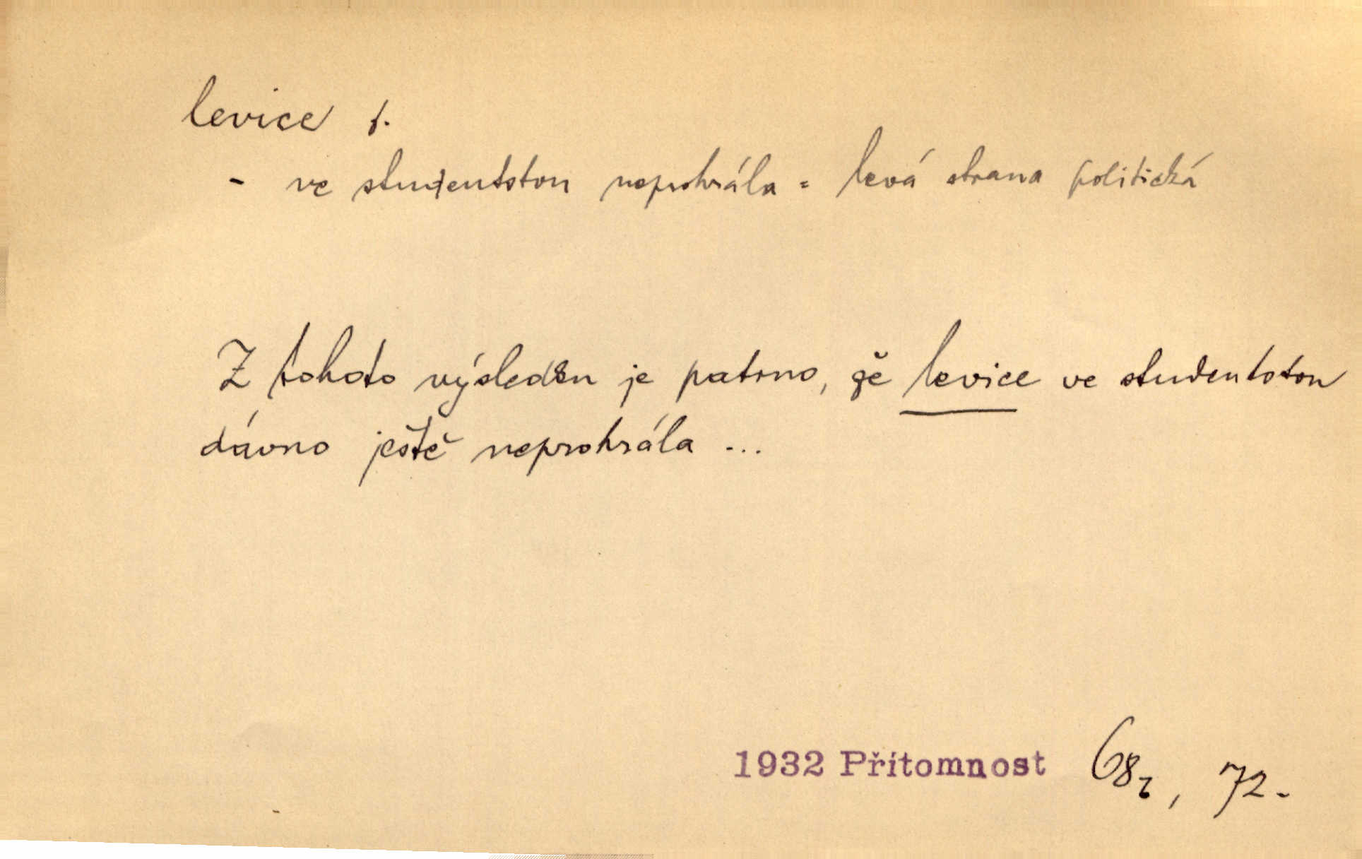 - levice, -e f. levá ruka. Levicí třímal kytičku fialek. Herrm. Má levice je v lokti chroma. Heyd. Na levici, po levici po levé ruce, na levé straně. Po levici staré paní je místo pana profesora. Šim. Po levici vroubila bílou planinu Letná. Čech. Viděl jsem Jezu Krista; papež a biskupové na pravici stáli. A na levici stáli také kněží, páni a lidé rozliční. Jir. D původně politická strana liberální, která ve sněmovně zasedala nalevo od předsednictva; nyní strany socialistické n. jim blízké. Ostatni levice [ve sněmovně vídeňské] velmi jest pomíchaná. Havl. Uzavřeli jste do voleb kompromis s krajní levicí. Mah. Levice ve studentstvu dávno ještě neprohrála. Přít. D pokrokový, radikální n. krajní směr ve vědě, umění a p. Heglova škola má svou oposiční, radikální levici. Durd. Bohumil Kubišta, malíř z levice české moderny umělecké. Šal.