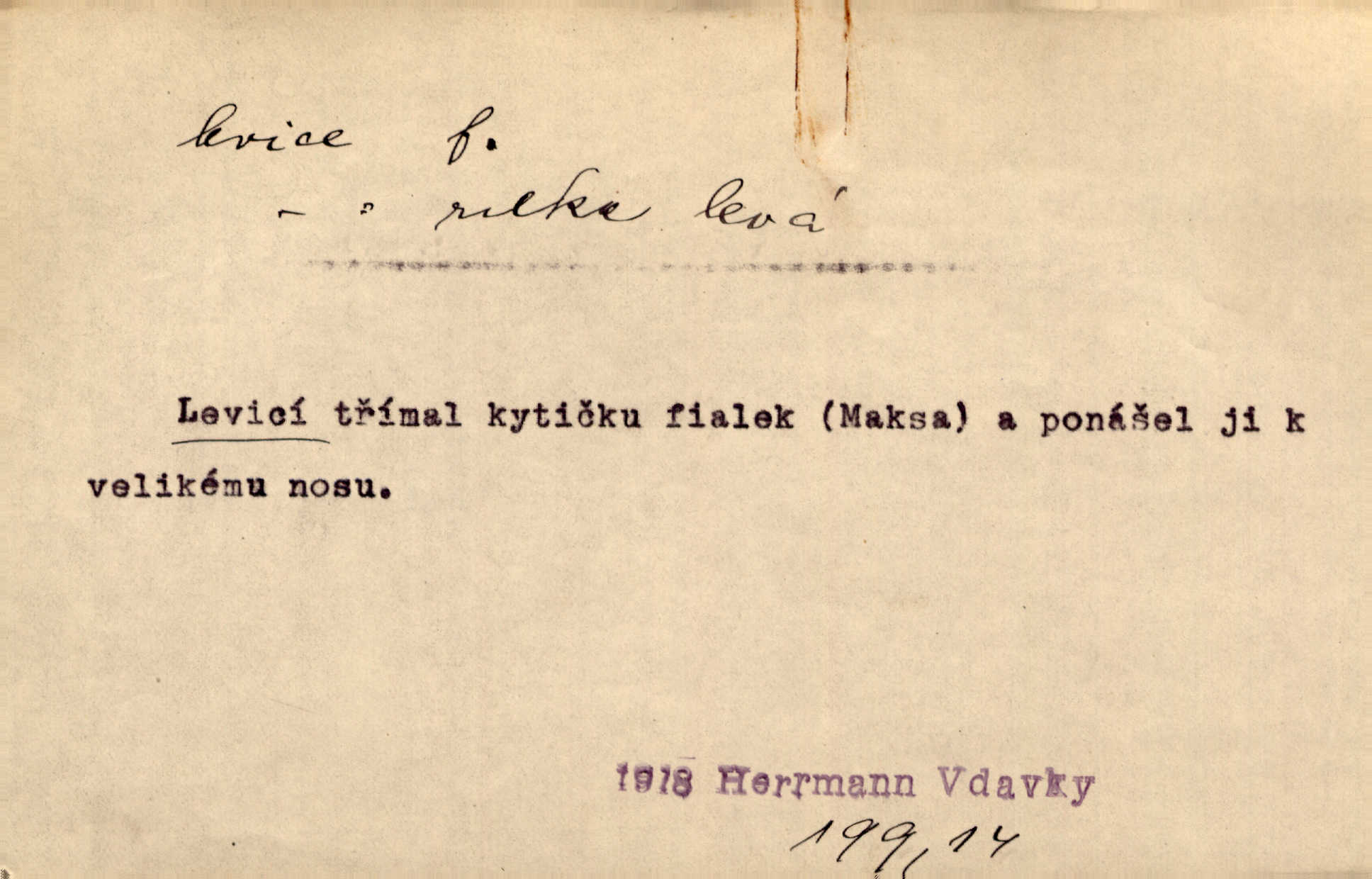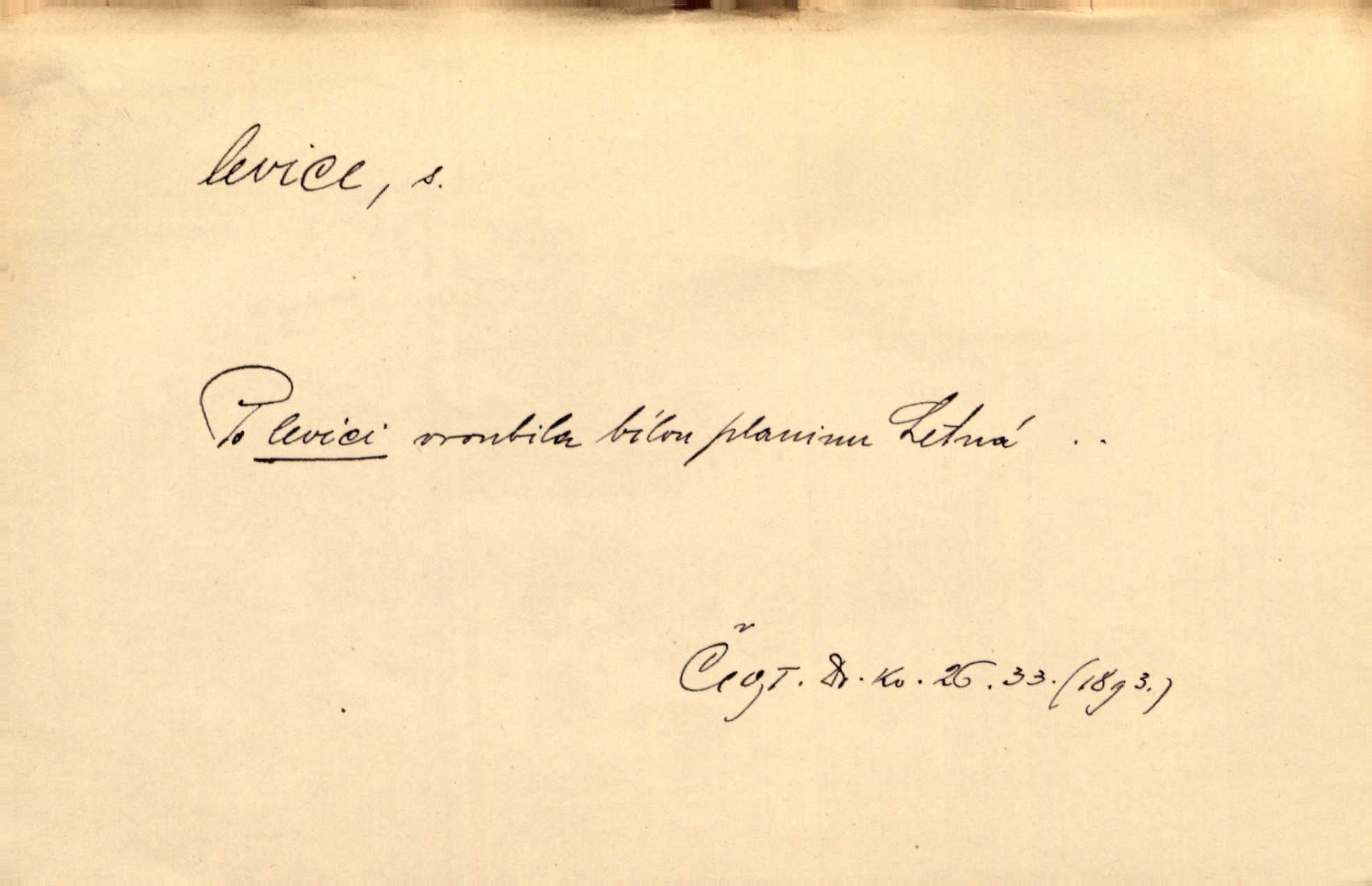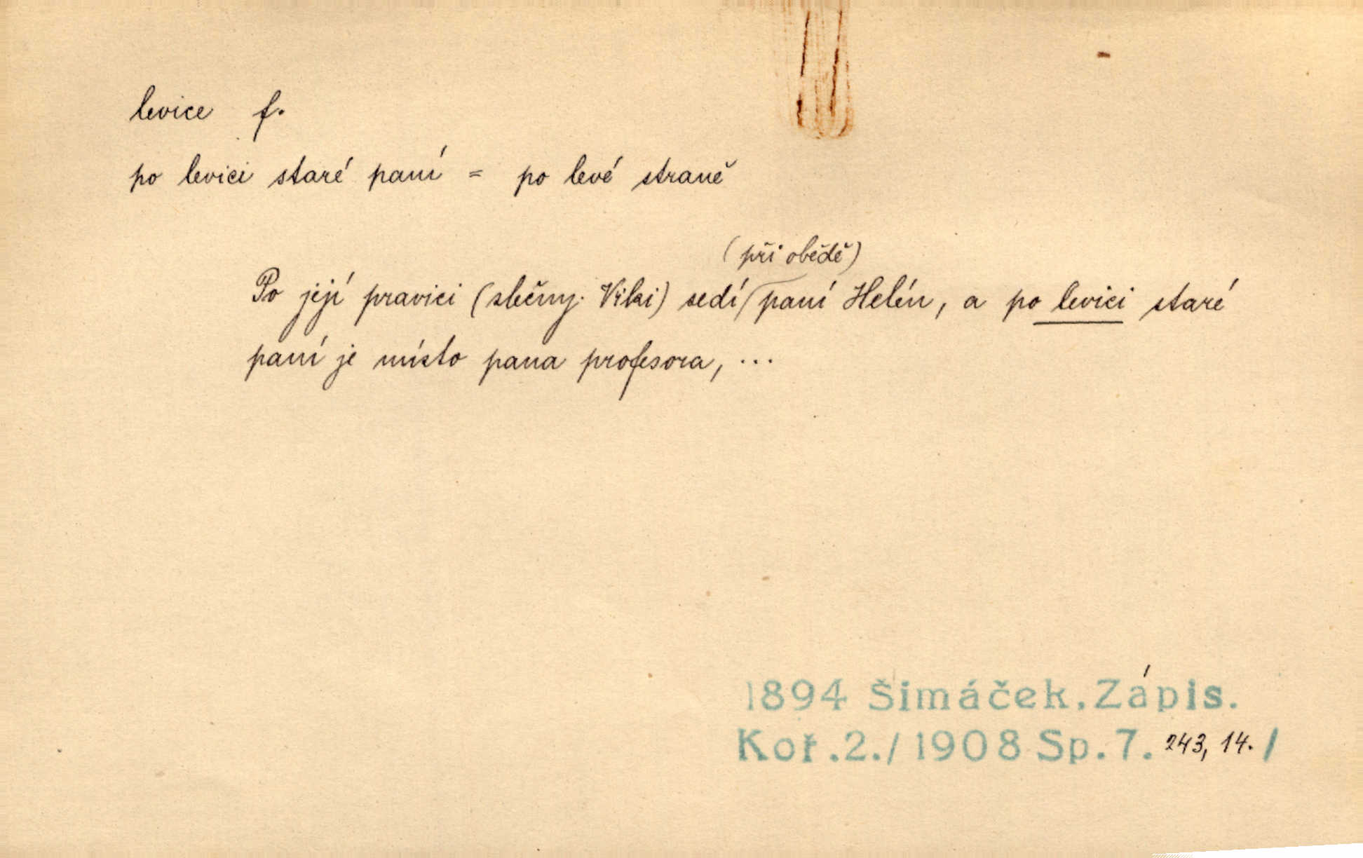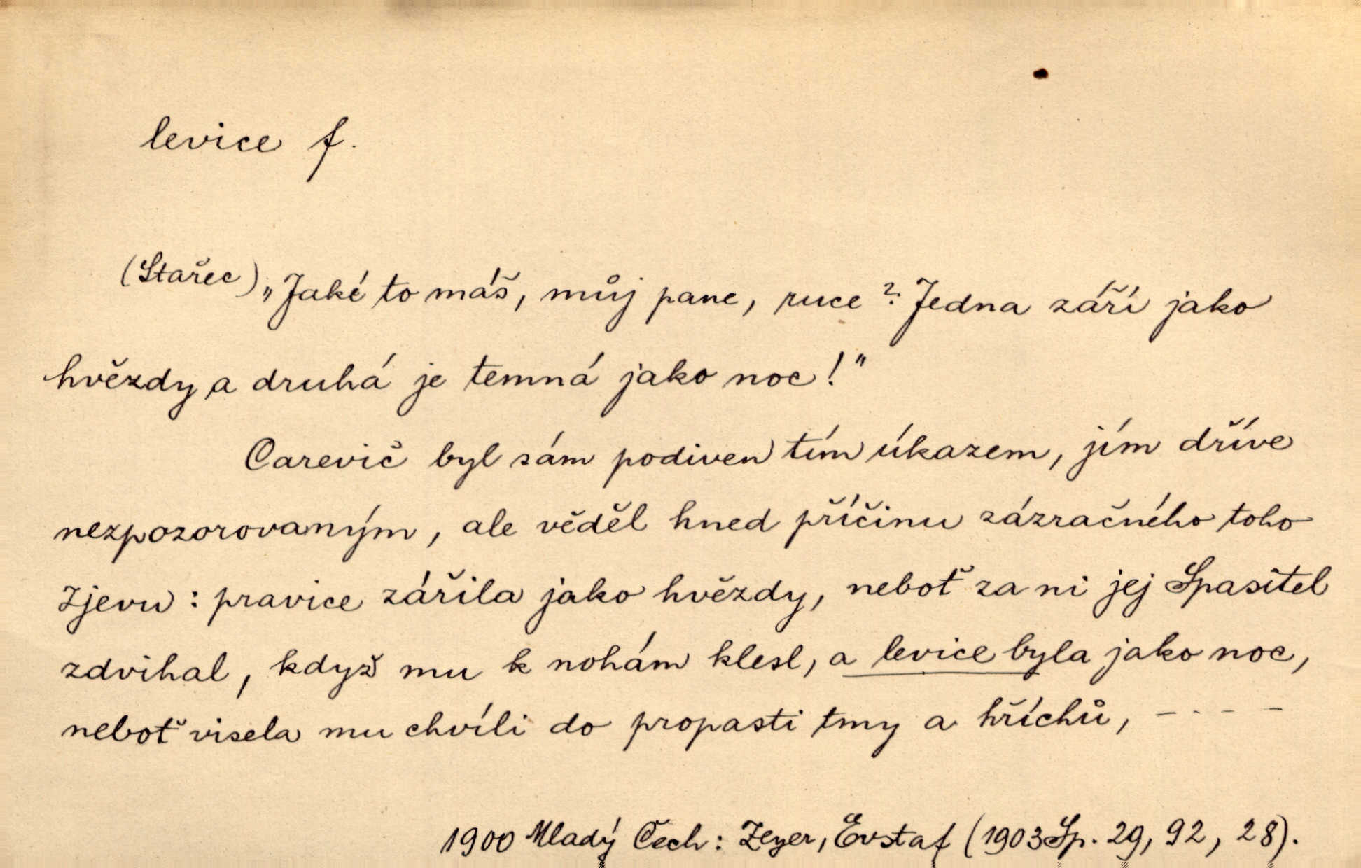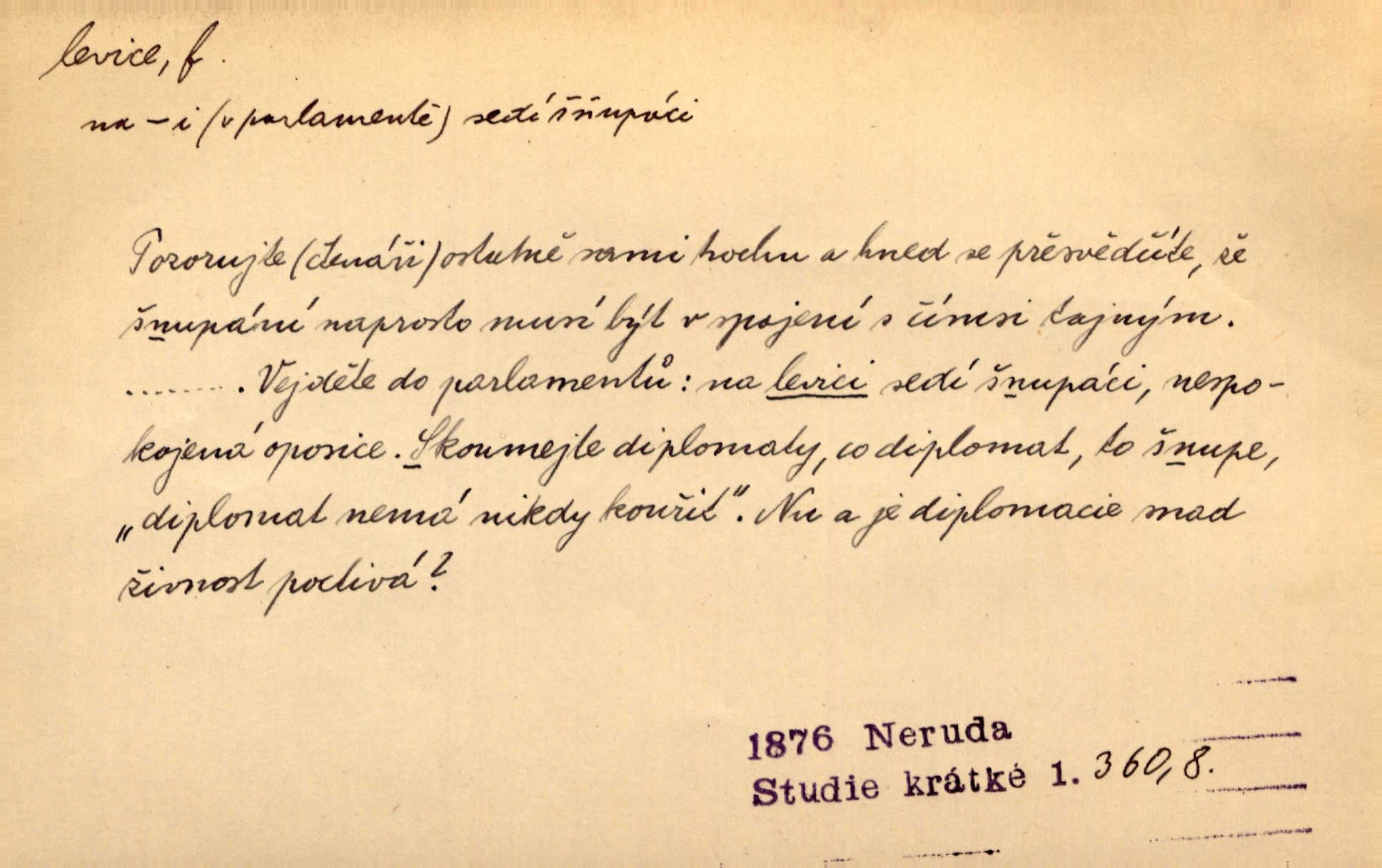 - levice, -e f. levá ruka. Levicí třímal kytičku fialek. Herrm. Má levice je v lokti chroma. Heyd. Na levici, po levici po levé ruce, na levé straně. Po levici staré paní je místo pana profesora. Šim. Po levici vroubila bílou planinu Letná. Čech. Viděl jsem Jezu Krista; papež a biskupové na pravici stáli. A na levici stáli také kněží, páni a lidé rozliční. Jir. D původně politická strana liberální, která ve sněmovně zasedala nalevo od předsednictva; nyní strany socialistické n. jim blízké. Ostatni levice [ve sněmovně vídeňské] velmi jest pomíchaná. Havl. Uzavřeli jste do voleb kompromis s krajní levicí. Mah. Levice ve studentstvu dávno ještě neprohrála. Přít. D pokrokový, radikální n. krajní směr ve vědě, umění a p. Heglova škola má svou oposiční, radikální levici. Durd. Bohumil Kubišta, malíř z levice české moderny umělecké. Šal.