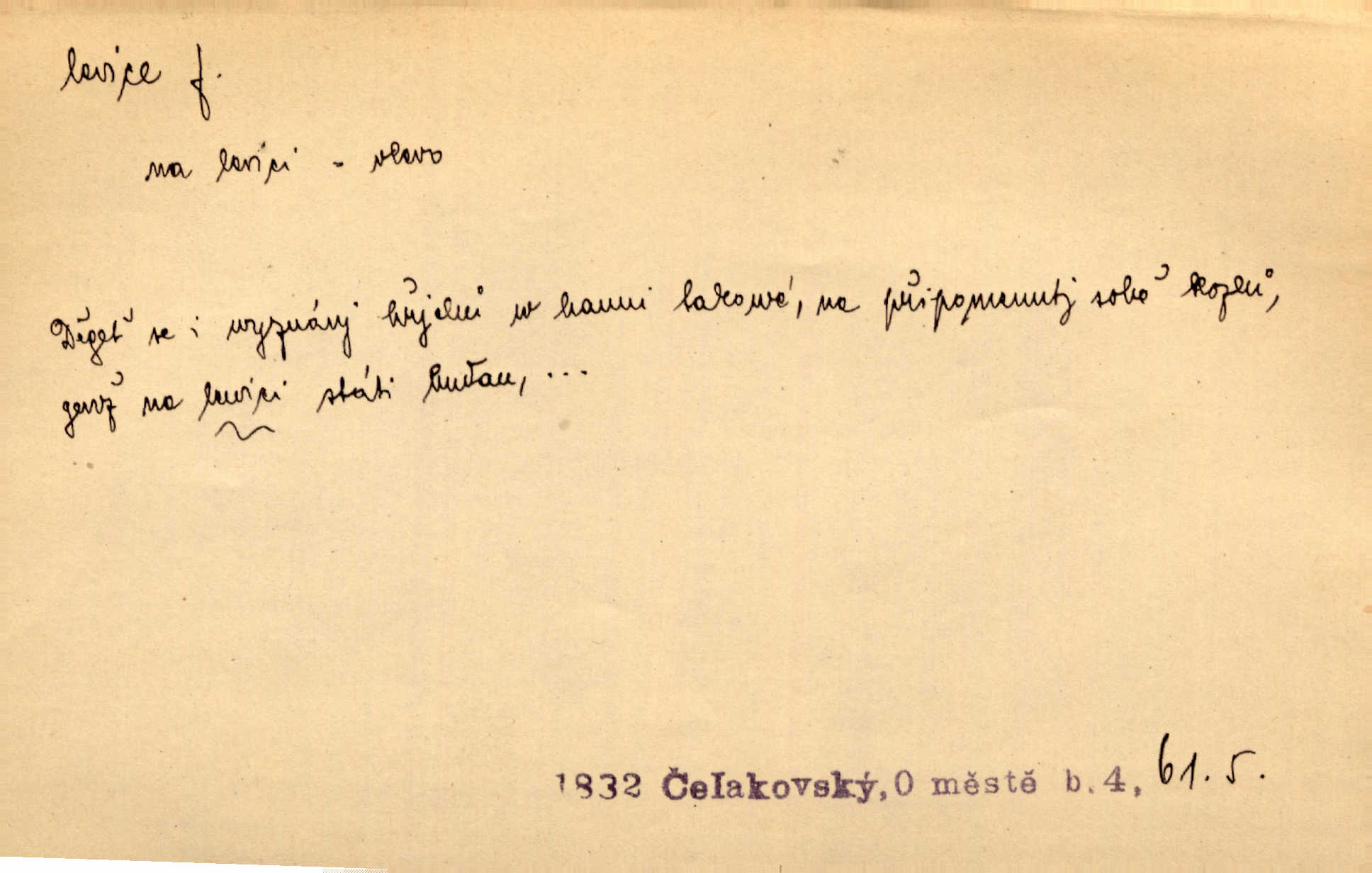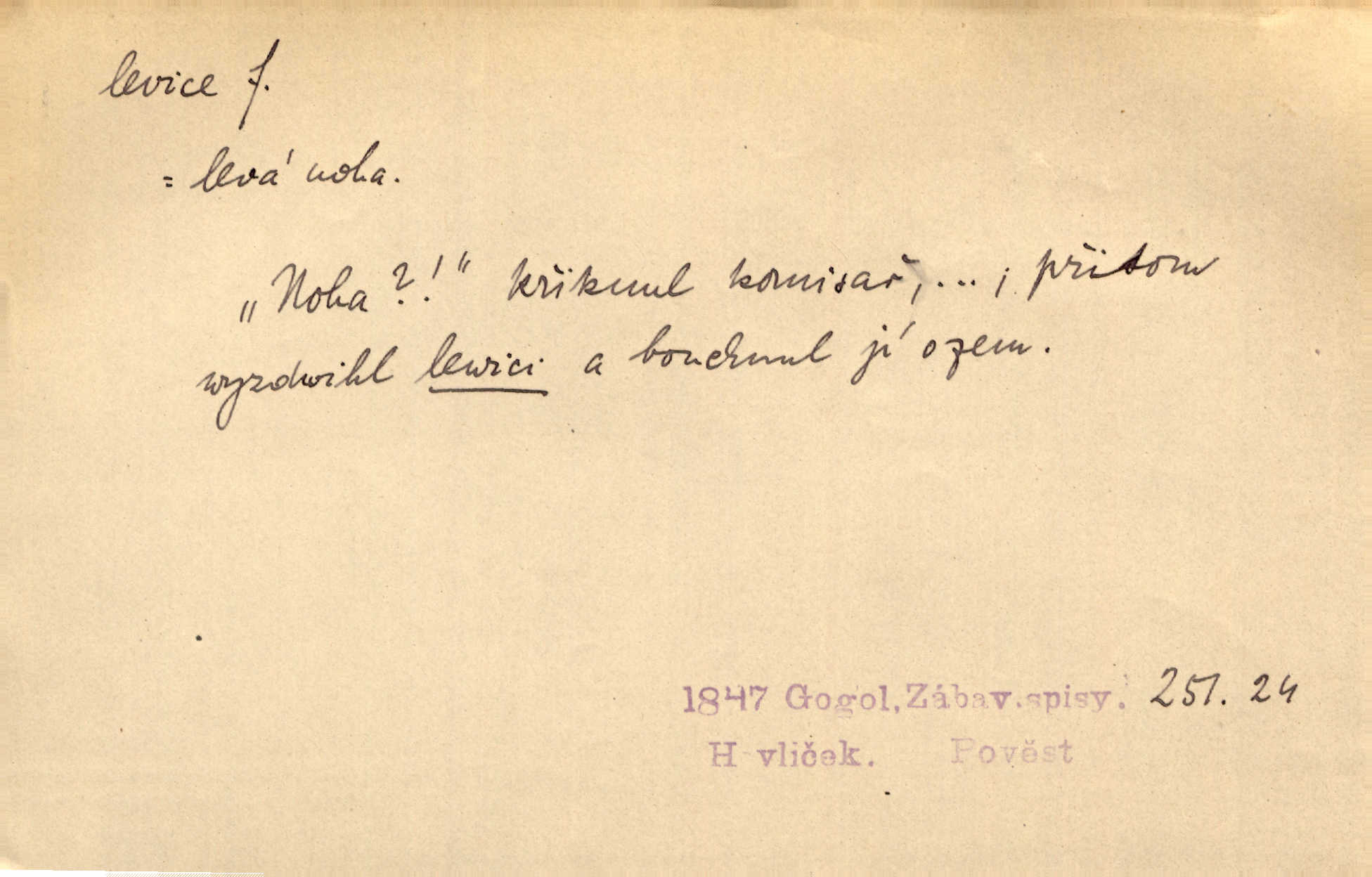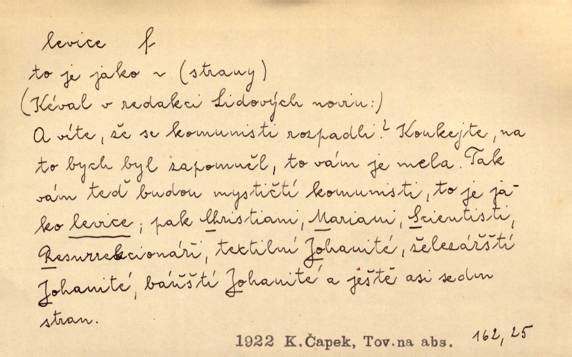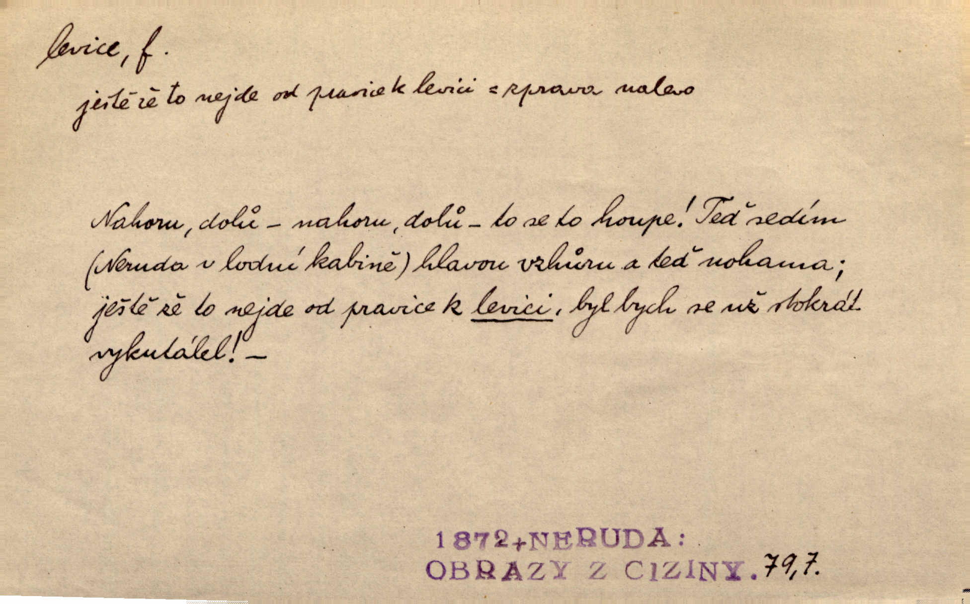 - levice, -e f. levá ruka. Levicí třímal kytičku fialek. Herrm. Má levice je v lokti chroma. Heyd. Na levici, po levici po levé ruce, na levé straně. Po levici staré paní je místo pana profesora. Šim. Po levici vroubila bílou planinu Letná. Čech. Viděl jsem Jezu Krista; papež a biskupové na pravici stáli. A na levici stáli také kněží, páni a lidé rozliční. Jir. D původně politická strana liberální, která ve sněmovně zasedala nalevo od předsednictva; nyní strany socialistické n. jim blízké. Ostatni levice [ve sněmovně vídeňské] velmi jest pomíchaná. Havl. Uzavřeli jste do voleb kompromis s krajní levicí. Mah. Levice ve studentstvu dávno ještě neprohrála. Přít. D pokrokový, radikální n. krajní směr ve vědě, umění a p. Heglova škola má svou oposiční, radikální levici. Durd. Bohumil Kubišta, malíř z levice české moderny umělecké. Šal.