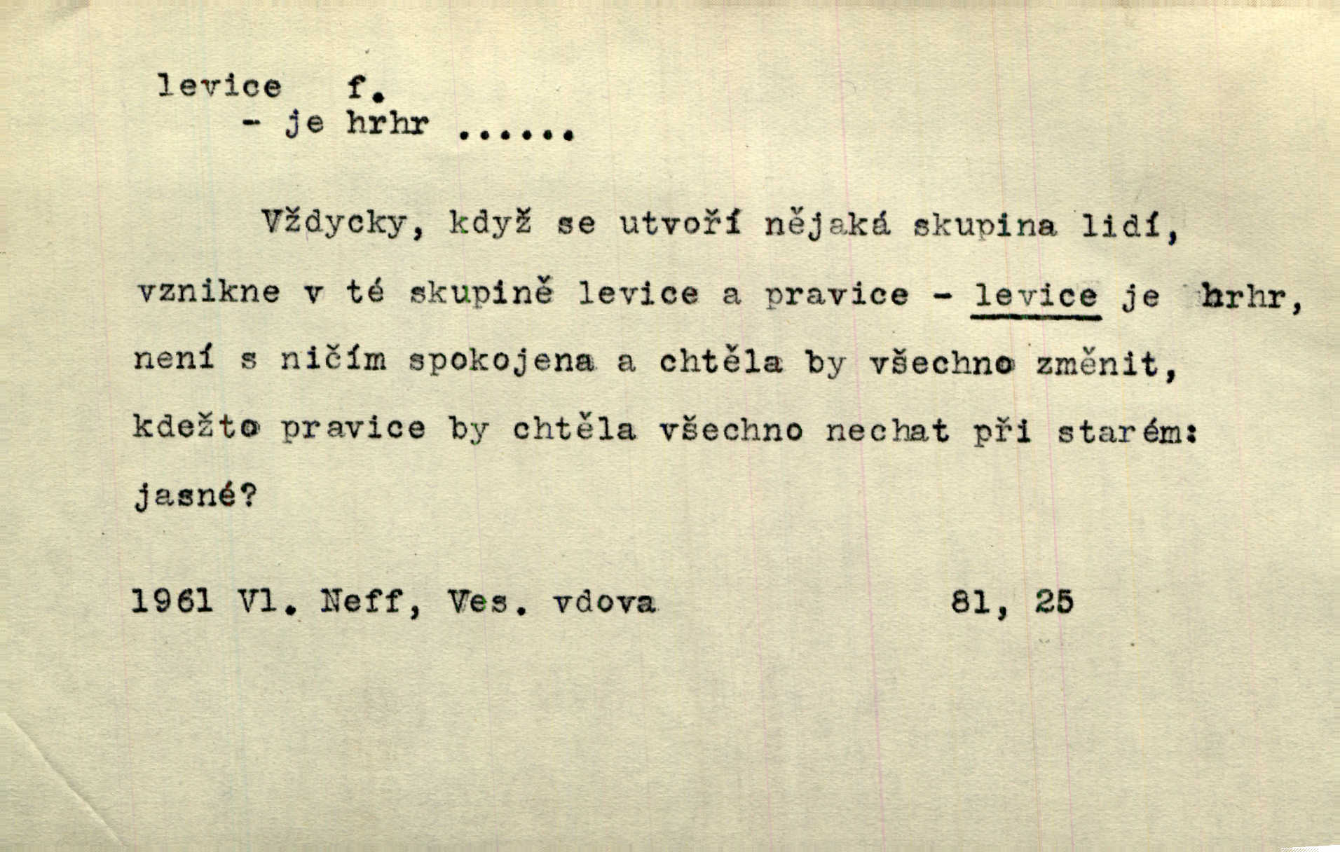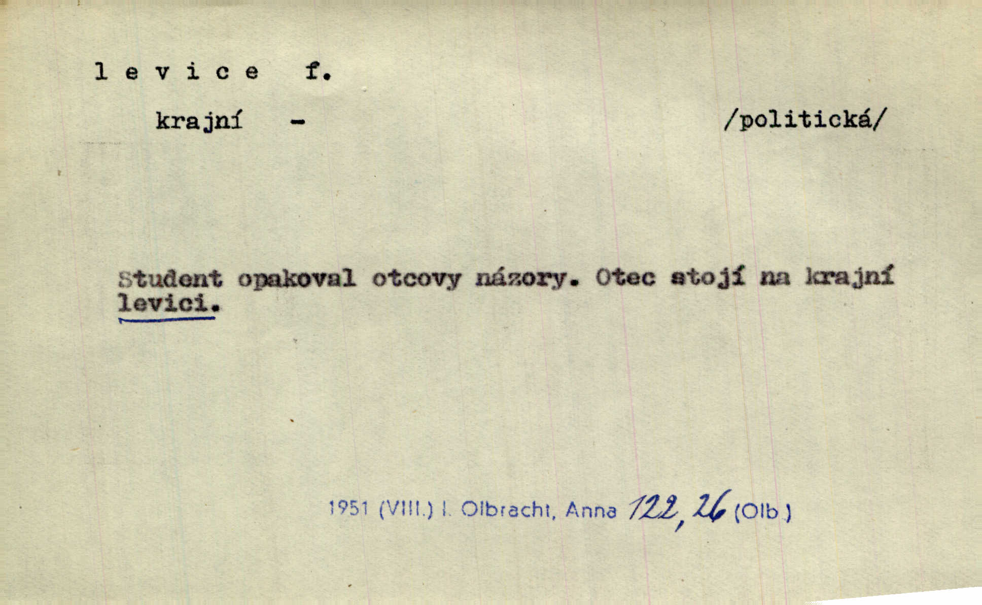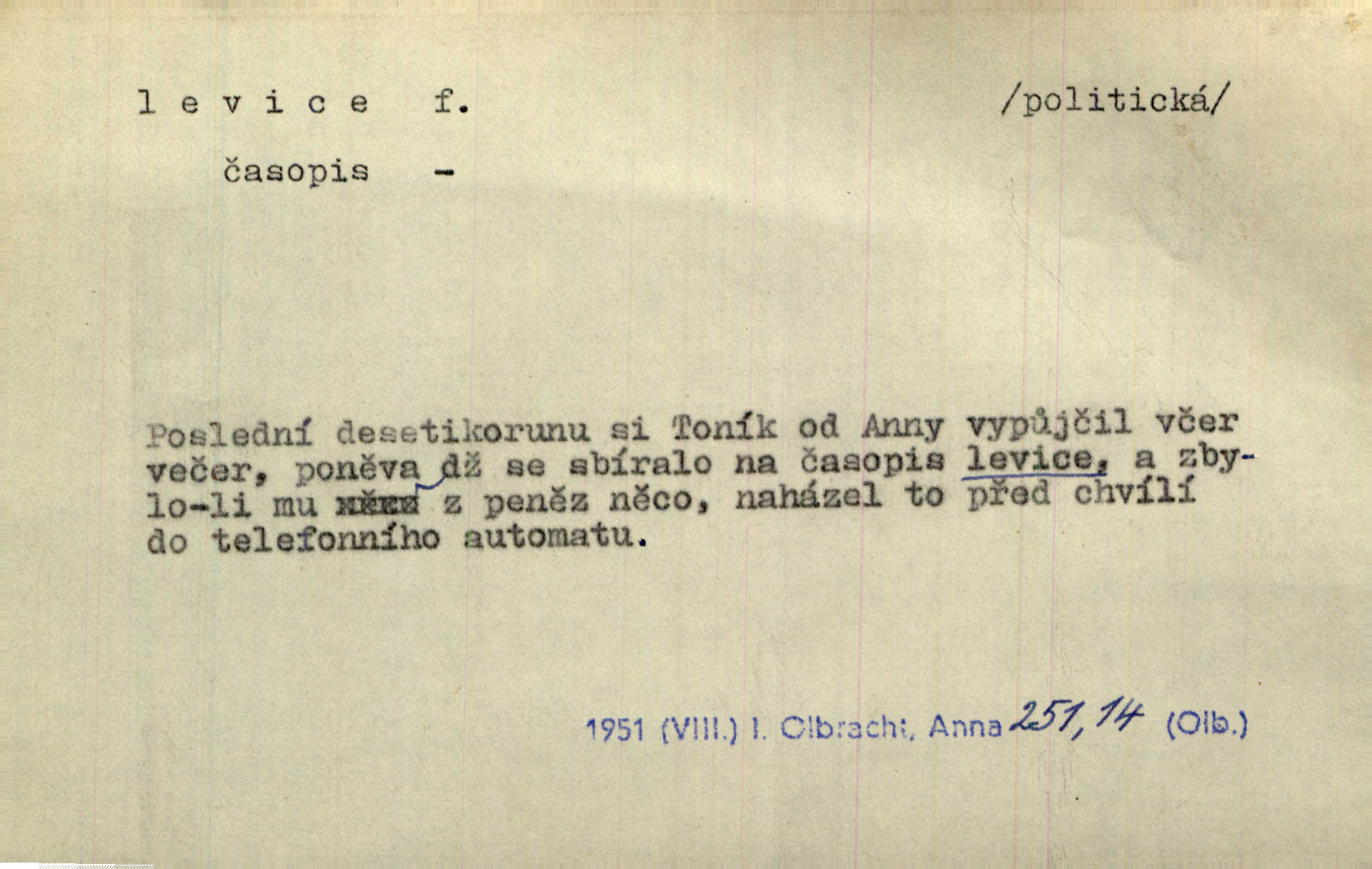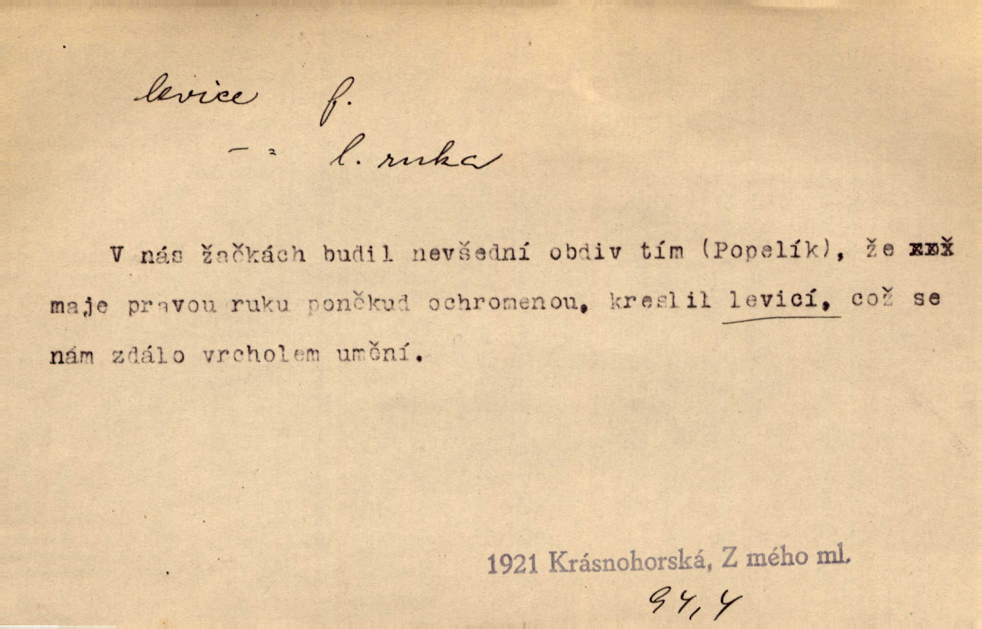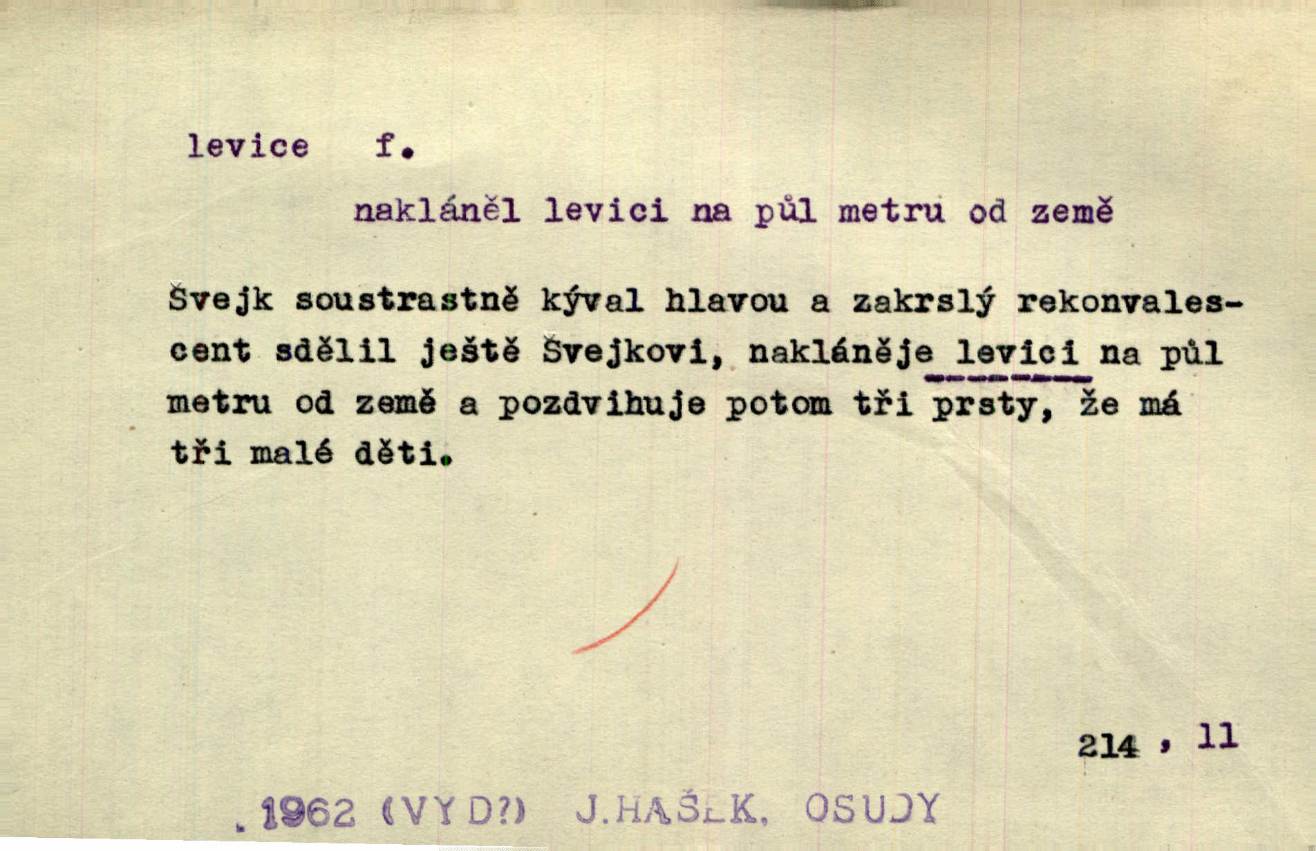 - levice, -e f. levá ruka. Levicí třímal kytičku fialek. Herrm. Má levice je v lokti chroma. Heyd. Na levici, po levici po levé ruce, na levé straně. Po levici staré paní je místo pana profesora. Šim. Po levici vroubila bílou planinu Letná. Čech. Viděl jsem Jezu Krista; papež a biskupové na pravici stáli. A na levici stáli také kněží, páni a lidé rozliční. Jir. D původně politická strana liberální, která ve sněmovně zasedala nalevo od předsednictva; nyní strany socialistické n. jim blízké. Ostatni levice [ve sněmovně vídeňské] velmi jest pomíchaná. Havl. Uzavřeli jste do voleb kompromis s krajní levicí. Mah. Levice ve studentstvu dávno ještě neprohrála. Přít. D pokrokový, radikální n. krajní směr ve vědě, umění a p. Heglova škola má svou oposiční, radikální levici. Durd. Bohumil Kubišta, malíř z levice české moderny umělecké. Šal.