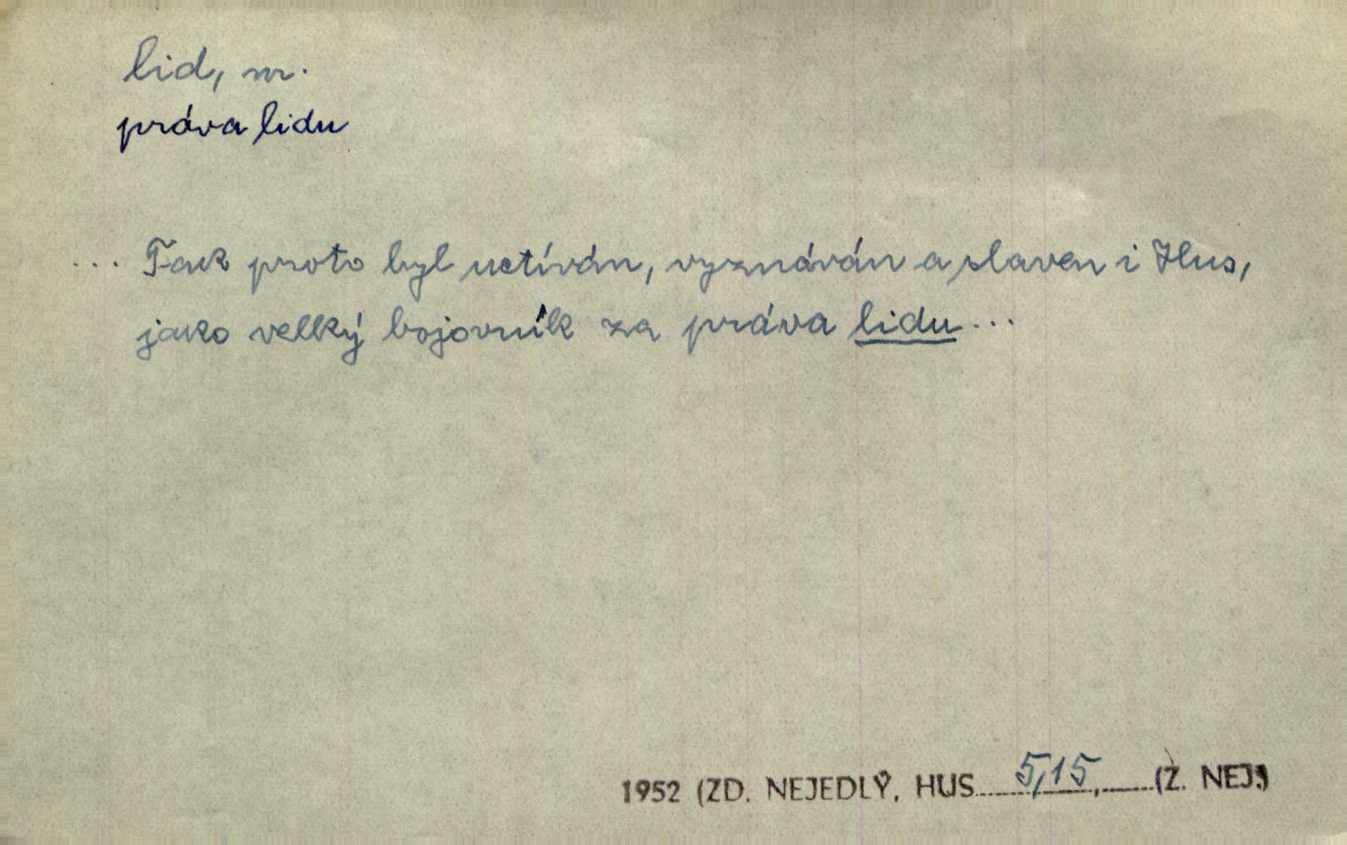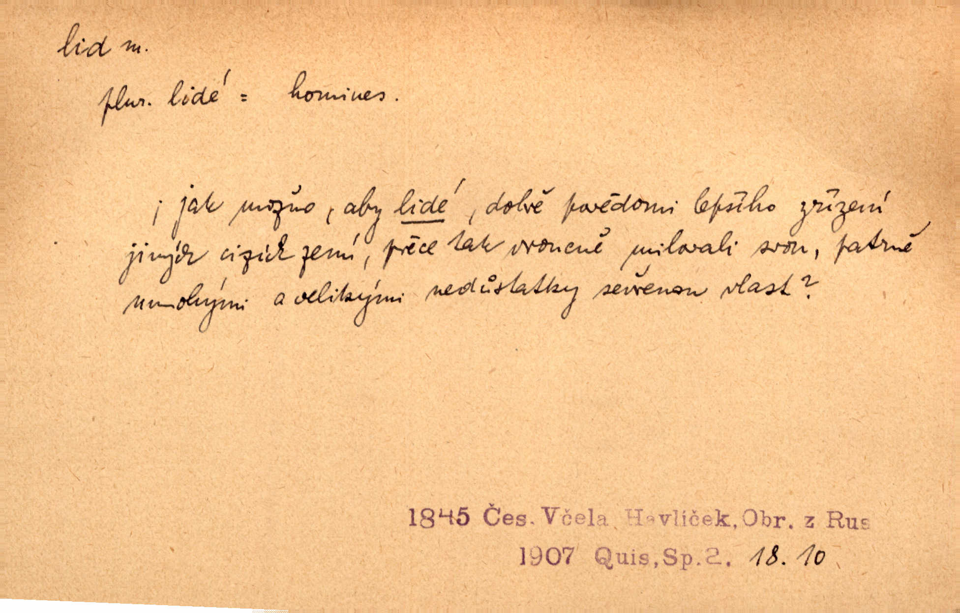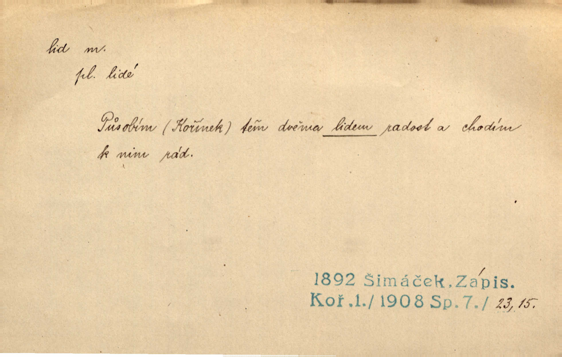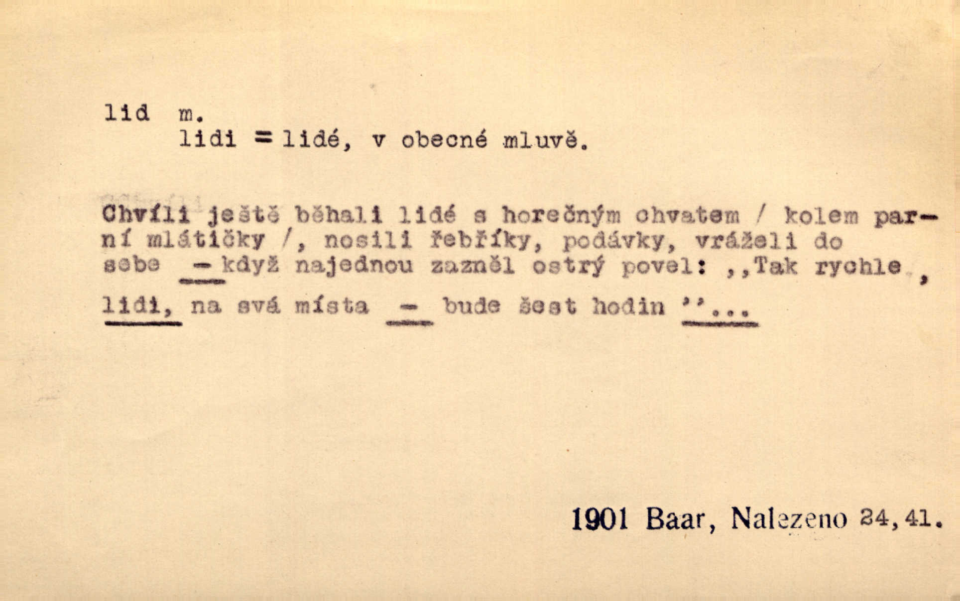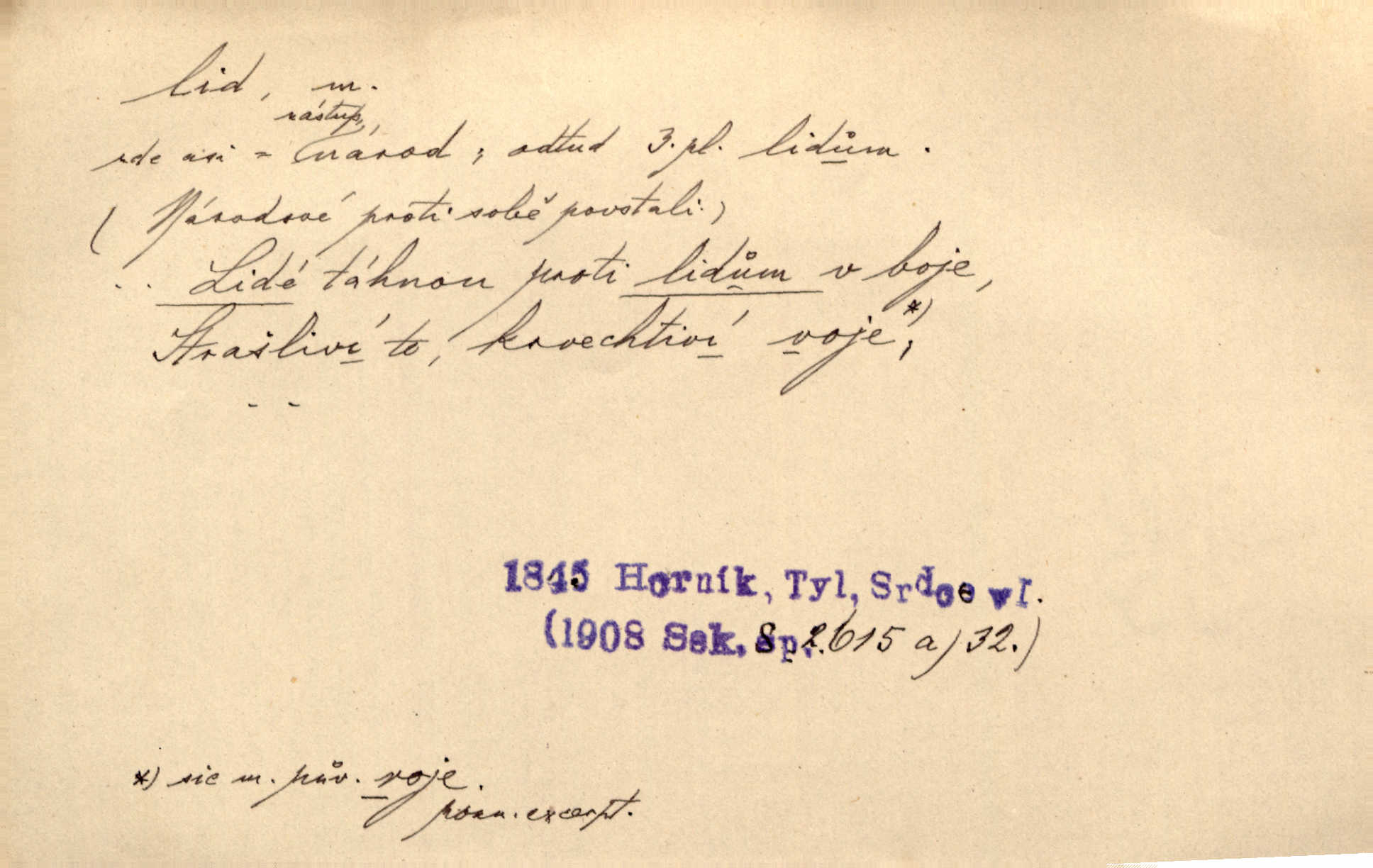 - lid, -u m. široké vrstvy společenské (dělnické, zemědělské, středního stavu). Z pojmu národa jako celku politického vyděluje se sociálnější pojem lidu. Sociálně se mluví od té doby [konce 18. stol.] o lidu, co do jazyka a politické moci o národu. Mas. Svolán byl poddaný lid. Herb. Viděl jsem tu královnu, jež lid svůj miluje poddané. Zey. Berkovec a hejtmané lidu branného s lidem pěším a jízdním sestoupili na most vojskem. Goll. S lidem svým zacházel jako s věcí se zaměstnanci, s personálem. Don. Všechen mladý mužský lid, nejen svobodní, ale také ženatí; výrostkové dali se na náhlý útěk. Jir. Bylo možno vyčísti z tváří soudců z lidu, že obžalobě rozumějí stále ještě jenom jako tvrzení porotců. Čap. Ch. D lidé vůbec. Zástupy lidu shromažďovaly se na chodnících. Čech. Do nádraží vevalil se proud lidu. K. Čap. [Šenkýřky:] To budeme mít moc lidu. Erb. D národ. Český lide, kde pak je tvůj král? Vrch. V ulicích lid Israelský zmírá. Vrch.