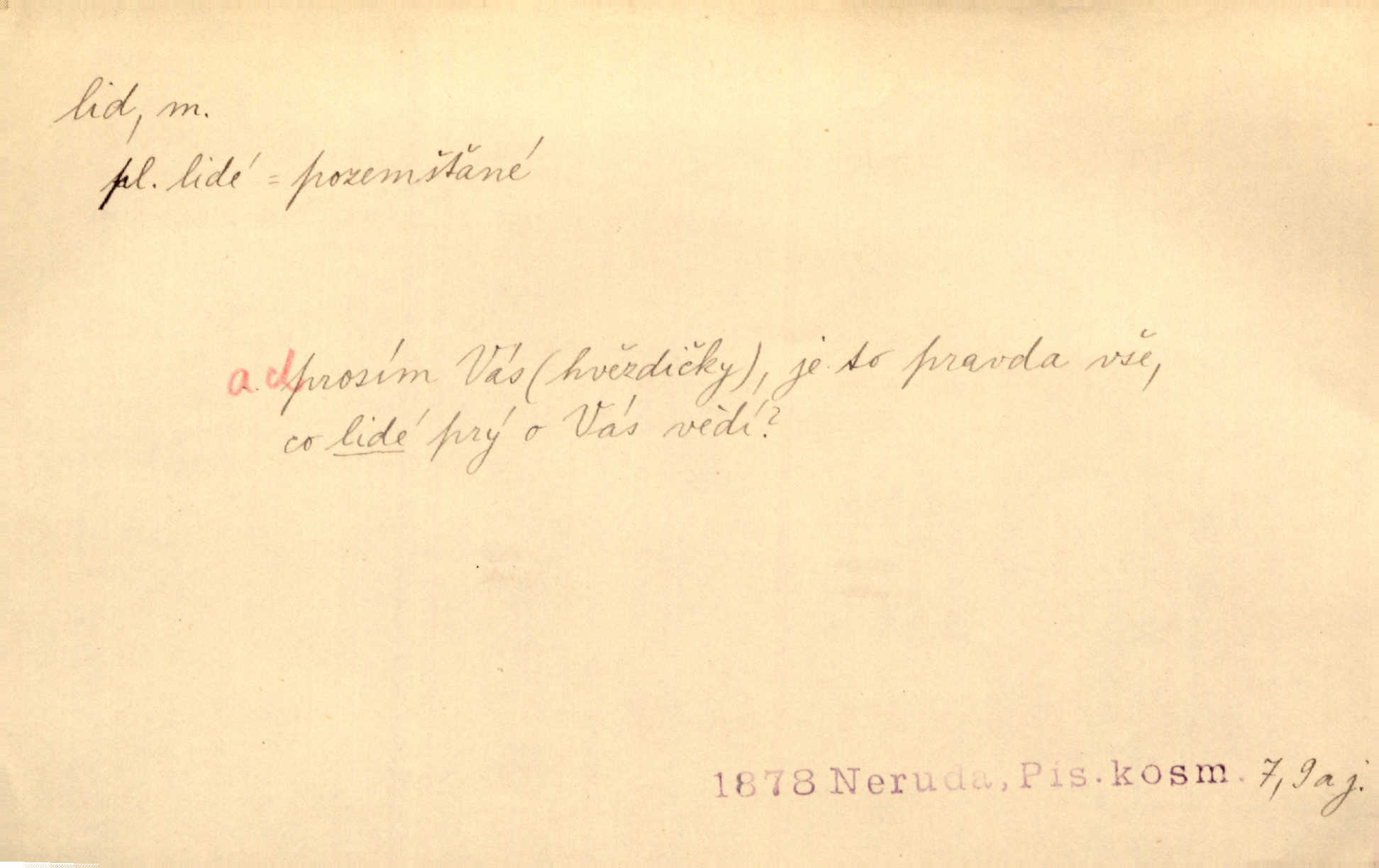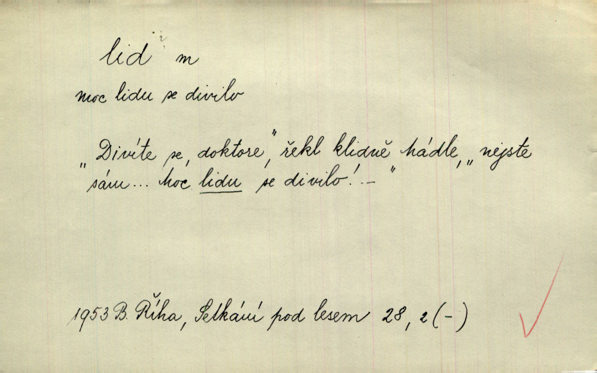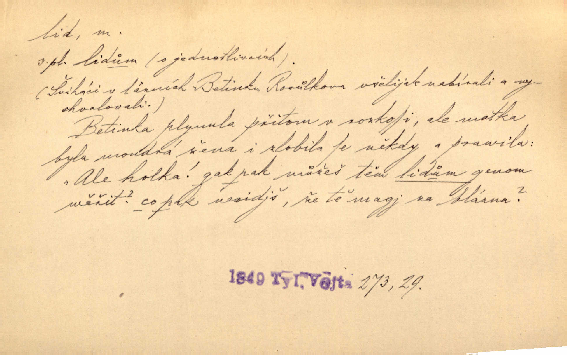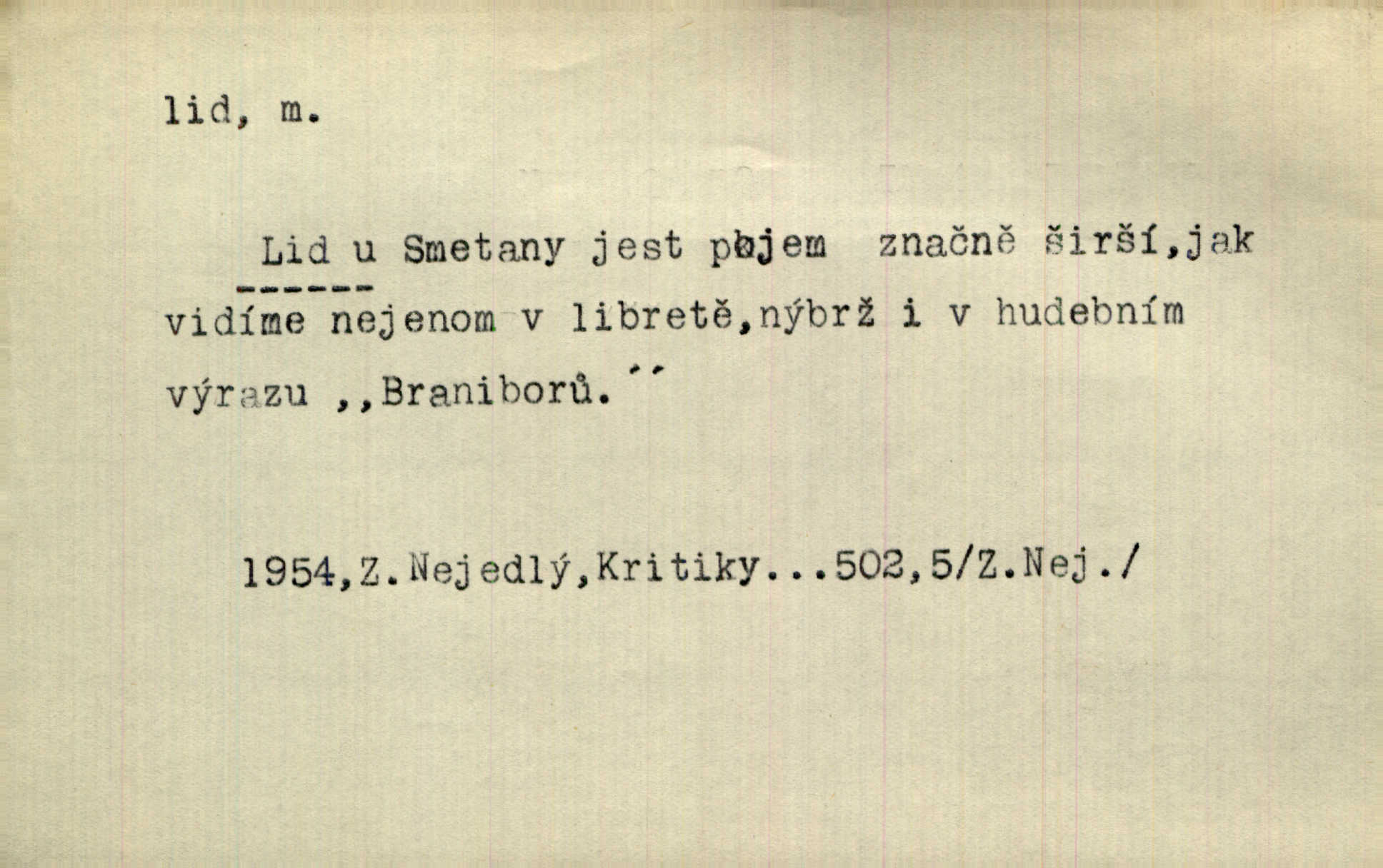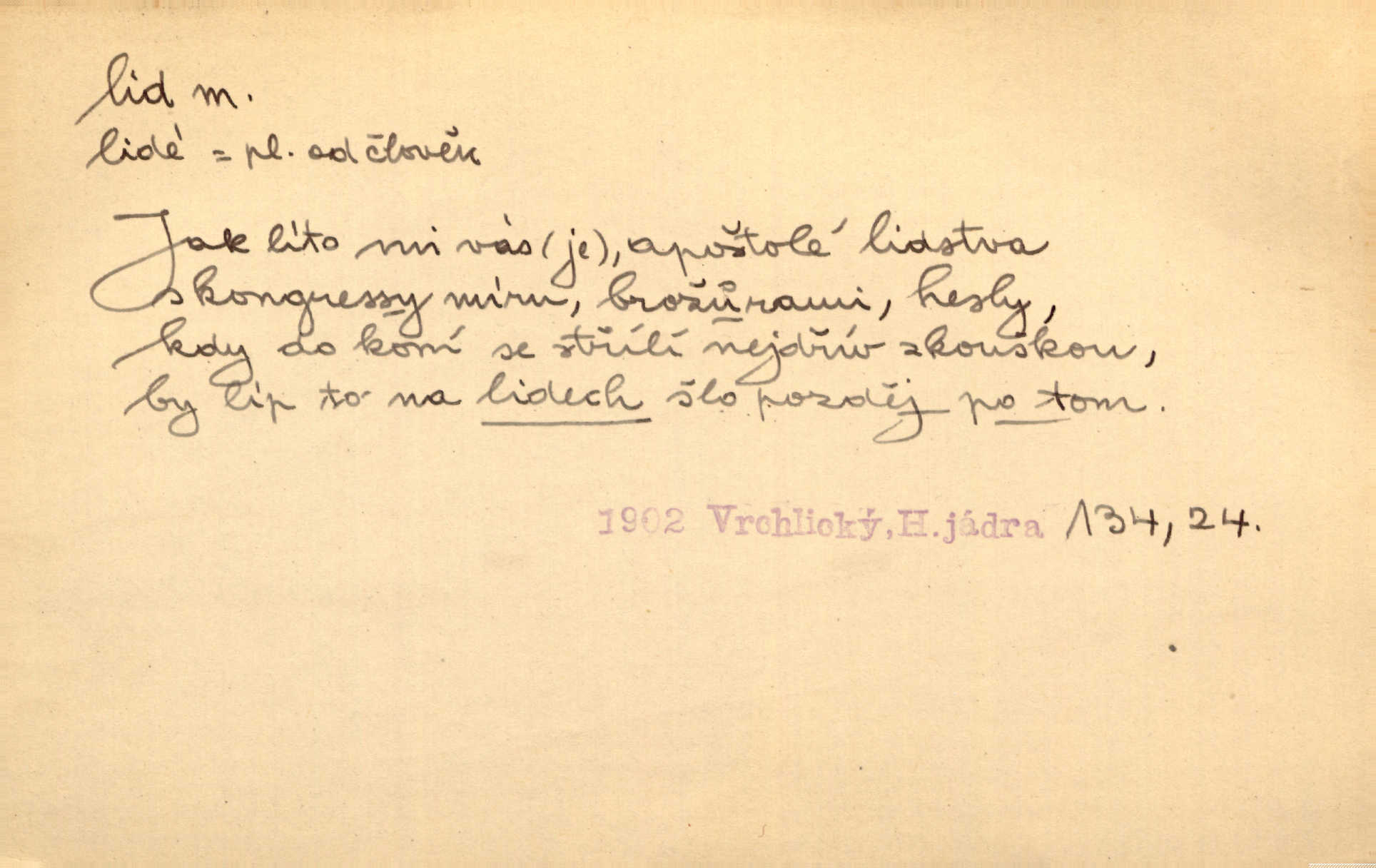- lid, -u m. široké vrstvy společenské (dělnické, zemědělské, středního stavu). Z pojmu národa jako celku politického vyděluje se sociálnější pojem lidu. Sociálně se mluví od té doby [konce 18. stol.] o lidu, co do jazyka a politické moci o národu. Mas. Svolán byl poddaný lid. Herb. Viděl jsem tu královnu, jež lid svůj miluje poddané. Zey. Berkovec a hejtmané lidu branného s lidem pěším a jízdním sestoupili na most vojskem. Goll. S lidem svým zacházel jako s věcí se zaměstnanci, s personálem. Don. Všechen mladý mužský lid, nejen svobodní, ale také ženatí; výrostkové dali se na náhlý útěk. Jir. Bylo možno vyčísti z tváří soudců z lidu, že obžalobě rozumějí stále ještě jenom jako tvrzení porotců. Čap. Ch. D lidé vůbec. Zástupy lidu shromažďovaly se na chodnících. Čech. Do nádraží vevalil se proud lidu. K. Čap. [Šenkýřky:] To budeme mít moc lidu. Erb. D národ. Český lide, kde pak je tvůj král? Vrch. V ulicích lid Israelský zmírá. Vrch.
