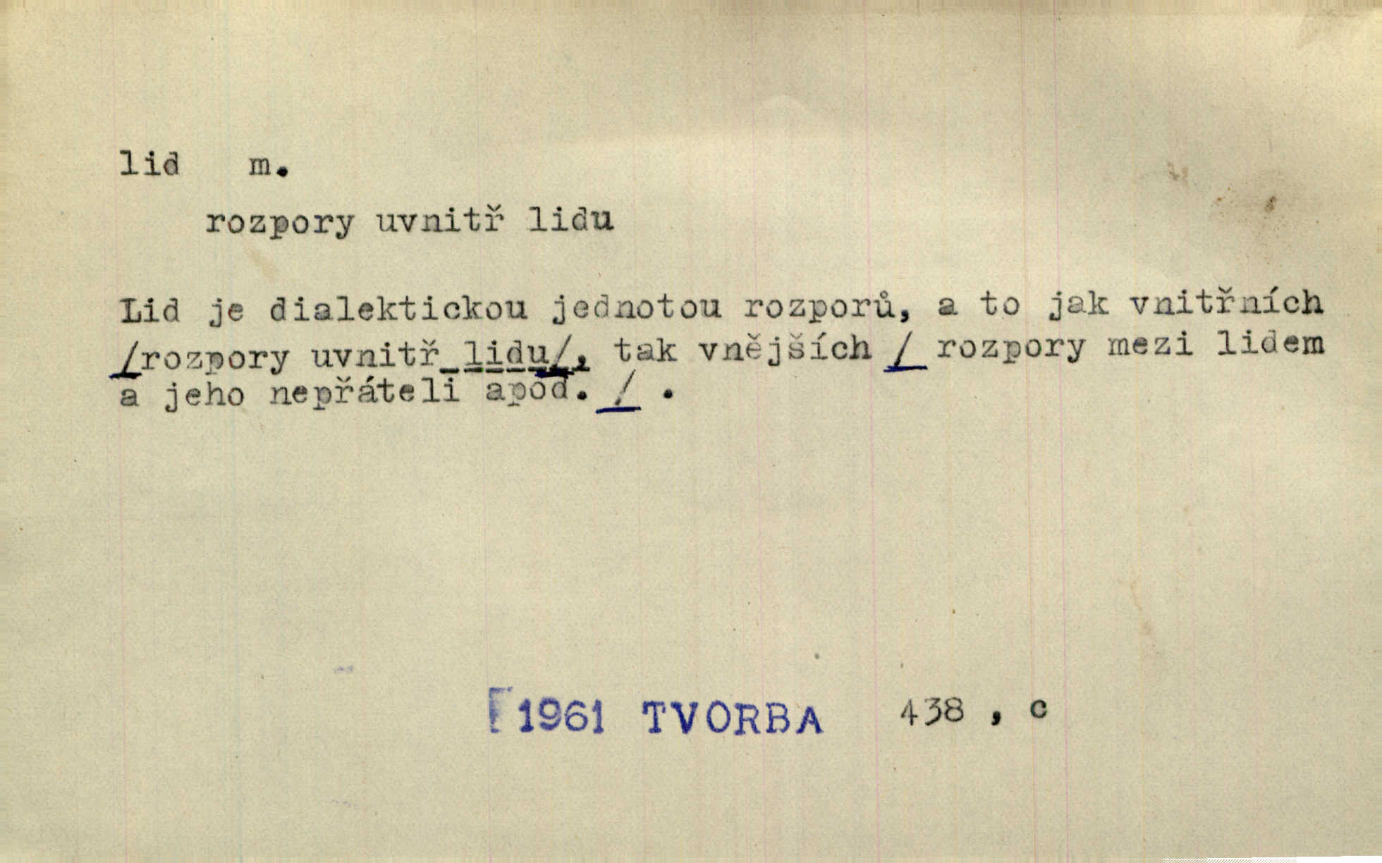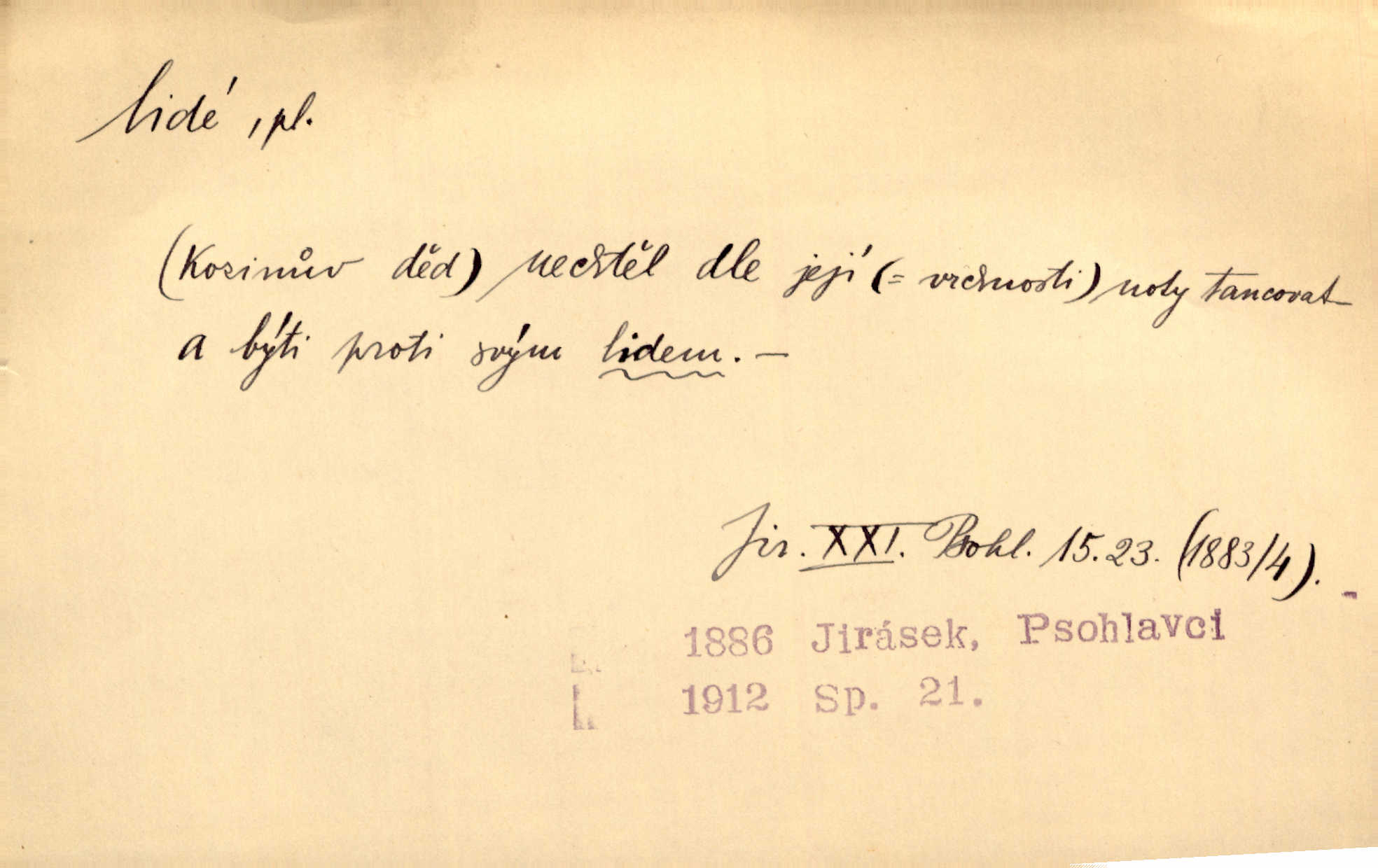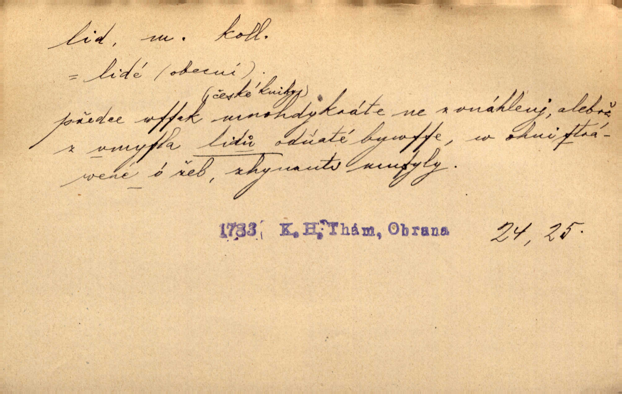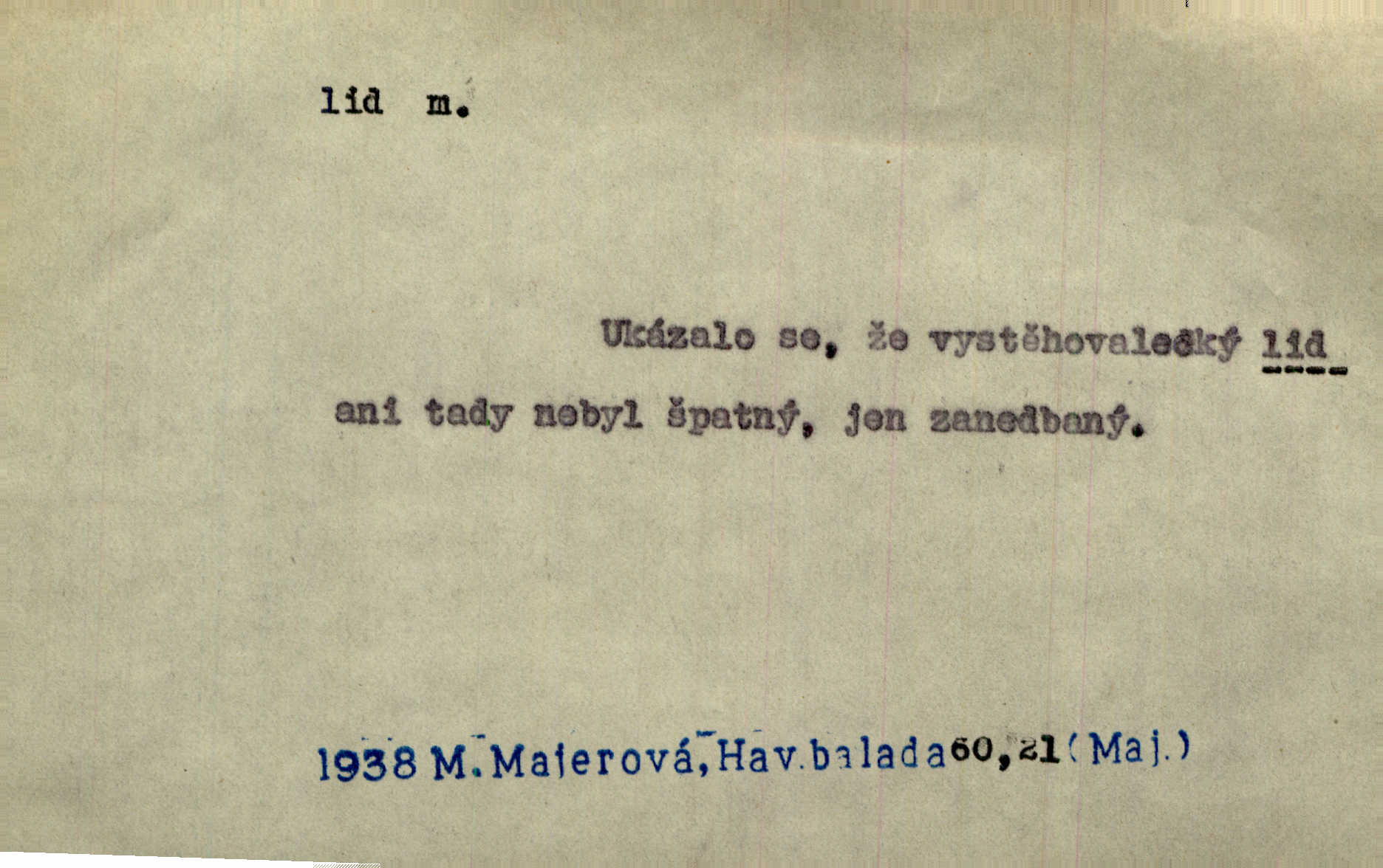 - lid, -u m. široké vrstvy společenské (dělnické, zemědělské, středního stavu). Z pojmu národa jako celku politického vyděluje se sociálnější pojem lidu. Sociálně se mluví od té doby [konce 18. stol.] o lidu, co do jazyka a politické moci o národu. Mas. Svolán byl poddaný lid. Herb. Viděl jsem tu královnu, jež lid svůj miluje poddané. Zey. Berkovec a hejtmané lidu branného s lidem pěším a jízdním sestoupili na most vojskem. Goll. S lidem svým zacházel jako s věcí se zaměstnanci, s personálem. Don. Všechen mladý mužský lid, nejen svobodní, ale také ženatí; výrostkové dali se na náhlý útěk. Jir. Bylo možno vyčísti z tváří soudců z lidu, že obžalobě rozumějí stále ještě jenom jako tvrzení porotců. Čap. Ch. D lidé vůbec. Zástupy lidu shromažďovaly se na chodnících. Čech. Do nádraží vevalil se proud lidu. K. Čap. [Šenkýřky:] To budeme mít moc lidu. Erb. D národ. Český lide, kde pak je tvůj král? Vrch. V ulicích lid Israelský zmírá. Vrch.