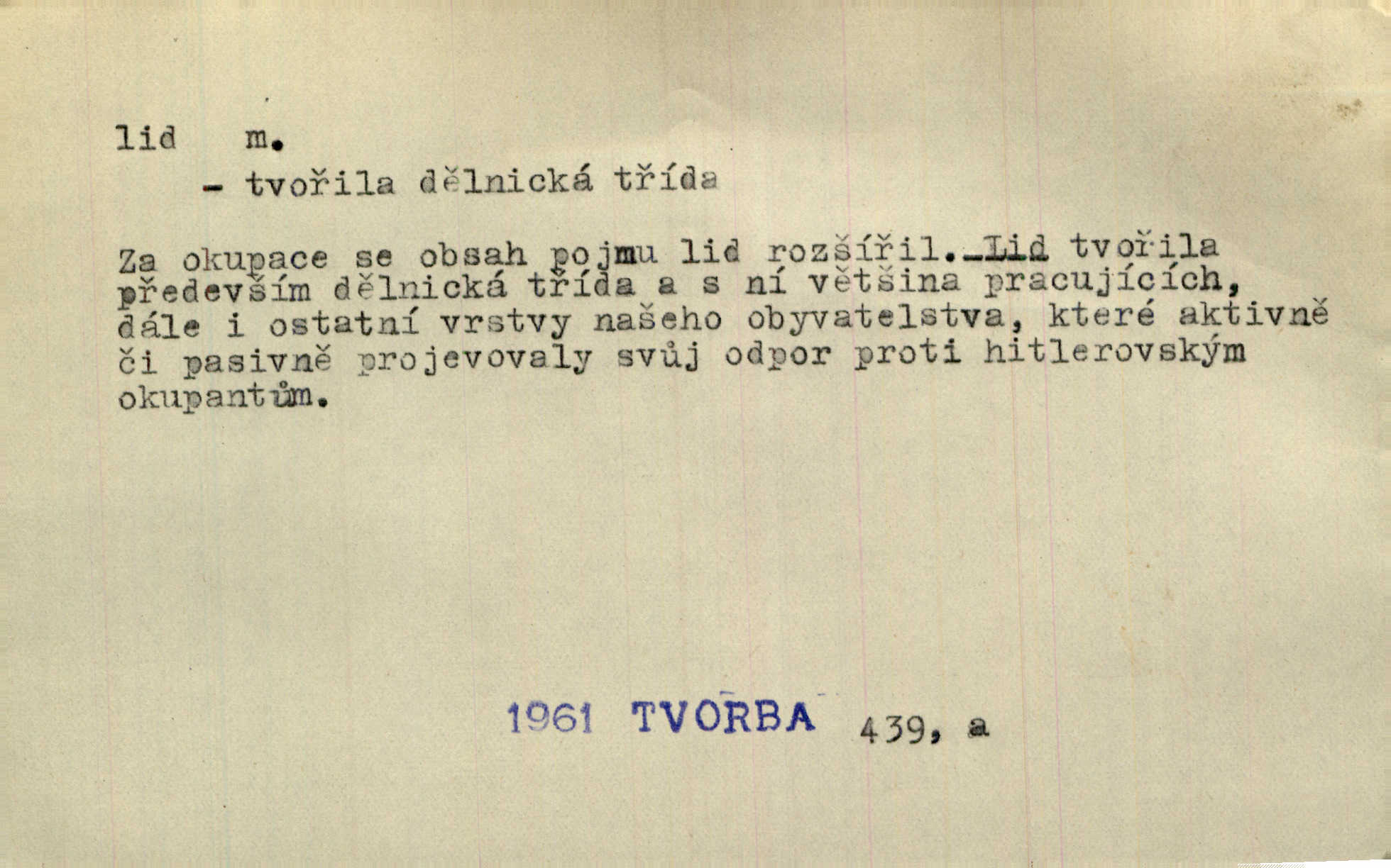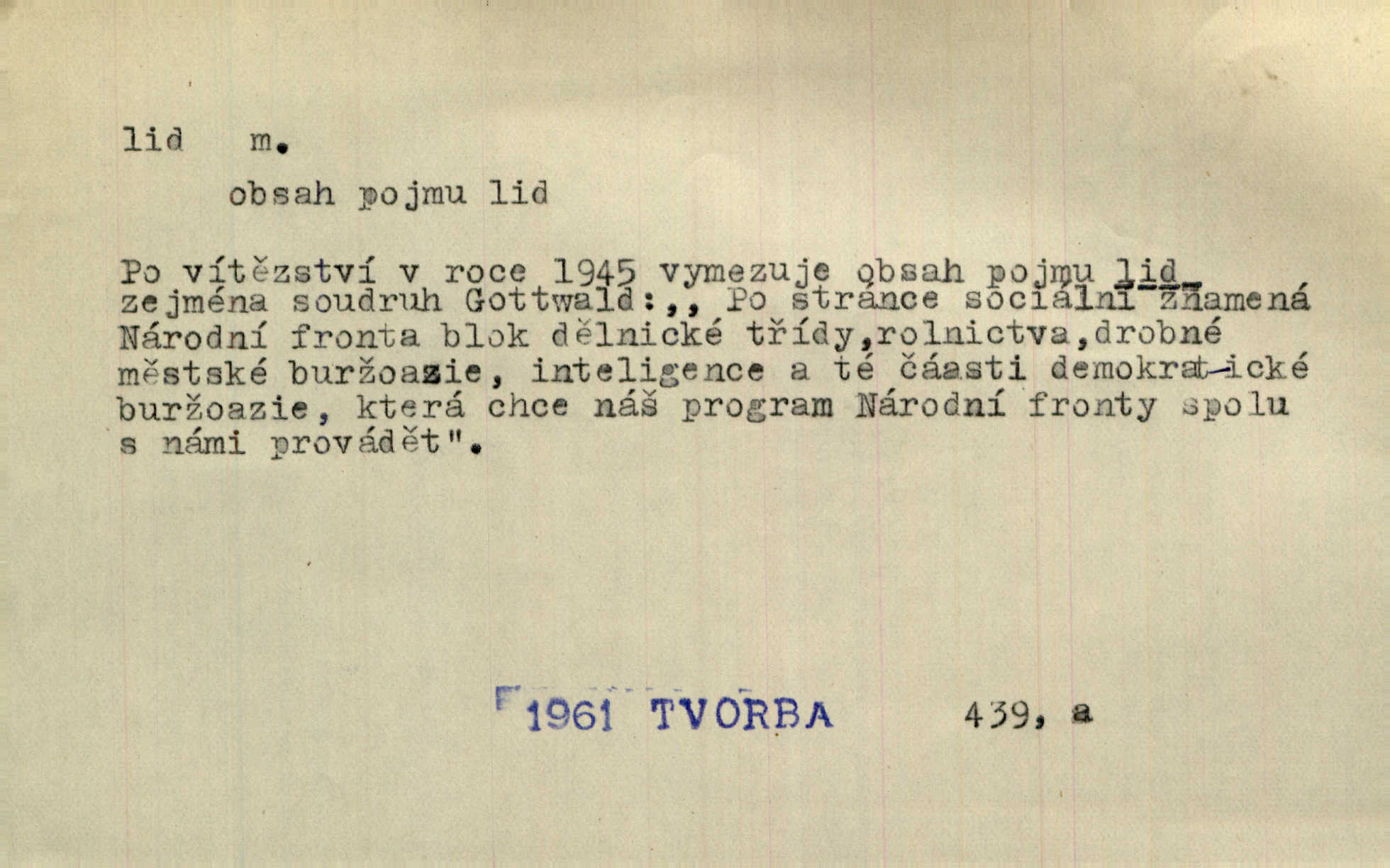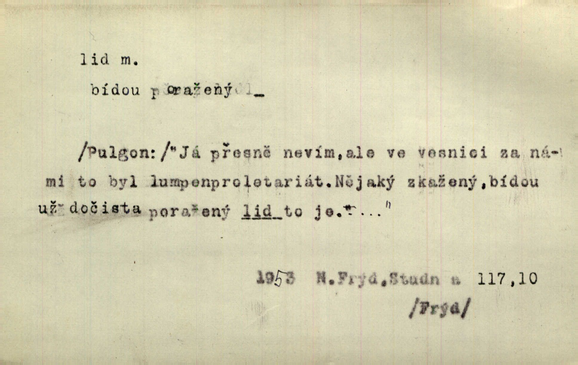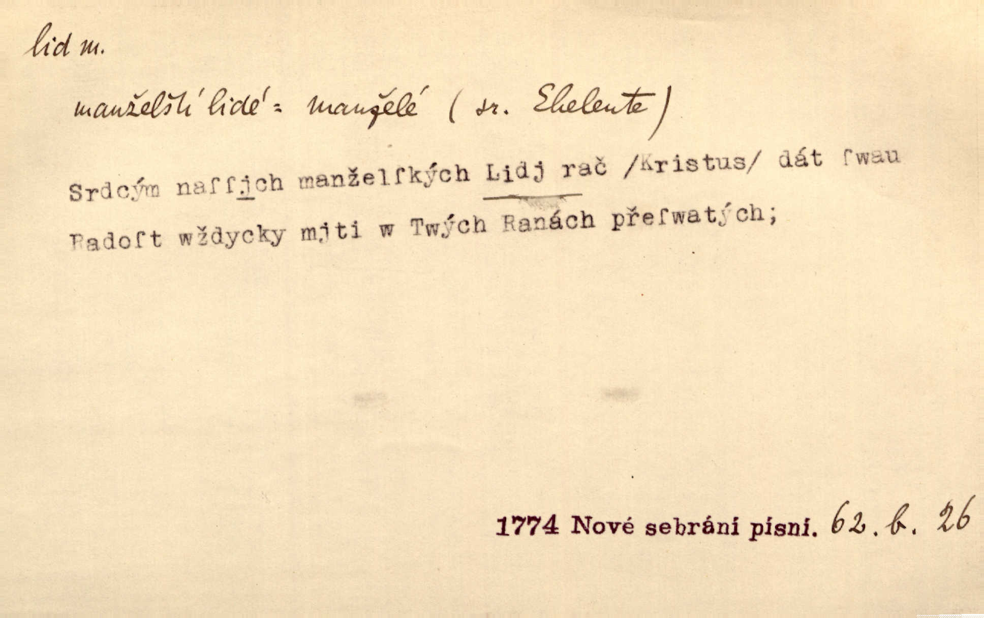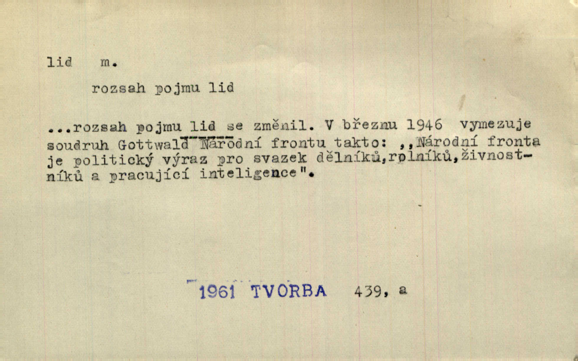 - lid, -u m. široké vrstvy společenské (dělnické, zemědělské, středního stavu). Z pojmu národa jako celku politického vyděluje se sociálnější pojem lidu. Sociálně se mluví od té doby [konce 18. stol.] o lidu, co do jazyka a politické moci o národu. Mas. Svolán byl poddaný lid. Herb. Viděl jsem tu královnu, jež lid svůj miluje poddané. Zey. Berkovec a hejtmané lidu branného s lidem pěším a jízdním sestoupili na most vojskem. Goll. S lidem svým zacházel jako s věcí se zaměstnanci, s personálem. Don. Všechen mladý mužský lid, nejen svobodní, ale také ženatí; výrostkové dali se na náhlý útěk. Jir. Bylo možno vyčísti z tváří soudců z lidu, že obžalobě rozumějí stále ještě jenom jako tvrzení porotců. Čap. Ch. D lidé vůbec. Zástupy lidu shromažďovaly se na chodnících. Čech. Do nádraží vevalil se proud lidu. K. Čap. [Šenkýřky:] To budeme mít moc lidu. Erb. D národ. Český lide, kde pak je tvůj král? Vrch. V ulicích lid Israelský zmírá. Vrch.