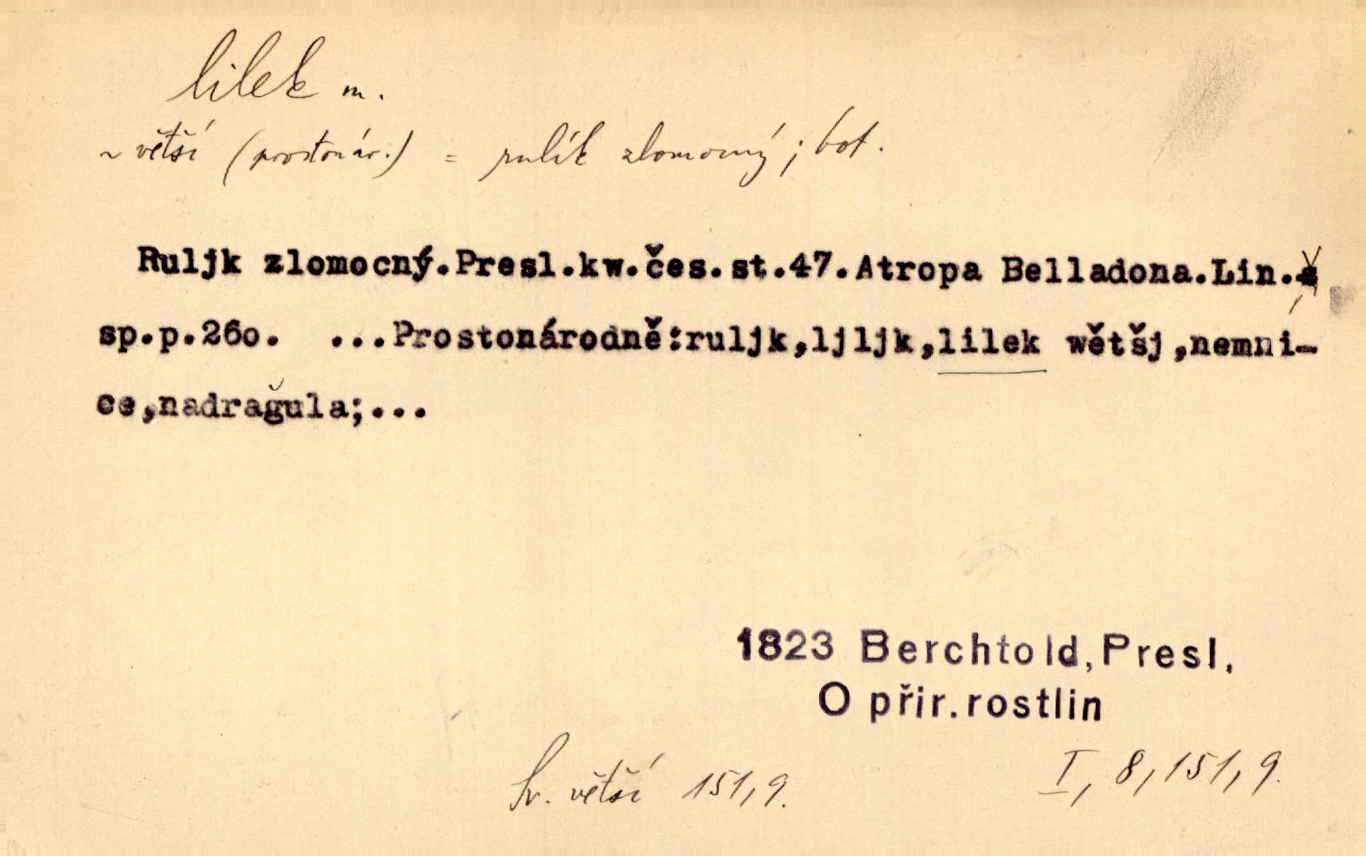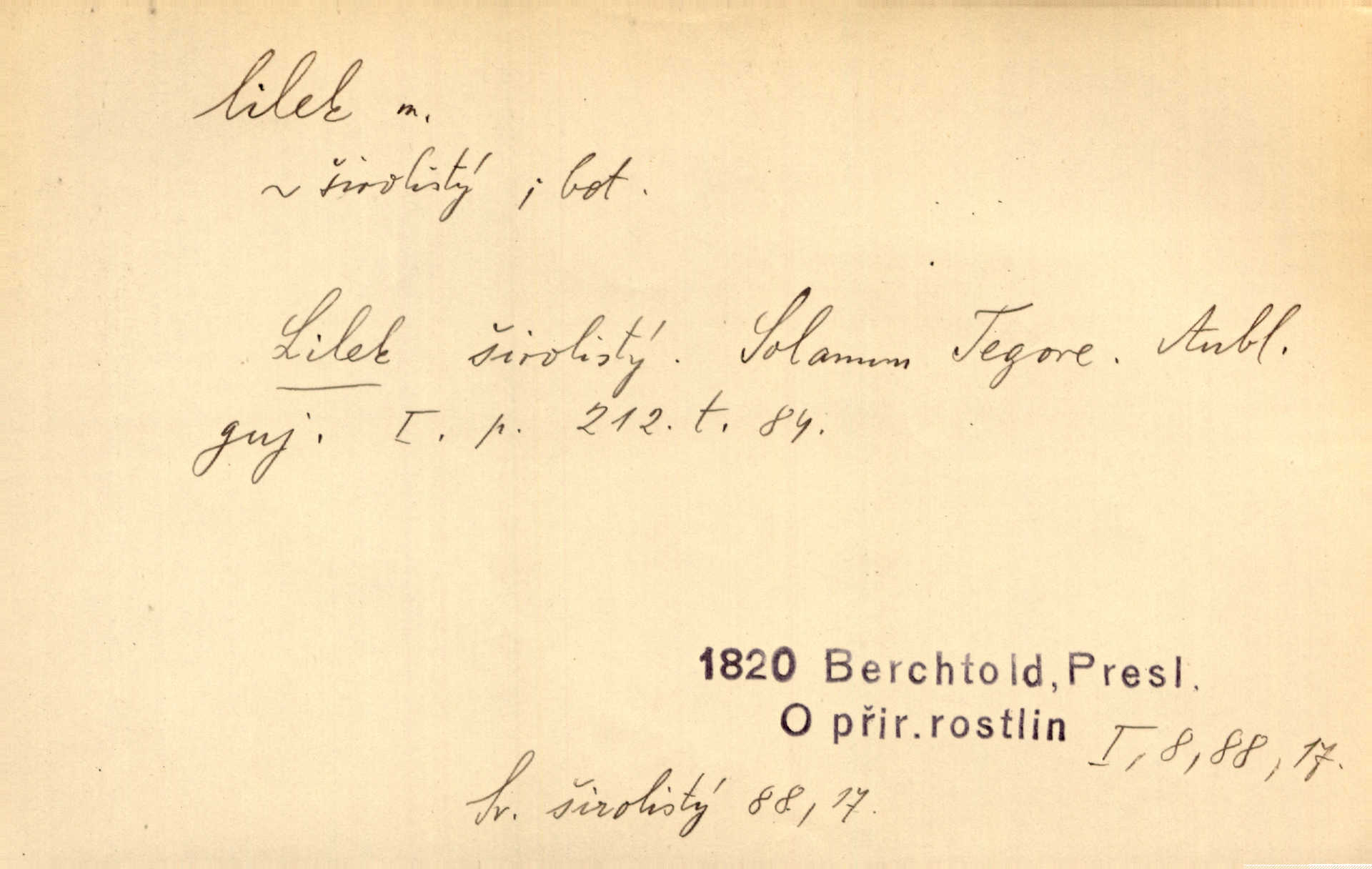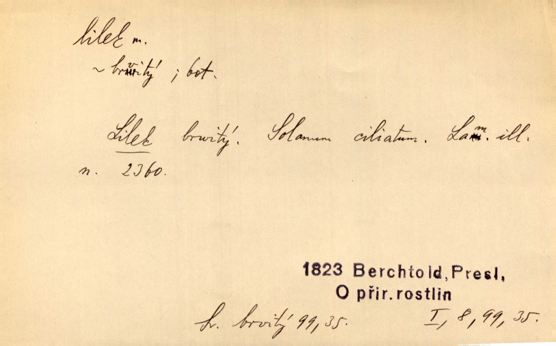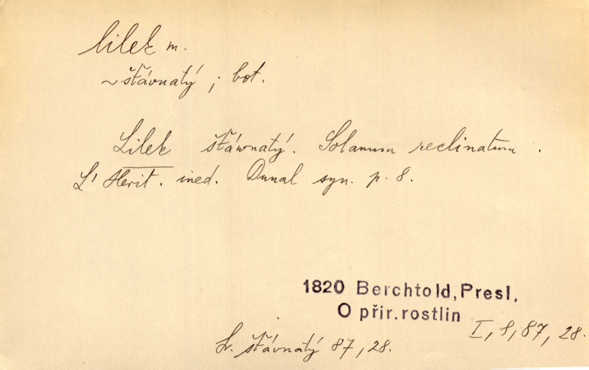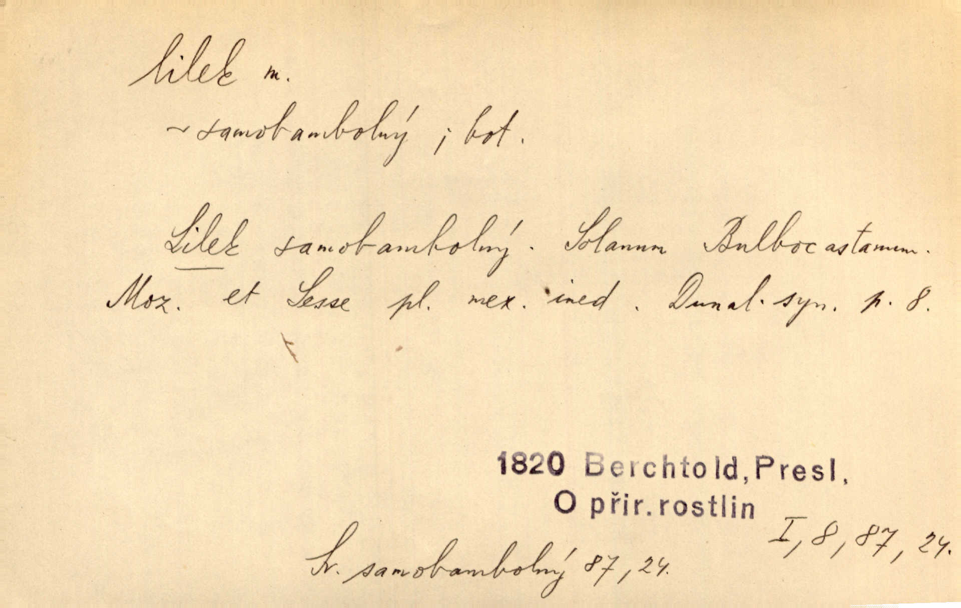 - lilek, -lku m. bot. rod rostlin z čeledi lilkovitých, Solanum. D Lid. narkotikum. Nebylo s ní řeči, zrovna jako by jí byl někdo lilku dal. Šmil. Což jsi se napil lilku, Krušino? třeštíš, zbláznil jsi se? Šmil.