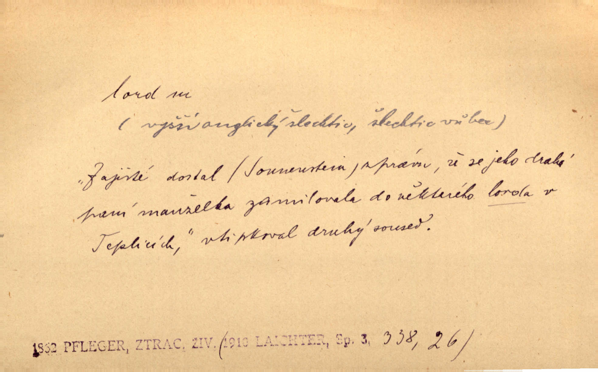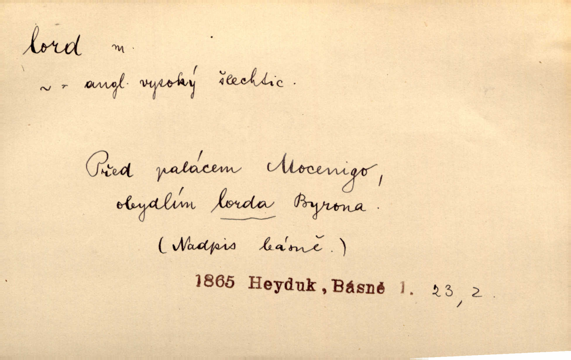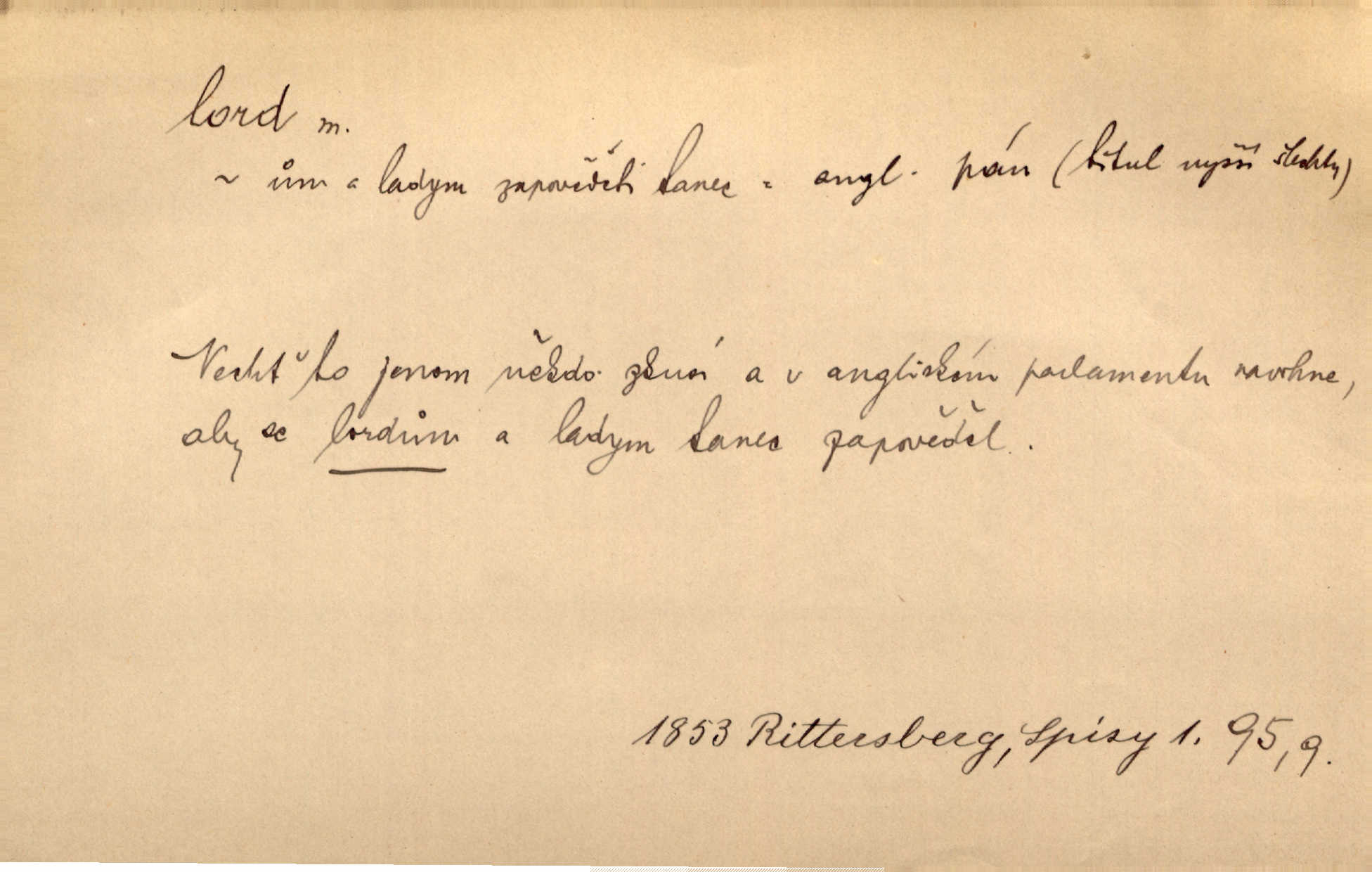 - lord, -a m. vyšší šlechtic, titul biskupa státní církve, starosty velkoměsta, soudního předsedy a některých vysokých úředníků ve Velké Britannii. Sněmovna lordů panská sněmovna, horní sněmovna ve Velké Britannii. Lord kancléř, lord admirality a j. V poledne odešel vyšňořený jako lord velmi. Lier. Druhý den kráčel Prahou zas již jako mladý lord sebevědomě. Herrm.