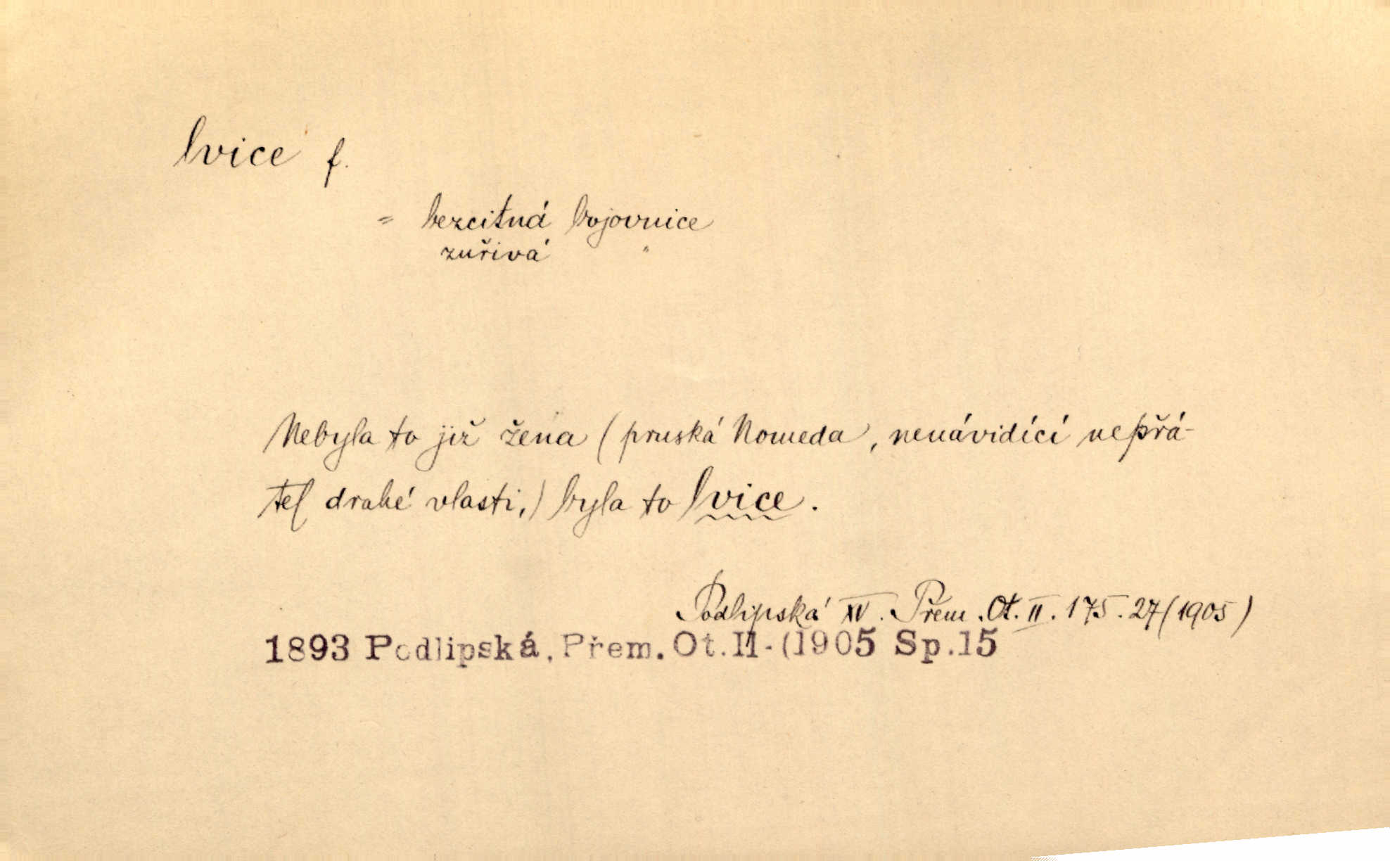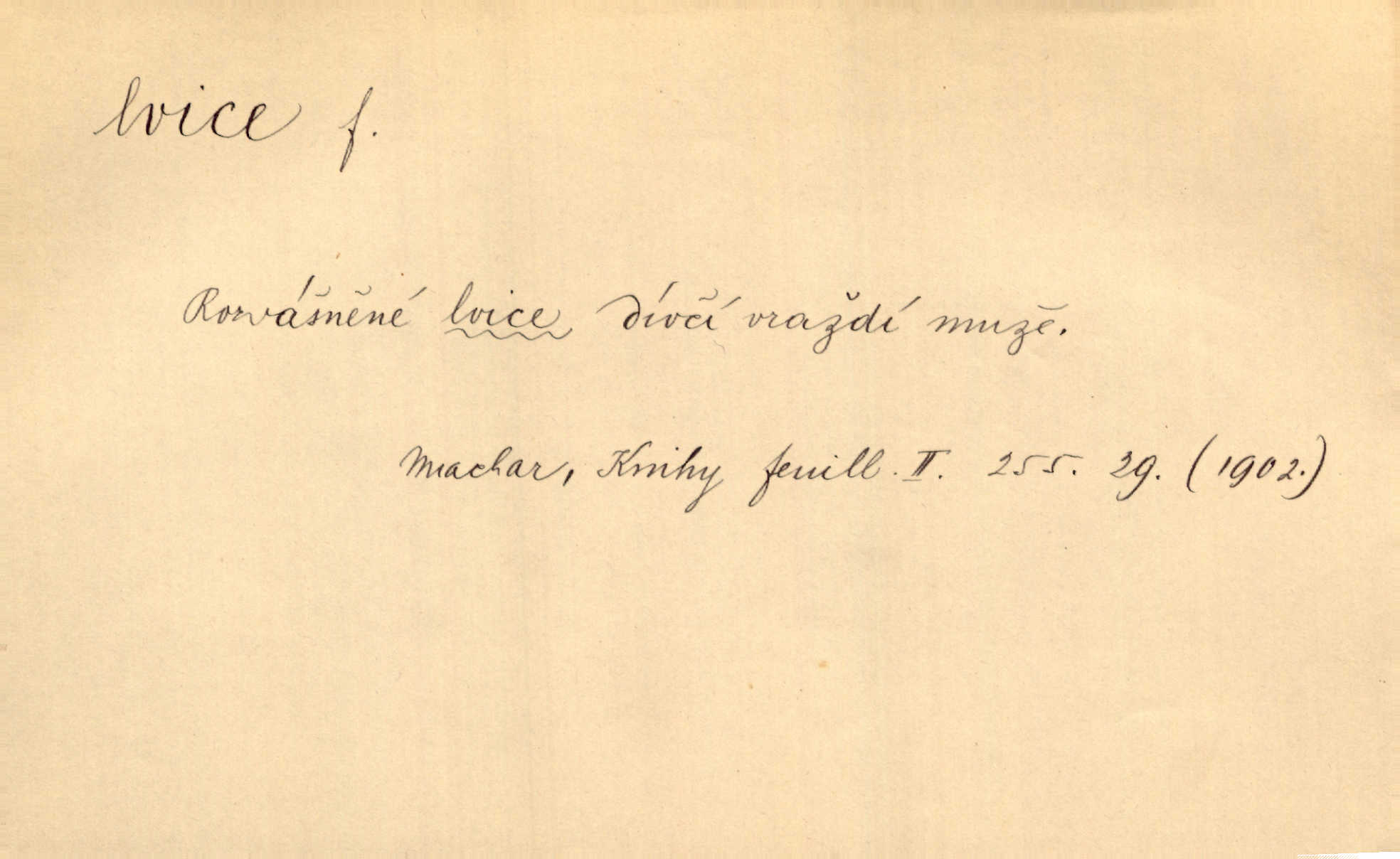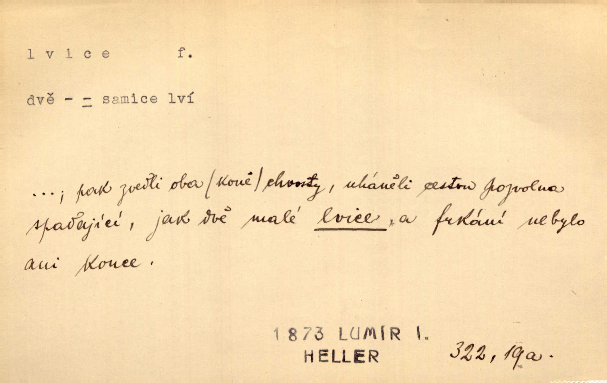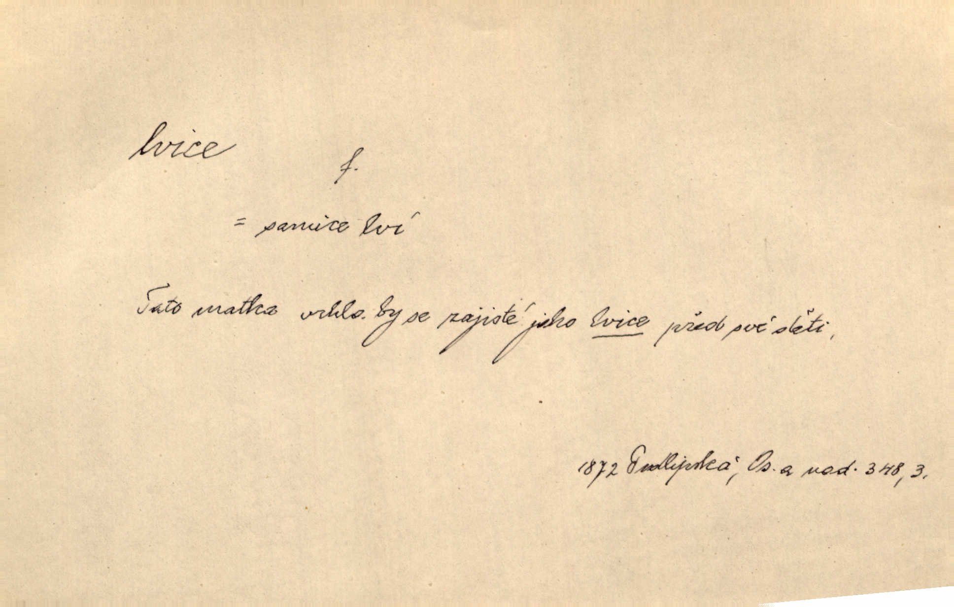 - lvice, -e f. k lev. V arabské poušti přiblížila se jednou lvice až k samým stanům jejího kmene. Zey. Tato matka vrhla by se jako lvice před své děti. Podl. Matka, podobna podrážděné lvici, tiskla kloučka k mohutným ňadrům. Maj. Milostpaní, královna města, lvice společnosti. Schein. Dvorně políbil jsi ruku jedné lvici salonů. Vrch.