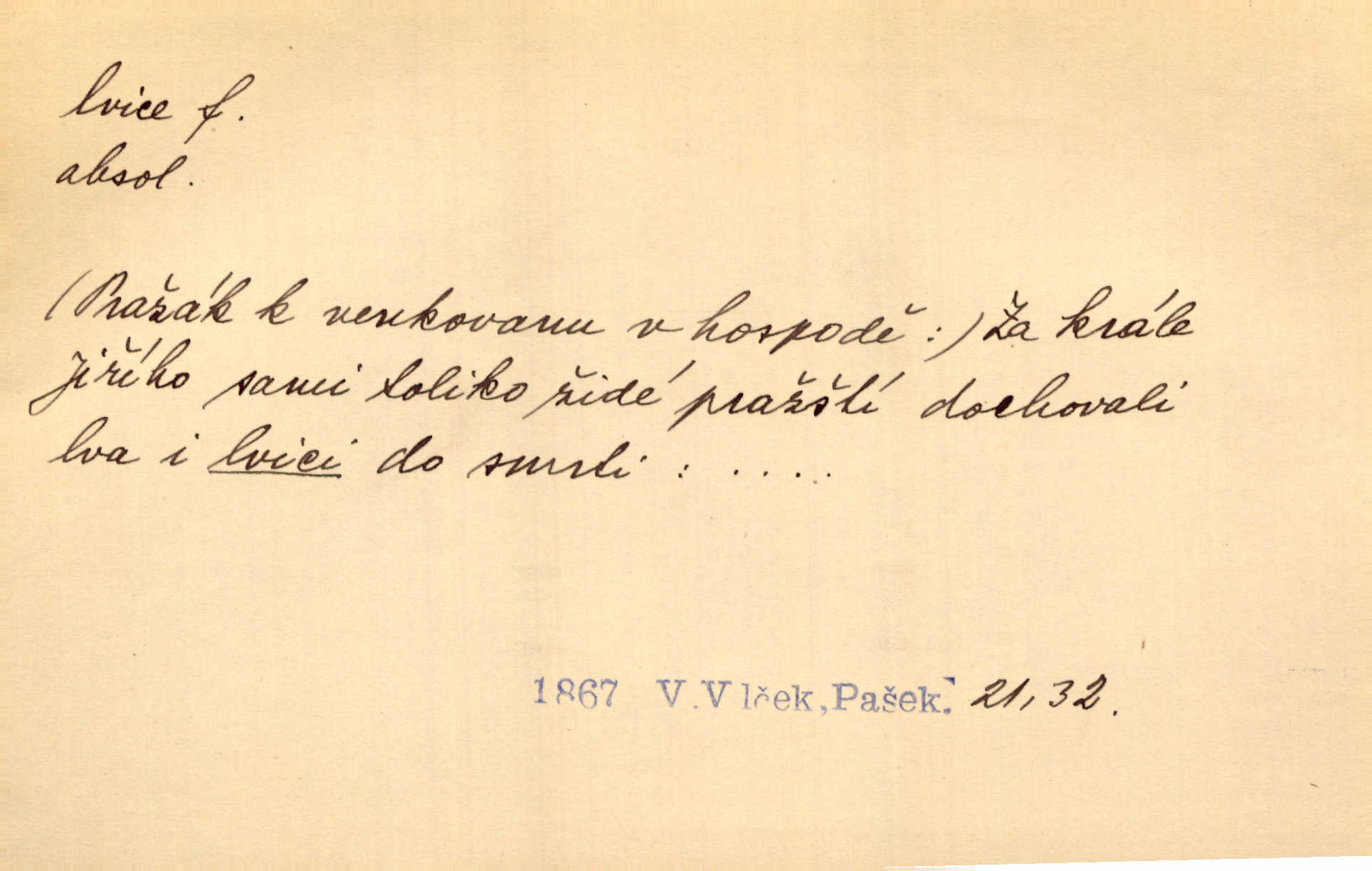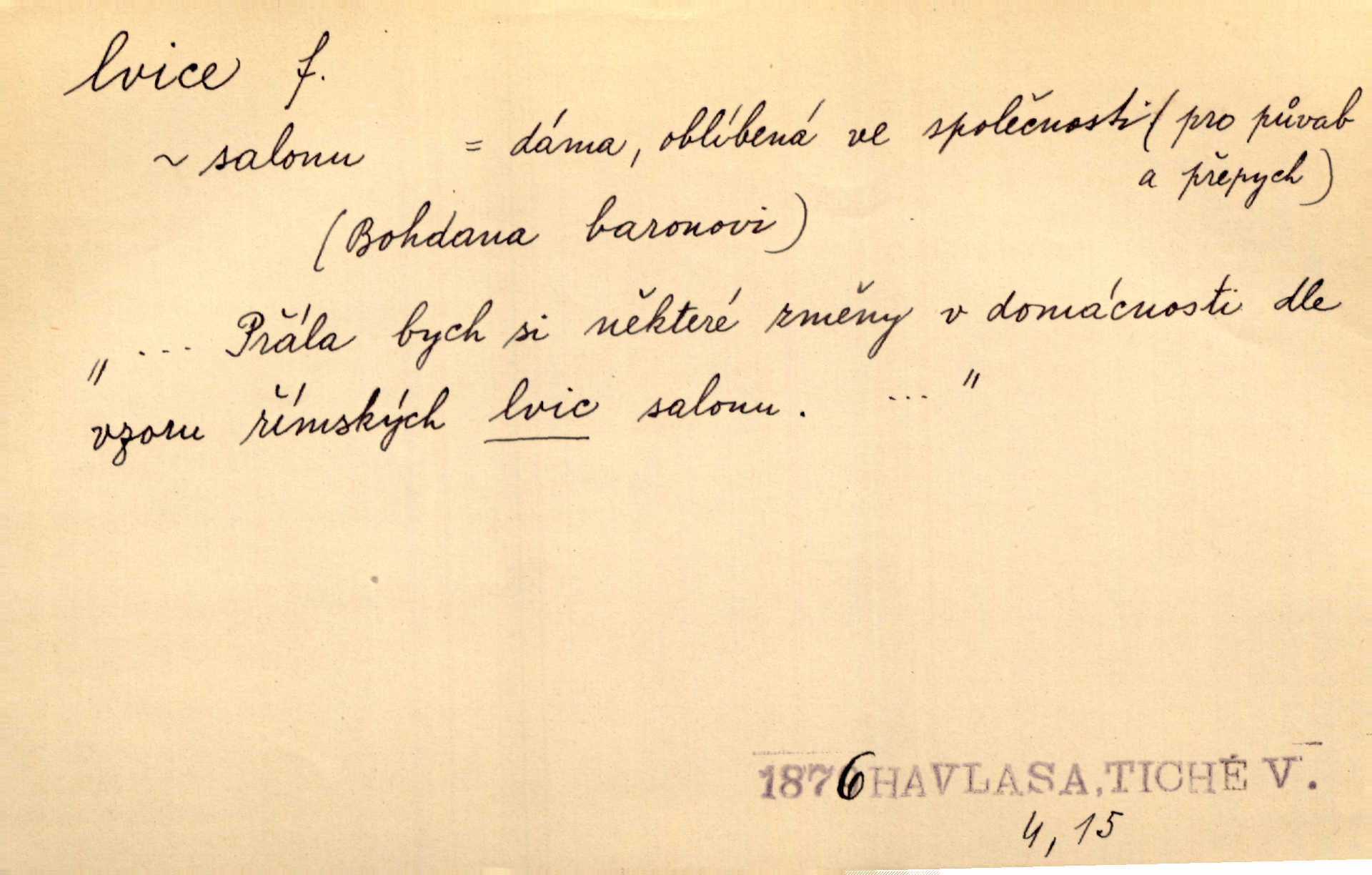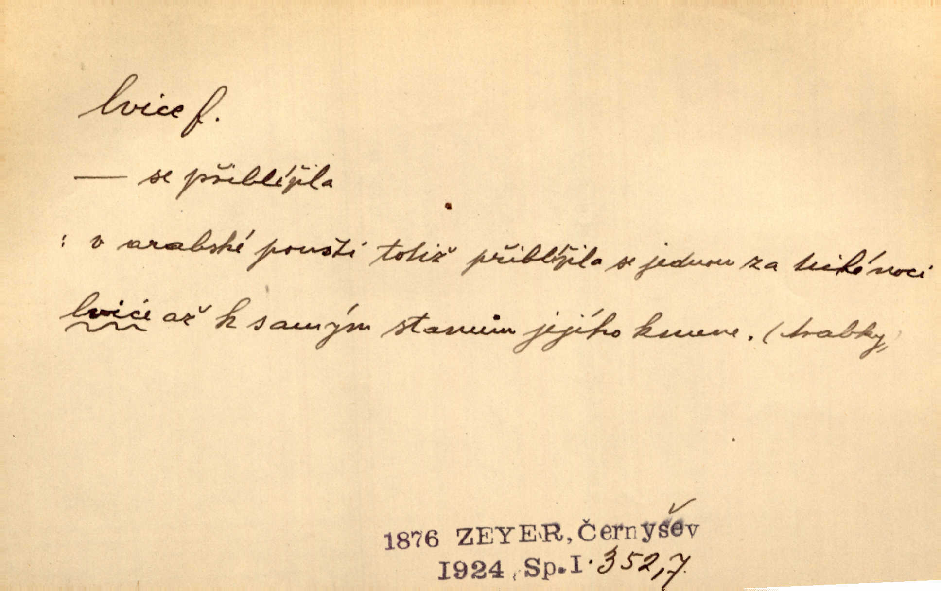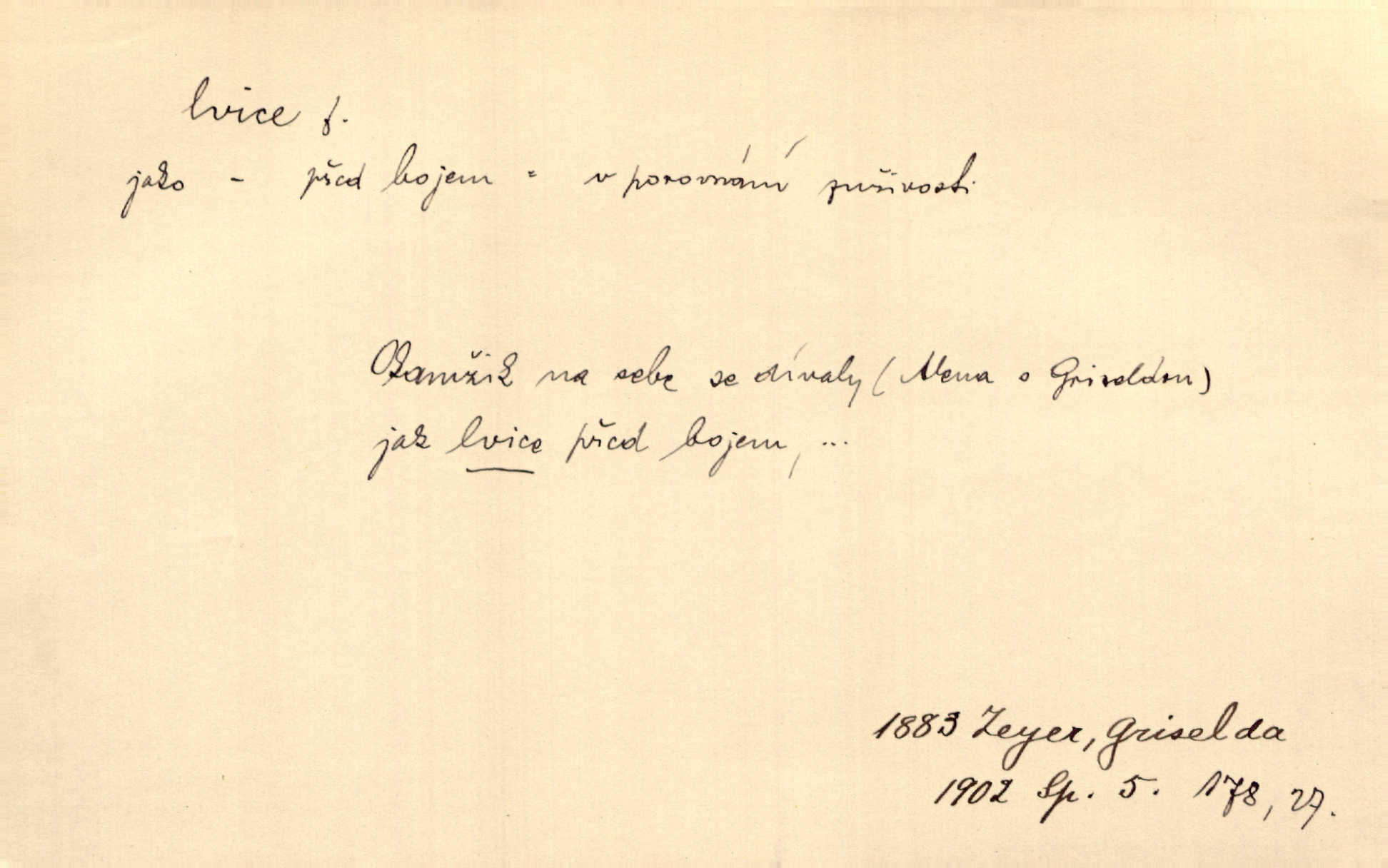 - lvice, -e f. k lev. V arabské poušti přiblížila se jednou lvice až k samým stanům jejího kmene. Zey. Tato matka vrhla by se jako lvice před své děti. Podl. Matka, podobna podrážděné lvici, tiskla kloučka k mohutným ňadrům. Maj. Milostpaní, královna města, lvice společnosti. Schein. Dvorně políbil jsi ruku jedné lvici salonů. Vrch.