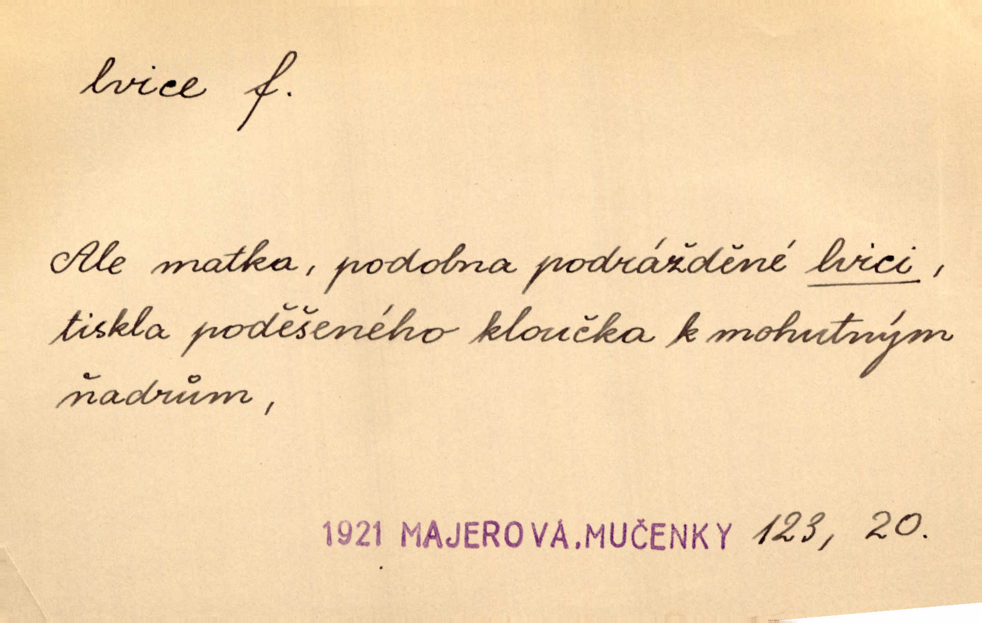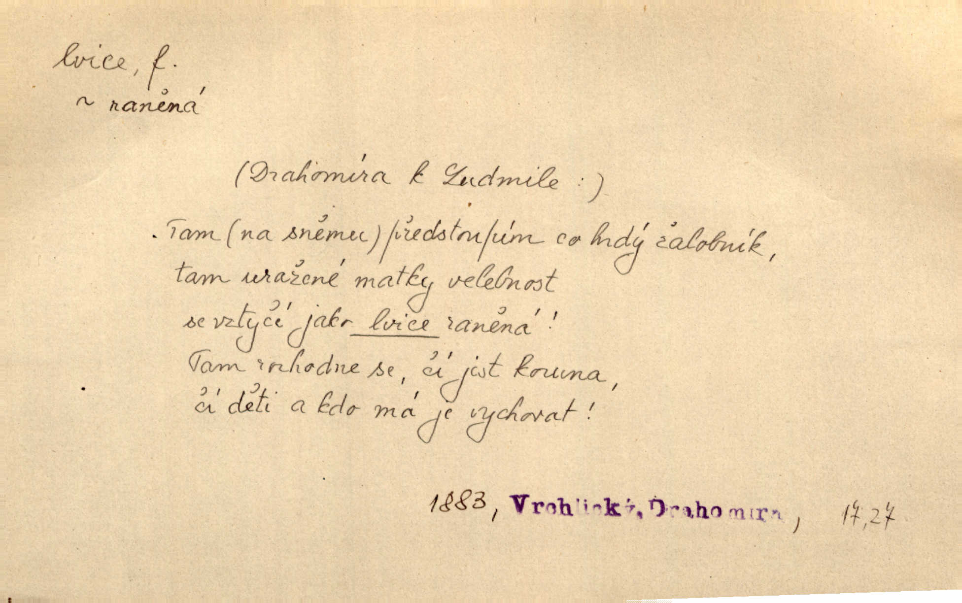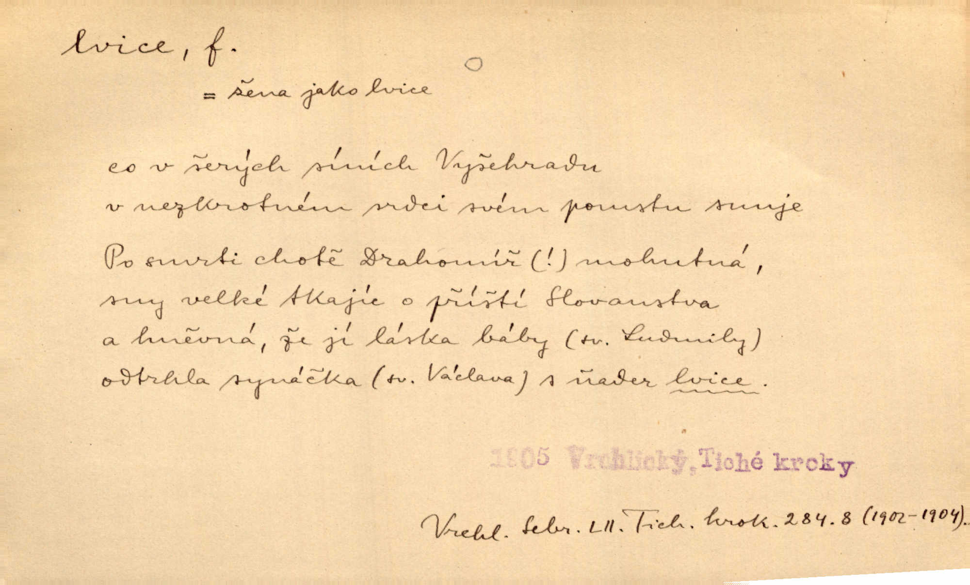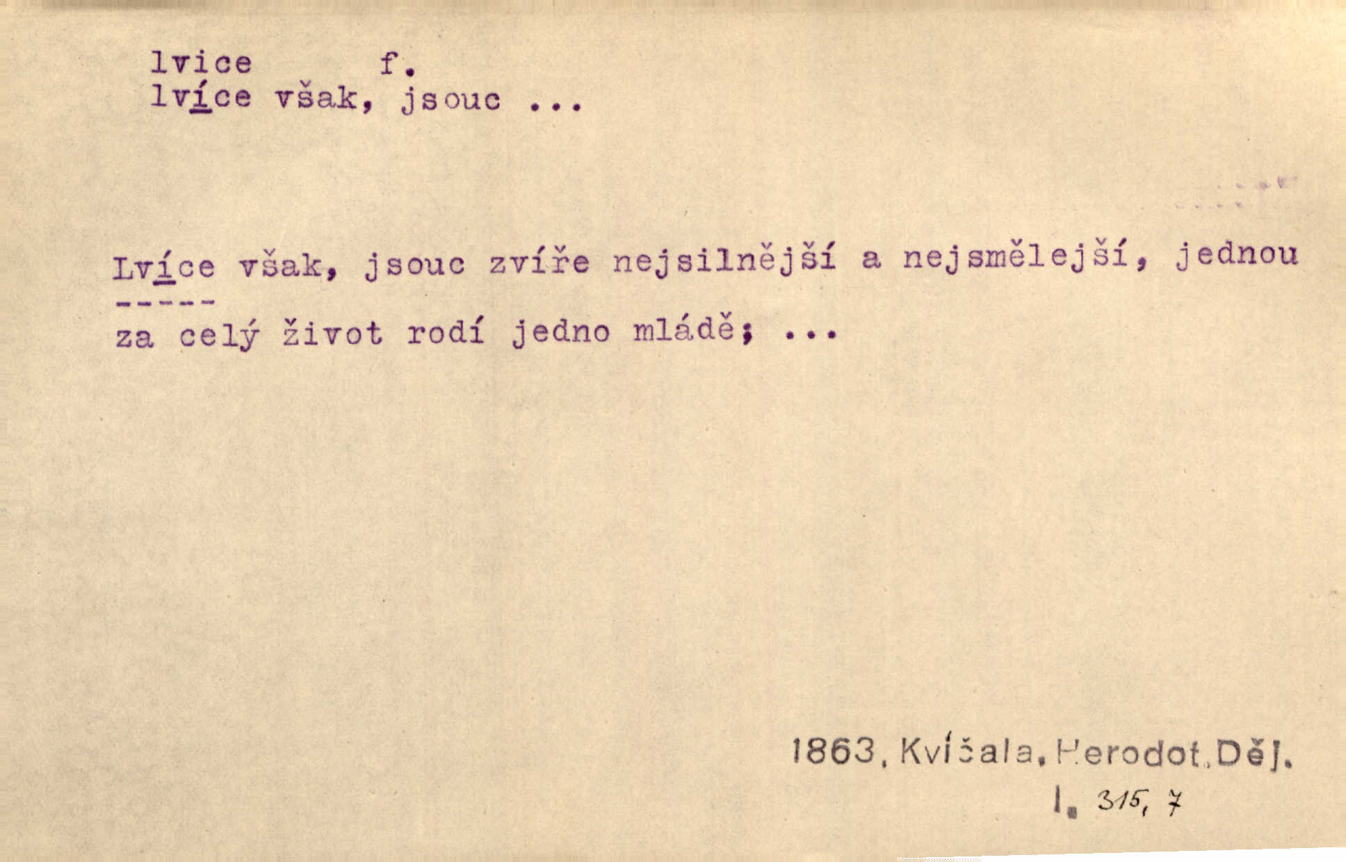 - lvice, -e f. k lev. V arabské poušti přiblížila se jednou lvice až k samým stanům jejího kmene. Zey. Tato matka vrhla by se jako lvice před své děti. Podl. Matka, podobna podrážděné lvici, tiskla kloučka k mohutným ňadrům. Maj. Milostpaní, královna města, lvice společnosti. Schein. Dvorně políbil jsi ruku jedné lvici salonů. Vrch.