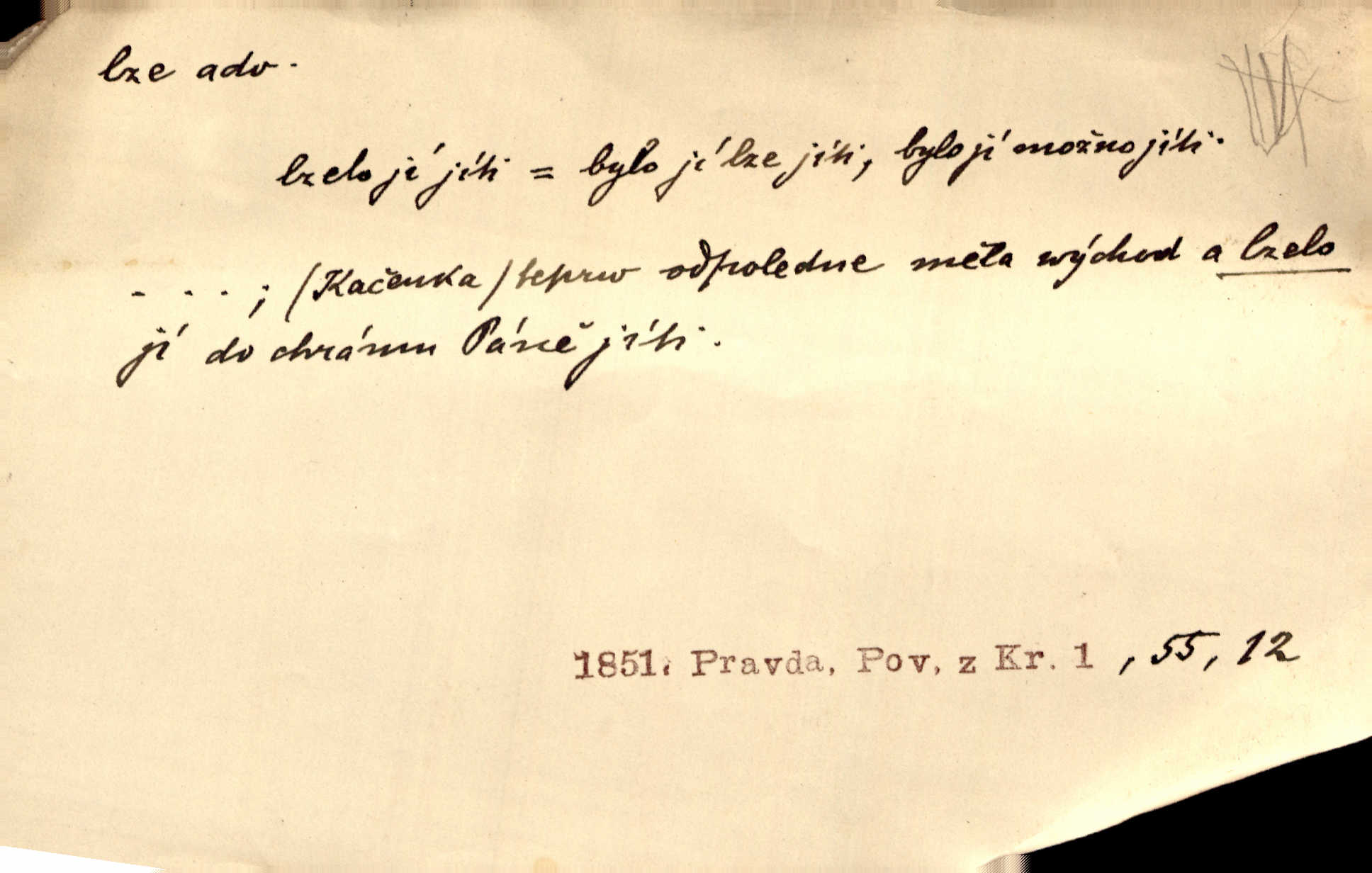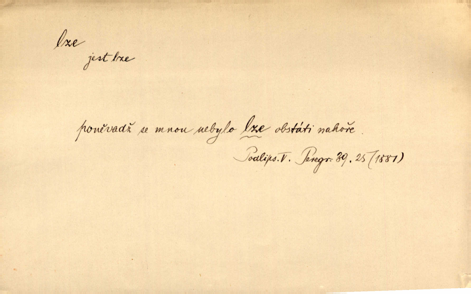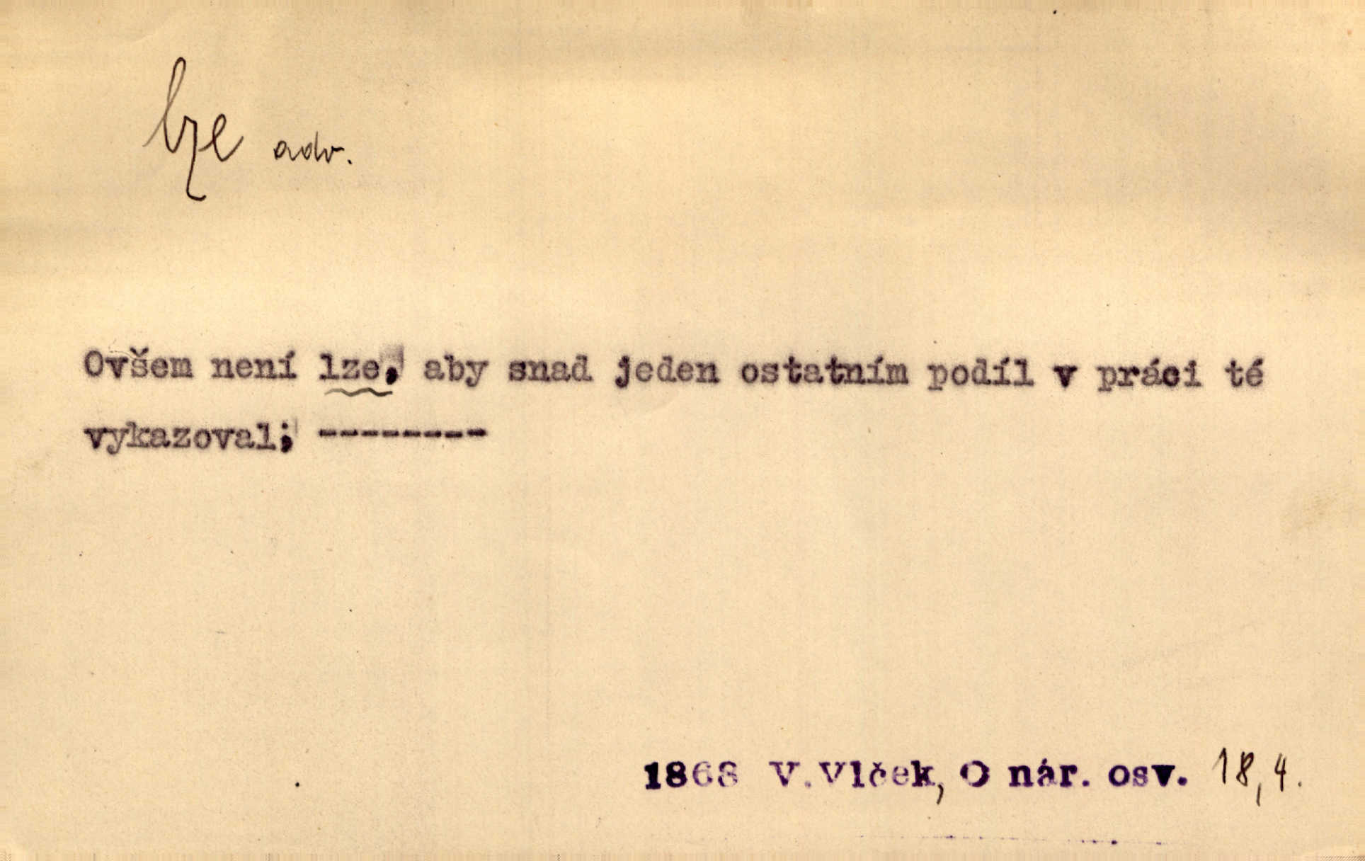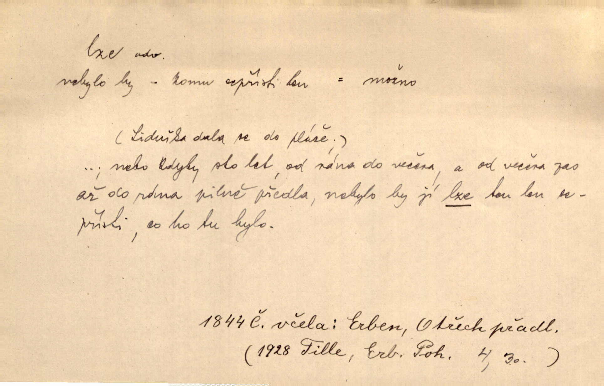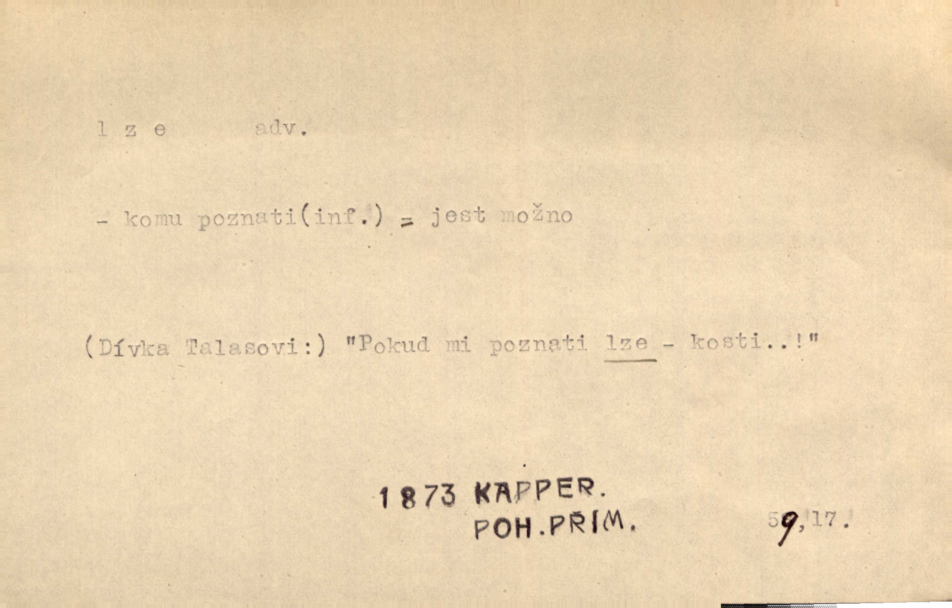- lze adv. možno. Jen s této stránky lze jest dějiny světové filosoficky pojímati. Šmil. Bylo lze slyšeti i tlumený polohlasitý hovor. Třeb. Horšího úrazu jim [Rakovnickým] učiniti nebylo lze. Win. Věděl [Kleofáš], kde lze ve městě nejlepší zboží nejlaciněji dostati. Šmil. Ovšem není lze, aby snad jeden ostatním podíl v práci té vykazoval. Vlč. Kdyby [Liduška] sto let, od rána do večera, a od večera zas až do rána pilně předla, nebylo by jí lze ten len sepřísti, co ho tu bylo. Erb.
