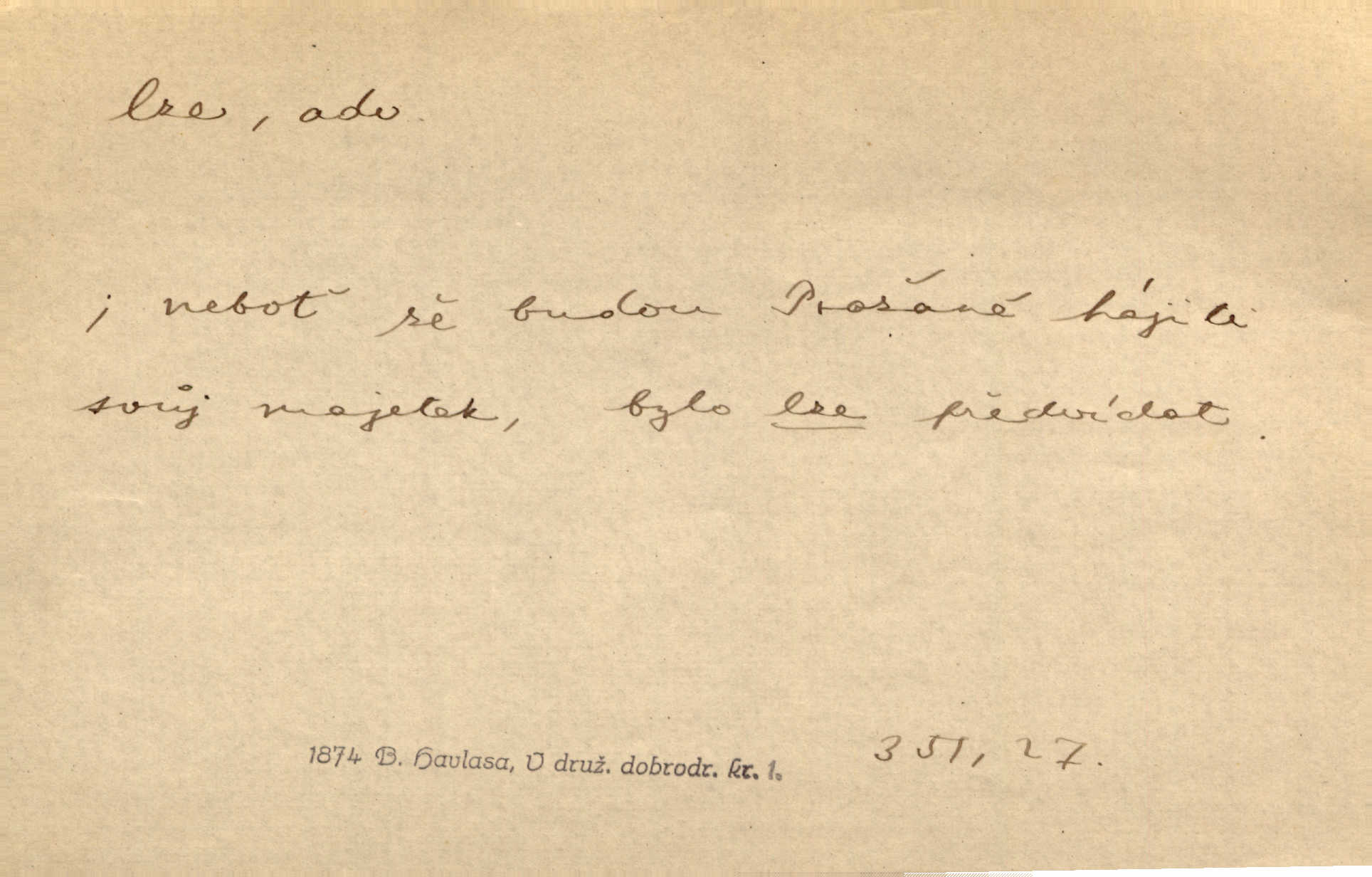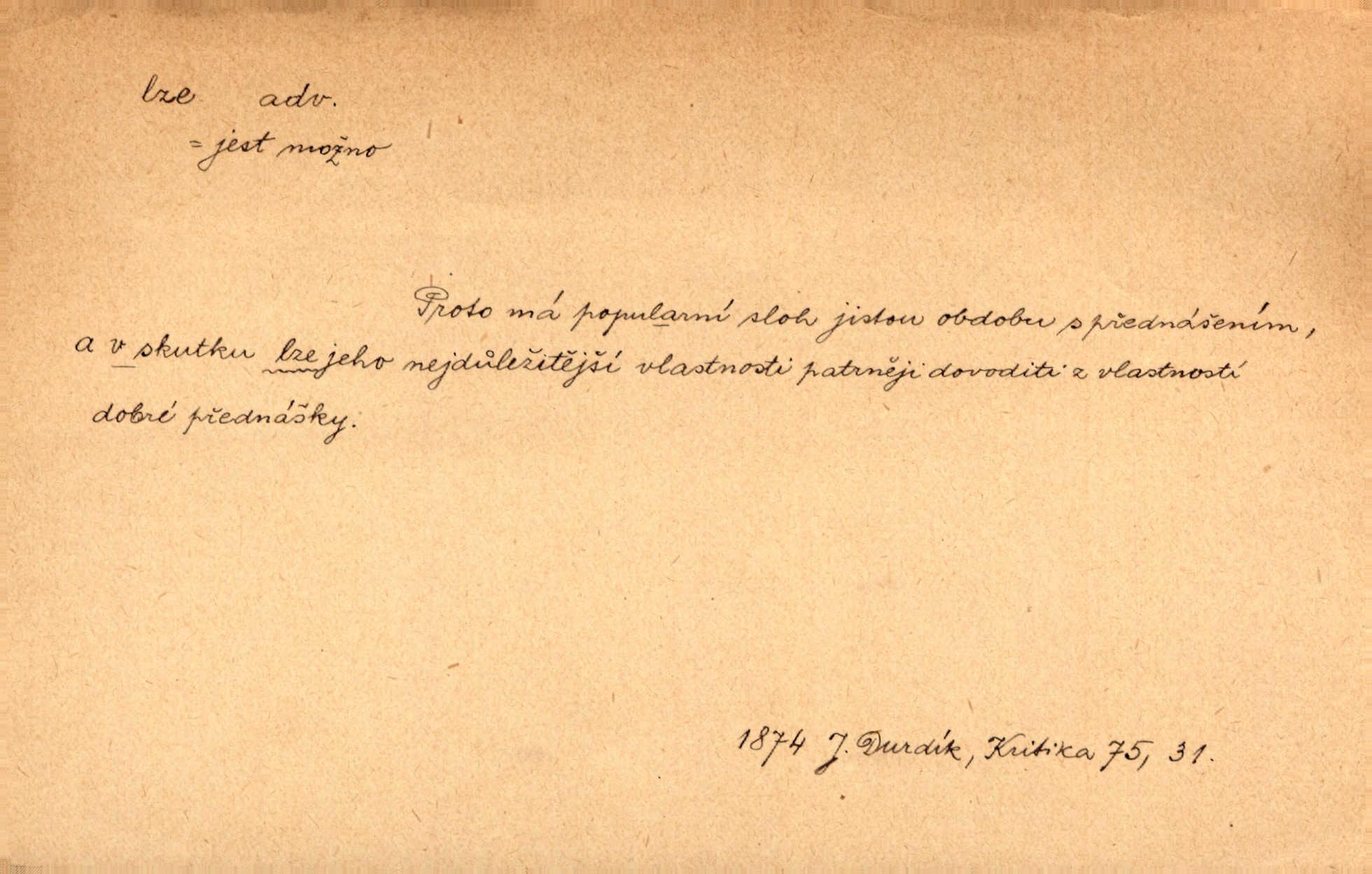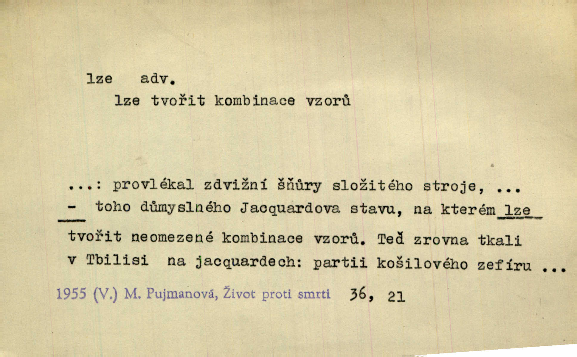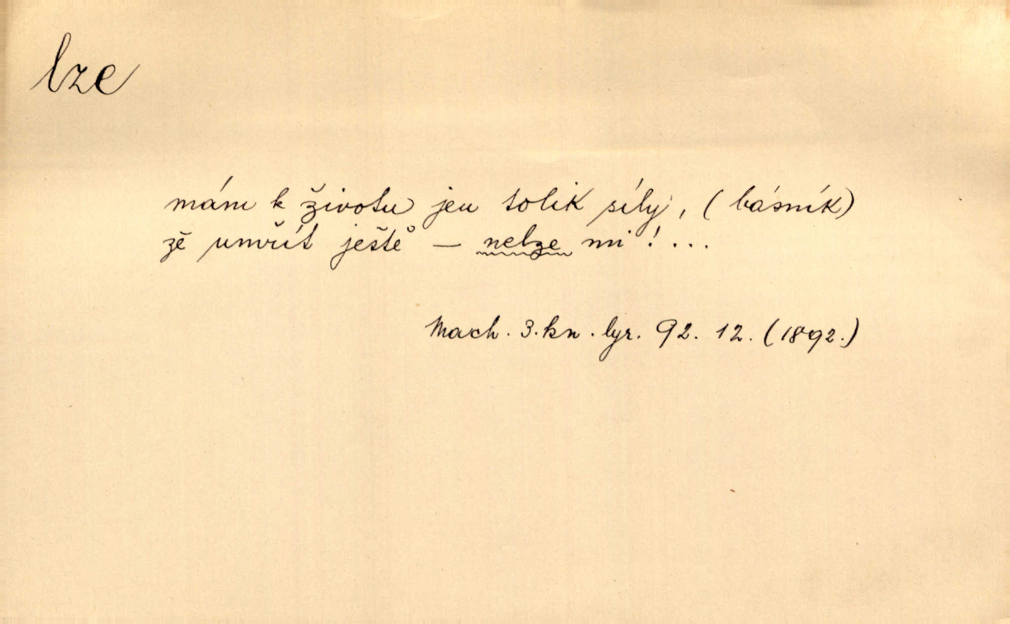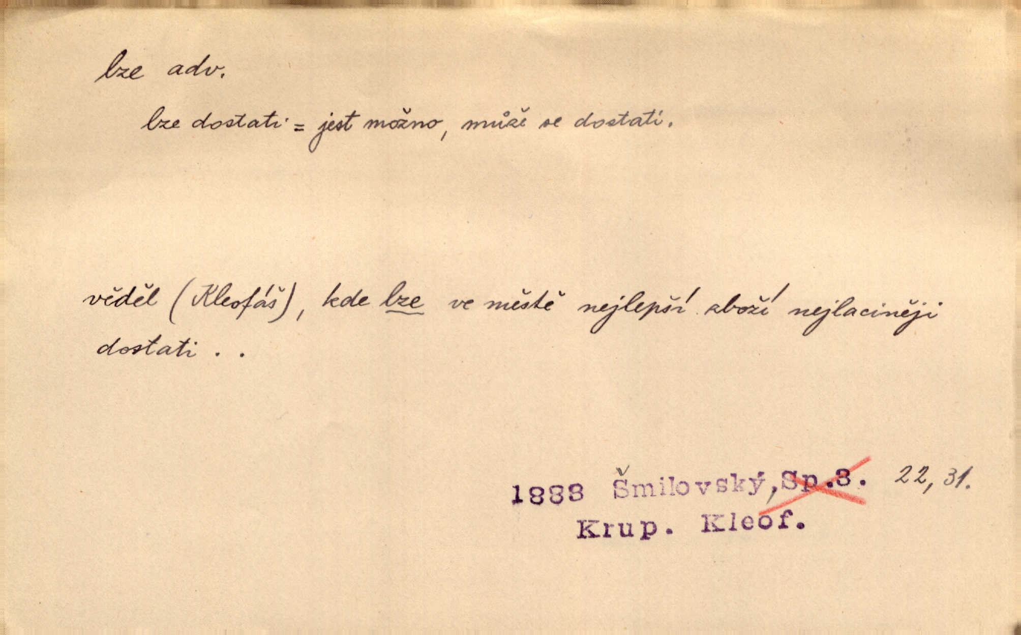 - lze adv. možno. Jen s této stránky lze jest dějiny světové filosoficky pojímati. Šmil. Bylo lze slyšeti i tlumený polohlasitý hovor. Třeb. Horšího úrazu jim [Rakovnickým] učiniti nebylo lze. Win. Věděl [Kleofáš], kde lze ve městě nejlepší zboží nejlaciněji dostati. Šmil. Ovšem není lze, aby snad jeden ostatním podíl v práci té vykazoval. Vlč. Kdyby [Liduška] sto let, od rána do večera, a od večera zas až do rána pilně předla, nebylo by jí lze ten len sepřísti, co ho tu bylo. Erb.