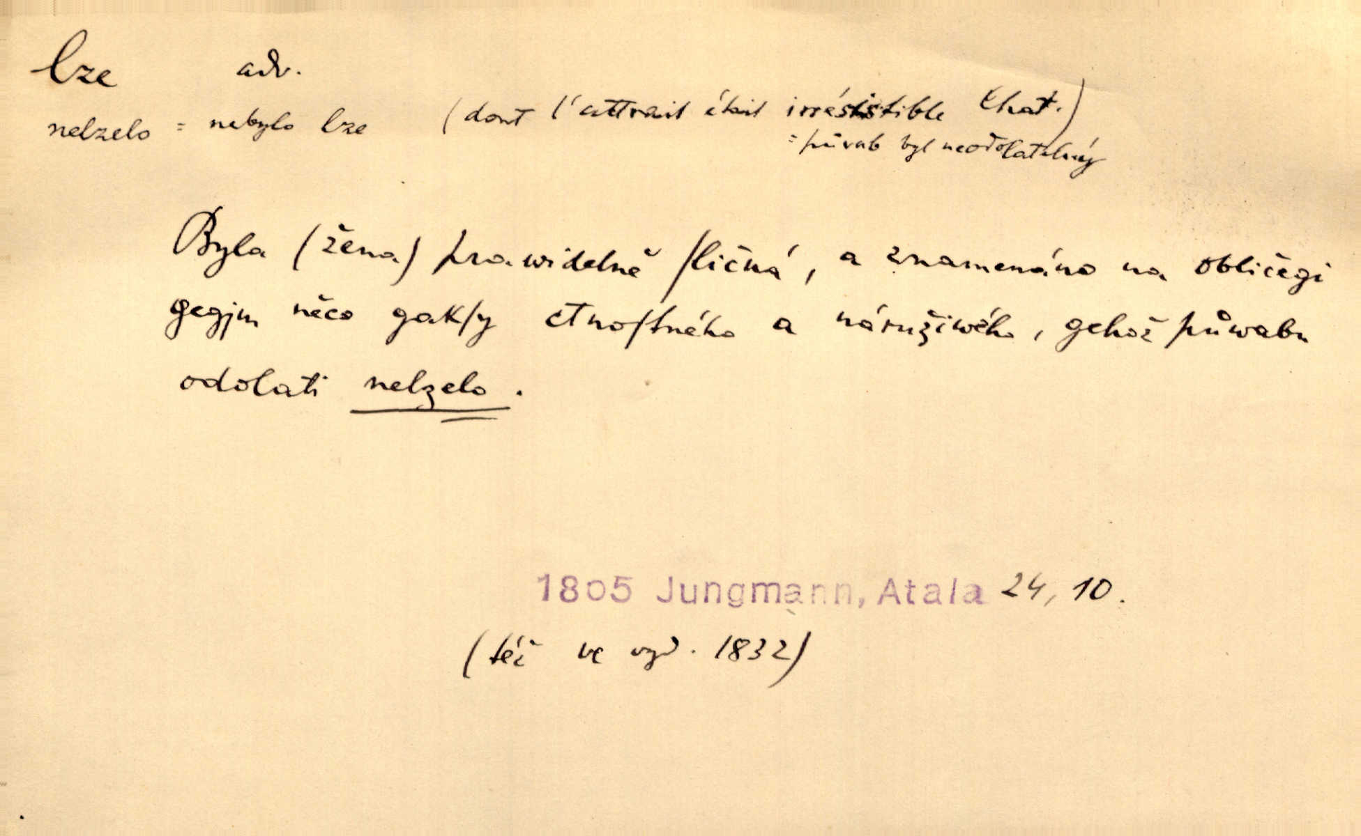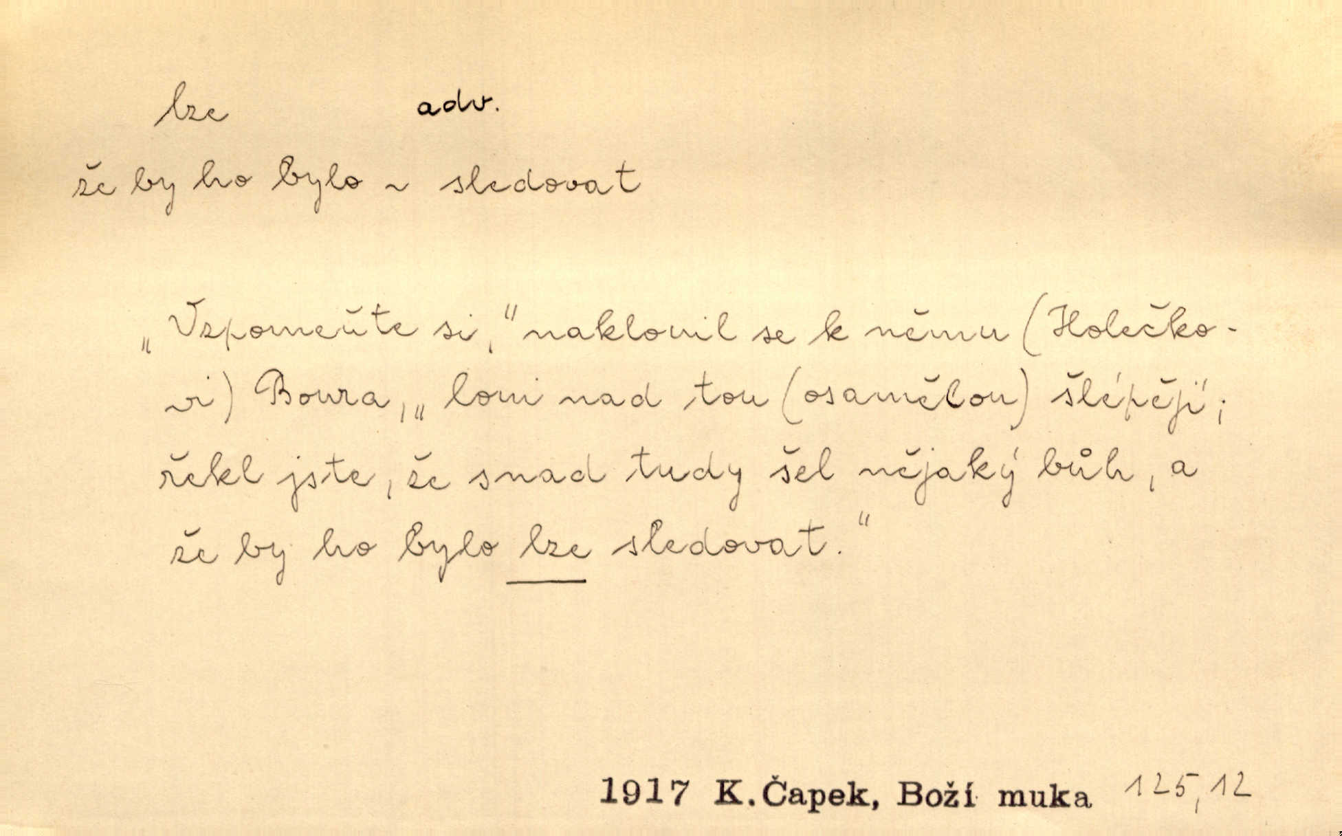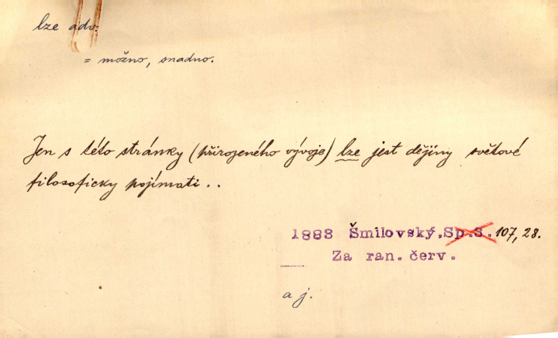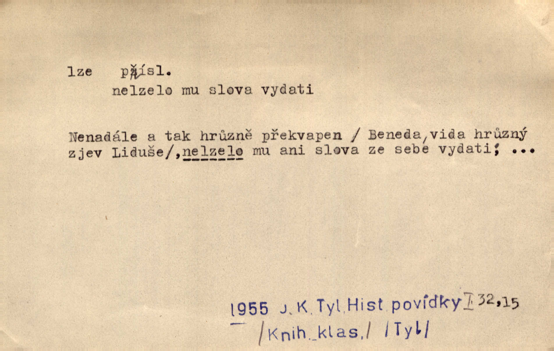 - lze adv. možno. Jen s této stránky lze jest dějiny světové filosoficky pojímati. Šmil. Bylo lze slyšeti i tlumený polohlasitý hovor. Třeb. Horšího úrazu jim [Rakovnickým] učiniti nebylo lze. Win. Věděl [Kleofáš], kde lze ve městě nejlepší zboží nejlaciněji dostati. Šmil. Ovšem není lze, aby snad jeden ostatním podíl v práci té vykazoval. Vlč. Kdyby [Liduška] sto let, od rána do večera, a od večera zas až do rána pilně předla, nebylo by jí lze ten len sepřísti, co ho tu bylo. Erb.