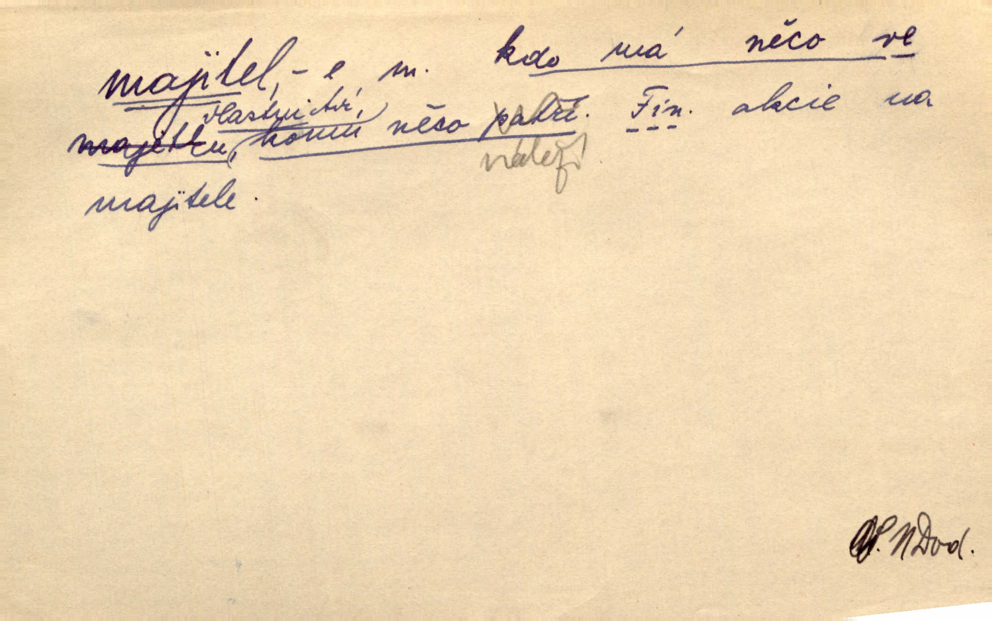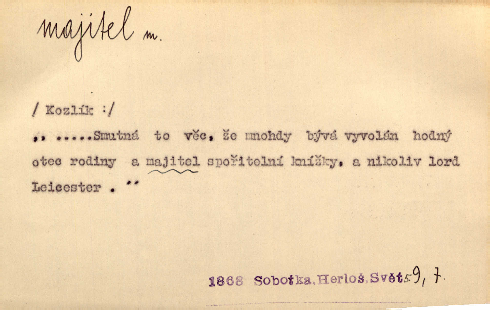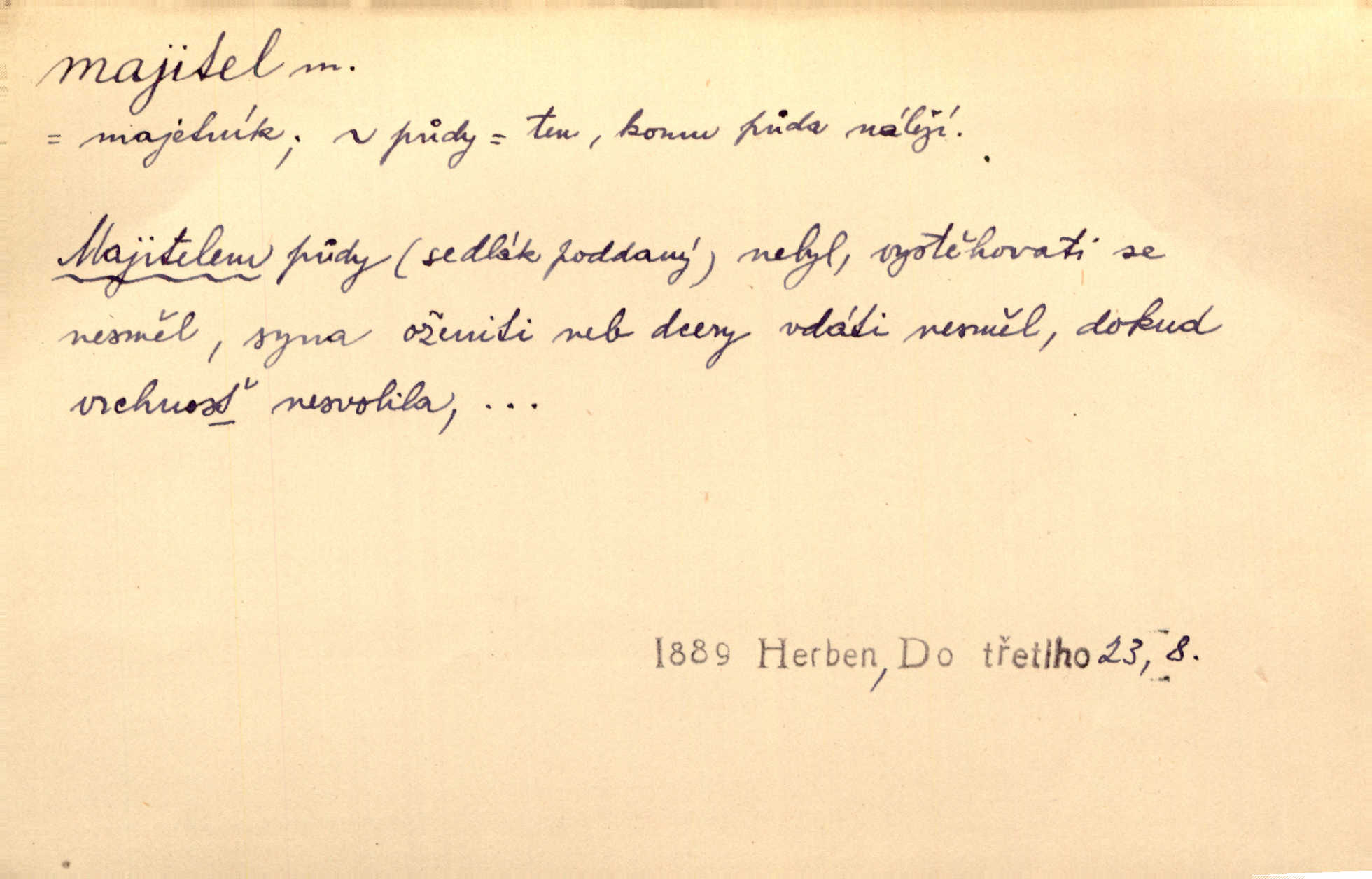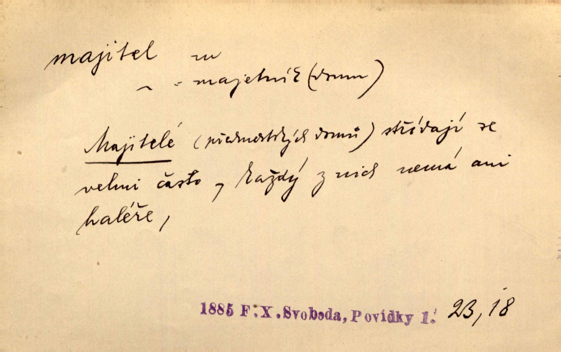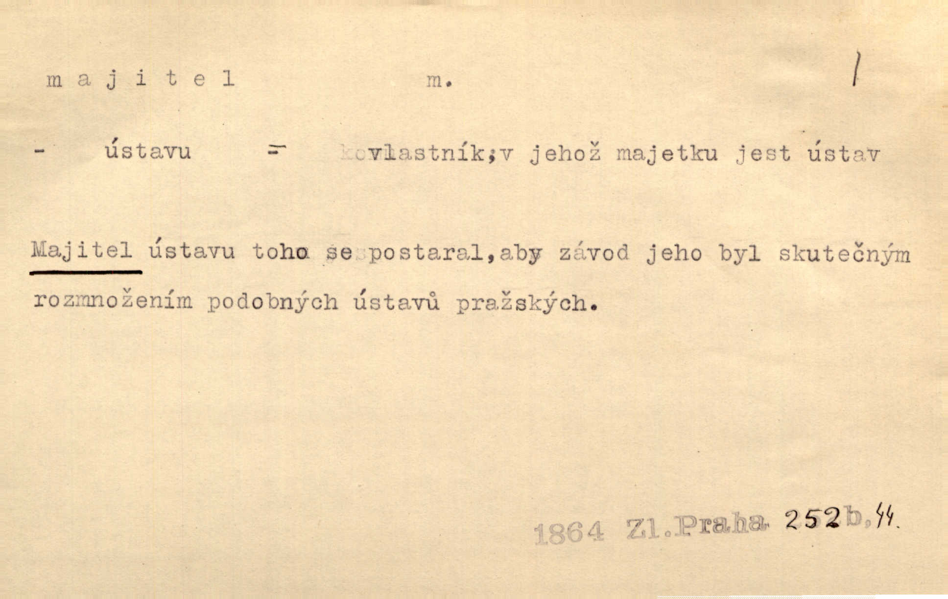 - majitel, -e m. kdo vládne nějakým právním majetkem, vlastník, držitel, majetník. Majitelem půdy [poddaný sedlák] nebyl. Herb. Majitelé skrovničkých usedlostí sotva že životem se protlukou. Havl. Majitel domu. Klenotnický krám, jehož majiteli, jak vím, není se starati o zítřejší večeři. Maj. Majitel skelných hutí. Preis. Majitel „Svobody“ J. Barák vzat do vyšetřování. Arb. Fin. akcie svědčící majiteli neznící na určité jméno, nýbrž náležející tomu, kdo ji právě má v držení. D kdo se honosí něčím znamenitým. Byl jmenován majitelem pražského 28. pluku. Mach. Majitel doktorského diplomu. Arb. Václav Nezmara, tříletý již majitel českého rekordu ve vzpírání těžkých břemen. Čap. Ch. Slovutný Lonský, majitel křesla v akademii. Čap. Ch. Žert. o držiteli něčeho třebas i obyčejného. Hádky súčastnil se i polesný, majitel útloboké ženy blondýnky. Staš. Zub vedl pořád svou [bolel]‚ takže ho jeho majitel konečně do želez dáti musel. Paleč. Neduhu zlého majitel. J. J. Kol.