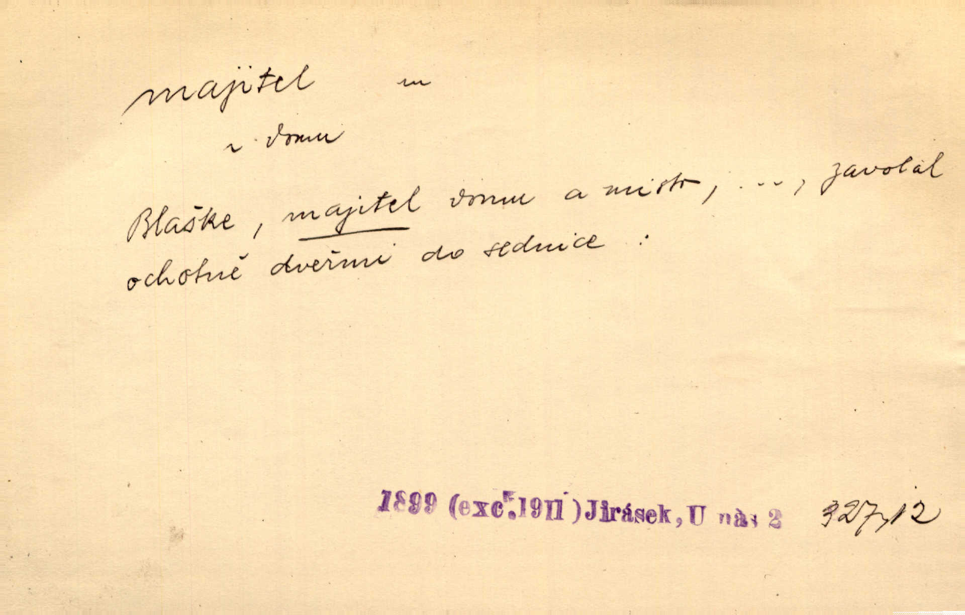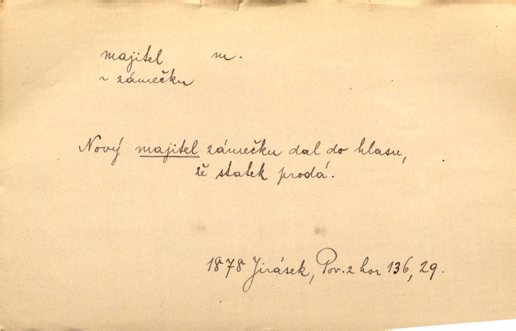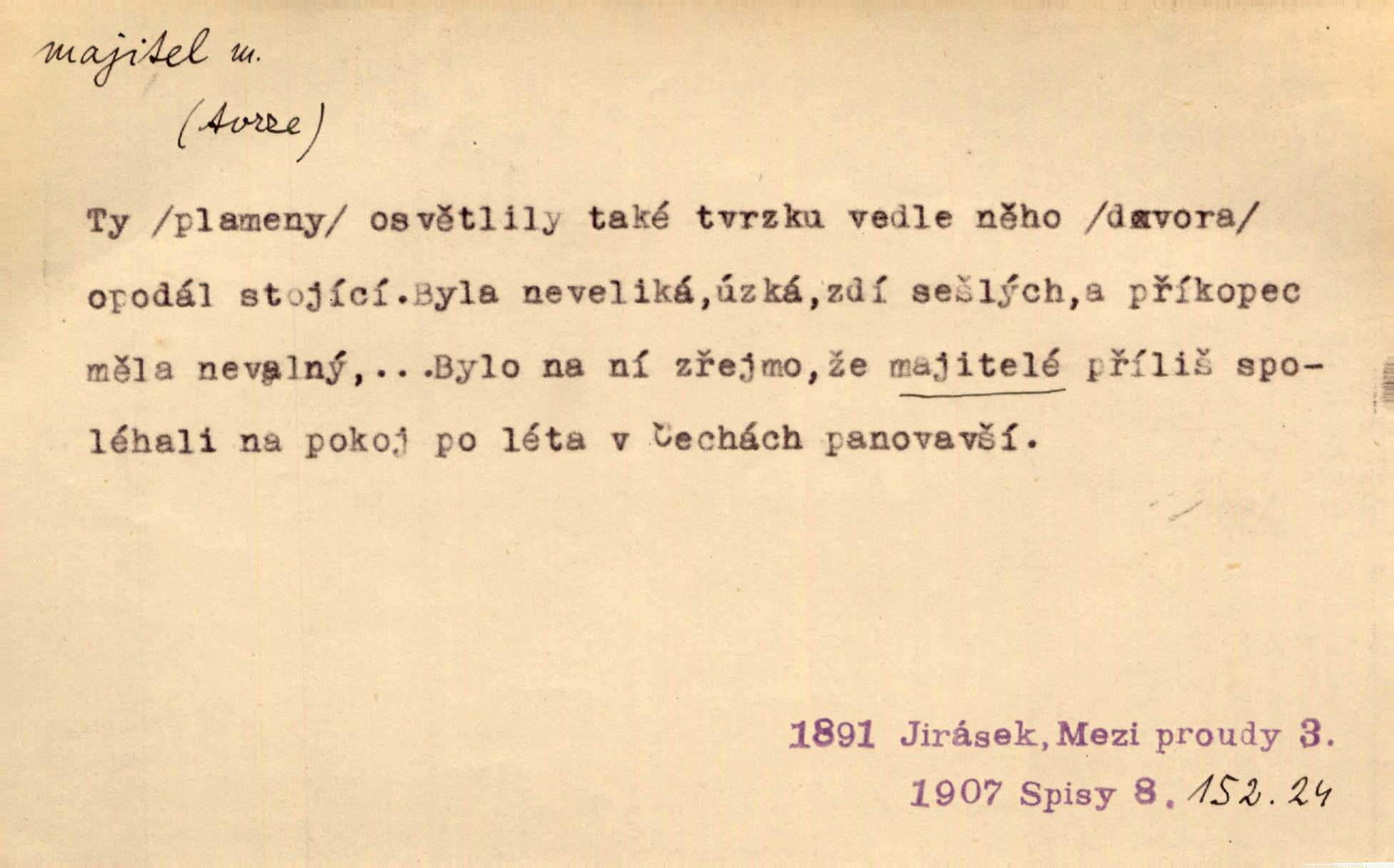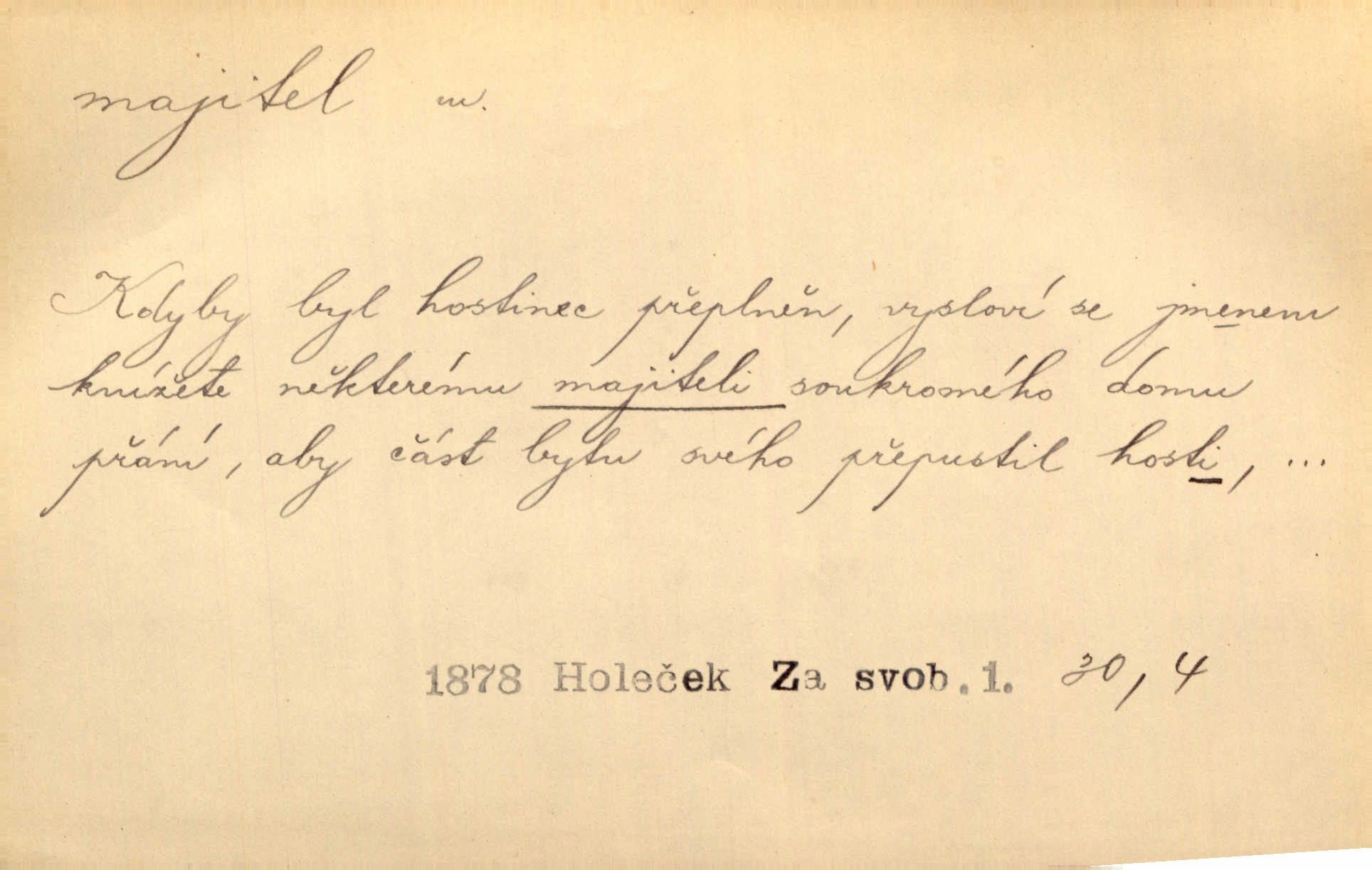 - majitel, -e m. kdo vládne nějakým právním majetkem, vlastník, držitel, majetník. Majitelem půdy [poddaný sedlák] nebyl. Herb. Majitelé skrovničkých usedlostí sotva že životem se protlukou. Havl. Majitel domu. Klenotnický krám, jehož majiteli, jak vím, není se starati o zítřejší večeři. Maj. Majitel skelných hutí. Preis. Majitel „Svobody“ J. Barák vzat do vyšetřování. Arb. Fin. akcie svědčící majiteli neznící na určité jméno, nýbrž náležející tomu, kdo ji právě má v držení. D kdo se honosí něčím znamenitým. Byl jmenován majitelem pražského 28. pluku. Mach. Majitel doktorského diplomu. Arb. Václav Nezmara, tříletý již majitel českého rekordu ve vzpírání těžkých břemen. Čap. Ch. Slovutný Lonský, majitel křesla v akademii. Čap. Ch. Žert. o držiteli něčeho třebas i obyčejného. Hádky súčastnil se i polesný, majitel útloboké ženy blondýnky. Staš. Zub vedl pořád svou [bolel]‚ takže ho jeho majitel konečně do želez dáti musel. Paleč. Neduhu zlého majitel. J. J. Kol.