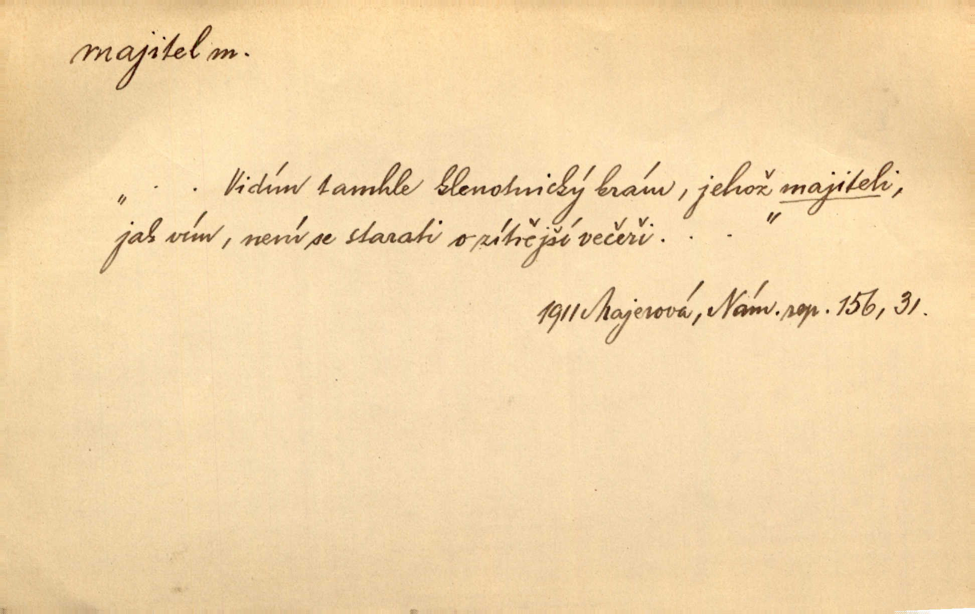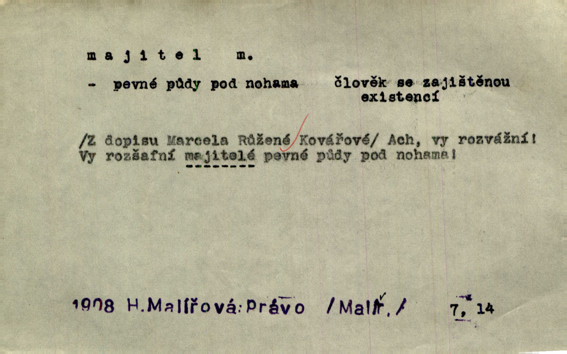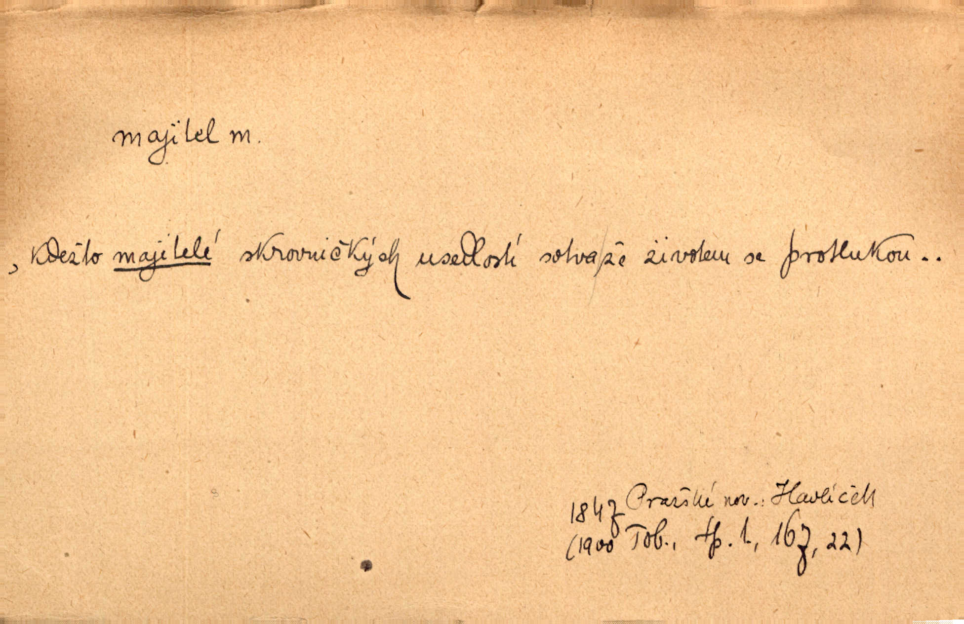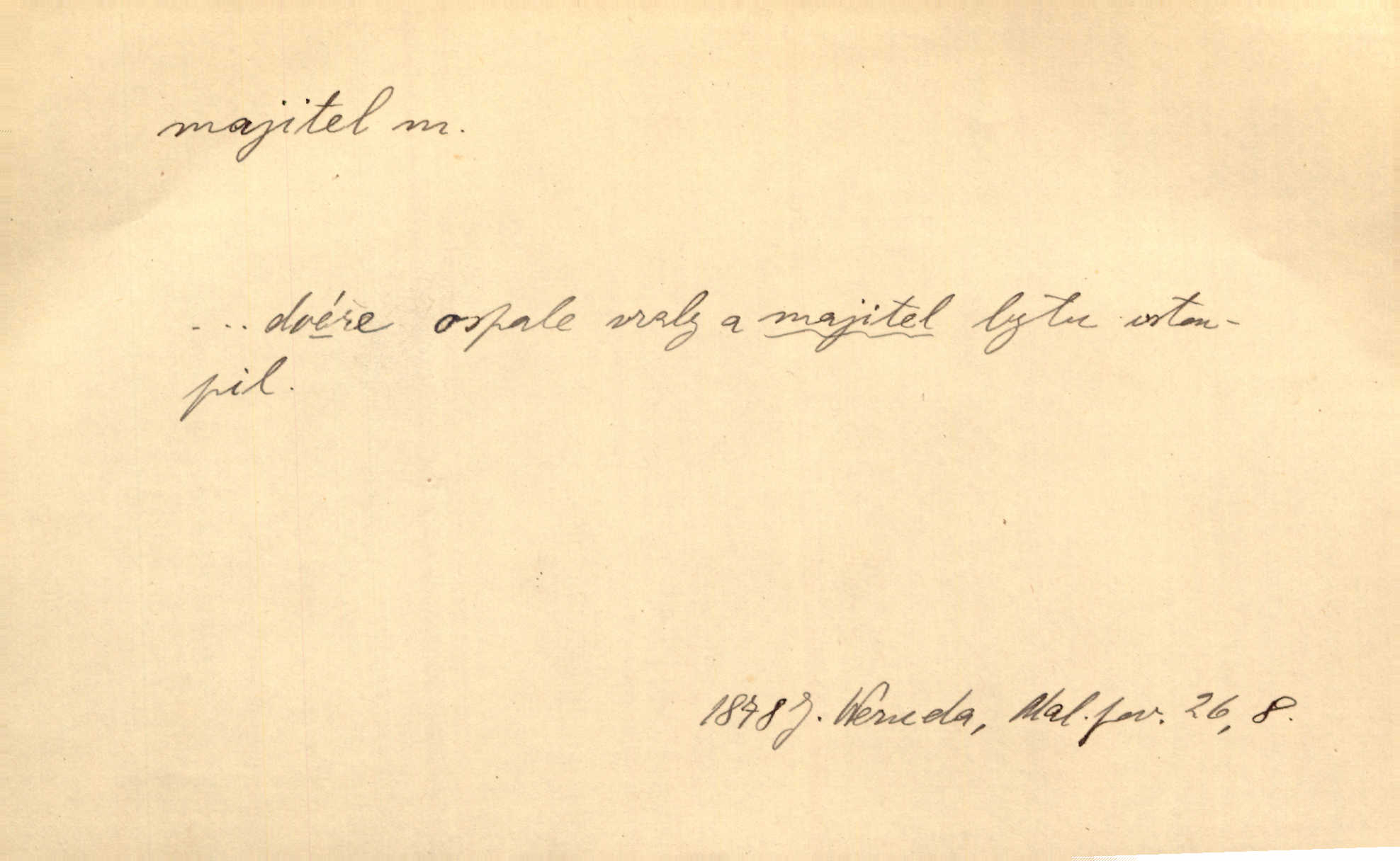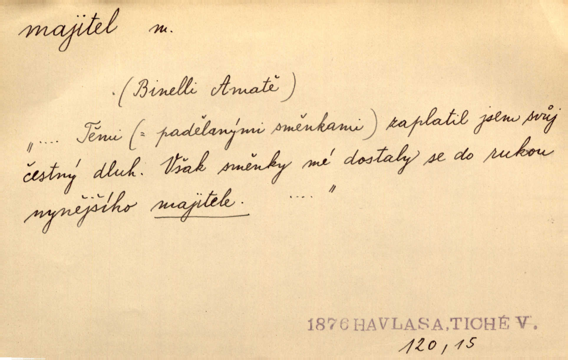 - majitel, -e m. kdo vládne nějakým právním majetkem, vlastník, držitel, majetník. Majitelem půdy [poddaný sedlák] nebyl. Herb. Majitelé skrovničkých usedlostí sotva že životem se protlukou. Havl. Majitel domu. Klenotnický krám, jehož majiteli, jak vím, není se starati o zítřejší večeři. Maj. Majitel skelných hutí. Preis. Majitel „Svobody“ J. Barák vzat do vyšetřování. Arb. Fin. akcie svědčící majiteli neznící na určité jméno, nýbrž náležející tomu, kdo ji právě má v držení. D kdo se honosí něčím znamenitým. Byl jmenován majitelem pražského 28. pluku. Mach. Majitel doktorského diplomu. Arb. Václav Nezmara, tříletý již majitel českého rekordu ve vzpírání těžkých břemen. Čap. Ch. Slovutný Lonský, majitel křesla v akademii. Čap. Ch. Žert. o držiteli něčeho třebas i obyčejného. Hádky súčastnil se i polesný, majitel útloboké ženy blondýnky. Staš. Zub vedl pořád svou [bolel]‚ takže ho jeho majitel konečně do želez dáti musel. Paleč. Neduhu zlého majitel. J. J. Kol.