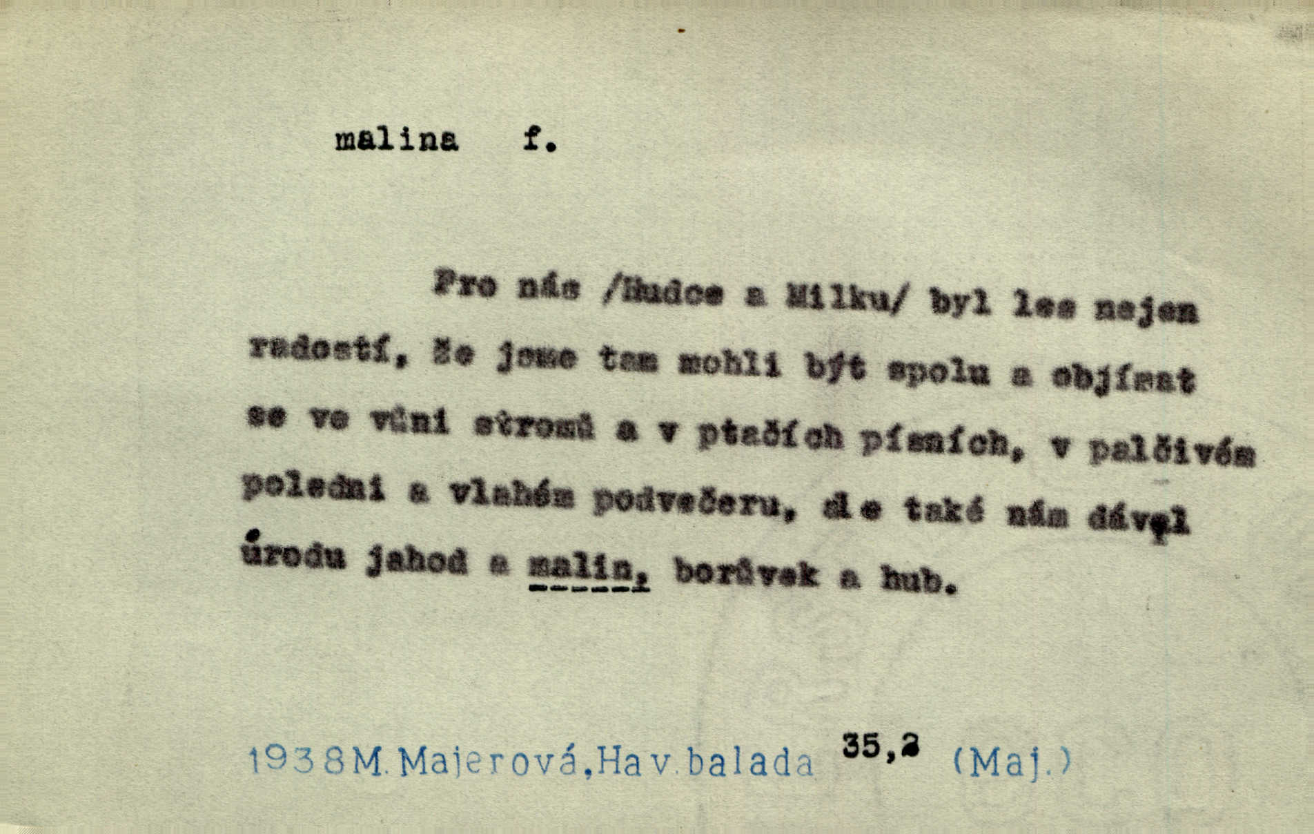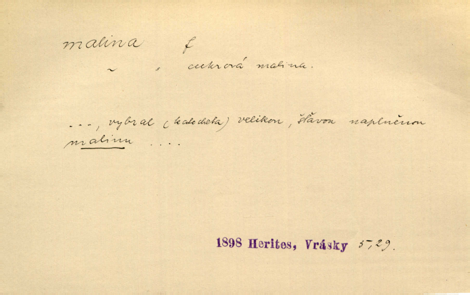 - malina (dial. malena), -y f. maliník n. plod maliníku. Byl jsem kryt v hustém křoví malin. Dyk. Renomovali [lesní adjunkti] svými dobrodružstvími s holkami na malinách. K. Čap. Tu se uzarděla jako malina. Svět. Je to dívčina jako malina svěží, ruměná. Maj. V Borušové sú šohajci ako malena! Preis. Přen. Jen ještě dotk’ se v letu [milenec] rtů malin [dámy]. Vrch. D druh mateřského znamení na těle. Má-li novorozeně na těle nějaké znamení, jako: jahodu, malinu a t. p., zaříkávají je babičky. ČČM. D jméno krávy barvy hnědočervené. Měla dostat krávu a jednoroční tele, chtěla jejich velkou „malinu“. Jah.