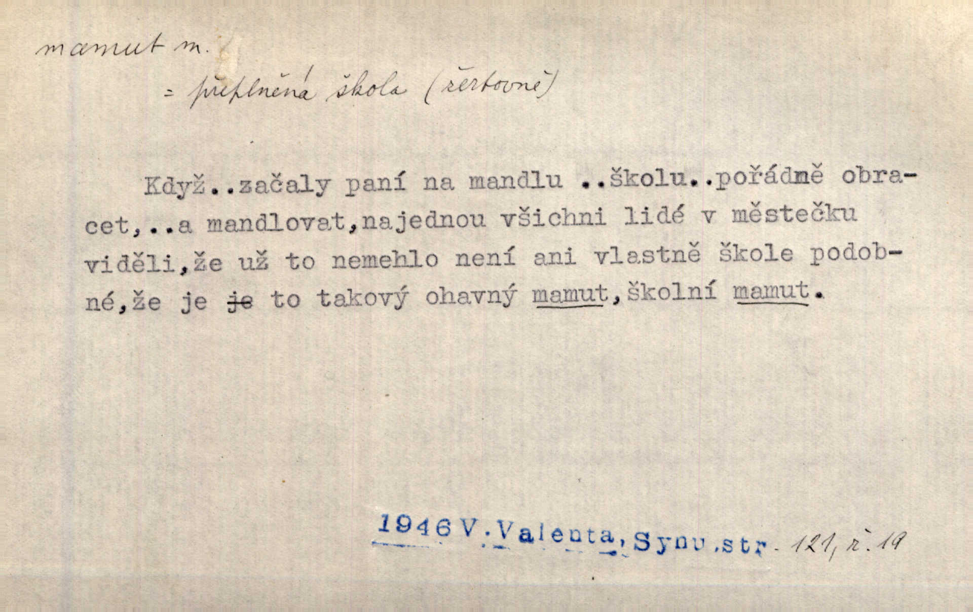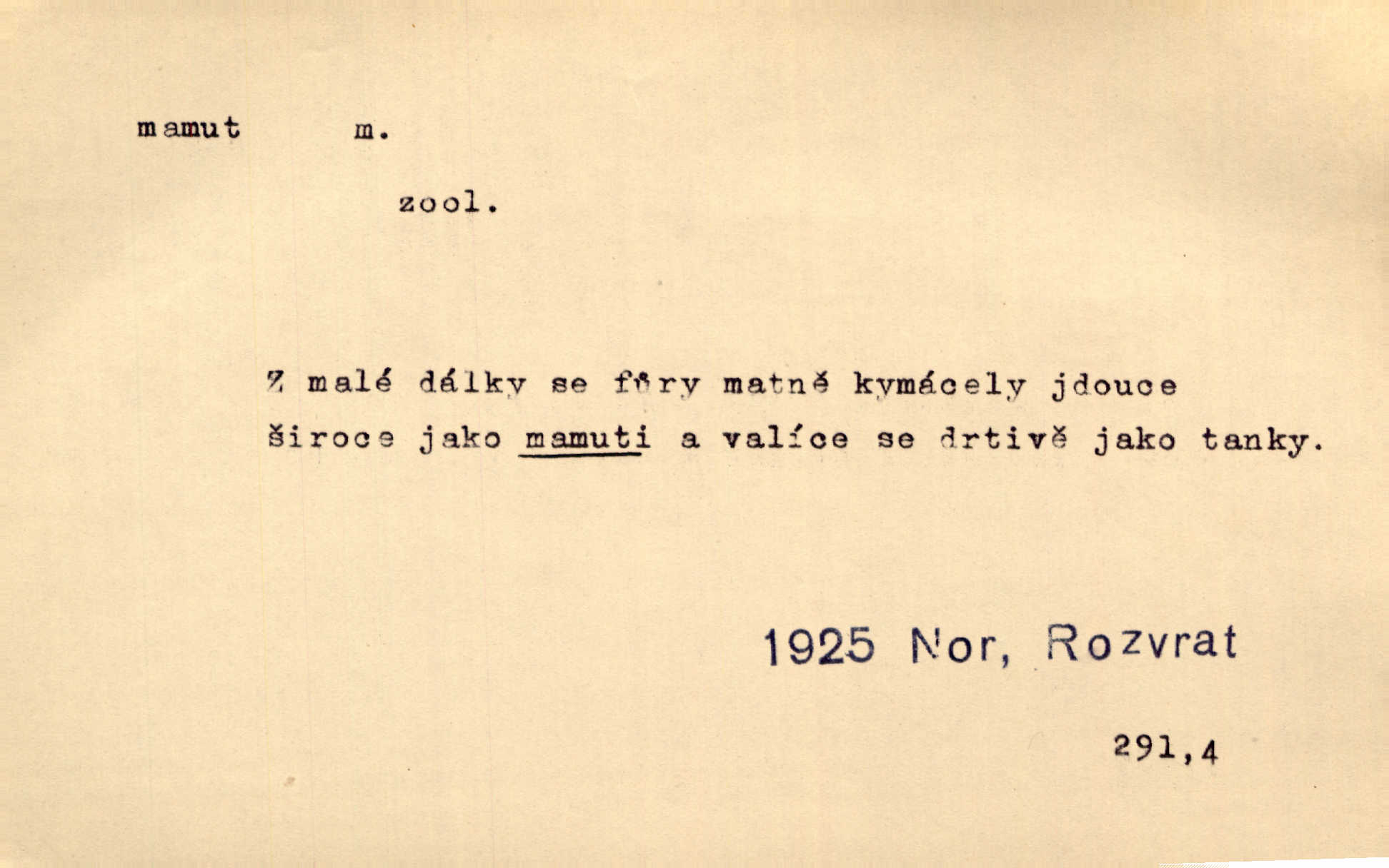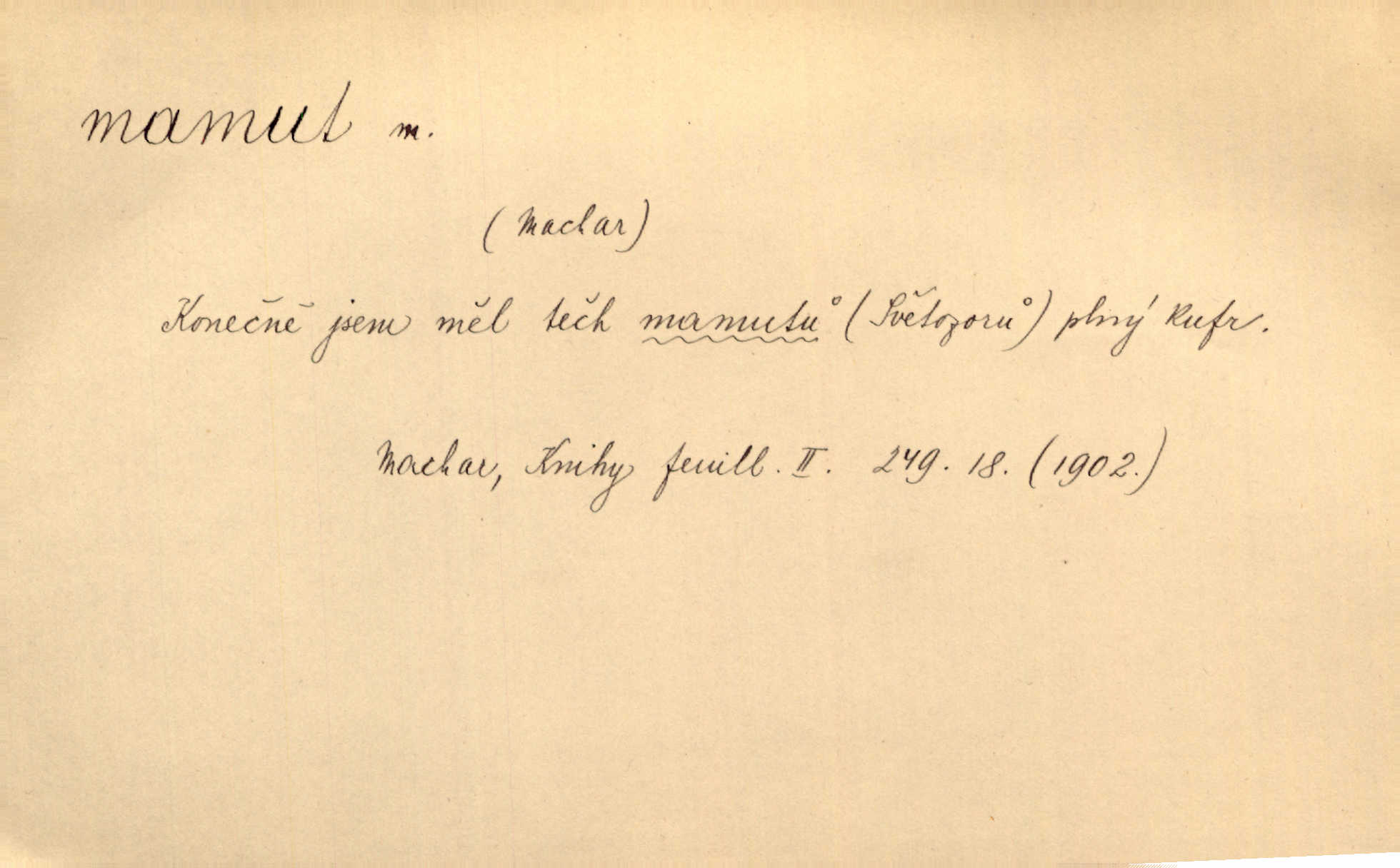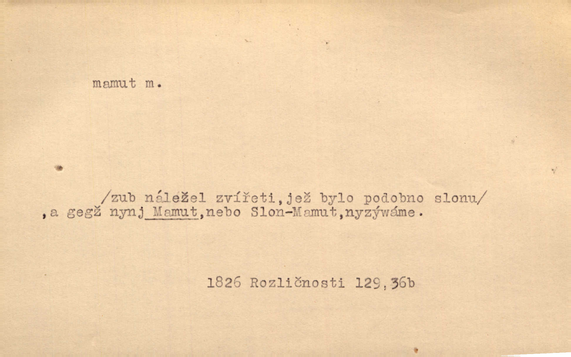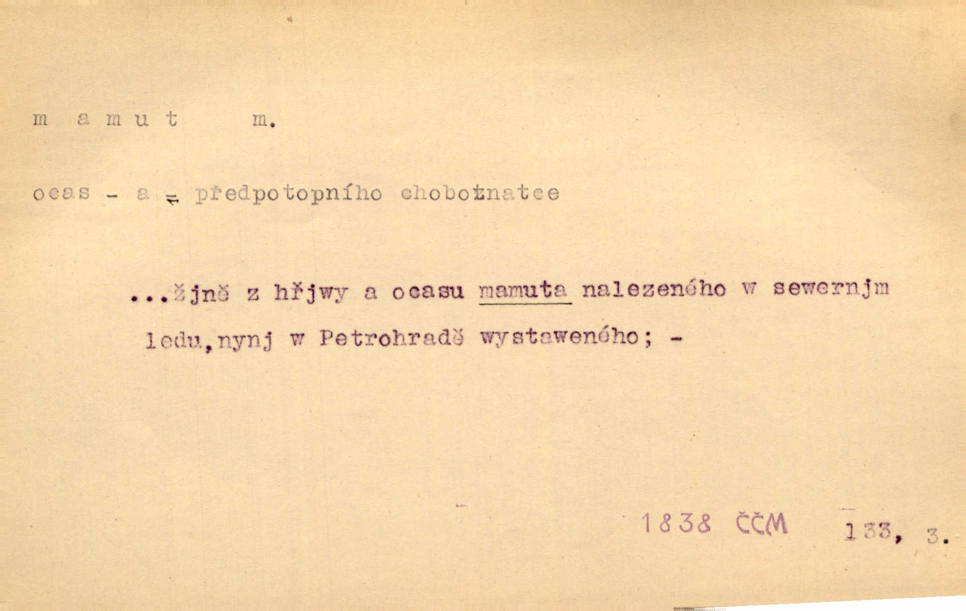 - mamut, -a m. zool. druh vymřelého slona, Elephas primigenius. Z malé dálky se fůry matně kymácely jdouce široce jako mamuti. Nor. D Expr. osoba n. věc mamutu nějak se podobající, zvl. ohromností, mohutností, nemotorností a pod. Cítil svou jepičí a červí nicotnost před tímto mamutem a mastodontem moci a síly [ředitelem]. Hlad. Konečně jsem měl těch mamutů [„Světozorů“] plný kufr velikánských knih. Mach. Vyličuje brusiče za cosi pouze bývalého, za jakési literární mamuty. Kos. D nadávka. Co chceš, mamute? [jeden voják druhému]. Med. Zalyká se [Davilla] hystericky: Vy mamute! Šrám. D Tech. čerpadlo používané pro příliš hluboké studně. Hosp. odrůda velkozrnného ječmene. Zahr. odrůda velkoplodé ostružiny.