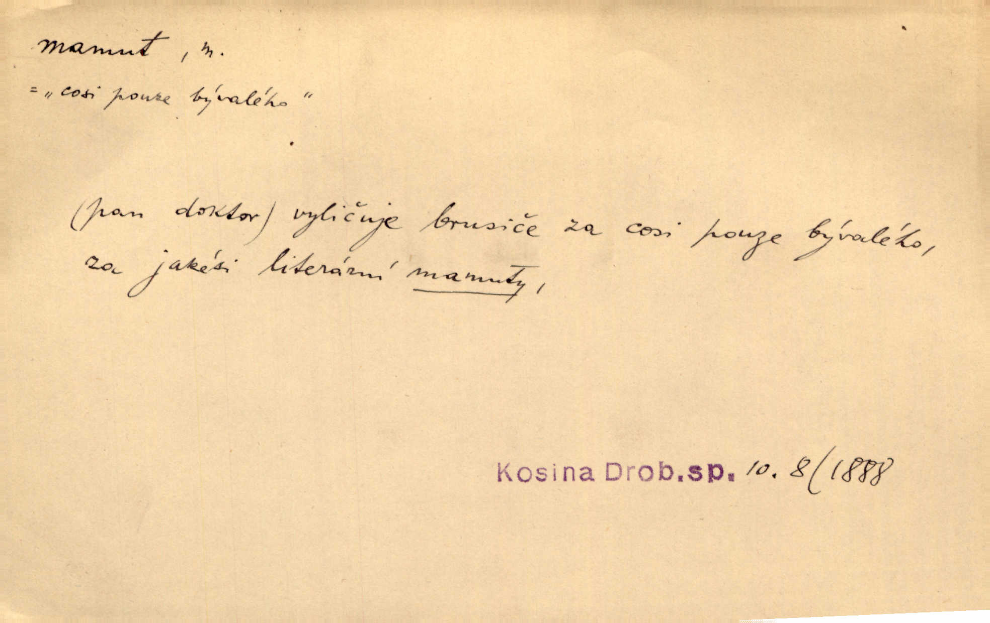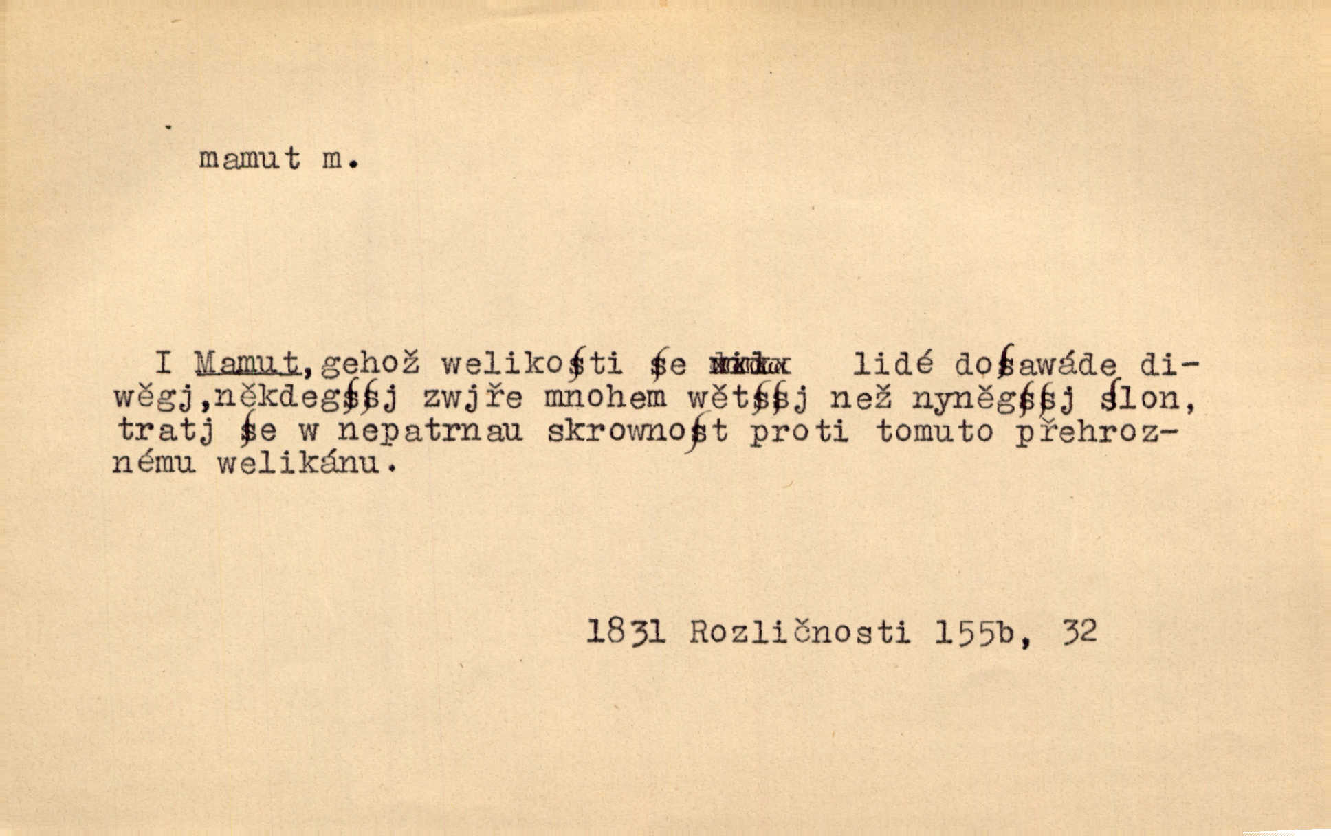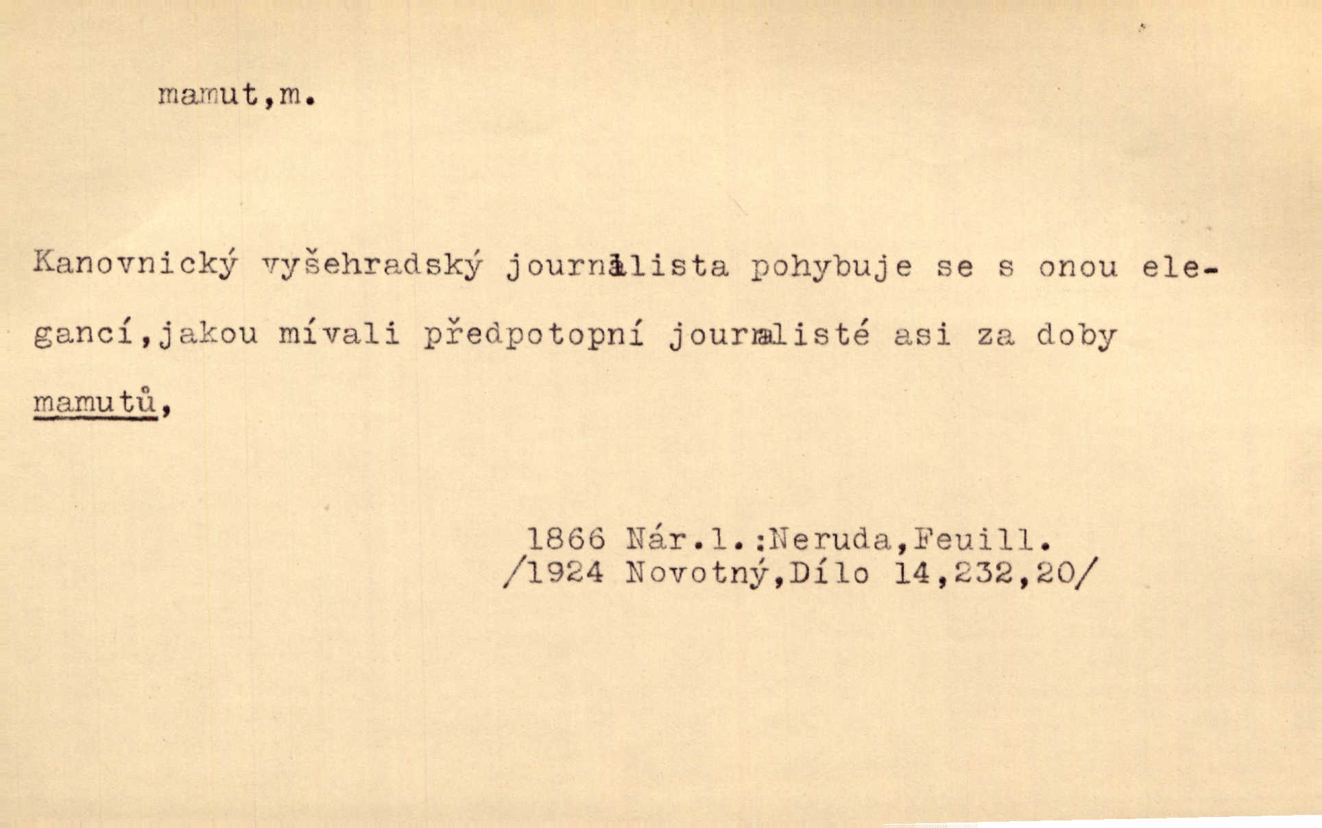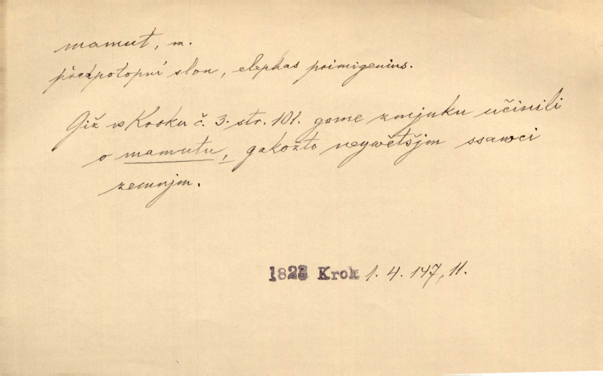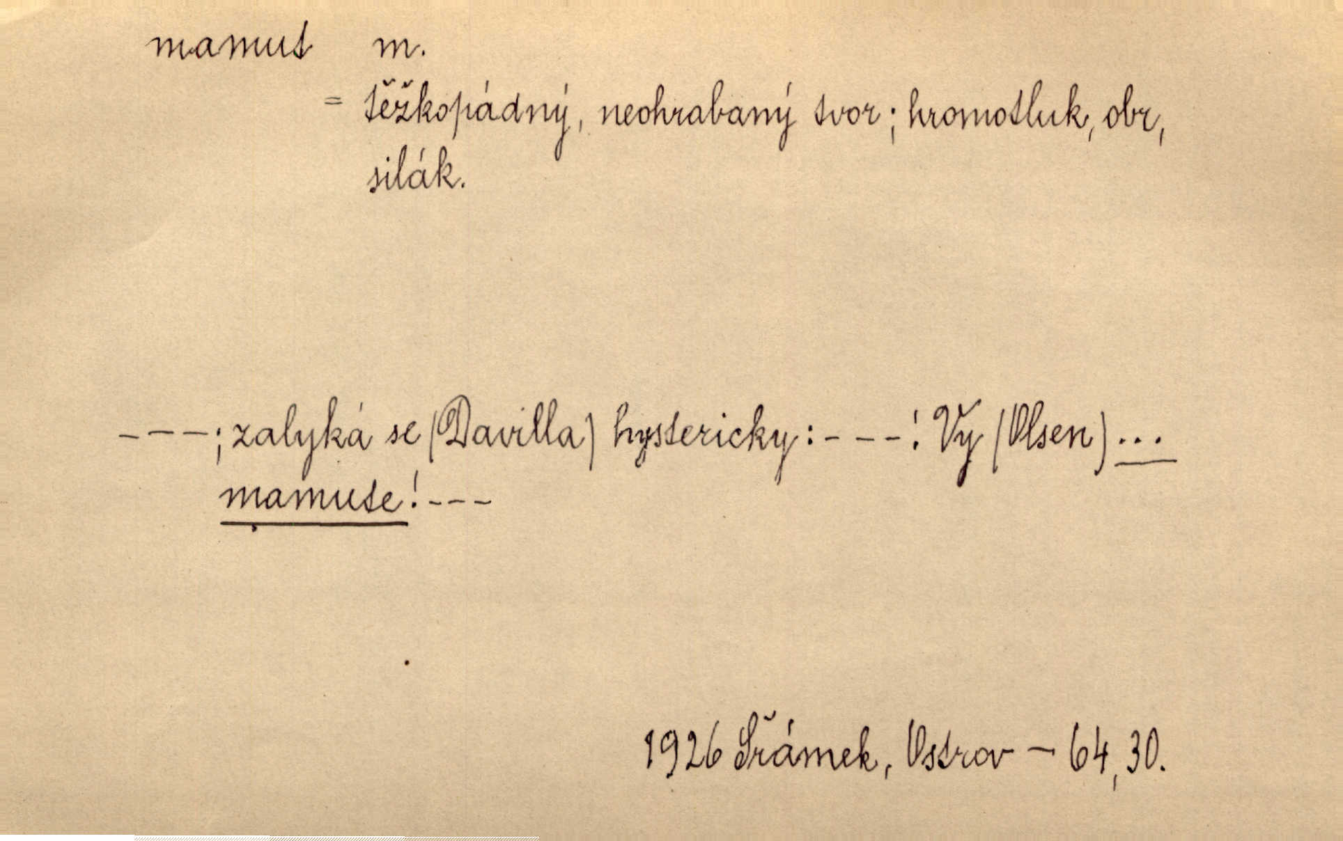- mamut, -a m. zool. druh vymřelého slona, Elephas primigenius. Z malé dálky se fůry matně kymácely jdouce široce jako mamuti. Nor. D Expr. osoba n. věc mamutu nějak se podobající, zvl. ohromností, mohutností, nemotorností a pod. Cítil svou jepičí a červí nicotnost před tímto mamutem a mastodontem moci a síly [ředitelem]. Hlad. Konečně jsem měl těch mamutů [„Světozorů“] plný kufr velikánských knih. Mach. Vyličuje brusiče za cosi pouze bývalého, za jakési literární mamuty. Kos. D nadávka. Co chceš, mamute? [jeden voják druhému]. Med. Zalyká se [Davilla] hystericky: Vy mamute! Šrám. D Tech. čerpadlo používané pro příliš hluboké studně. Hosp. odrůda velkozrnného ječmene. Zahr. odrůda velkoplodé ostružiny.