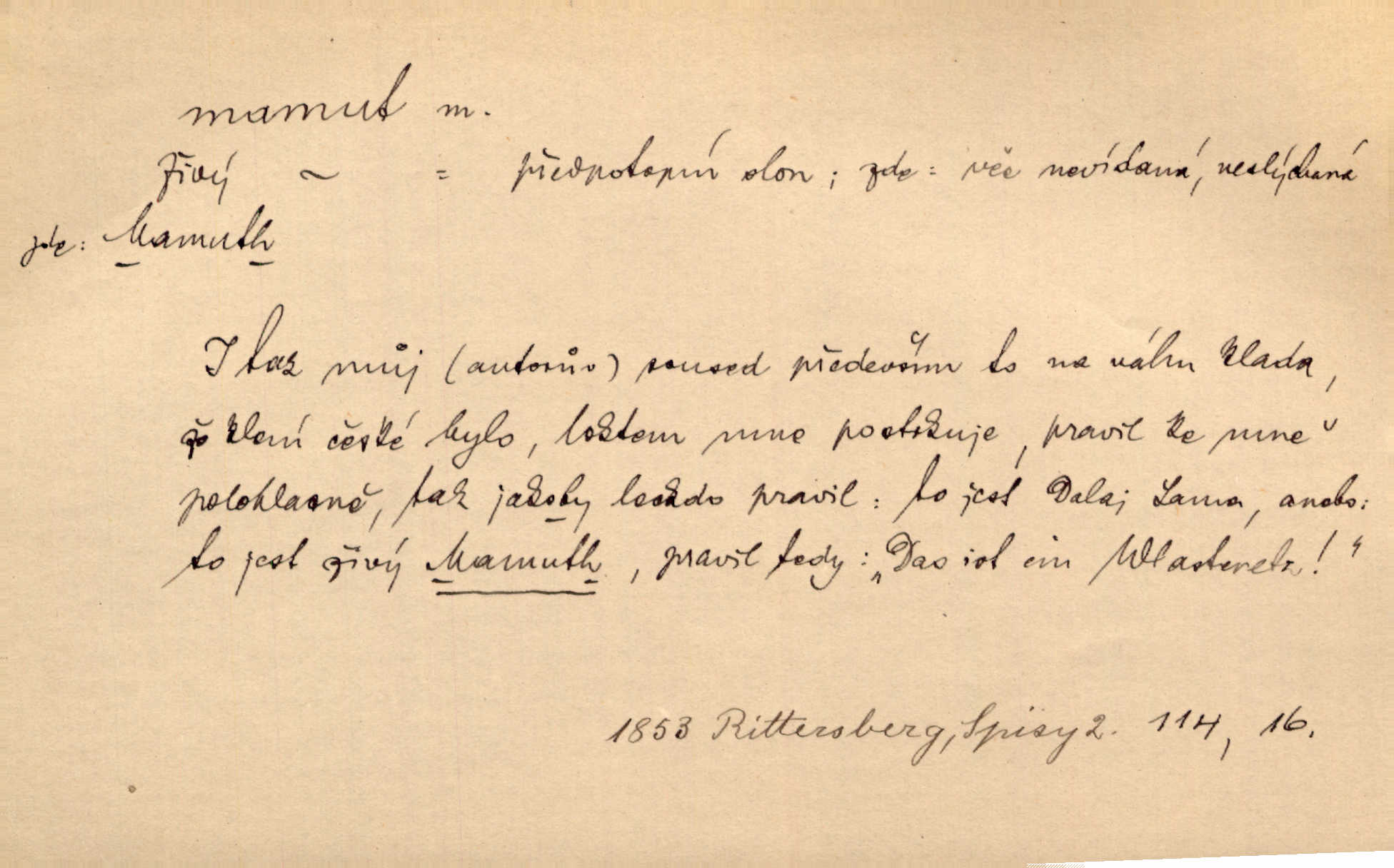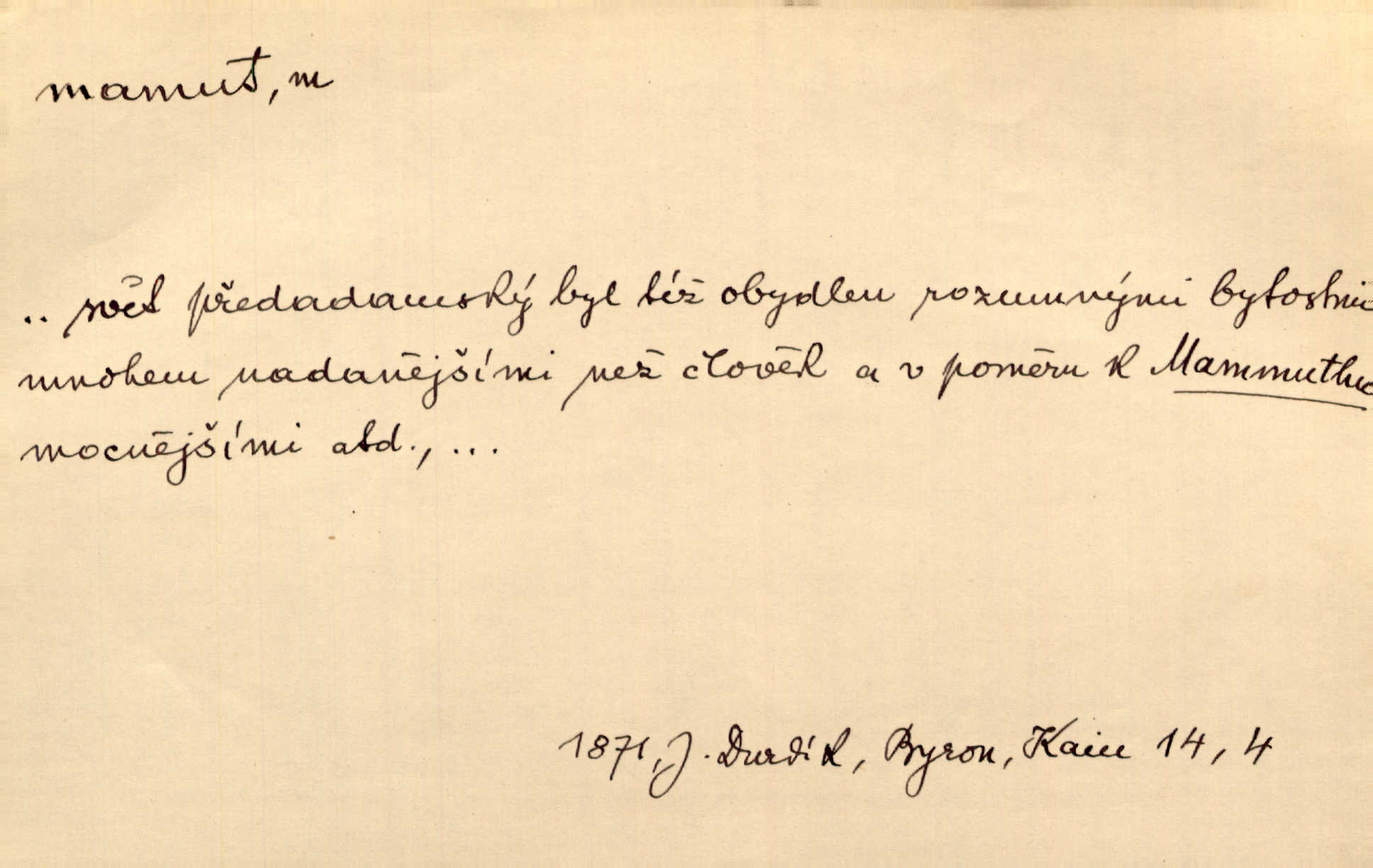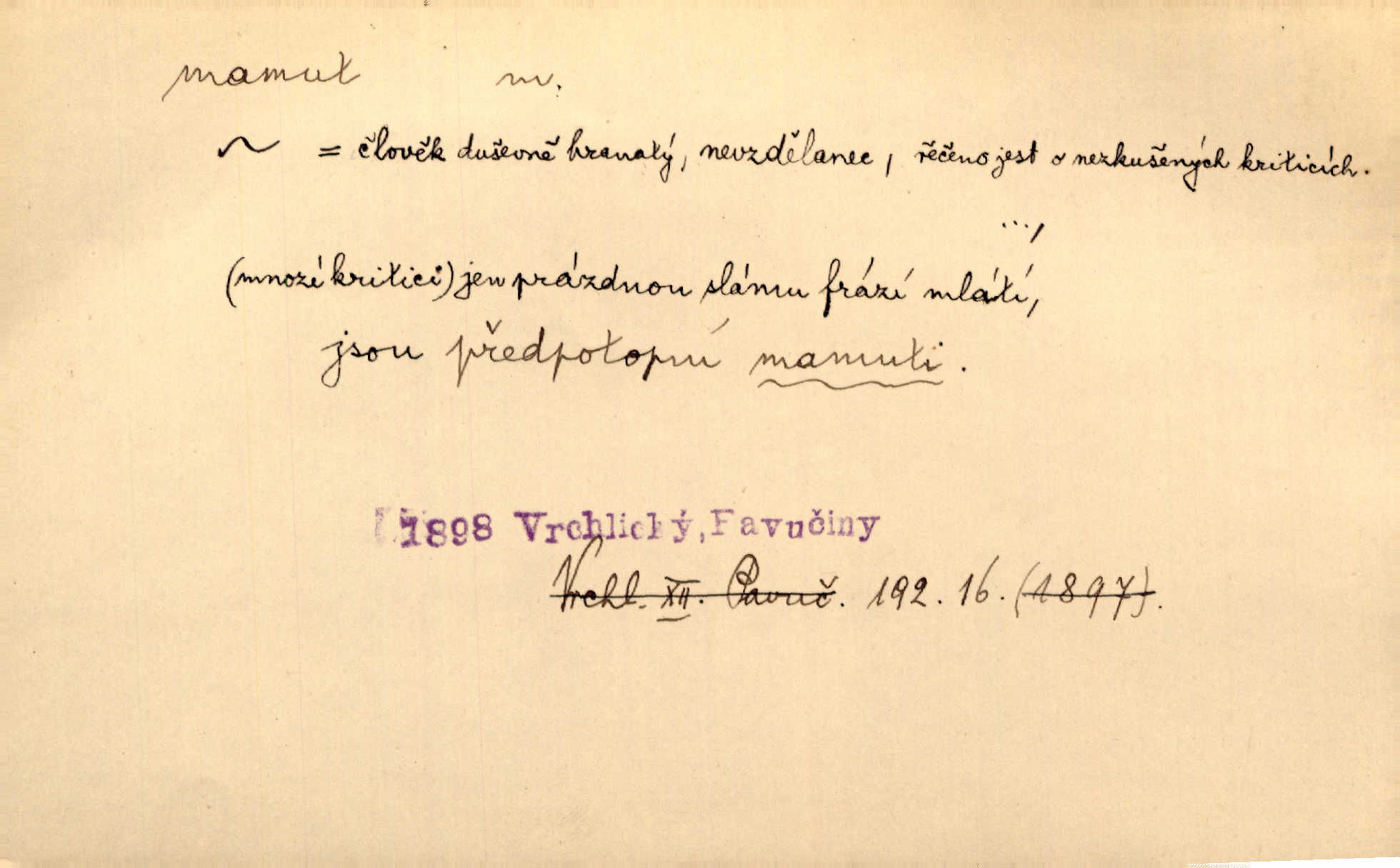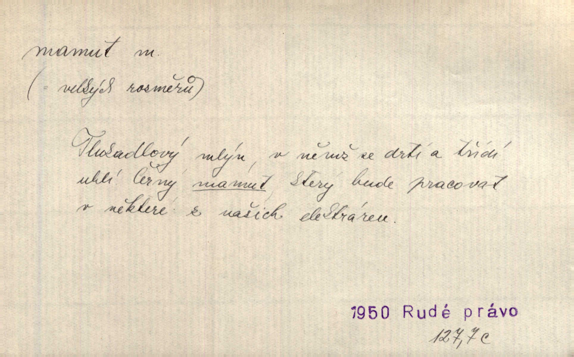 - mamut, -a m. zool. druh vymřelého slona, Elephas primigenius. Z malé dálky se fůry matně kymácely jdouce široce jako mamuti. Nor. D Expr. osoba n. věc mamutu nějak se podobající, zvl. ohromností, mohutností, nemotorností a pod. Cítil svou jepičí a červí nicotnost před tímto mamutem a mastodontem moci a síly [ředitelem]. Hlad. Konečně jsem měl těch mamutů [„Světozorů“] plný kufr velikánských knih. Mach. Vyličuje brusiče za cosi pouze bývalého, za jakési literární mamuty. Kos. D nadávka. Co chceš, mamute? [jeden voják druhému]. Med. Zalyká se [Davilla] hystericky: Vy mamute! Šrám. D Tech. čerpadlo používané pro příliš hluboké studně. Hosp. odrůda velkozrnného ječmene. Zahr. odrůda velkoplodé ostružiny.