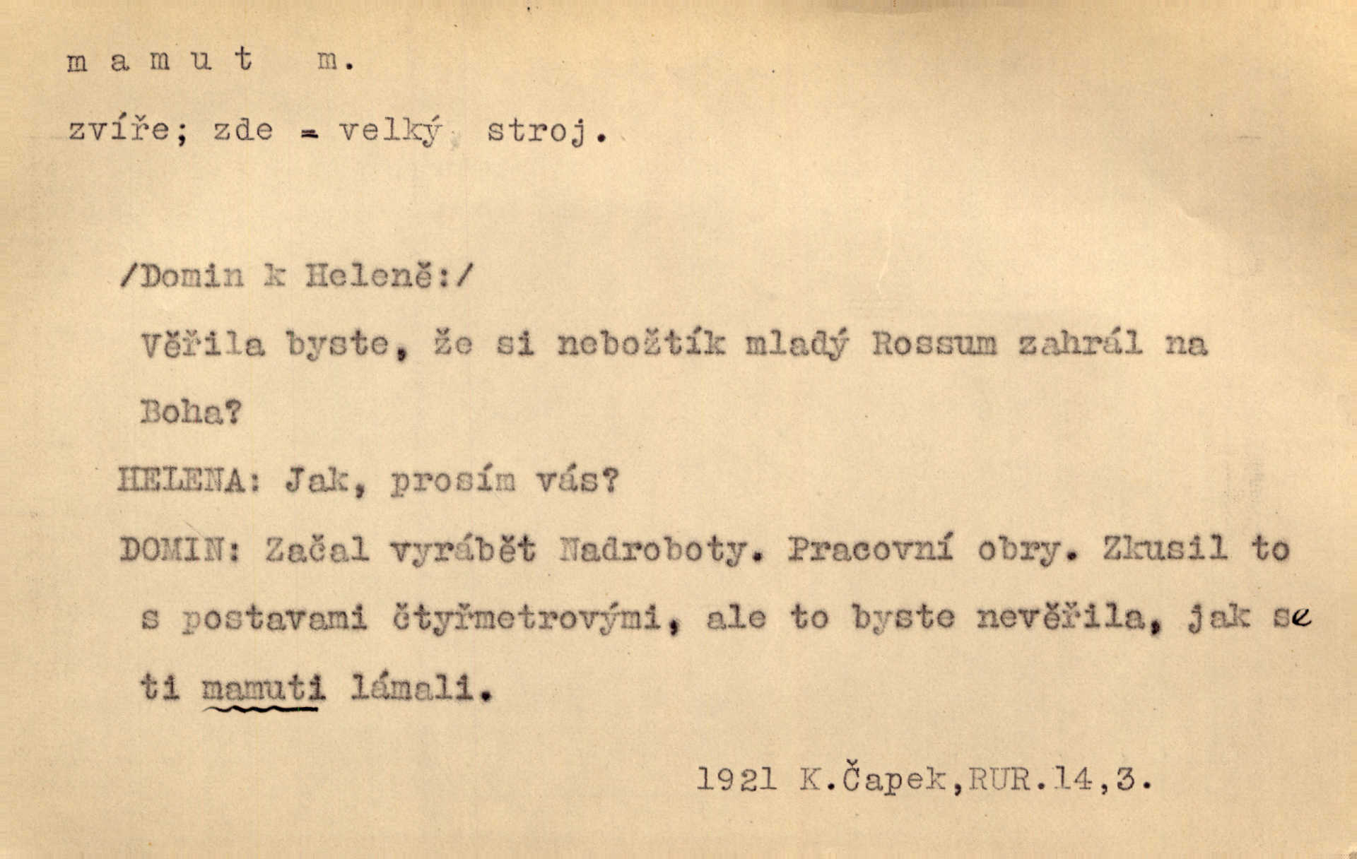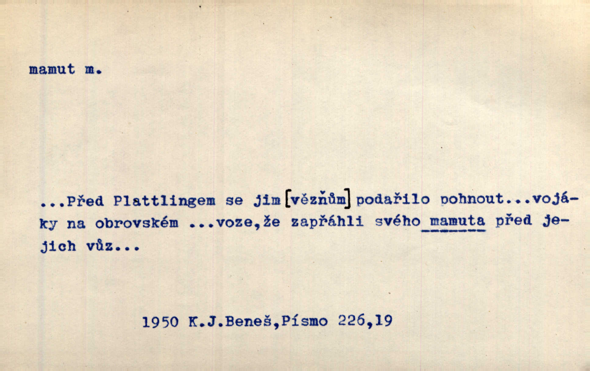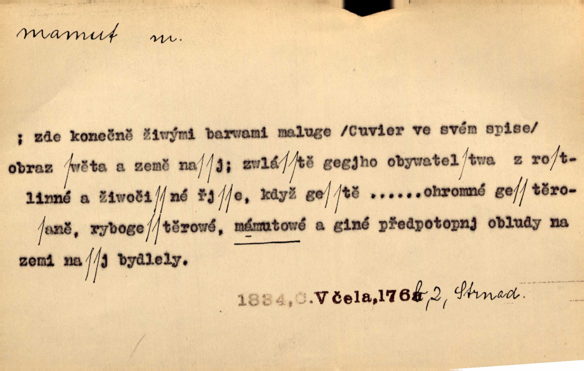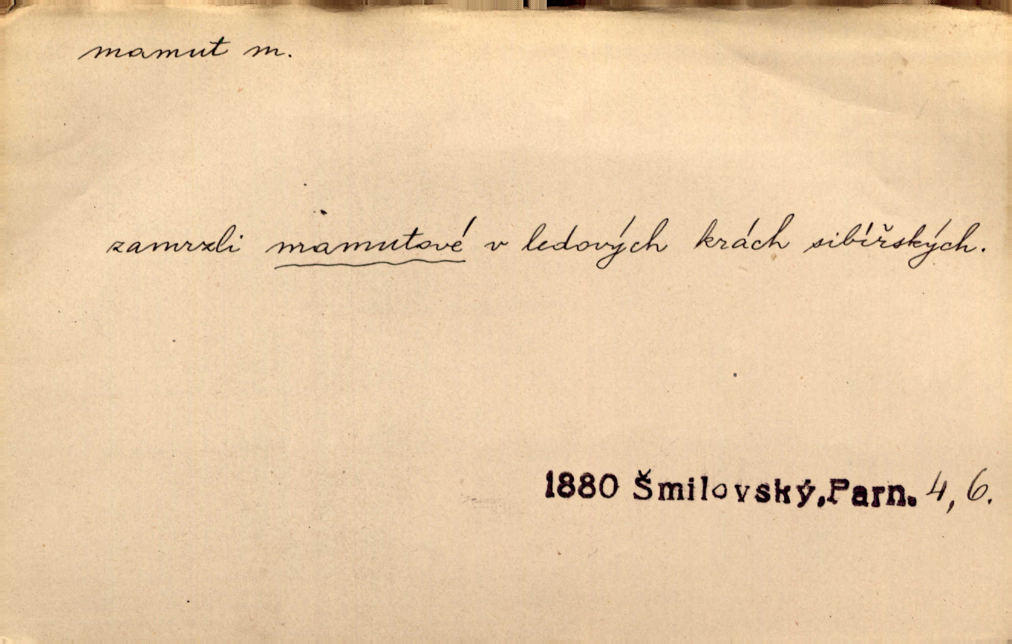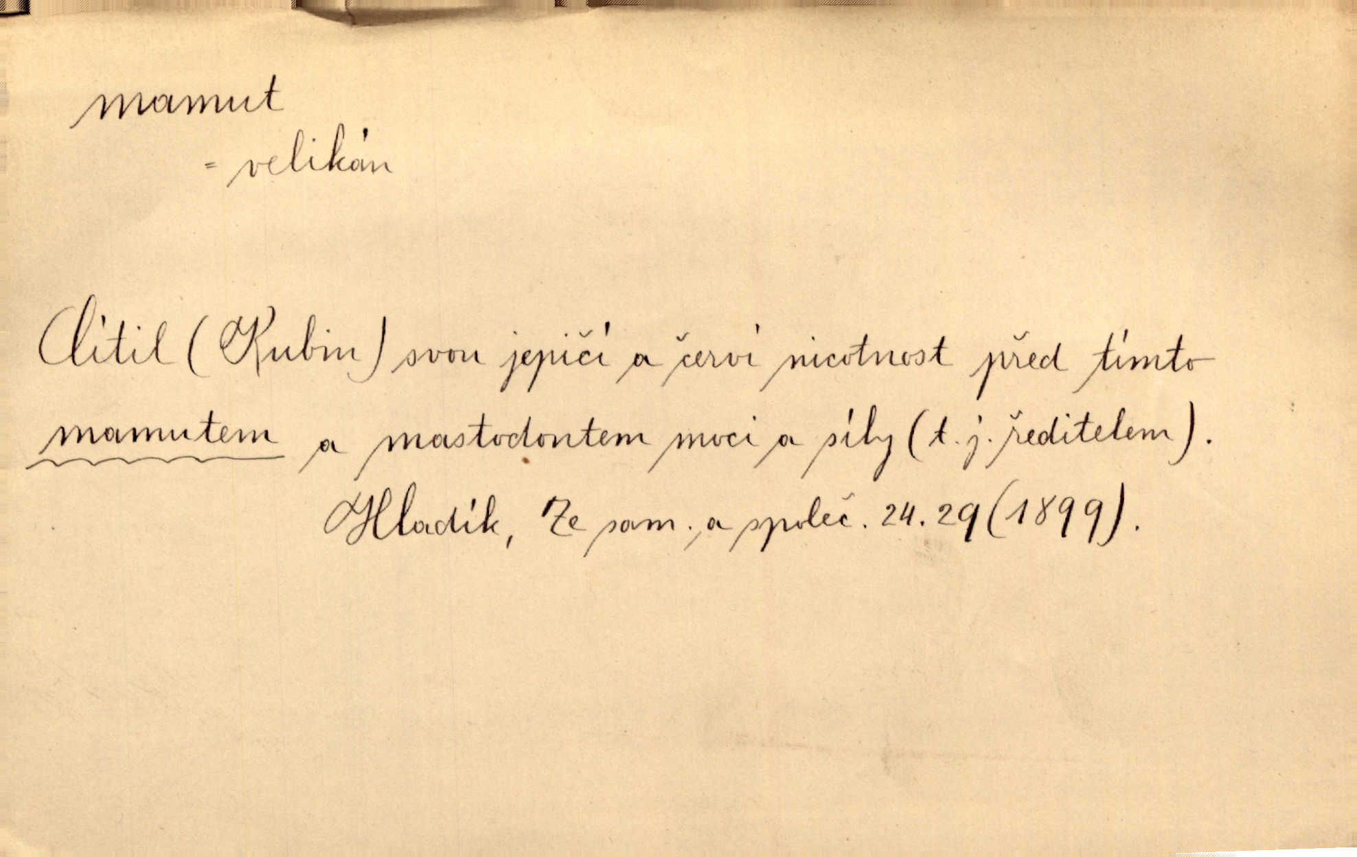 - mamut, -a m. zool. druh vymřelého slona, Elephas primigenius. Z malé dálky se fůry matně kymácely jdouce široce jako mamuti. Nor. D Expr. osoba n. věc mamutu nějak se podobající, zvl. ohromností, mohutností, nemotorností a pod. Cítil svou jepičí a červí nicotnost před tímto mamutem a mastodontem moci a síly [ředitelem]. Hlad. Konečně jsem měl těch mamutů [„Světozorů“] plný kufr velikánských knih. Mach. Vyličuje brusiče za cosi pouze bývalého, za jakési literární mamuty. Kos. D nadávka. Co chceš, mamute? [jeden voják druhému]. Med. Zalyká se [Davilla] hystericky: Vy mamute! Šrám. D Tech. čerpadlo používané pro příliš hluboké studně. Hosp. odrůda velkozrnného ječmene. Zahr. odrůda velkoplodé ostružiny.