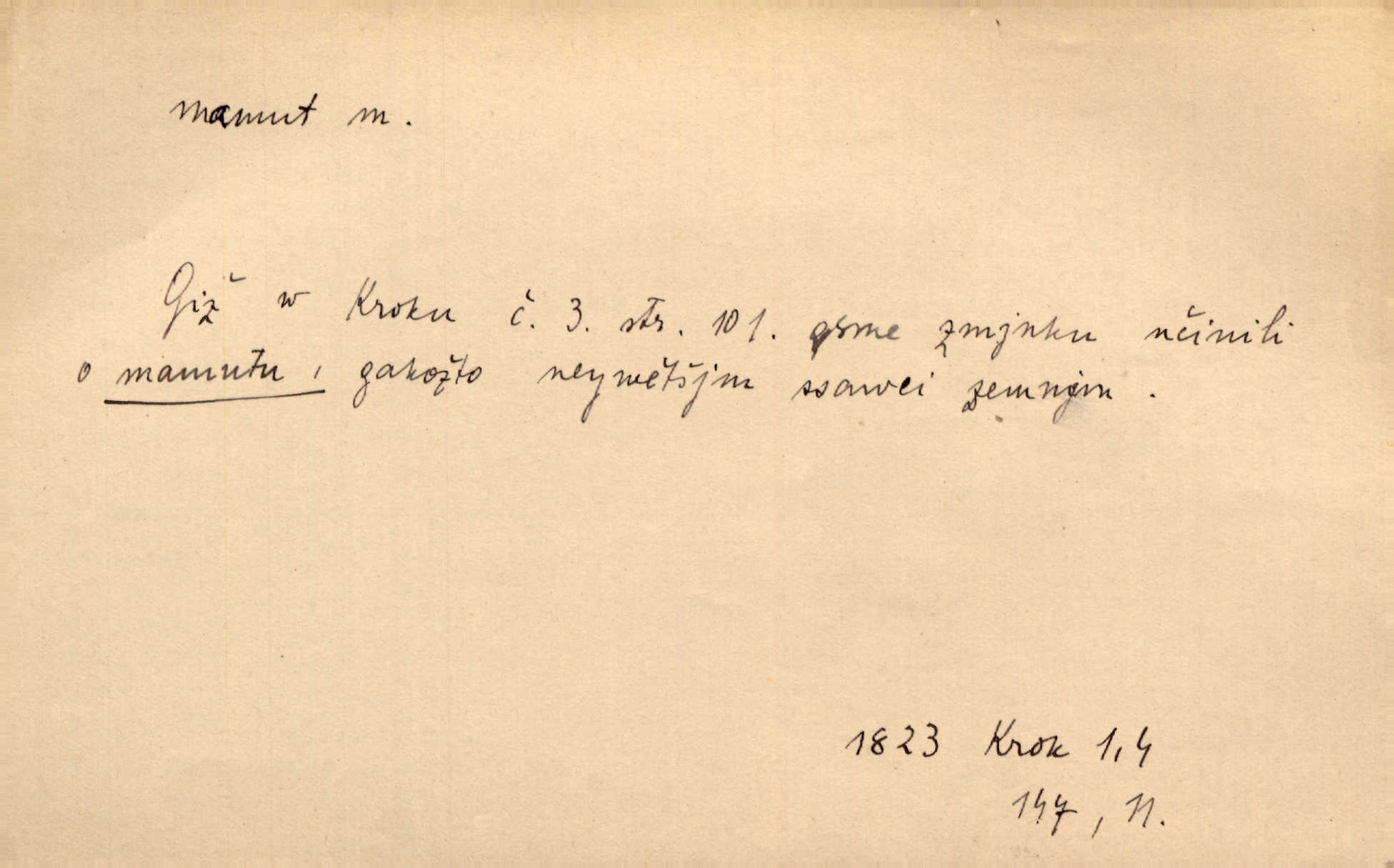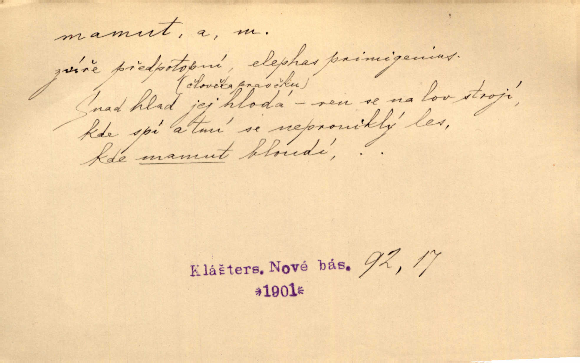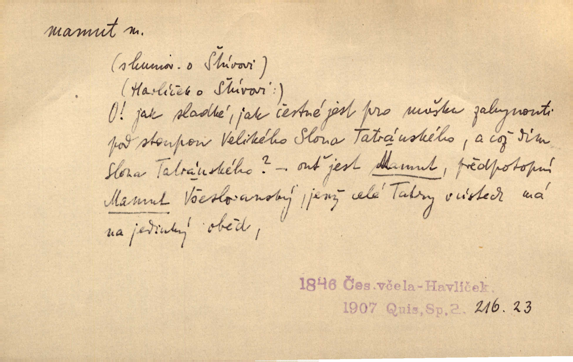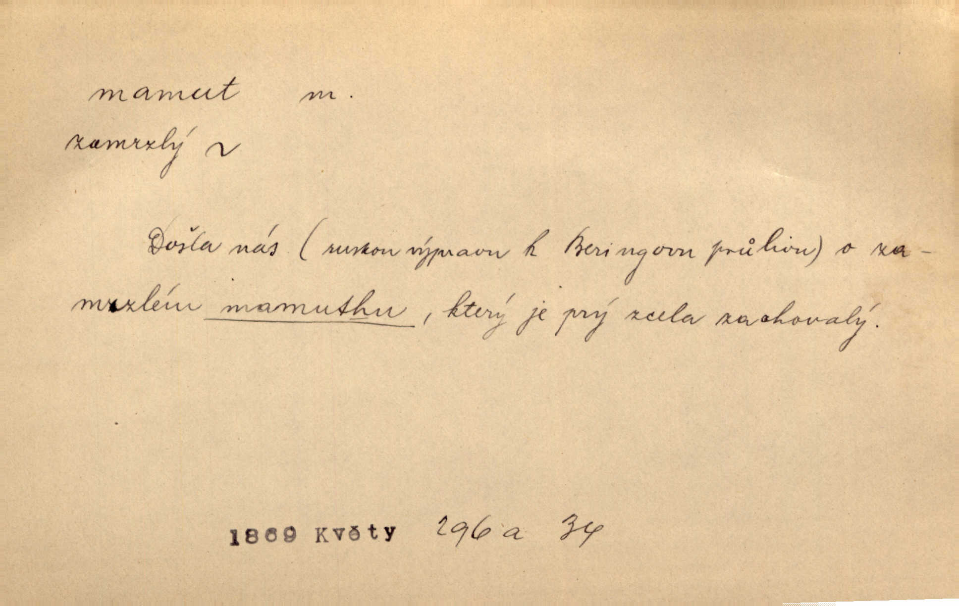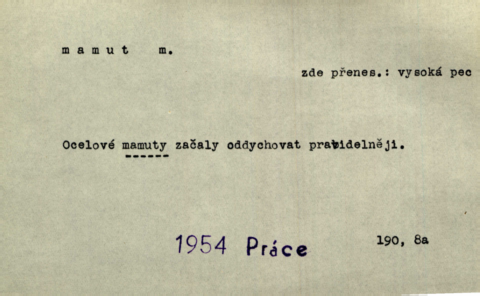 - mamut, -a m. zool. druh vymřelého slona, Elephas primigenius. Z malé dálky se fůry matně kymácely jdouce široce jako mamuti. Nor. D Expr. osoba n. věc mamutu nějak se podobající, zvl. ohromností, mohutností, nemotorností a pod. Cítil svou jepičí a červí nicotnost před tímto mamutem a mastodontem moci a síly [ředitelem]. Hlad. Konečně jsem měl těch mamutů [„Světozorů“] plný kufr velikánských knih. Mach. Vyličuje brusiče za cosi pouze bývalého, za jakési literární mamuty. Kos. D nadávka. Co chceš, mamute? [jeden voják druhému]. Med. Zalyká se [Davilla] hystericky: Vy mamute! Šrám. D Tech. čerpadlo používané pro příliš hluboké studně. Hosp. odrůda velkozrnného ječmene. Zahr. odrůda velkoplodé ostružiny.