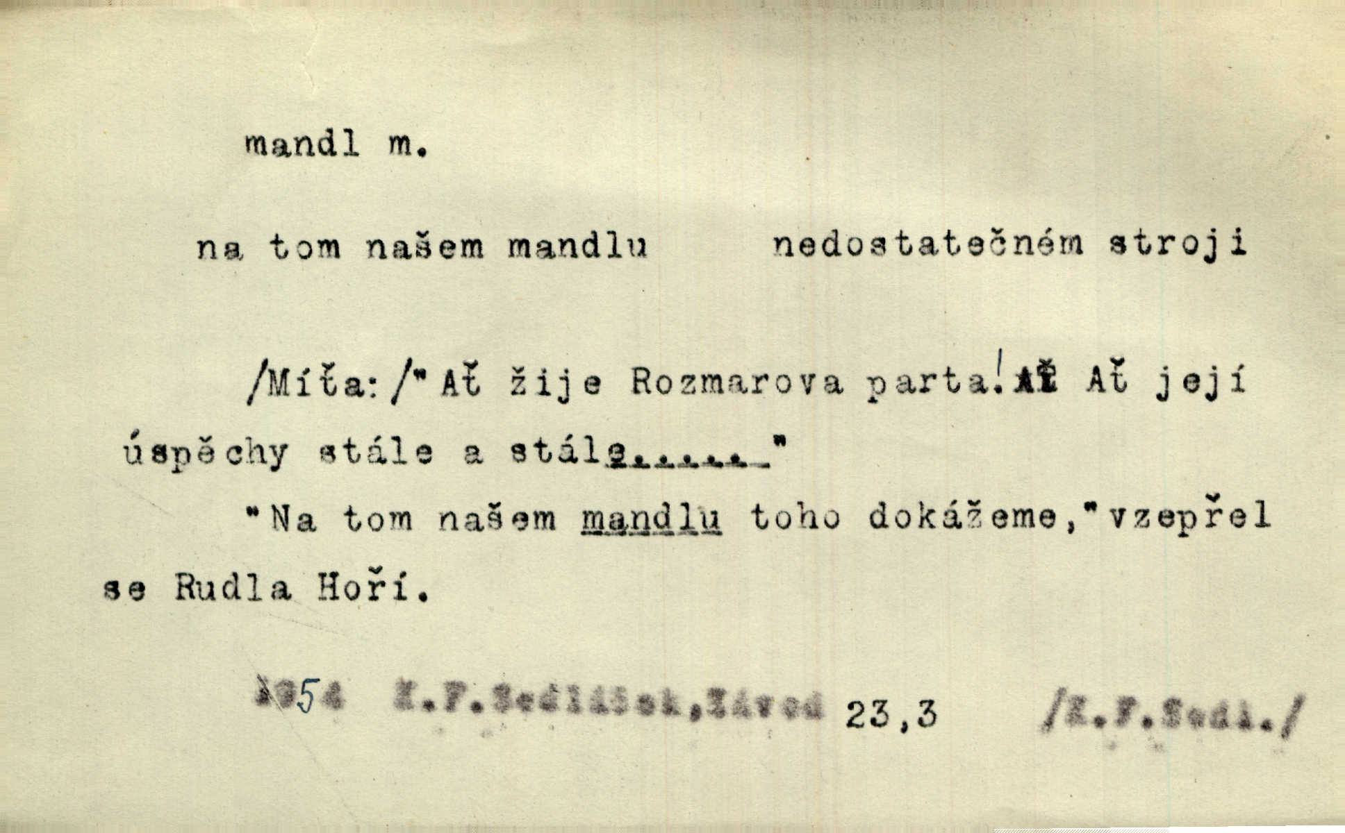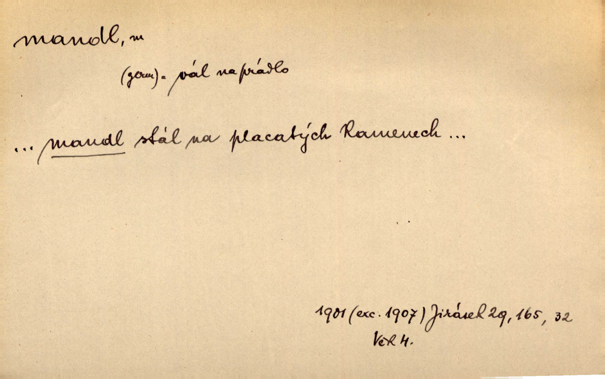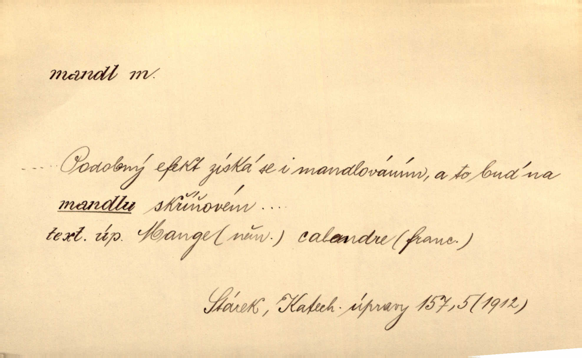 - mandl (zast. mangl), -u m. 1. stroj dodávající tlakem válce tkaninám n. papíru hladkosti, lesku n. větší hustoty. V pozadí krámku byl veliký mandl. Nov. Vyhnul jsem se v pravo a drcnul jsem do manglu! Ner. Tech. mandl skříňový se skříňovým svrškem na válcích: mandl válcový mandlující mezi dvěma válci na sebe doléhajícími; mandl stoupový složený z řady stoup, tlukoucích střídavě do tkaniny.