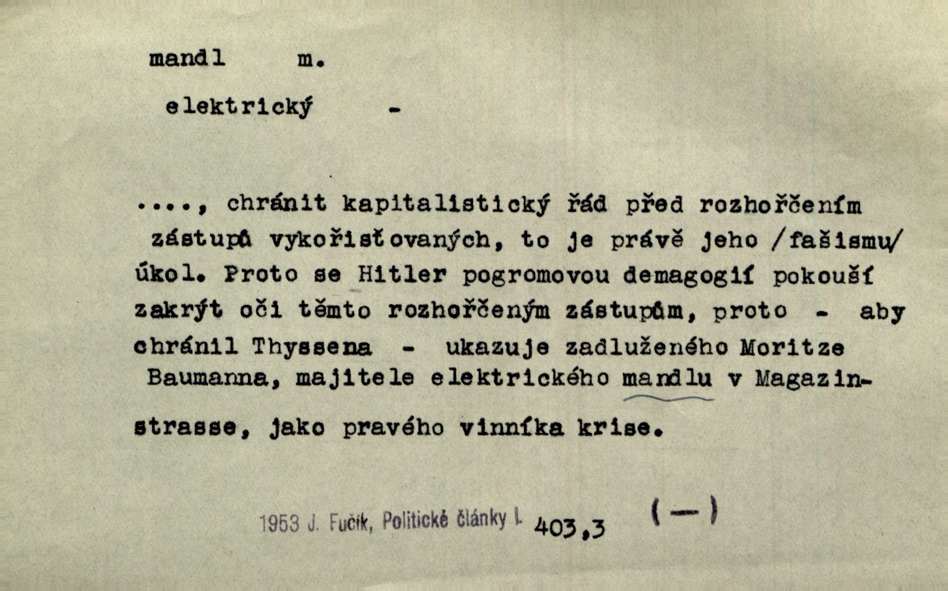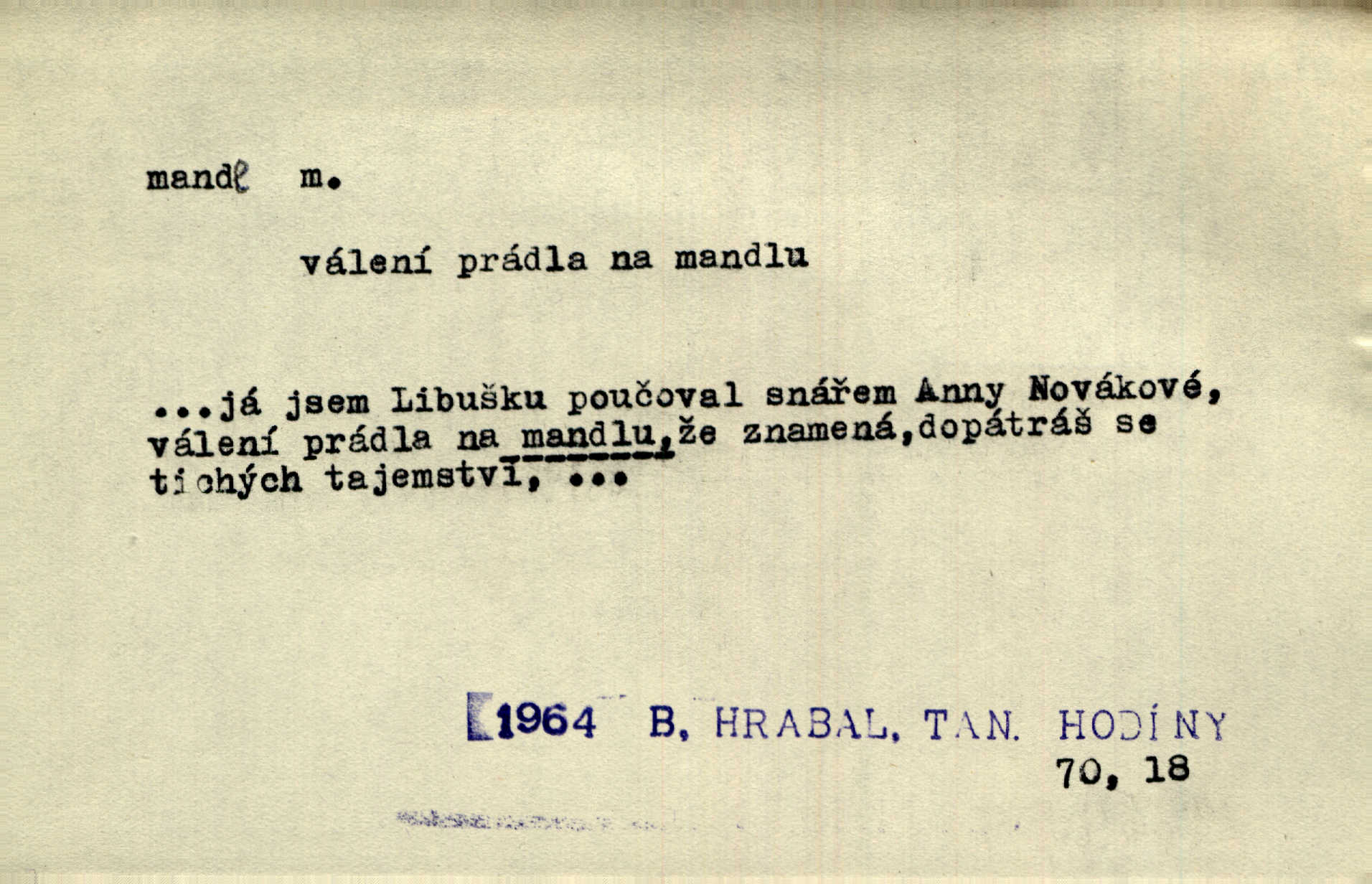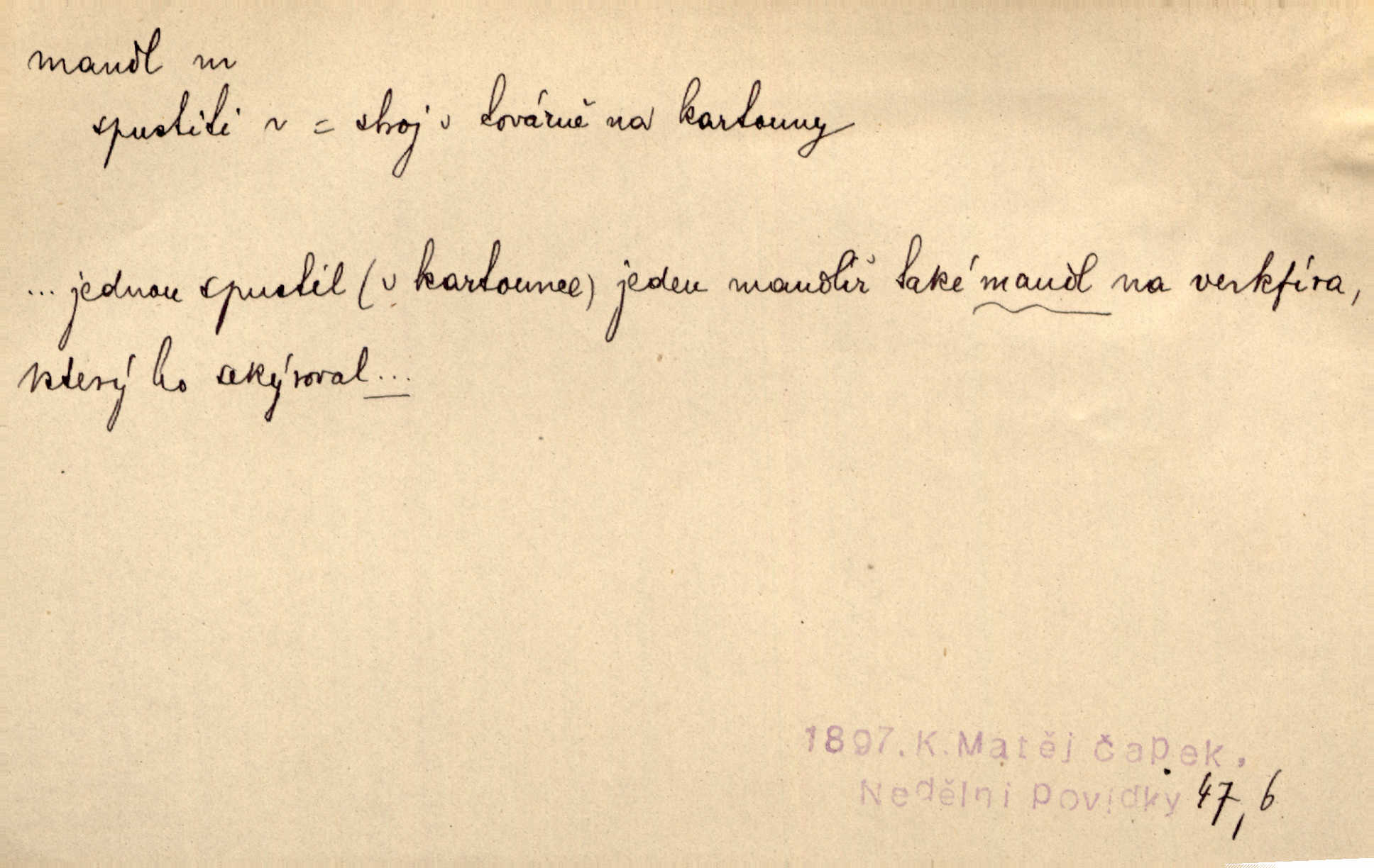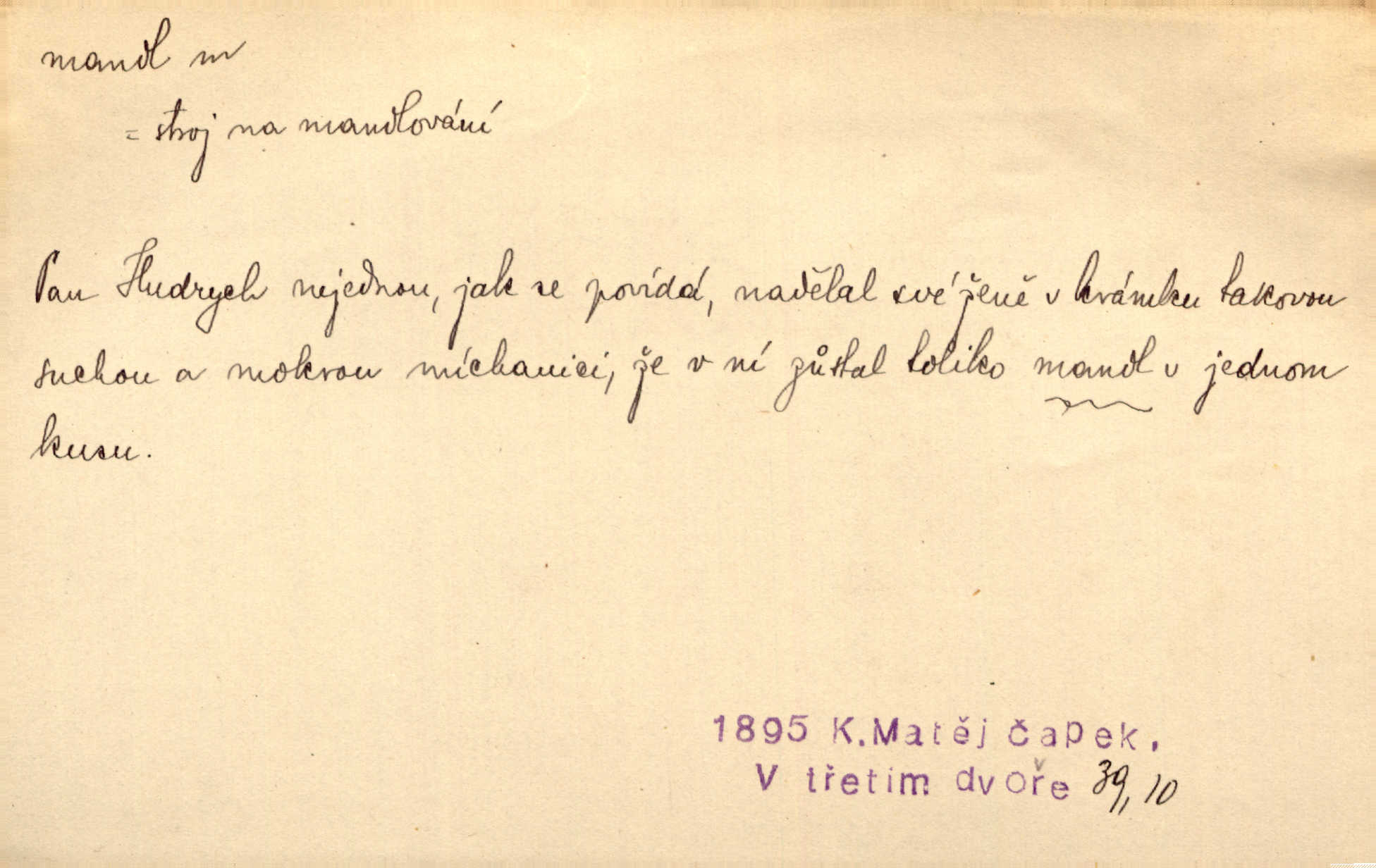 - mandl (zast. mangl), -u m. 1. stroj dodávající tlakem válce tkaninám n. papíru hladkosti, lesku n. větší hustoty. V pozadí krámku byl veliký mandl. Nov. Vyhnul jsem se v pravo a drcnul jsem do manglu! Ner. Tech. mandl skříňový se skříňovým svrškem na válcích: mandl válcový mandlující mezi dvěma válci na sebe doléhajícími; mandl stoupový složený z řady stoup, tlukoucích střídavě do tkaniny.