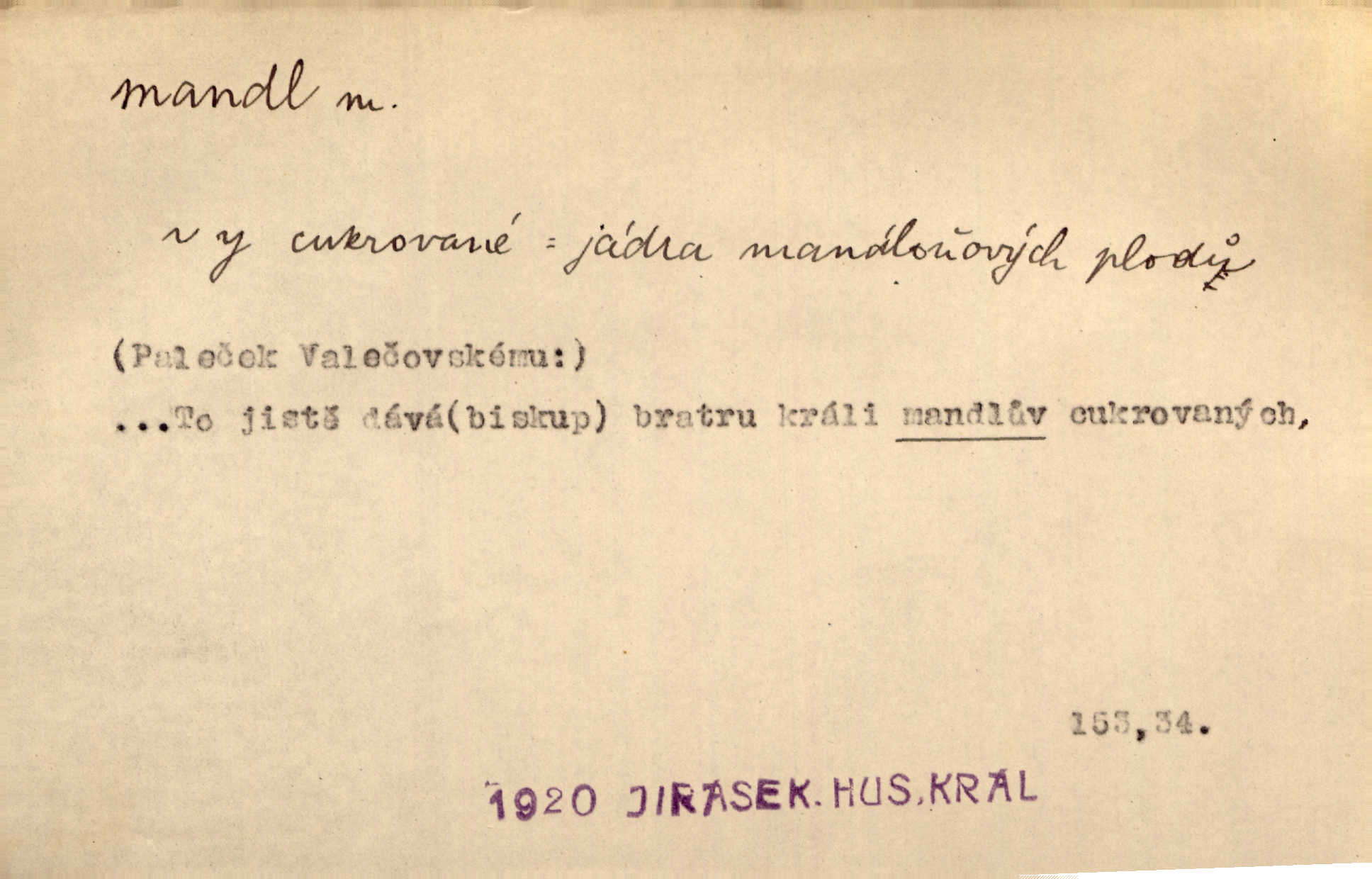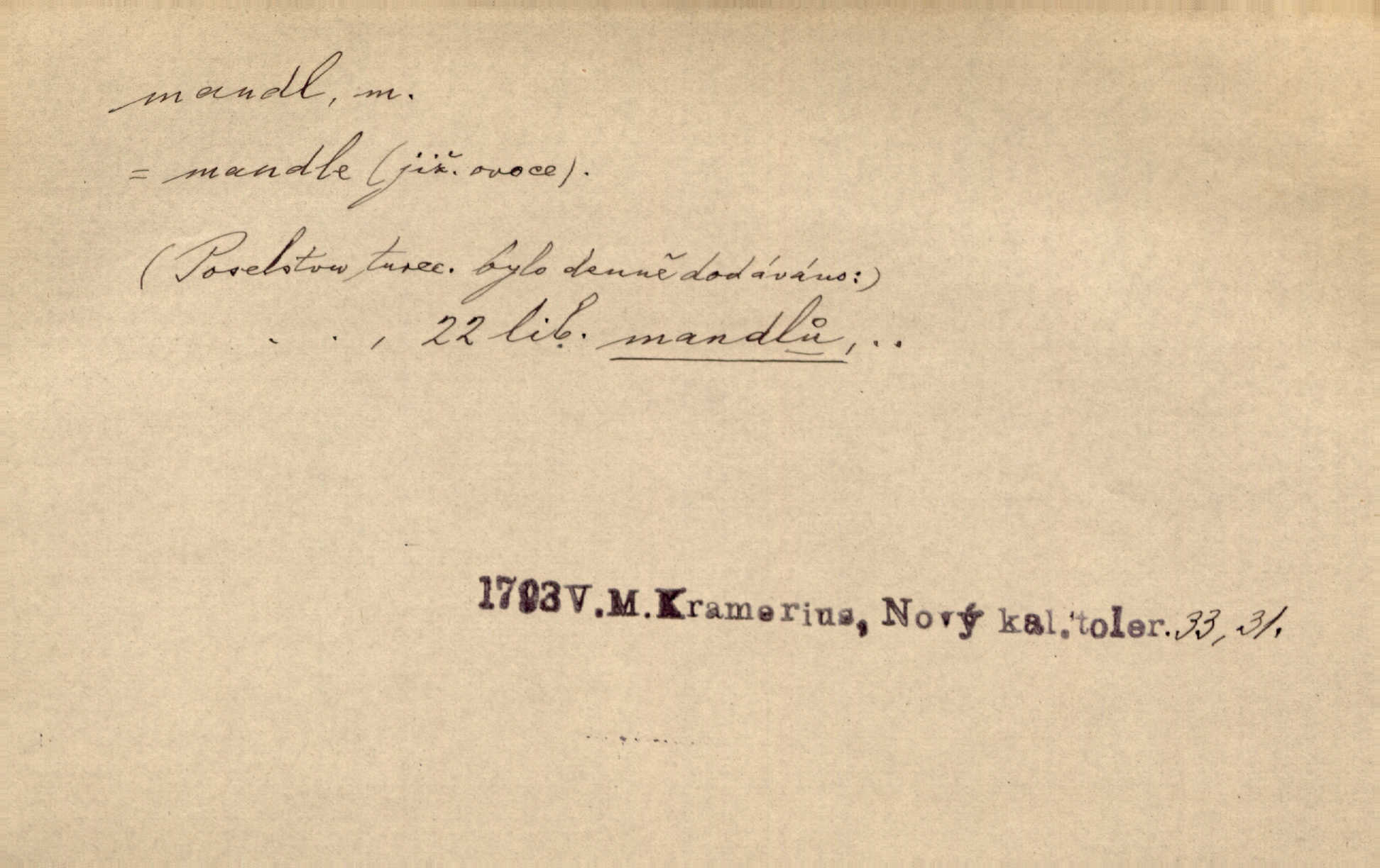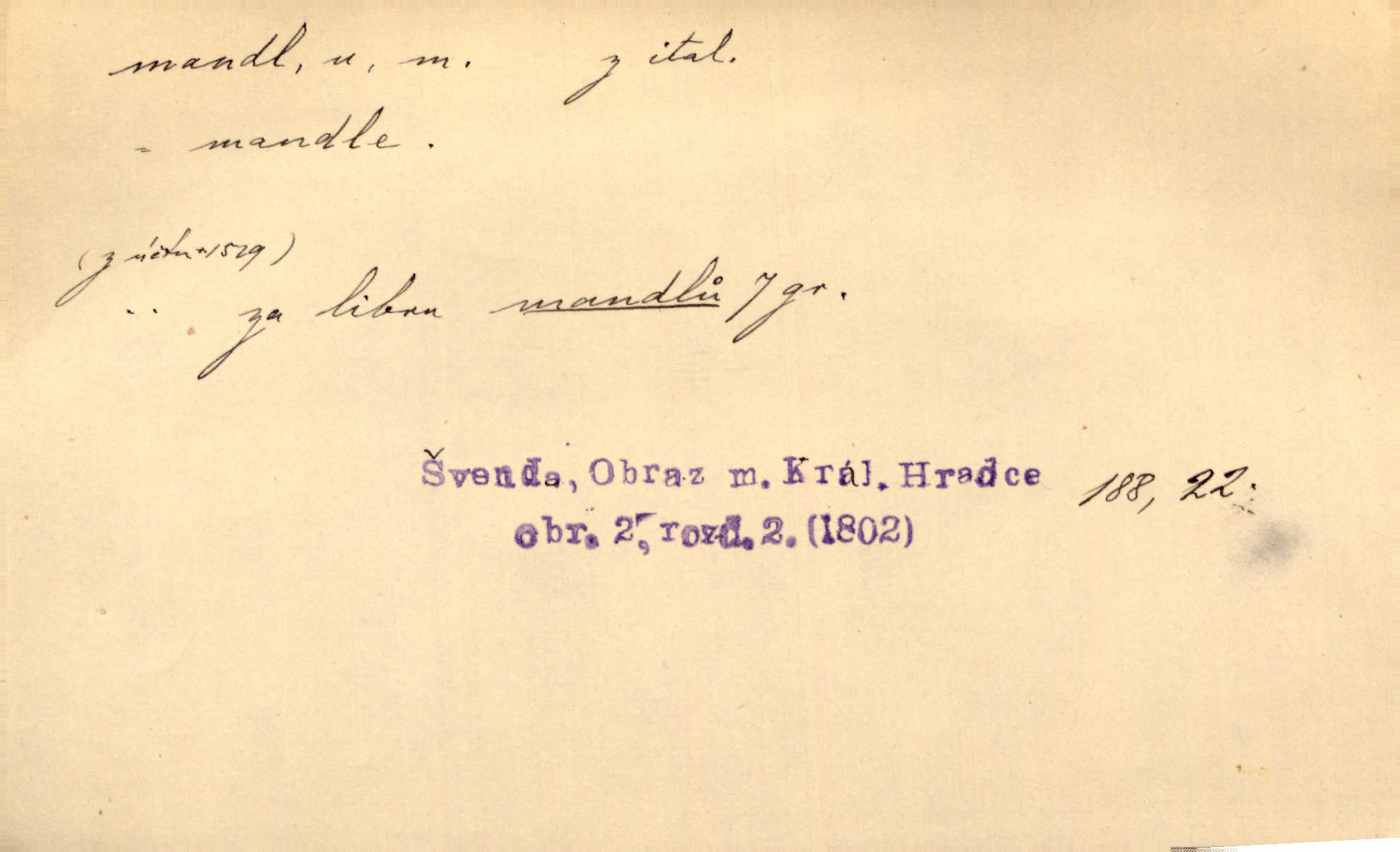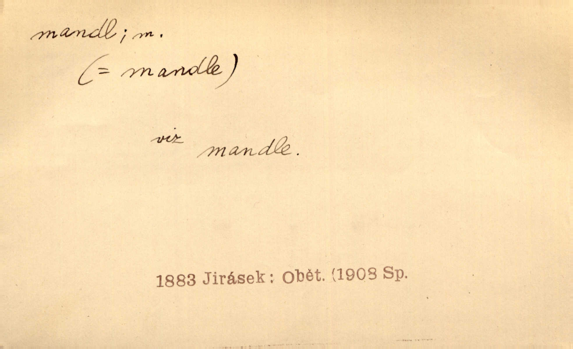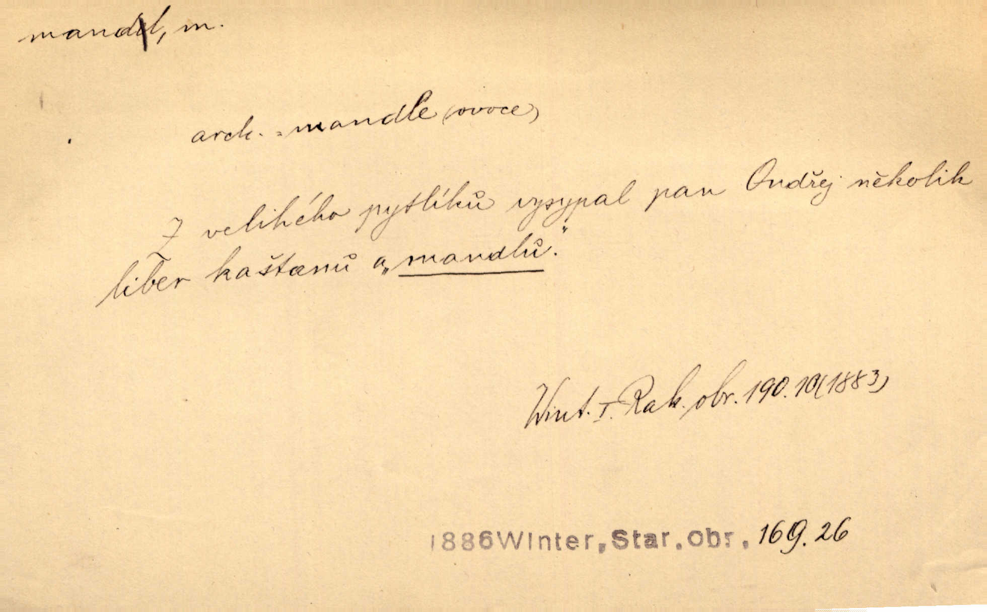 - †mandl, -u m. 2. mandle. Z pytlíku vysypal pan Ondřej několik liber kaštanů a „mandlů“. Win. Kaše z mandlův také není. Jir.